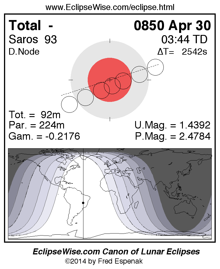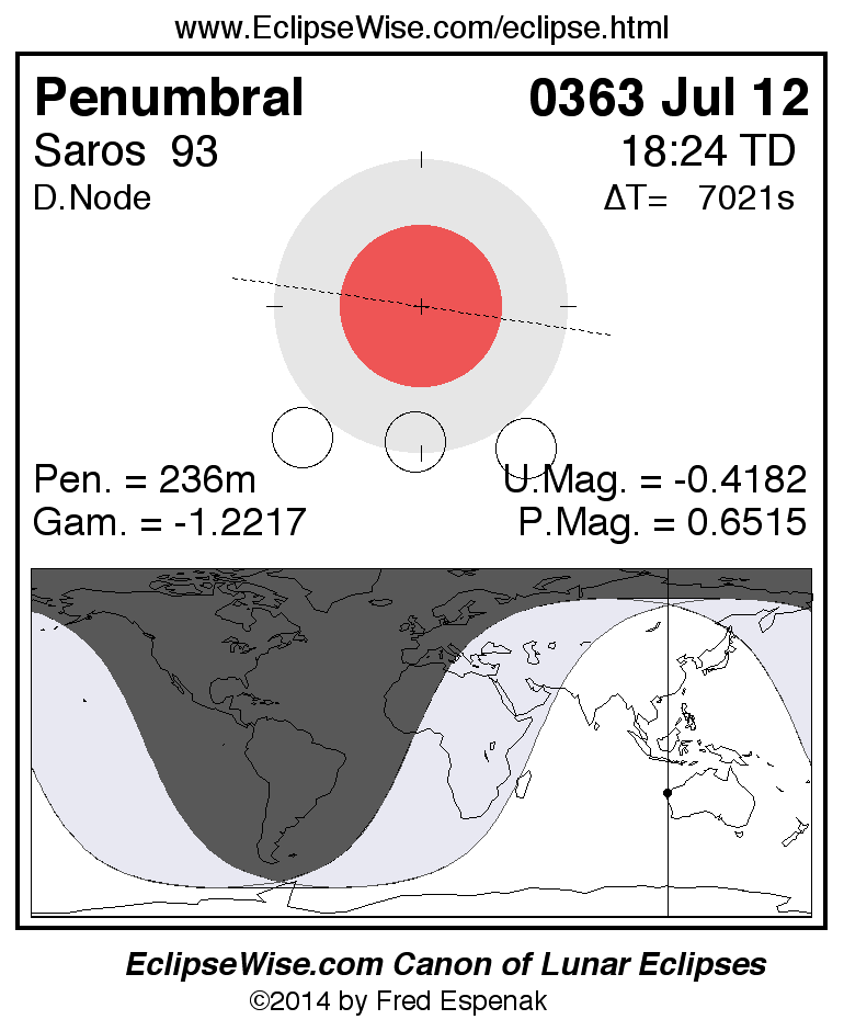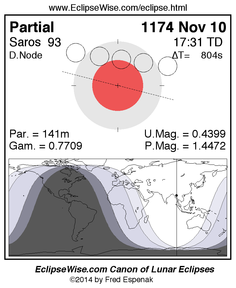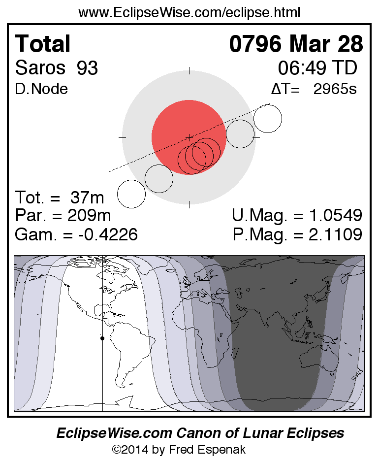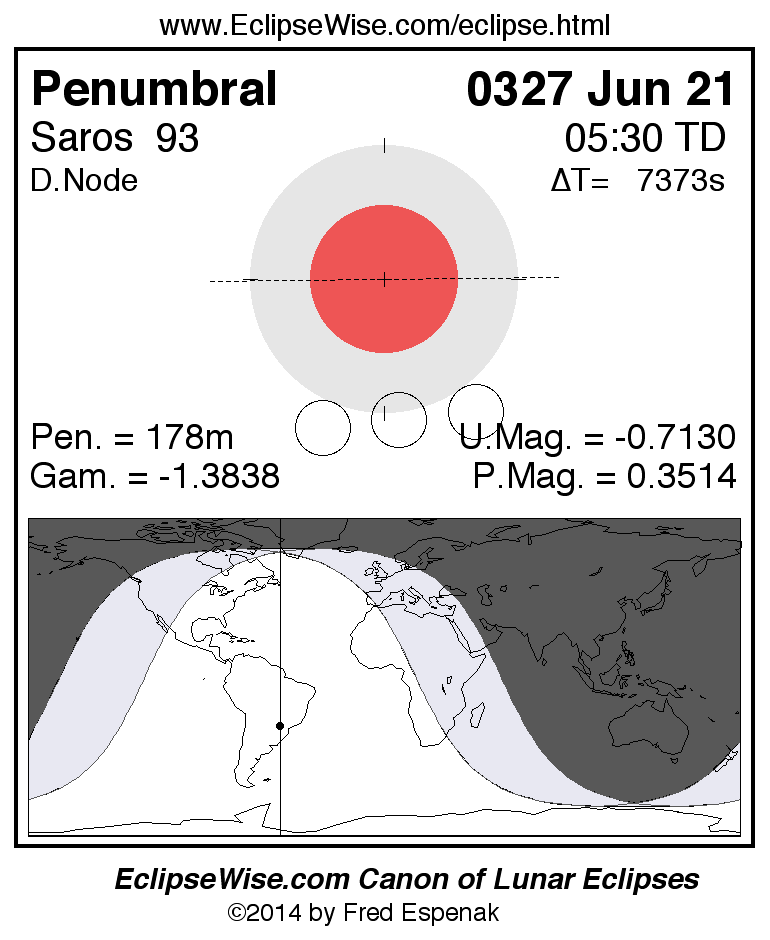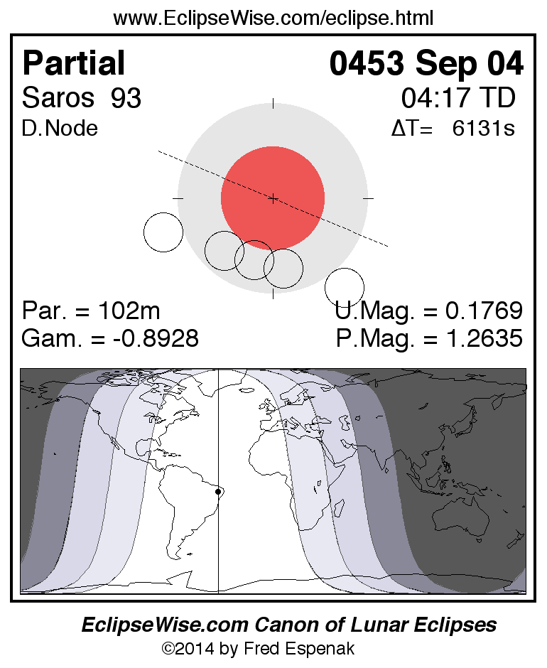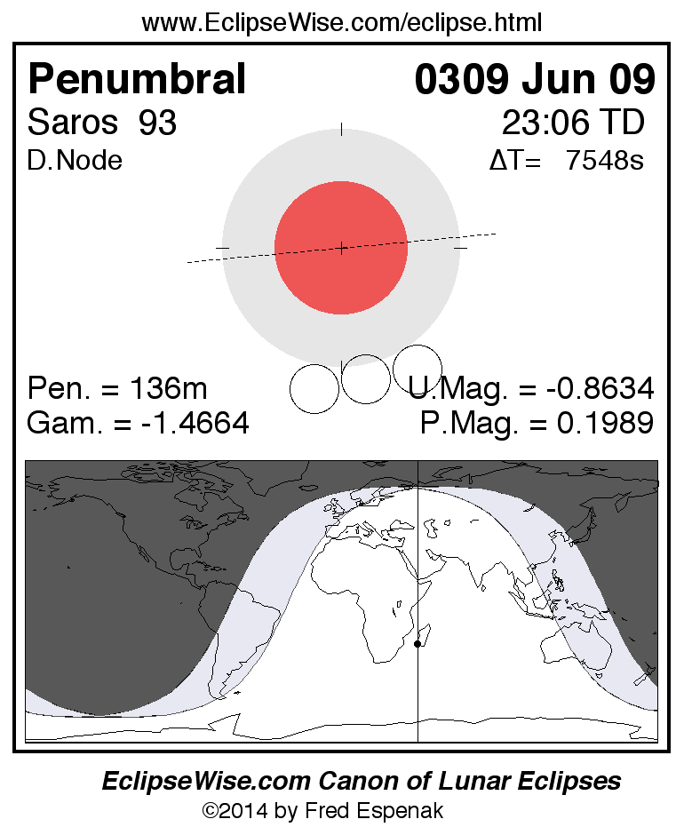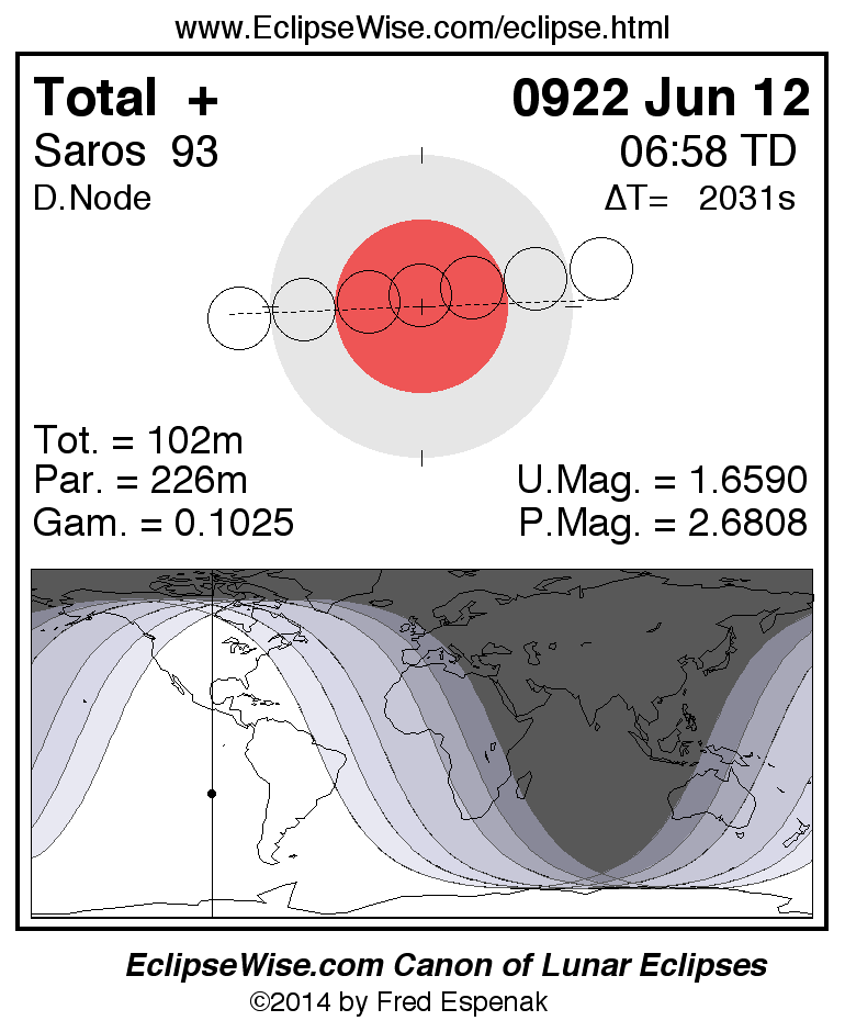 A panorama of all lunar eclipses belonging to Saros 93 is presented here. Each figure shows the Moon's path with respect to Earth's penumbral and umbral shadows. Below the path is a map depicting the geographic region of visibility for the eclipse. The date and time are given for the instant of Greatest Eclipse. Every figure serves as a hyperlink to the EclipseWise Prime page for that eclipse with a larger figure and complete details for the eclipse. Visit the Key to Lunar Eclipse Figures for a detailed explanation of these diagrams. Near the bottom of this page are a series of hyperlinks for more on lunar eclipses.