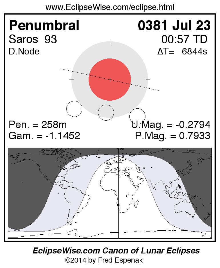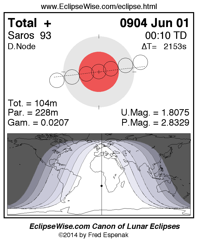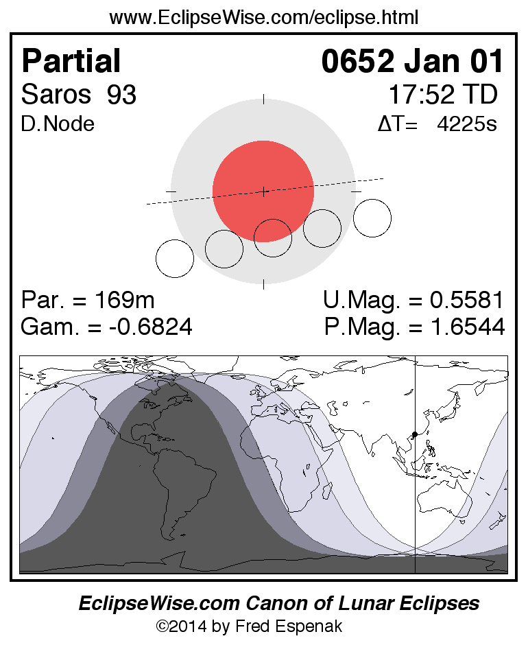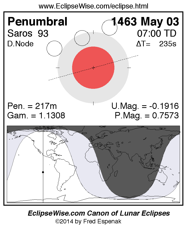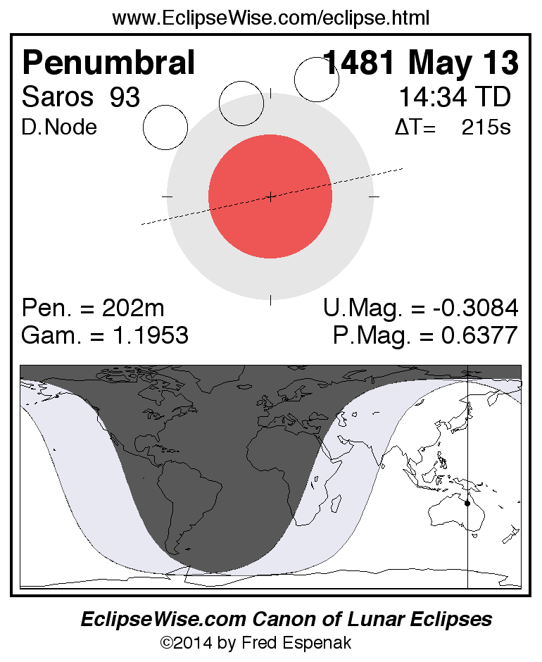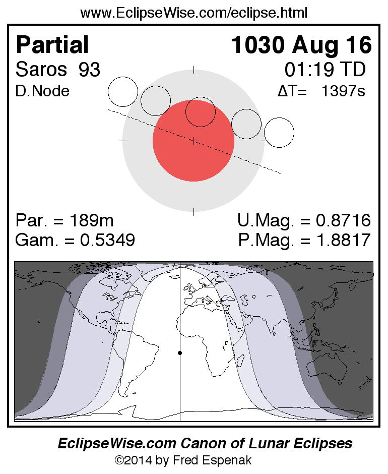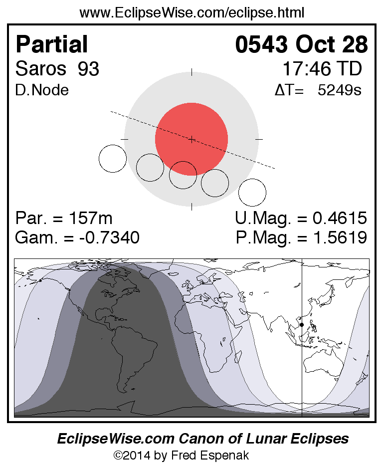 A panorama of all lunar eclipses belonging to Saros 93 is presented here. Each figure shows the Moon's path with respect to Earth's penumbral and umbral shadows. Below the path is a map depicting the geographic region of visibility for the eclipse. The date and time are given for the instant of Greatest Eclipse. Every figure serves as a hyperlink to the EclipseWise Prime page for that eclipse with a larger figure and complete details for the eclipse. Visit the Key to Lunar Eclipse Figures for a detailed explanation of these diagrams. Near the bottom of this page are a series of hyperlinks for more on lunar eclipses.