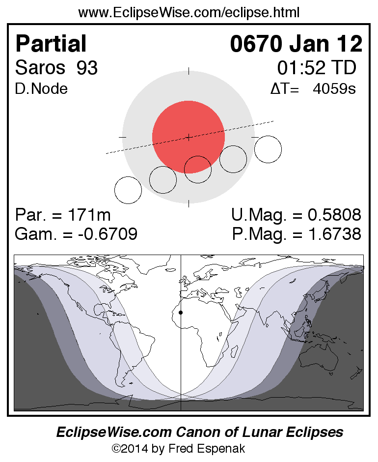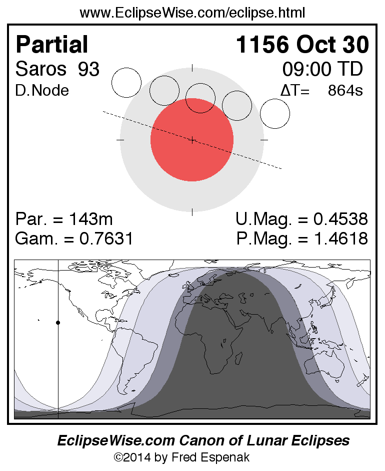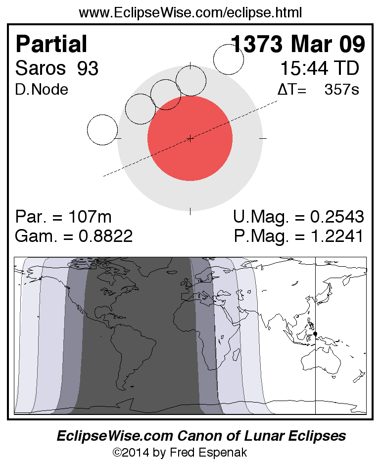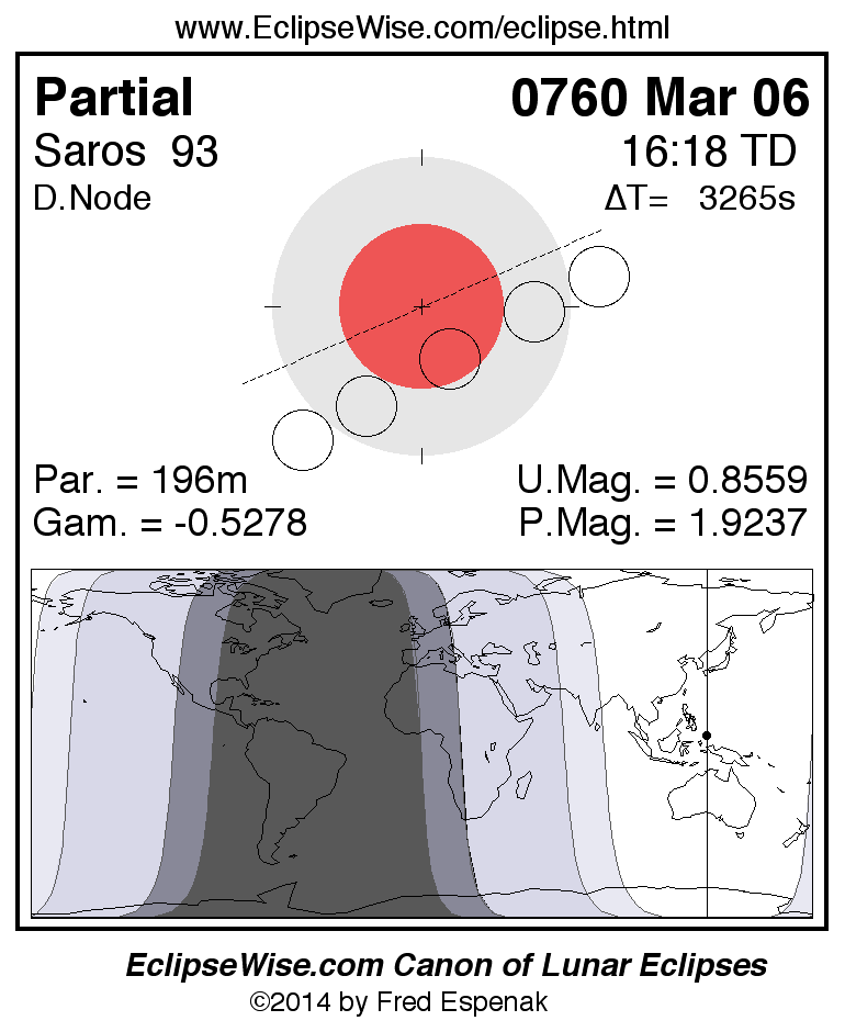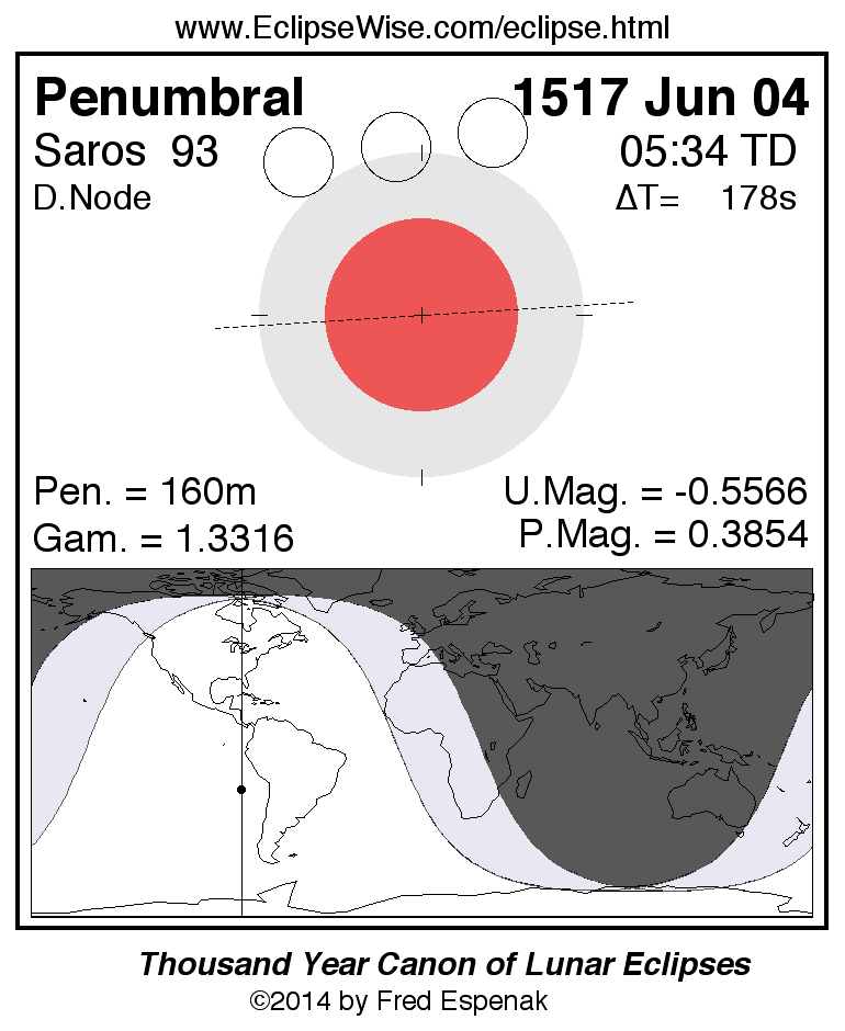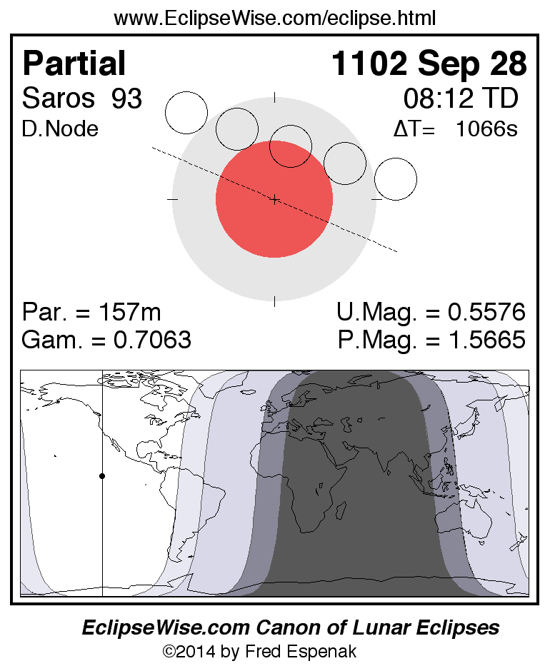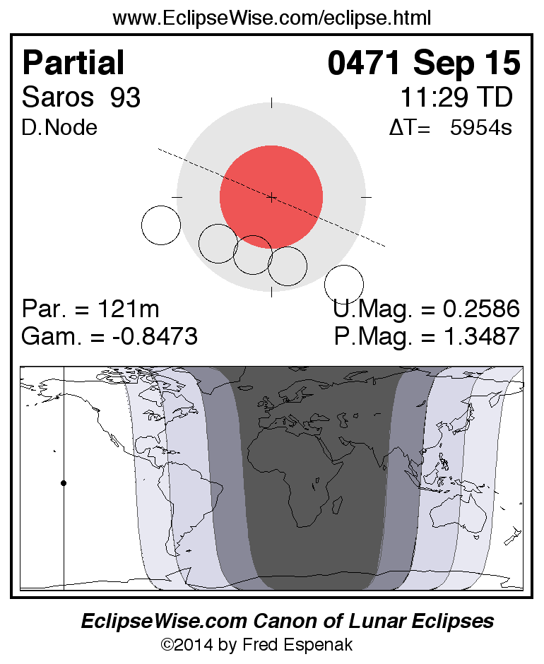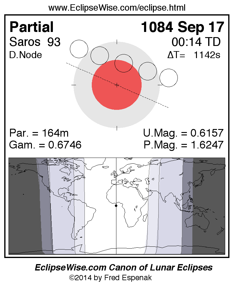A panorama of all lunar eclipses belonging to Saros 93 is presented here. Each figure shows the Moon's path with respect to Earth's penumbral and umbral shadows. Below the path is a map depicting the geographic region of visibility for the eclipse. The date and time are given for the instant of Greatest Eclipse. Every figure serves as a hyperlink to the EclipseWise Prime page for that eclipse with a larger figure and complete details for the eclipse. Visit the Key to Lunar Eclipse Figures for a detailed explanation of these diagrams. Near the bottom of this page are a series of hyperlinks for more on lunar eclipses.