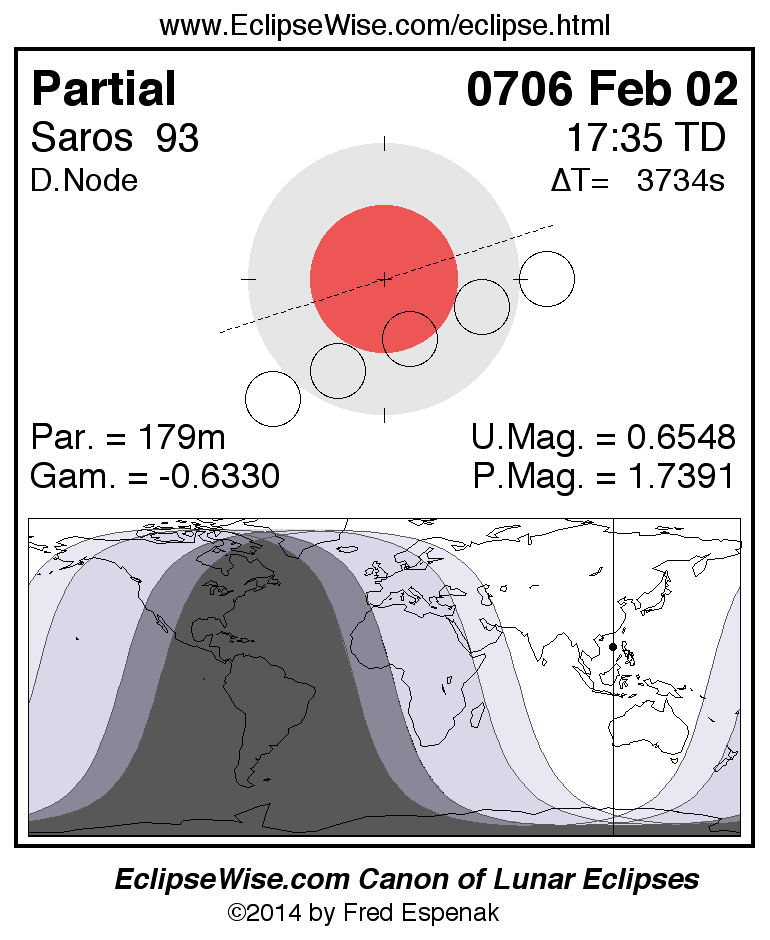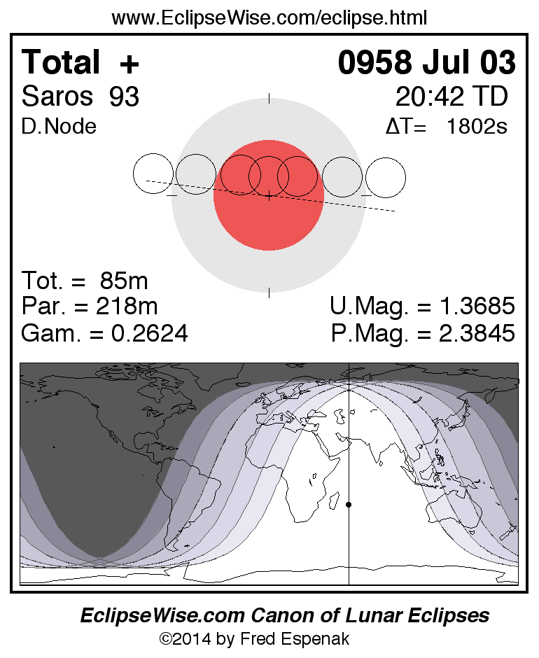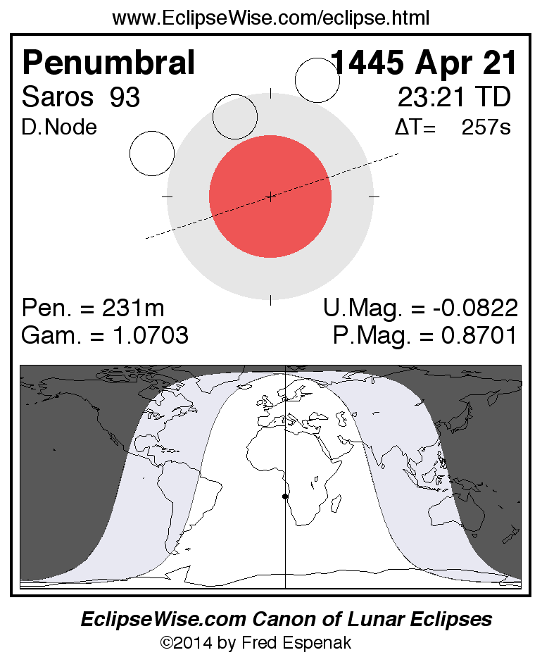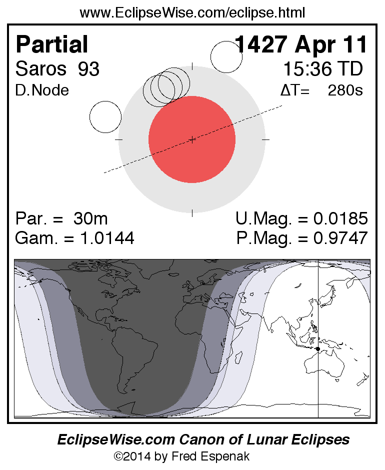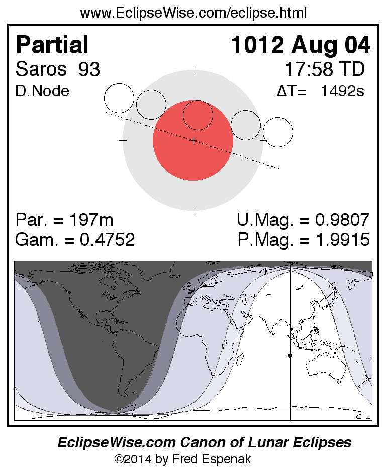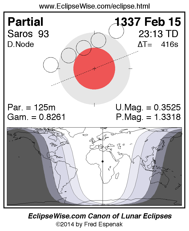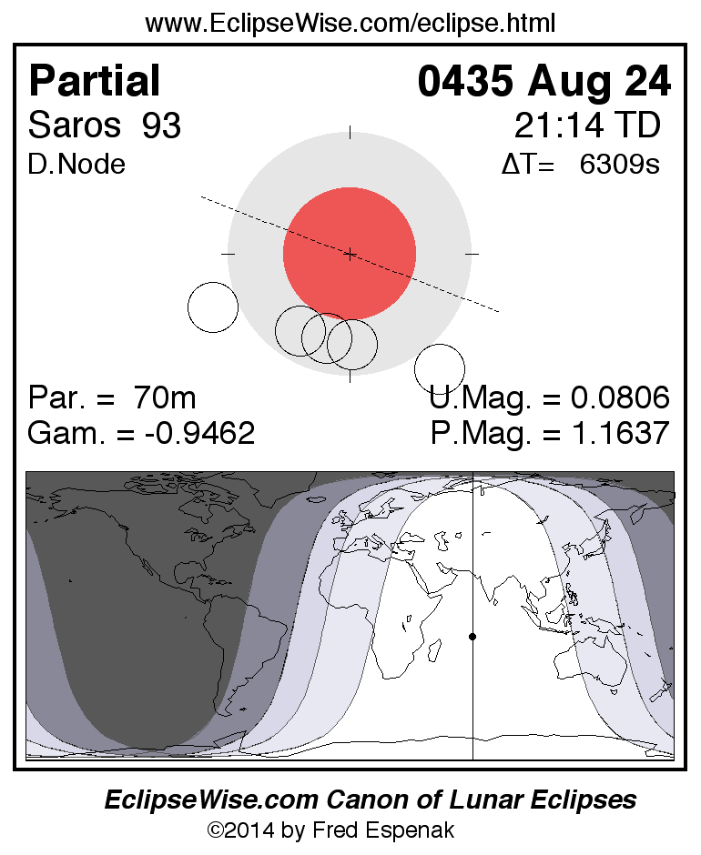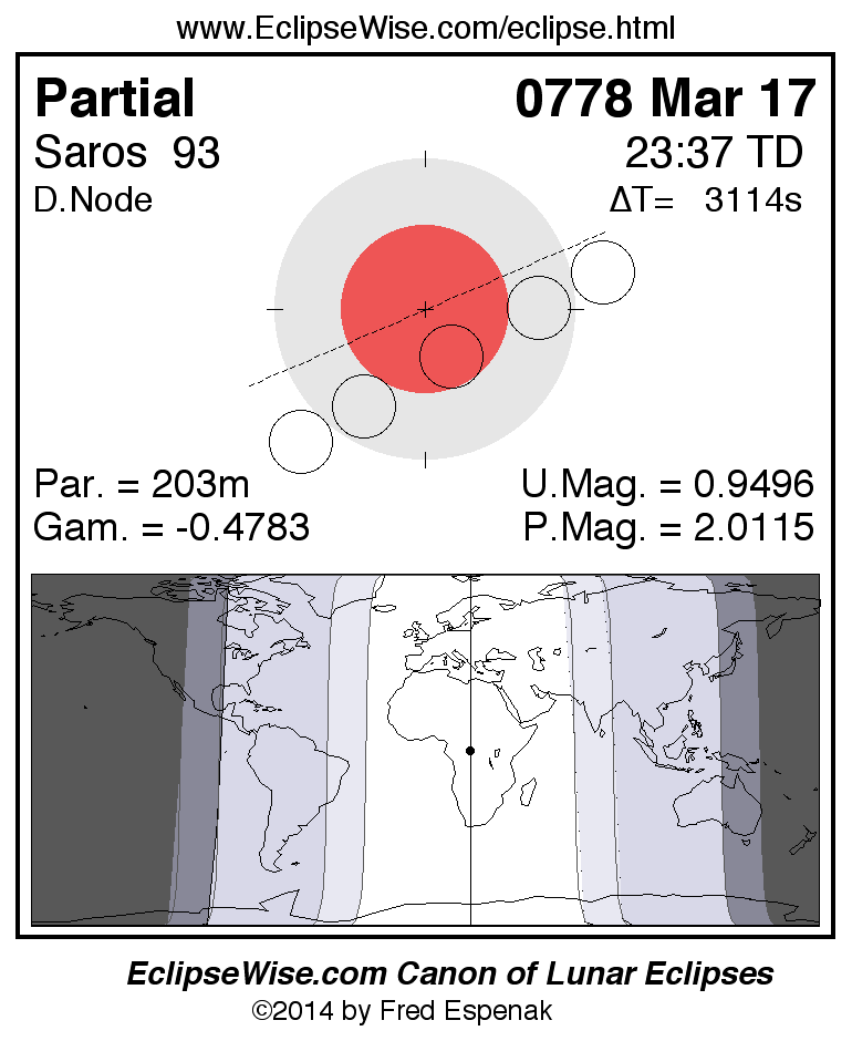 A panorama of all lunar eclipses belonging to Saros 93 is presented here. Each figure shows the Moon's path with respect to Earth's penumbral and umbral shadows. Below the path is a map depicting the geographic region of visibility for the eclipse. The date and time are given for the instant of Greatest Eclipse. Every figure serves as a hyperlink to the EclipseWise Prime page for that eclipse with a larger figure and complete details for the eclipse. Visit the Key to Lunar Eclipse Figures for a detailed explanation of these diagrams. Near the bottom of this page are a series of hyperlinks for more on lunar eclipses.
