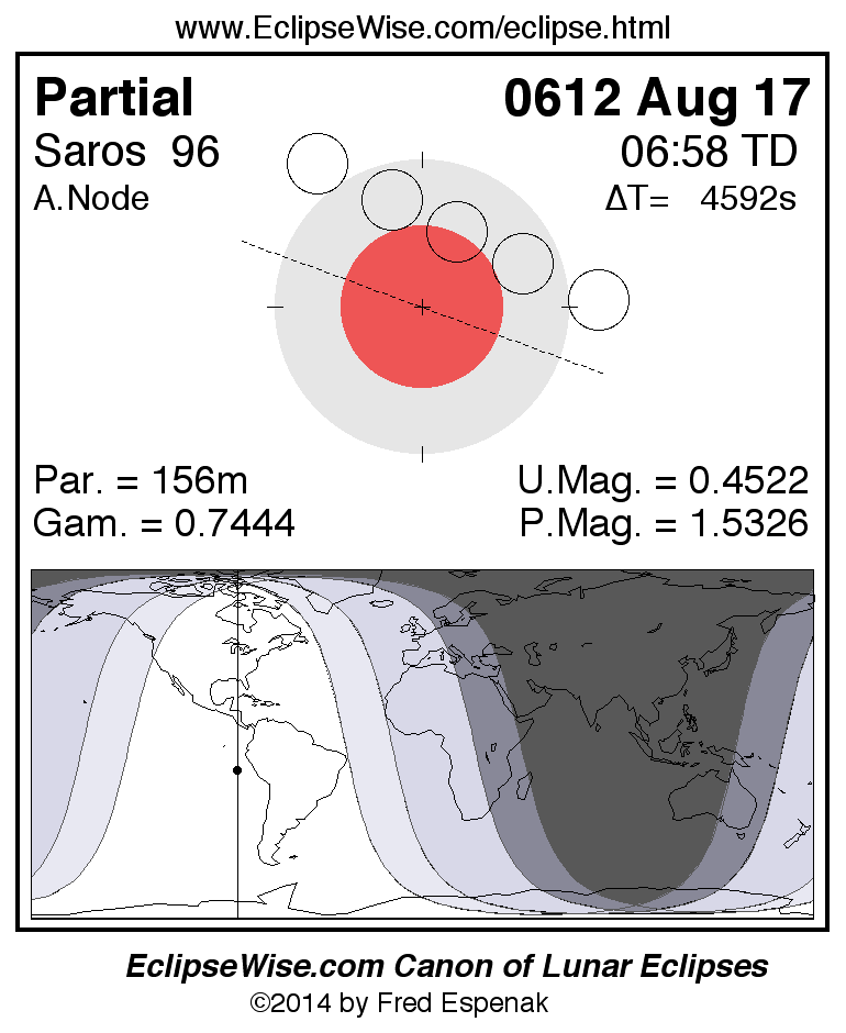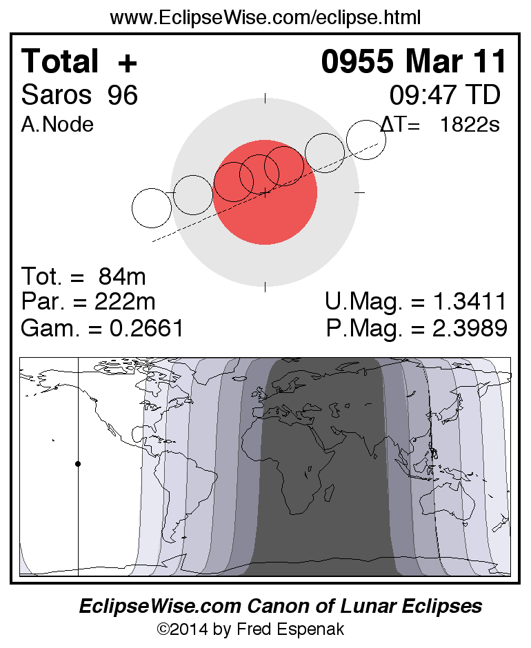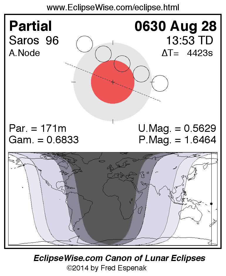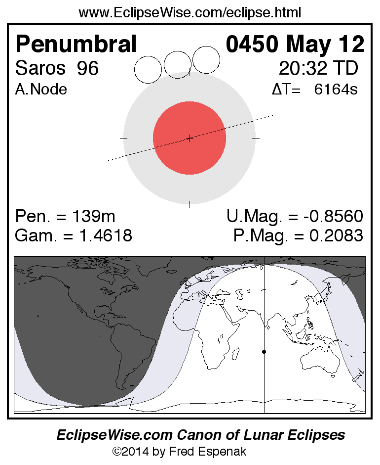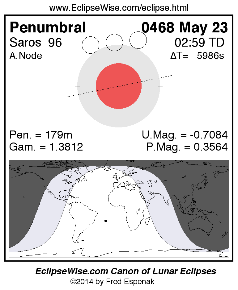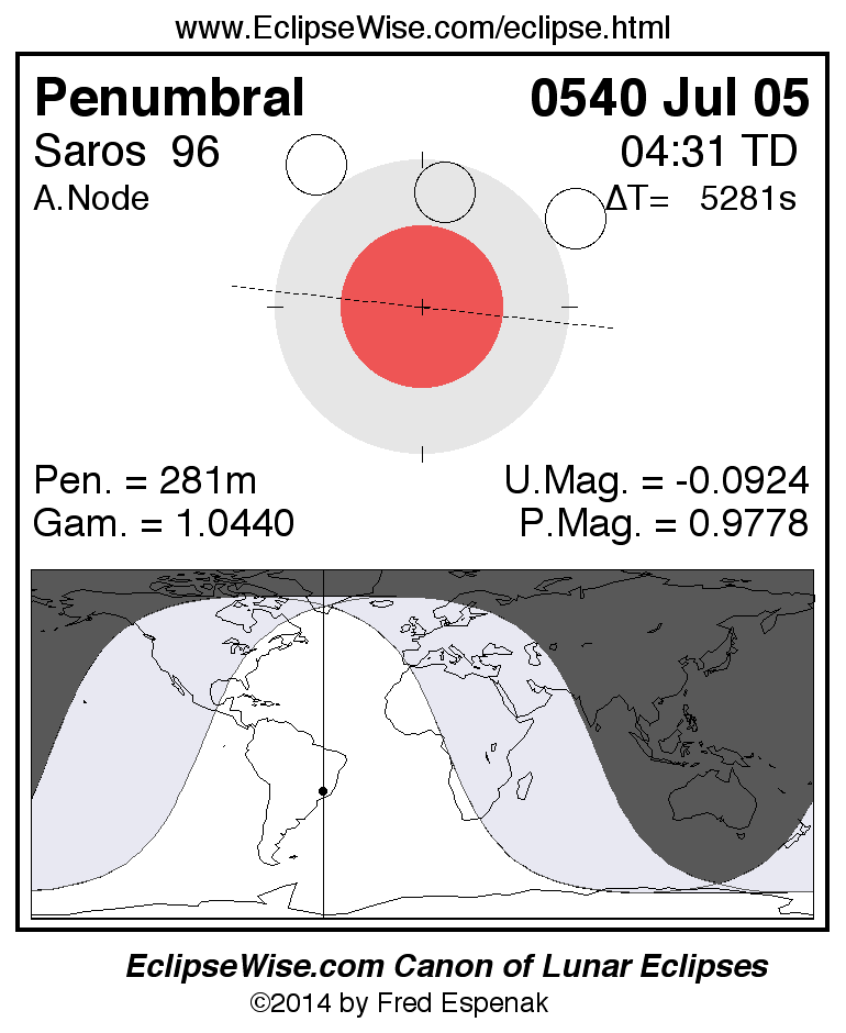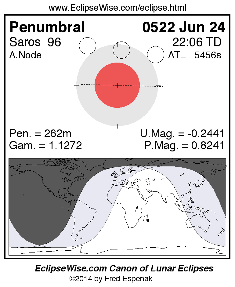 A panorama of all lunar eclipses belonging to Saros 96 is presented here. Each figure shows the Moon's path with respect to Earth's penumbral and umbral shadows. Below the path is a map depicting the geographic region of visibility for the eclipse. The date and time are given for the instant of Greatest Eclipse. Every figure serves as a hyperlink to the EclipseWise Prime page for that eclipse with a larger figure and complete details for the eclipse. Visit the Key to Lunar Eclipse Figures for a detailed explanation of these diagrams. Near the bottom of this page are a series of hyperlinks for more on lunar eclipses.