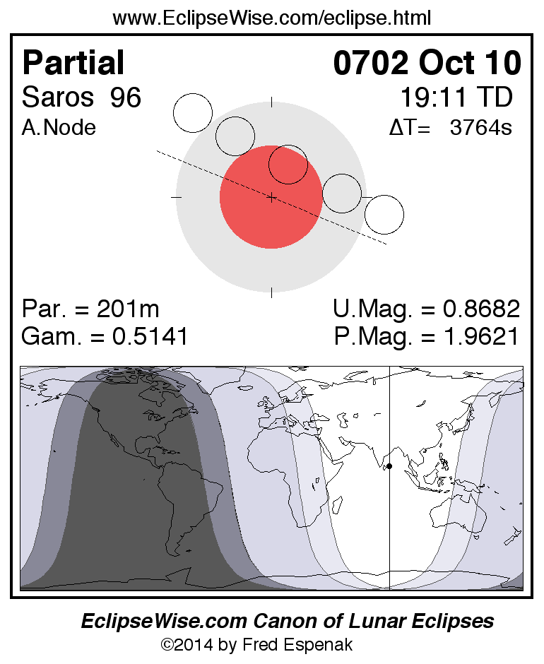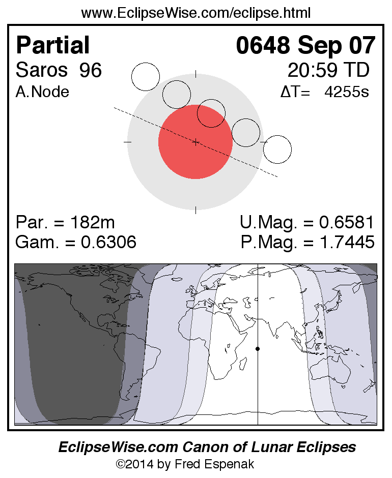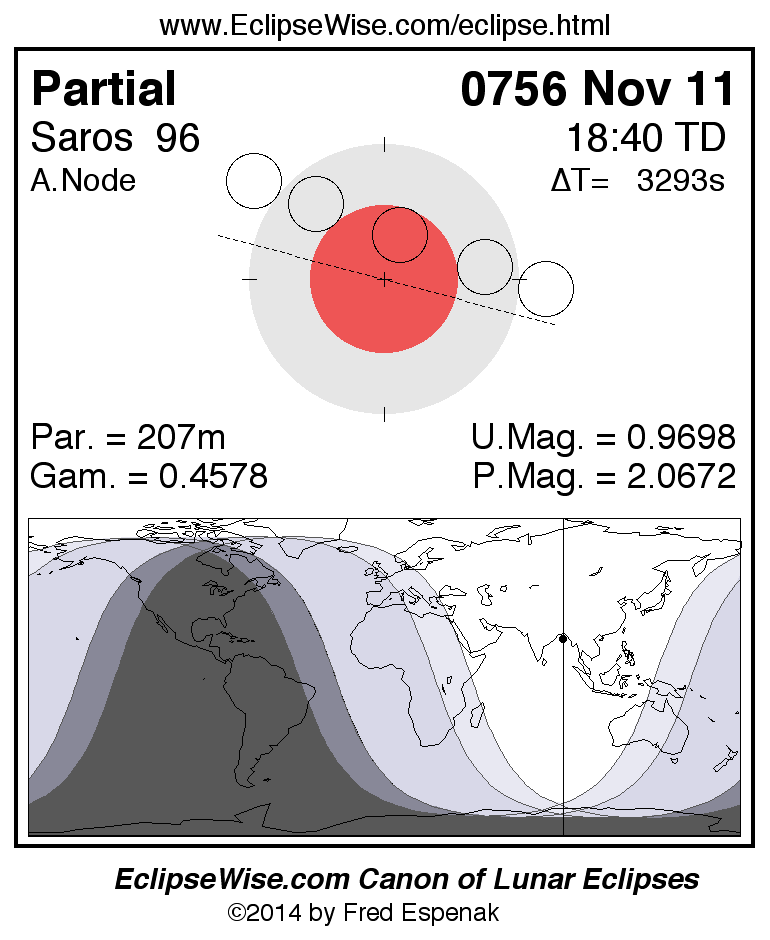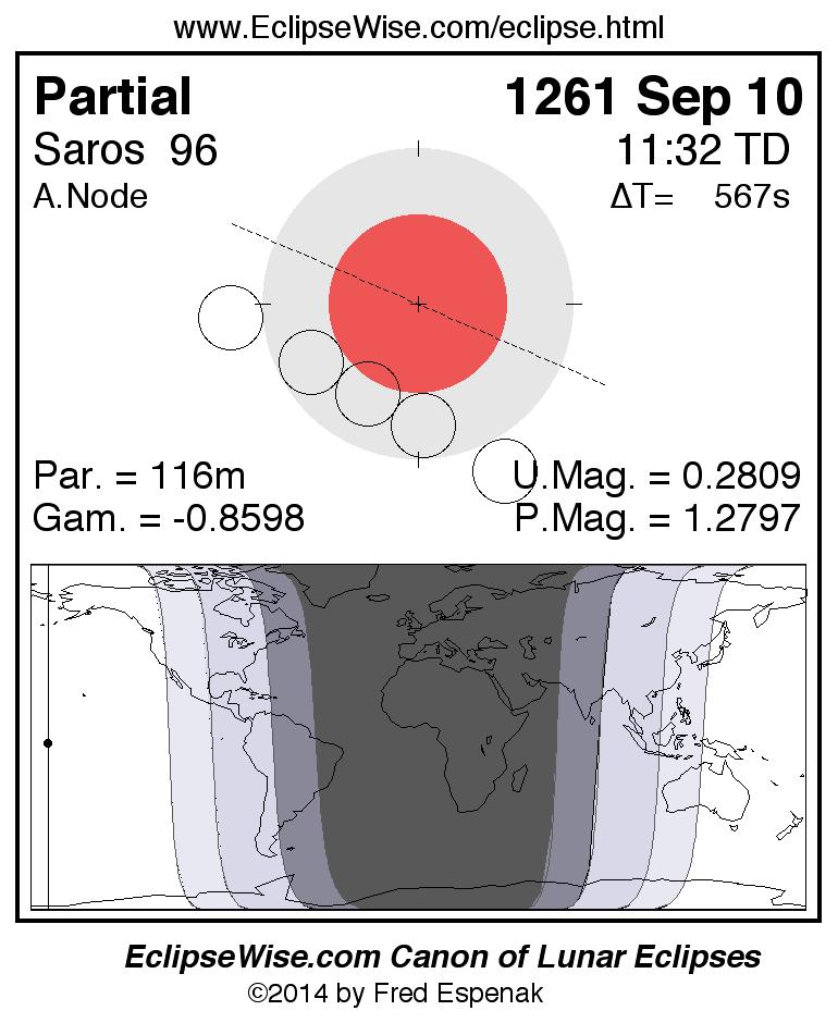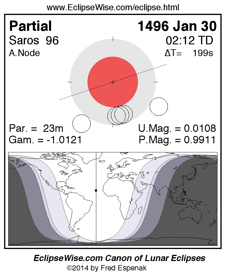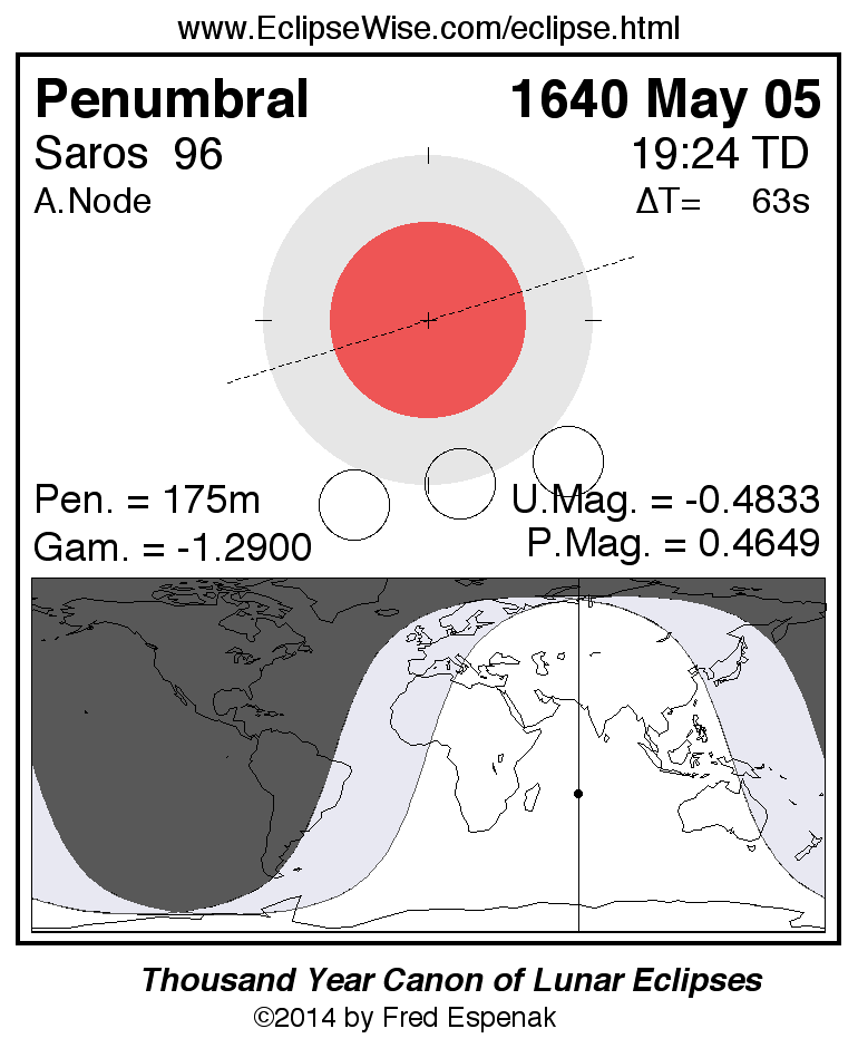 A panorama of all lunar eclipses belonging to Saros 96 is presented here. Each figure shows the Moon's path with respect to Earth's penumbral and umbral shadows. Below the path is a map depicting the geographic region of visibility for the eclipse. The date and time are given for the instant of Greatest Eclipse. Every figure serves as a hyperlink to the EclipseWise Prime page for that eclipse with a larger figure and complete details for the eclipse. Visit the Key to Lunar Eclipse Figures for a detailed explanation of these diagrams. Near the bottom of this page are a series of hyperlinks for more on lunar eclipses.