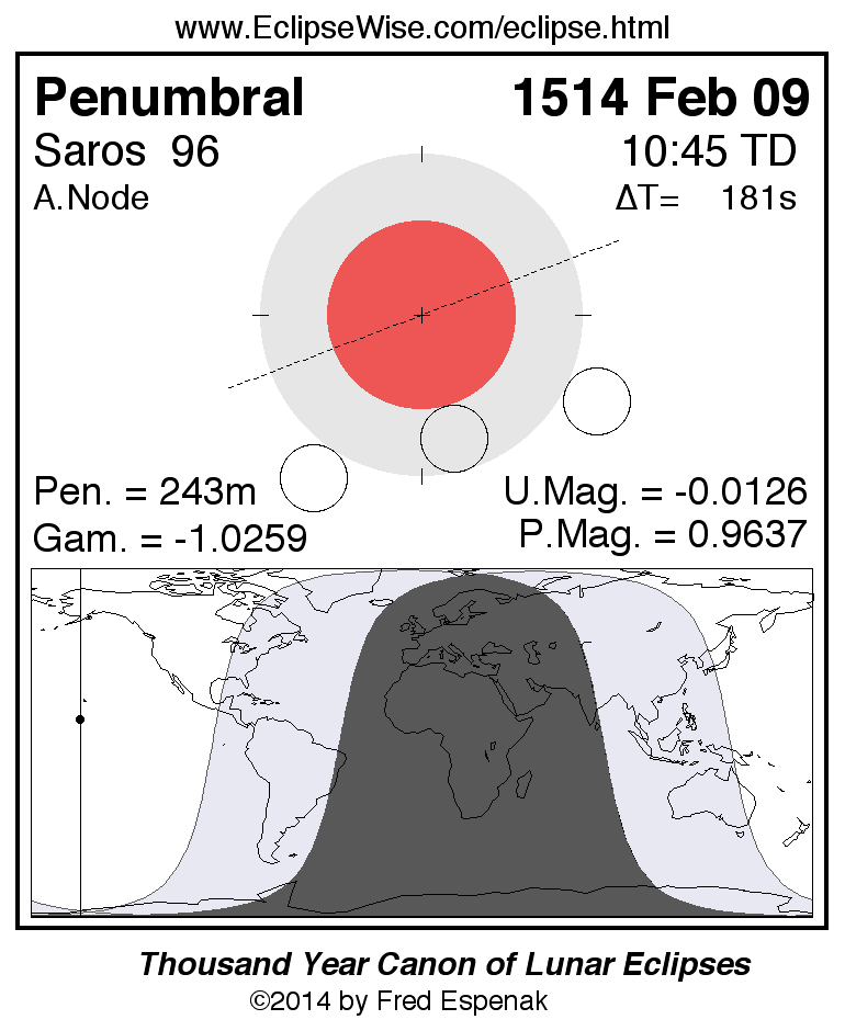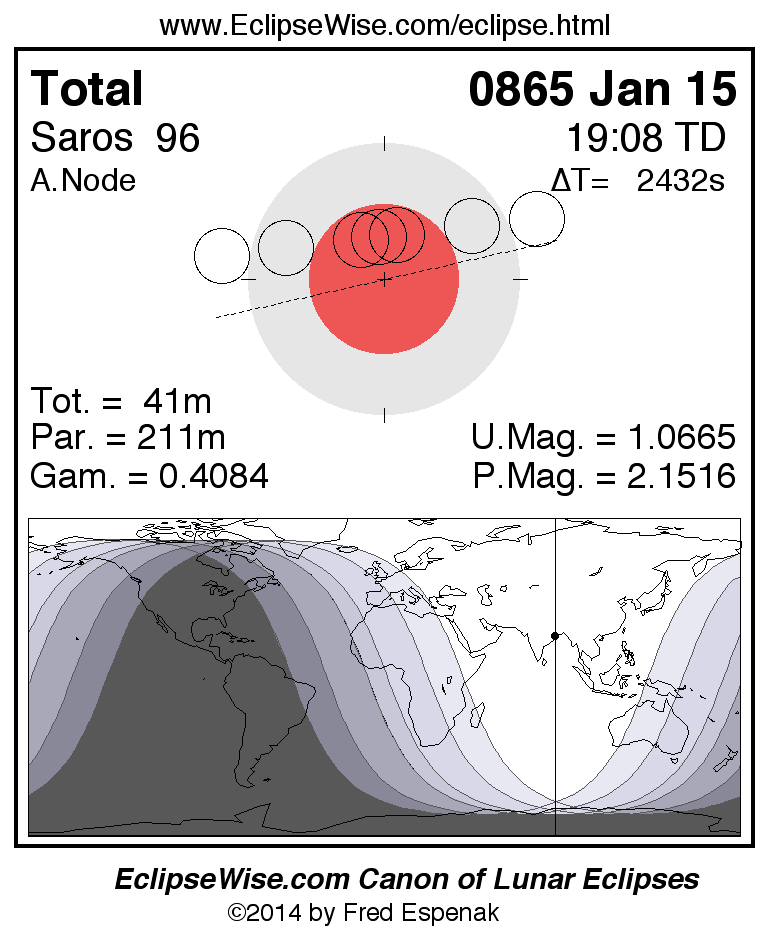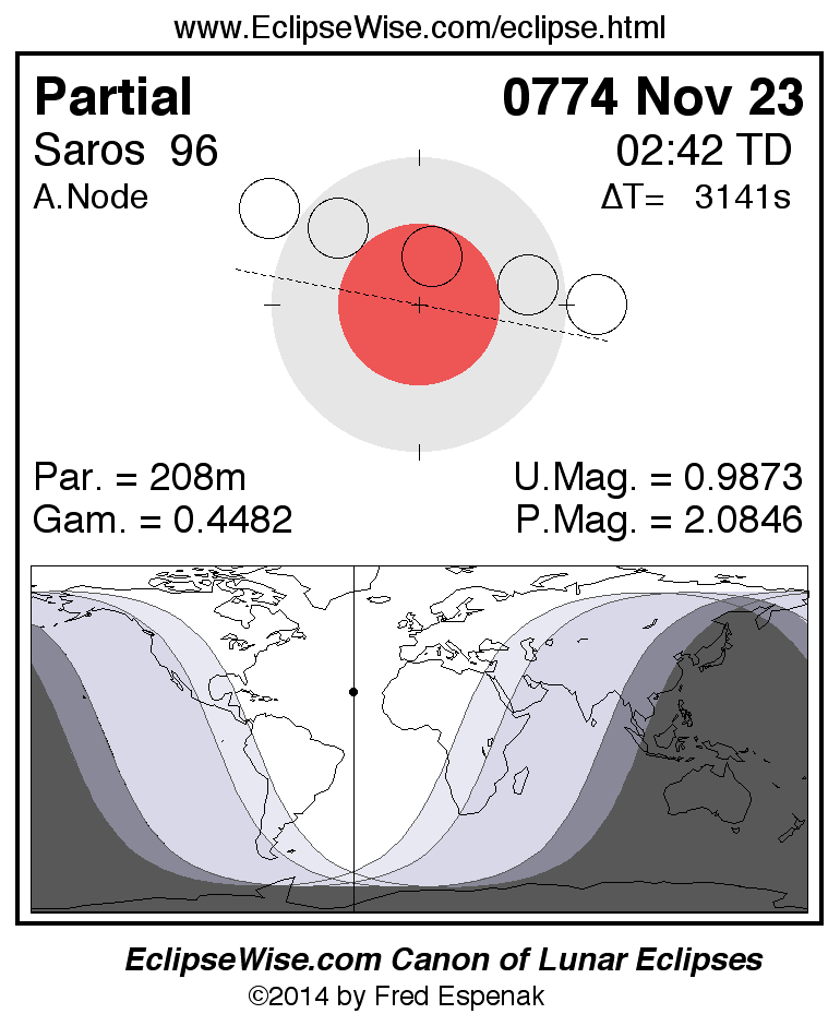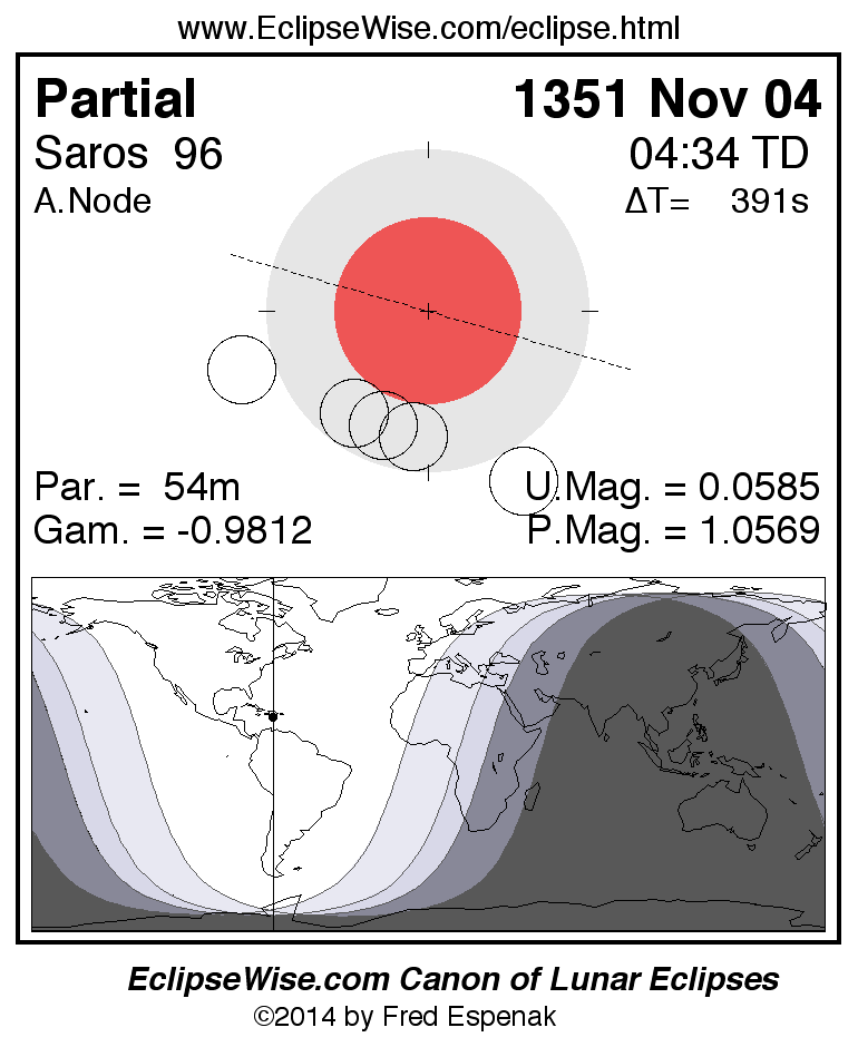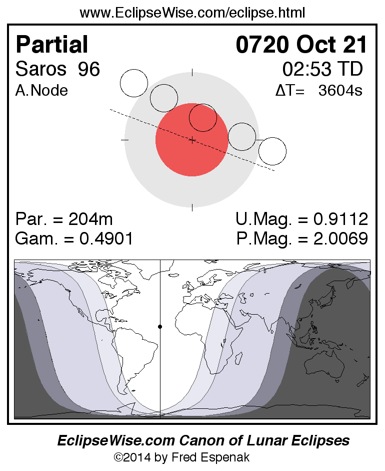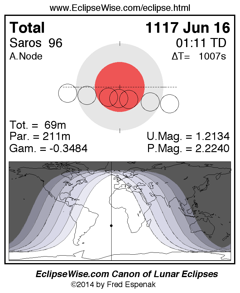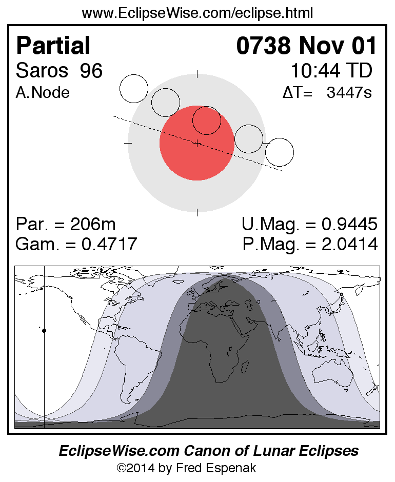 A panorama of all lunar eclipses belonging to Saros 96 is presented here. Each figure shows the Moon's path with respect to Earth's penumbral and umbral shadows. Below the path is a map depicting the geographic region of visibility for the eclipse. The date and time are given for the instant of Greatest Eclipse. Every figure serves as a hyperlink to the EclipseWise Prime page for that eclipse with a larger figure and complete details for the eclipse. Visit the Key to Lunar Eclipse Figures for a detailed explanation of these diagrams. Near the bottom of this page are a series of hyperlinks for more on lunar eclipses.