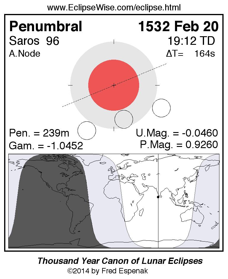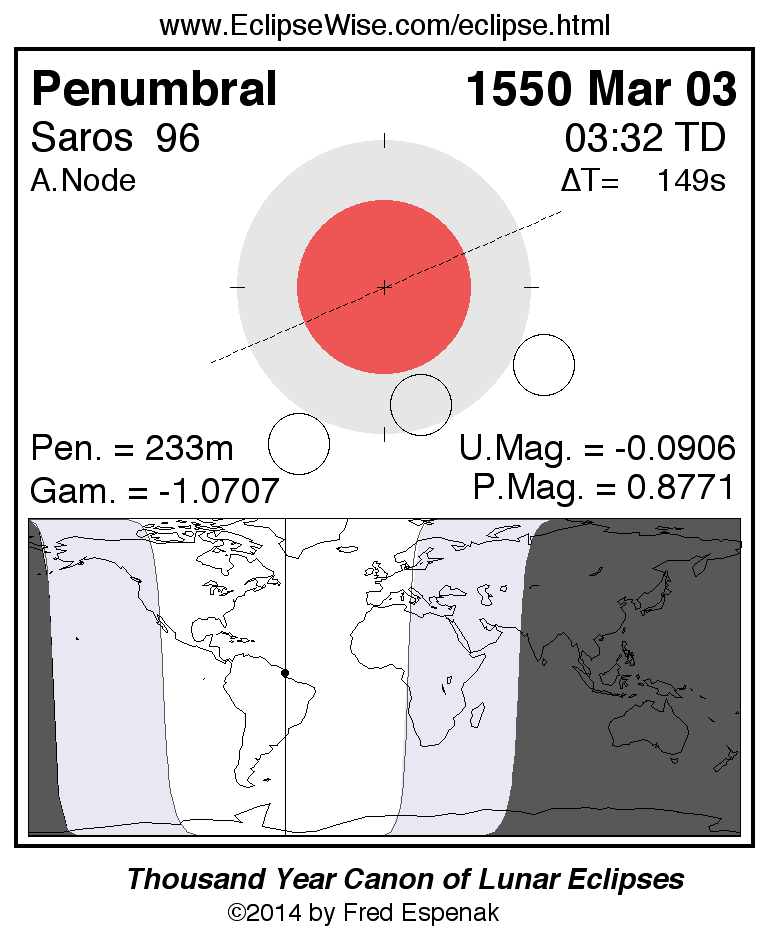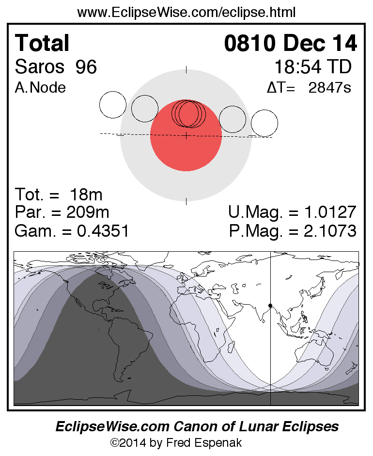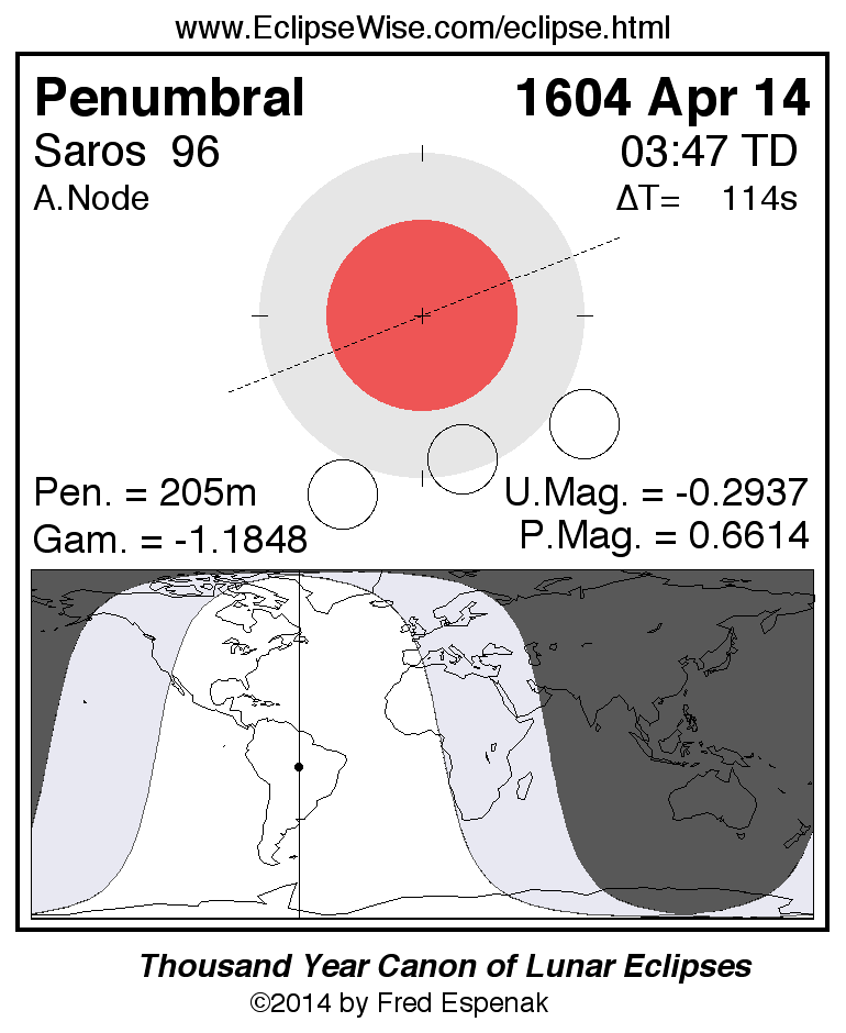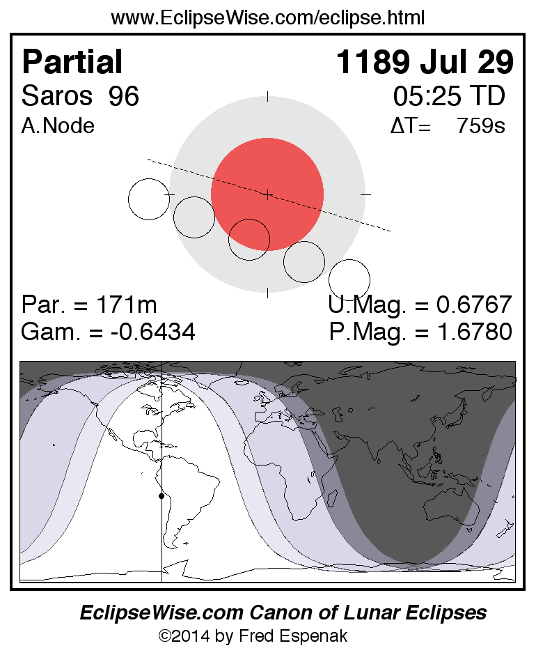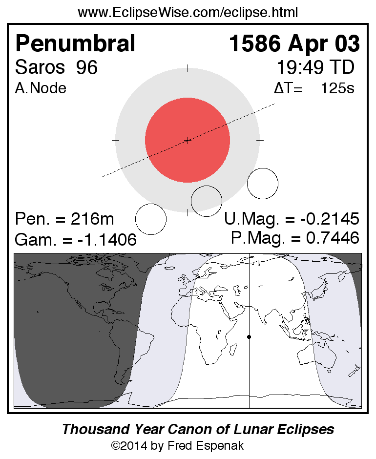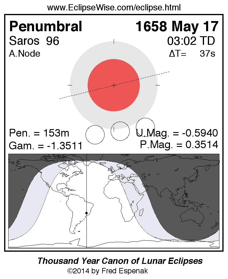 A panorama of all lunar eclipses belonging to Saros 96 is presented here. Each figure shows the Moon's path with respect to Earth's penumbral and umbral shadows. Below the path is a map depicting the geographic region of visibility for the eclipse. The date and time are given for the instant of Greatest Eclipse. Every figure serves as a hyperlink to the EclipseWise Prime page for that eclipse with a larger figure and complete details for the eclipse. Visit the Key to Lunar Eclipse Figures for a detailed explanation of these diagrams. Near the bottom of this page are a series of hyperlinks for more on lunar eclipses.