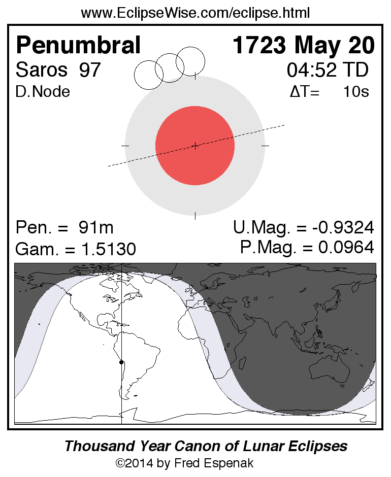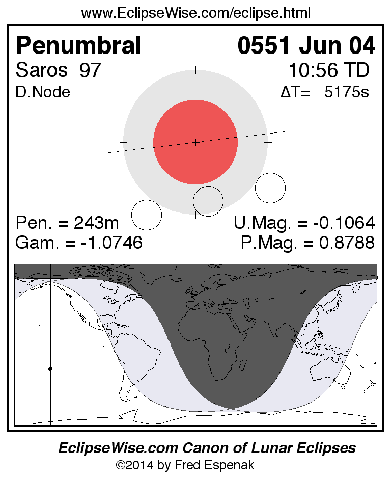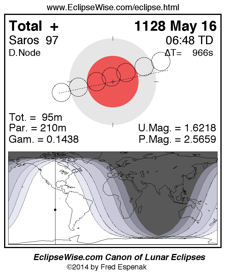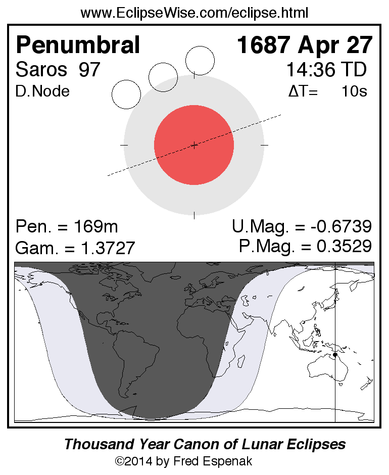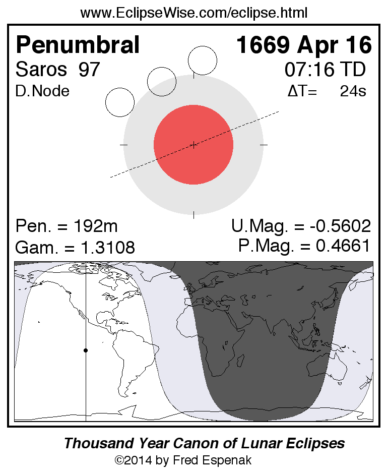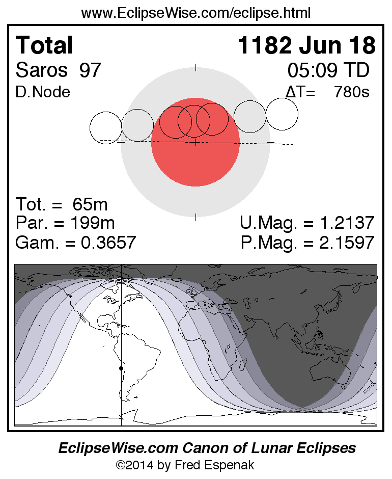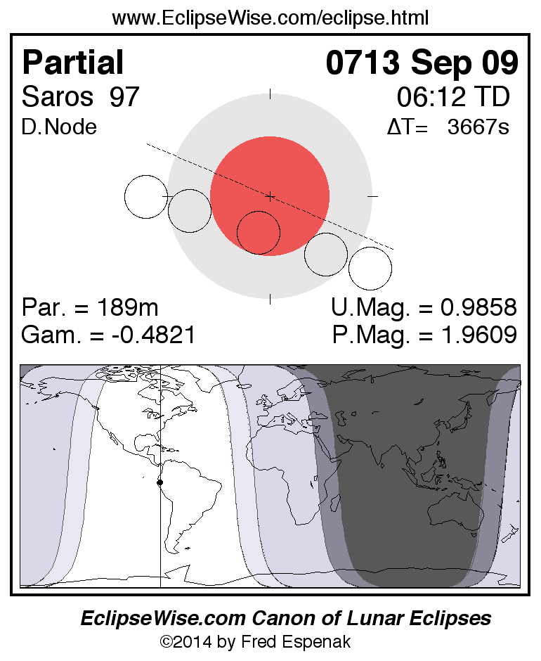 A panorama of all lunar eclipses belonging to Saros 97 is presented here. Each figure shows the Moon's path with respect to Earth's penumbral and umbral shadows. Below the path is a map depicting the geographic region of visibility for the eclipse. The date and time are given for the instant of Greatest Eclipse. Every figure serves as a hyperlink to the EclipseWise Prime page for that eclipse with a larger figure and complete details for the eclipse. Visit the Key to Lunar Eclipse Figures for a detailed explanation of these diagrams. Near the bottom of this page are a series of hyperlinks for more on lunar eclipses.
