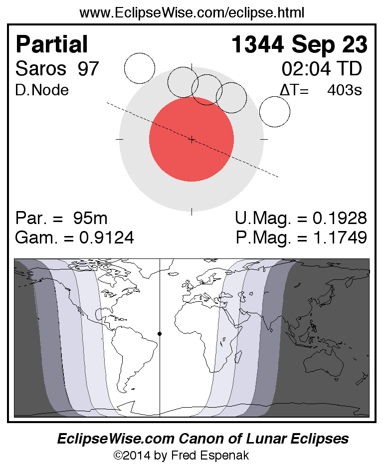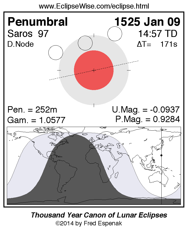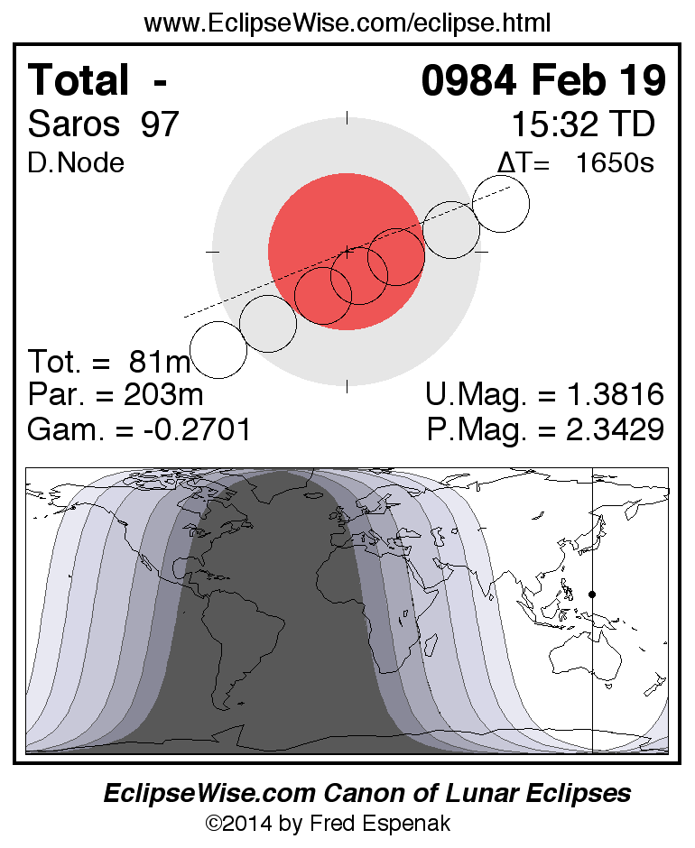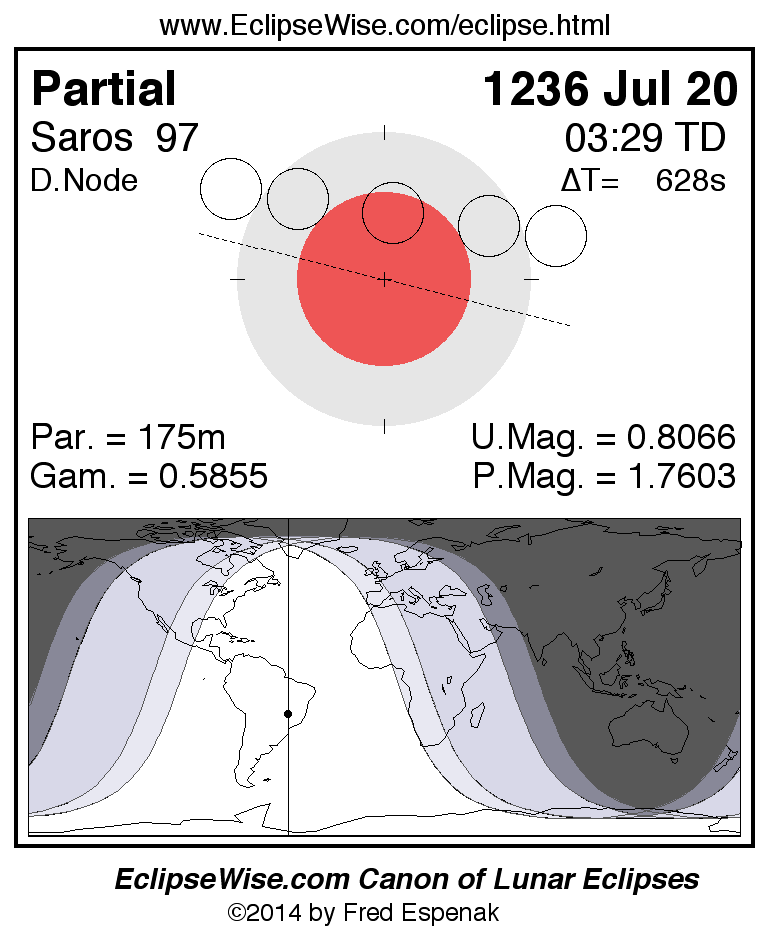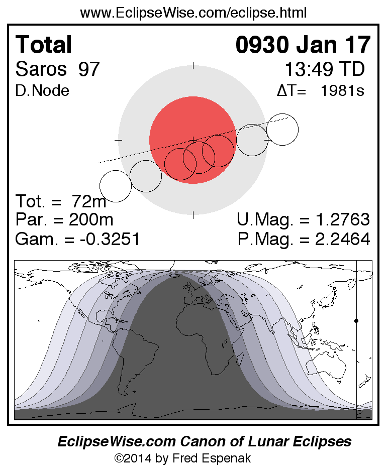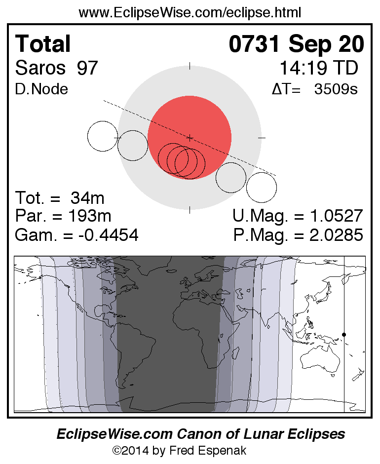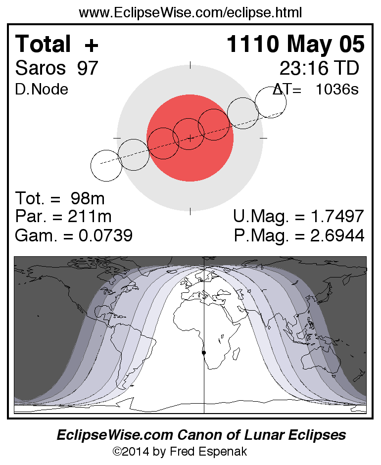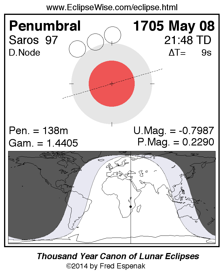 A panorama of all lunar eclipses belonging to Saros 97 is presented here. Each figure shows the Moon's path with respect to Earth's penumbral and umbral shadows. Below the path is a map depicting the geographic region of visibility for the eclipse. The date and time are given for the instant of Greatest Eclipse. Every figure serves as a hyperlink to the EclipseWise Prime page for that eclipse with a larger figure and complete details for the eclipse. Visit the Key to Lunar Eclipse Figures for a detailed explanation of these diagrams. Near the bottom of this page are a series of hyperlinks for more on lunar eclipses.