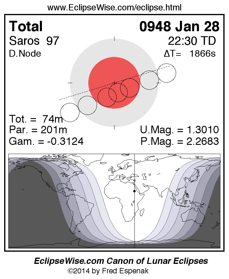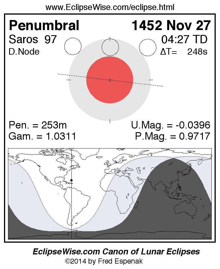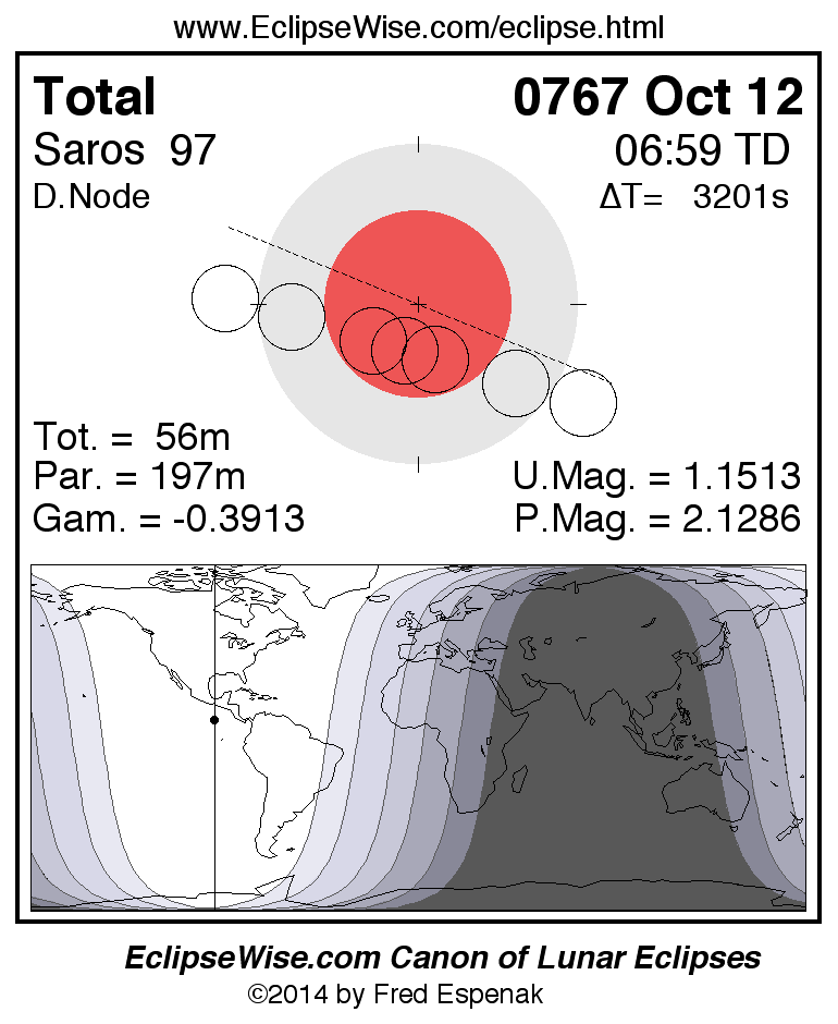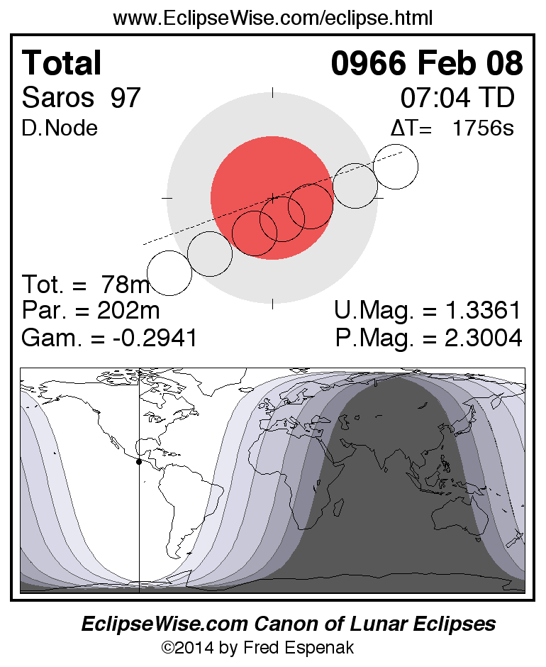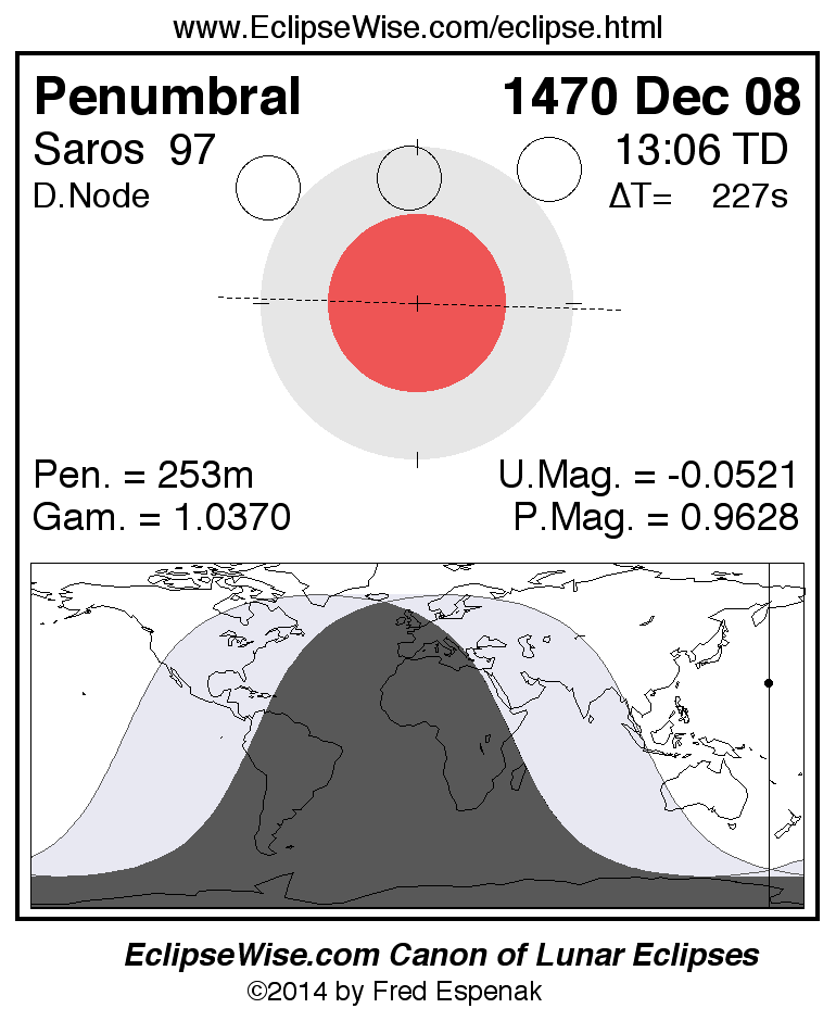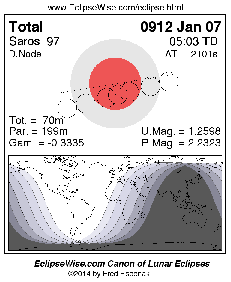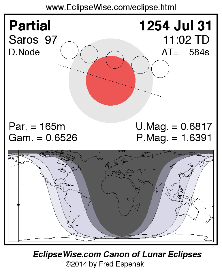 A panorama of all lunar eclipses belonging to Saros 97 is presented here. Each figure shows the Moon's path with respect to Earth's penumbral and umbral shadows. Below the path is a map depicting the geographic region of visibility for the eclipse. The date and time are given for the instant of Greatest Eclipse. Every figure serves as a hyperlink to the EclipseWise Prime page for that eclipse with a larger figure and complete details for the eclipse. Visit the Key to Lunar Eclipse Figures for a detailed explanation of these diagrams. Near the bottom of this page are a series of hyperlinks for more on lunar eclipses.