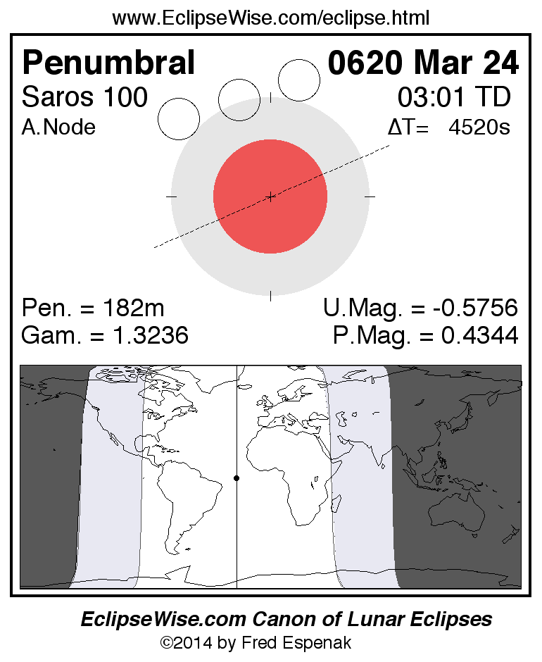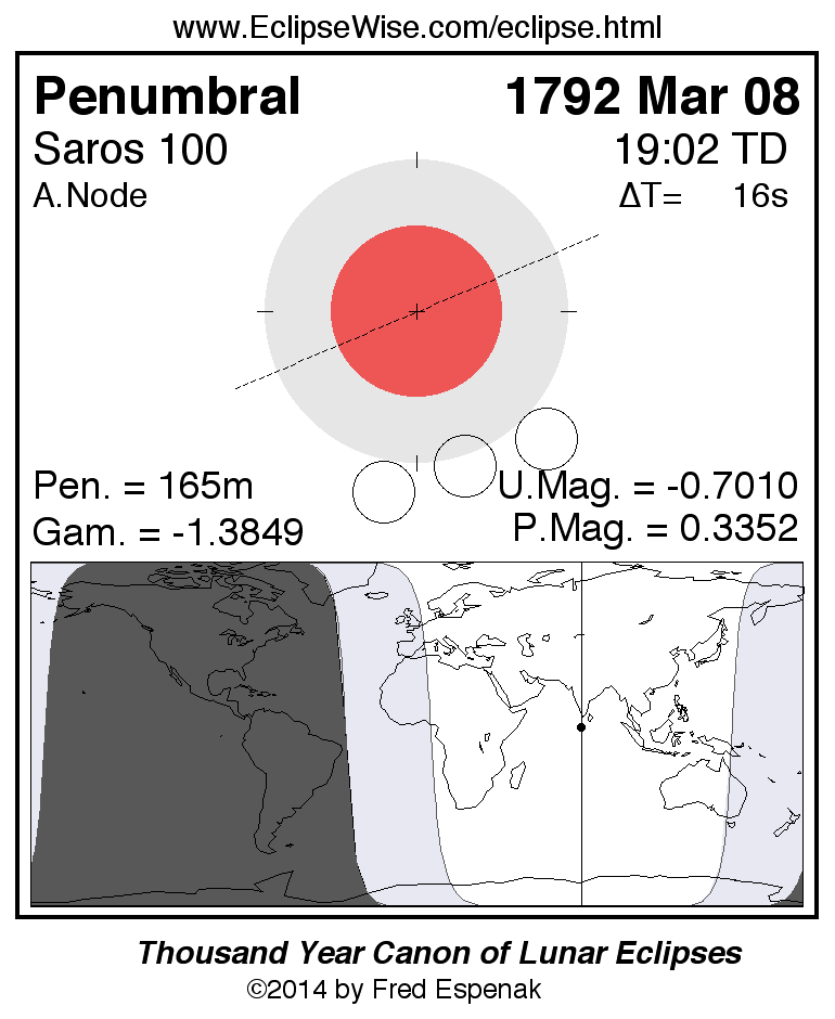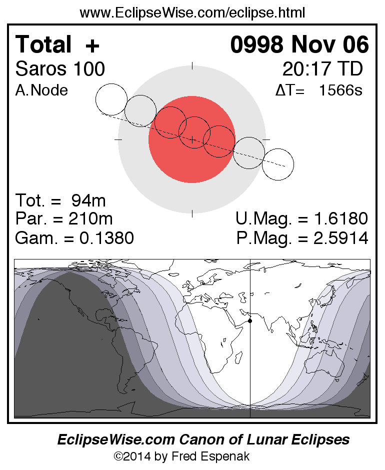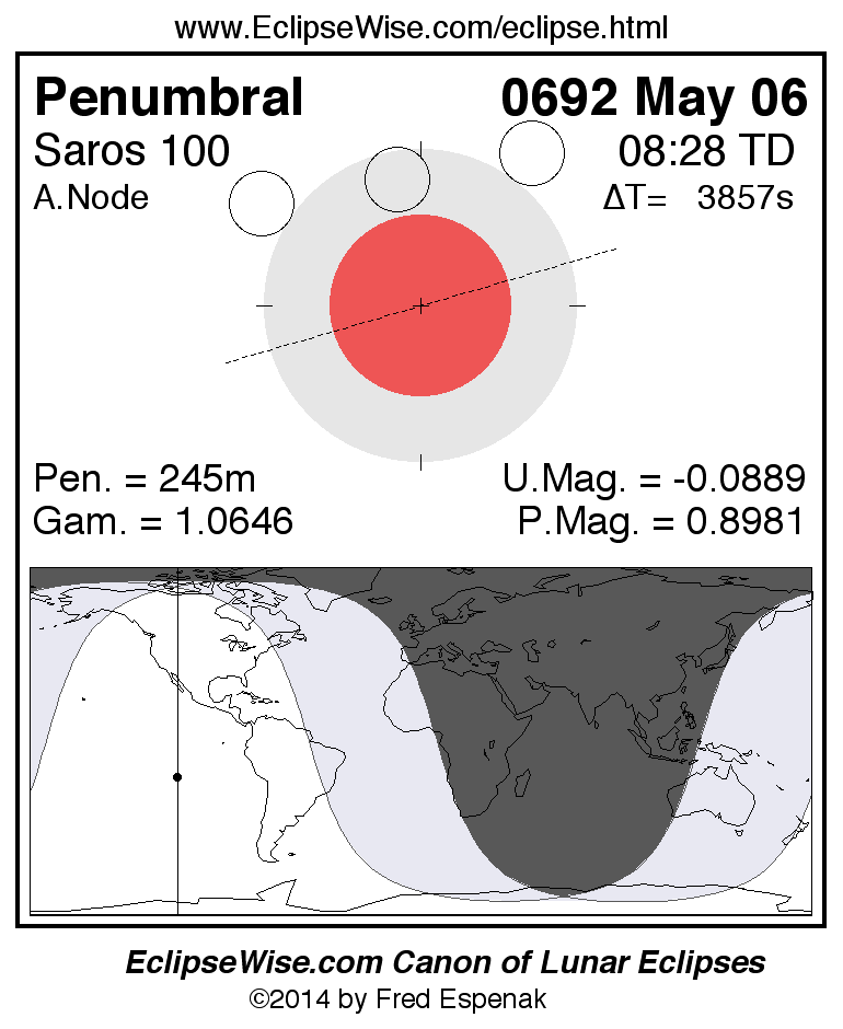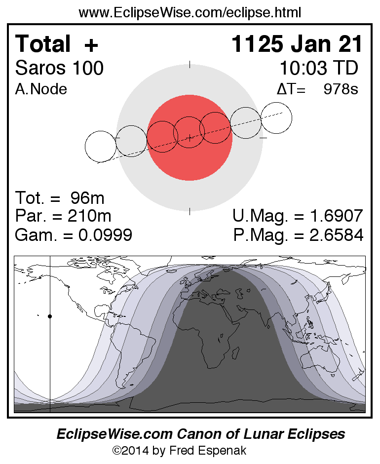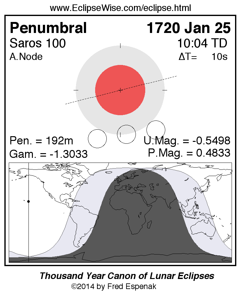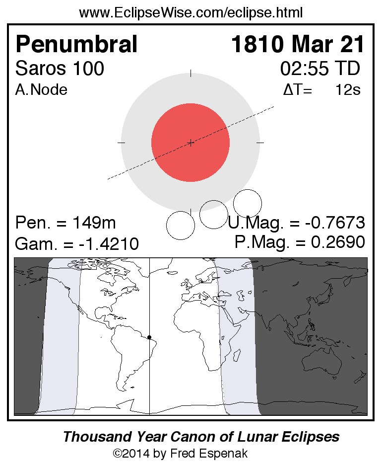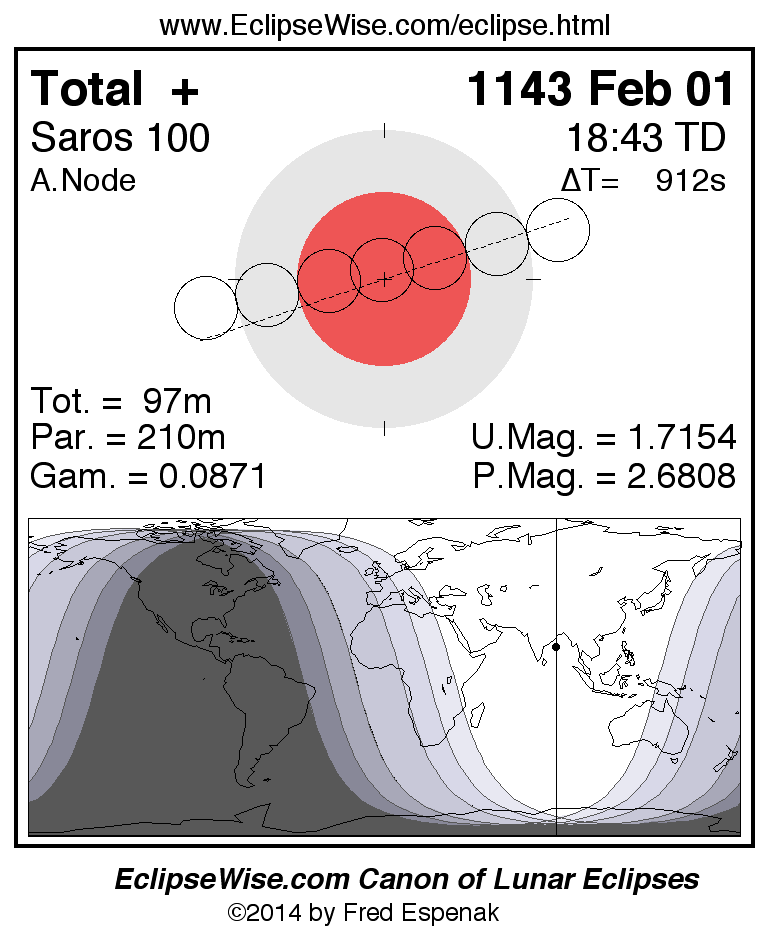 A panorama of all lunar eclipses belonging to Saros 100 is presented here. Each figure shows the Moon's path with respect to Earth's penumbral and umbral shadows. Below the path is a map depicting the geographic region of visibility for the eclipse. The date and time are given for the instant of Greatest Eclipse. Every figure serves as a hyperlink to the EclipseWise Prime page for that eclipse with a larger figure and complete details for the eclipse. Visit the Key to Lunar Eclipse Figures for a detailed explanation of these diagrams. Near the bottom of this page are a series of hyperlinks for more on lunar eclipses.