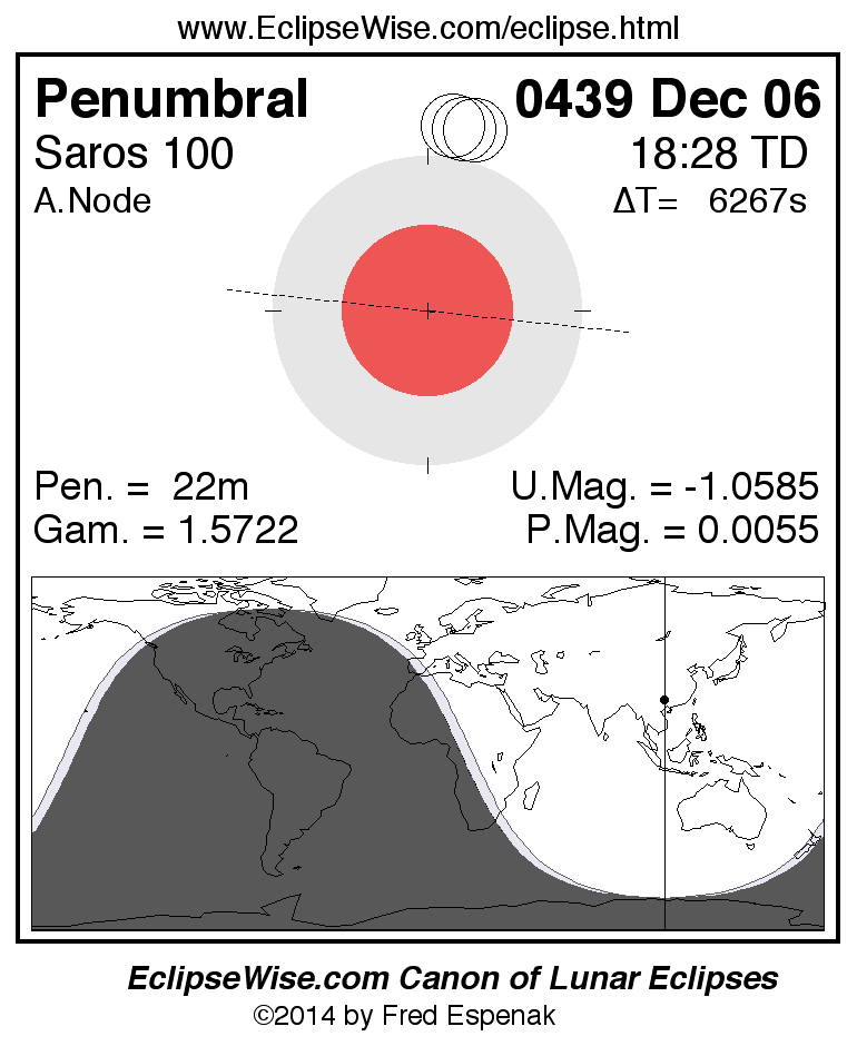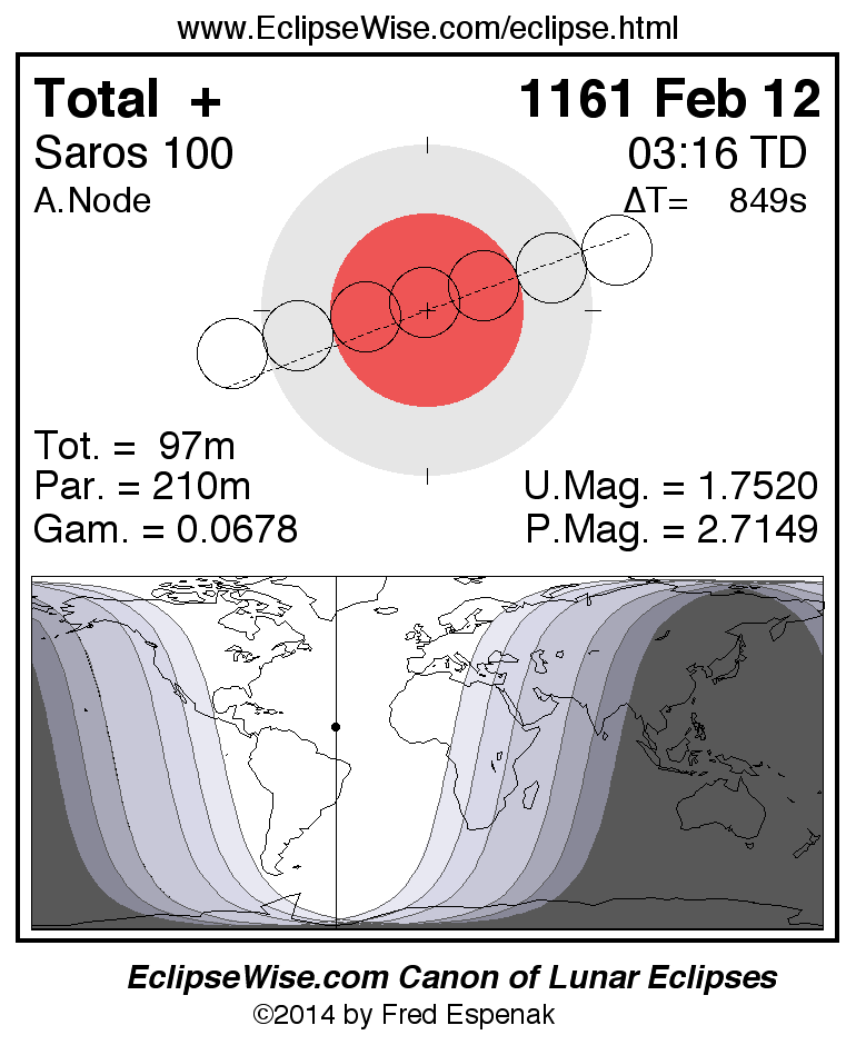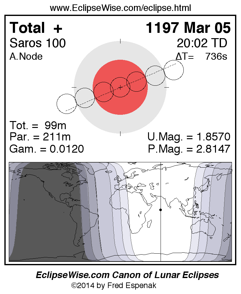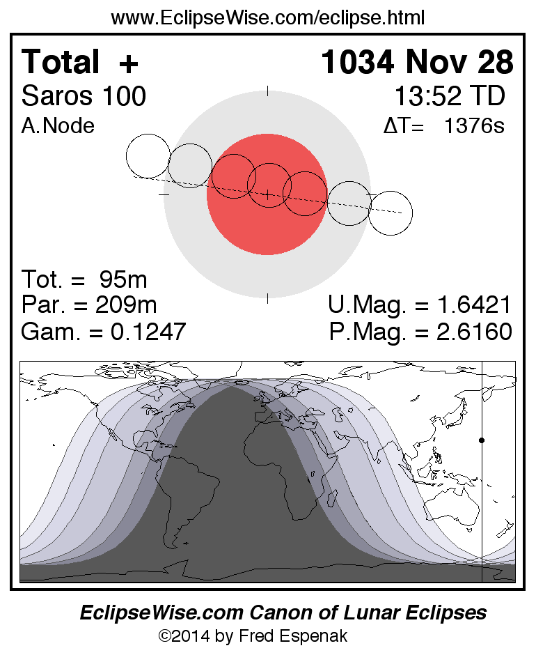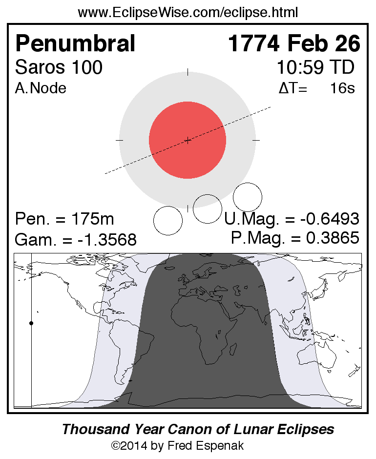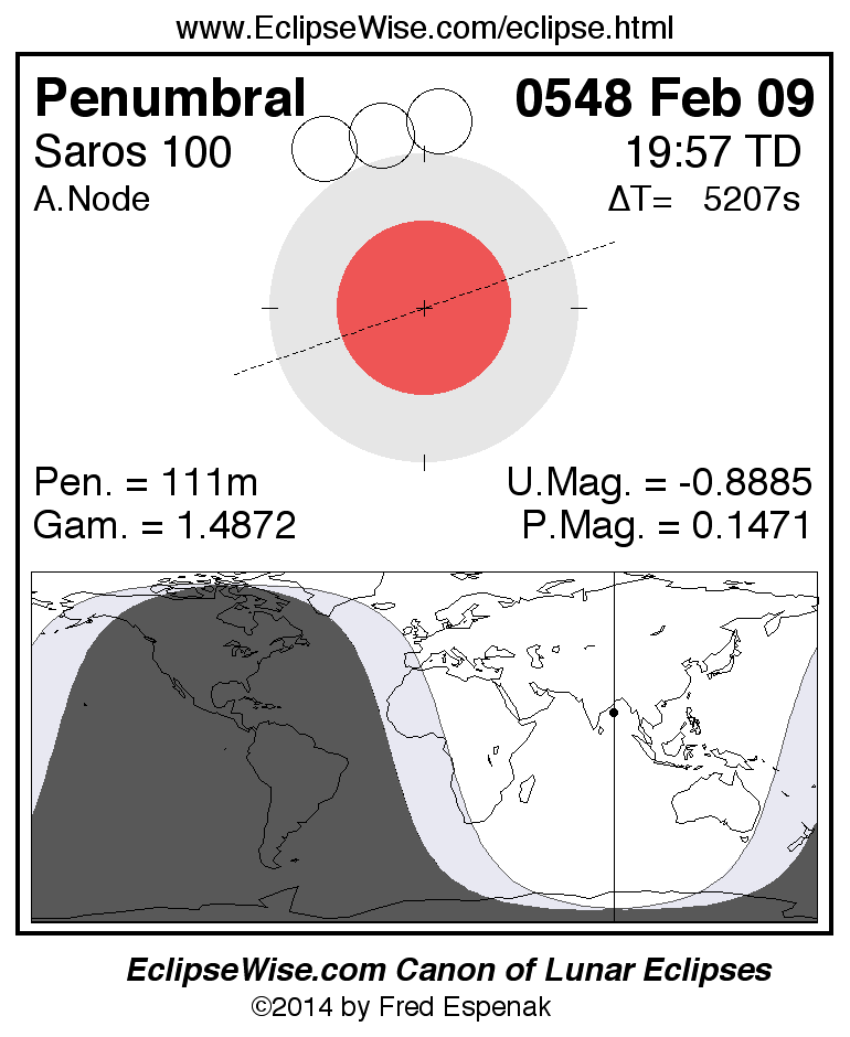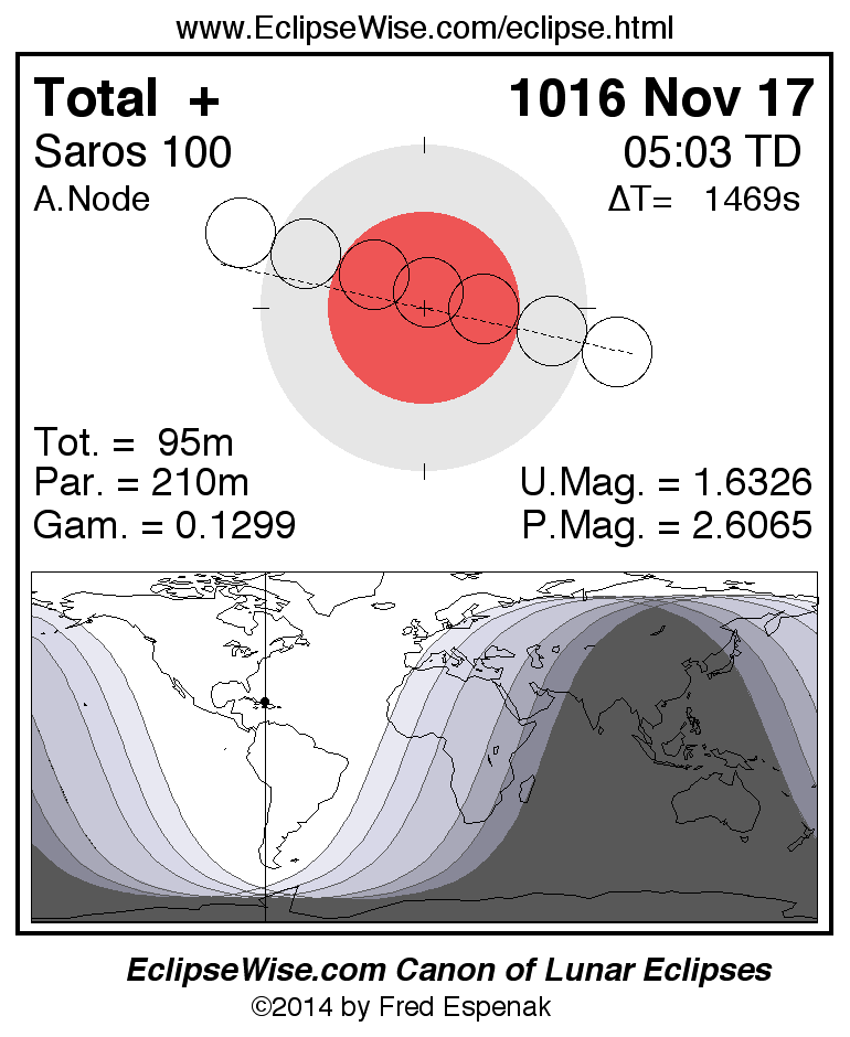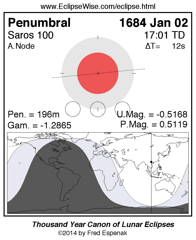 A panorama of all lunar eclipses belonging to Saros 100 is presented here. Each figure shows the Moon's path with respect to Earth's penumbral and umbral shadows. Below the path is a map depicting the geographic region of visibility for the eclipse. The date and time are given for the instant of Greatest Eclipse. Every figure serves as a hyperlink to the EclipseWise Prime page for that eclipse with a larger figure and complete details for the eclipse. Visit the Key to Lunar Eclipse Figures for a detailed explanation of these diagrams. Near the bottom of this page are a series of hyperlinks for more on lunar eclipses.