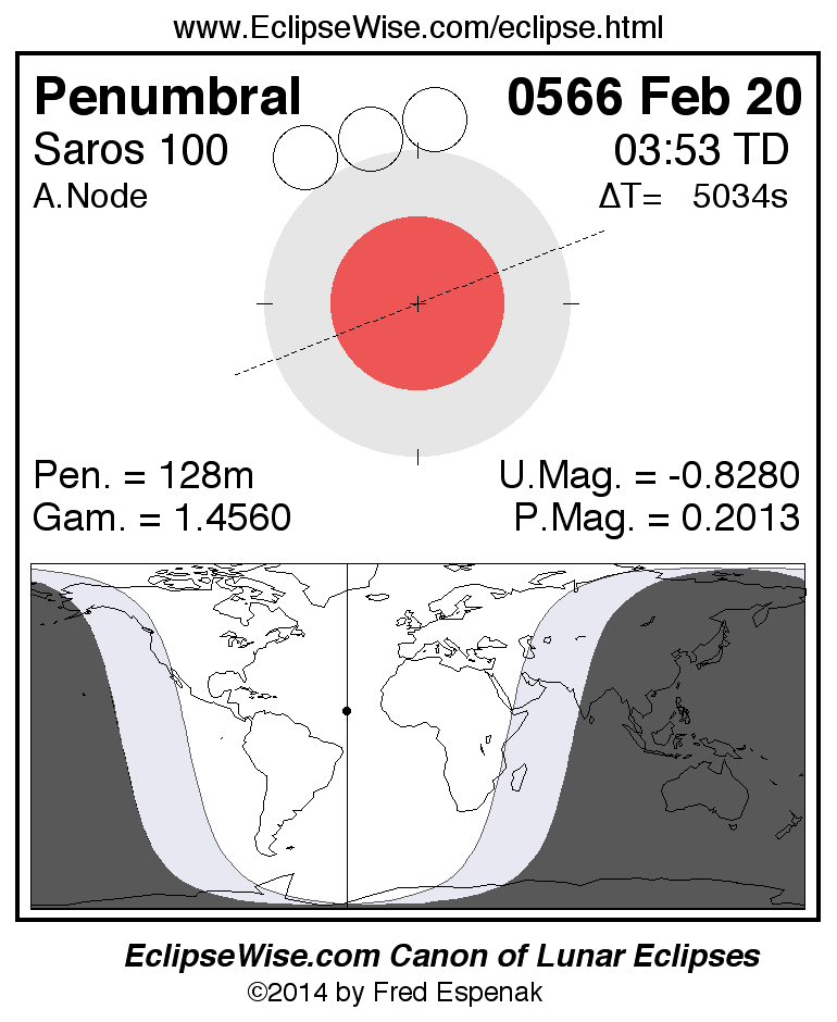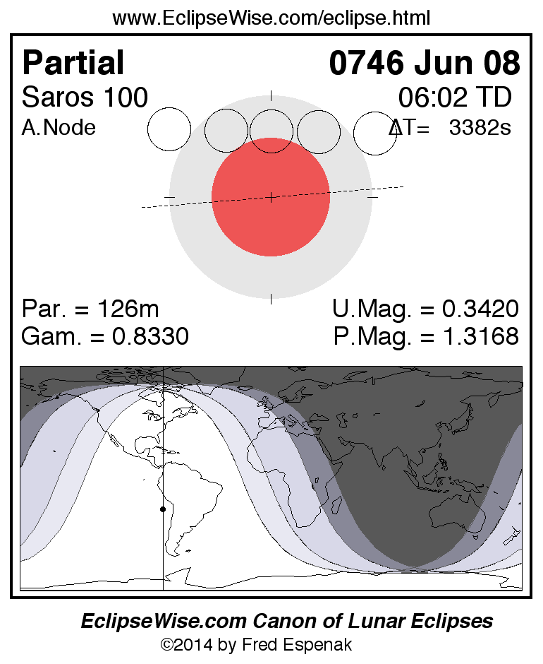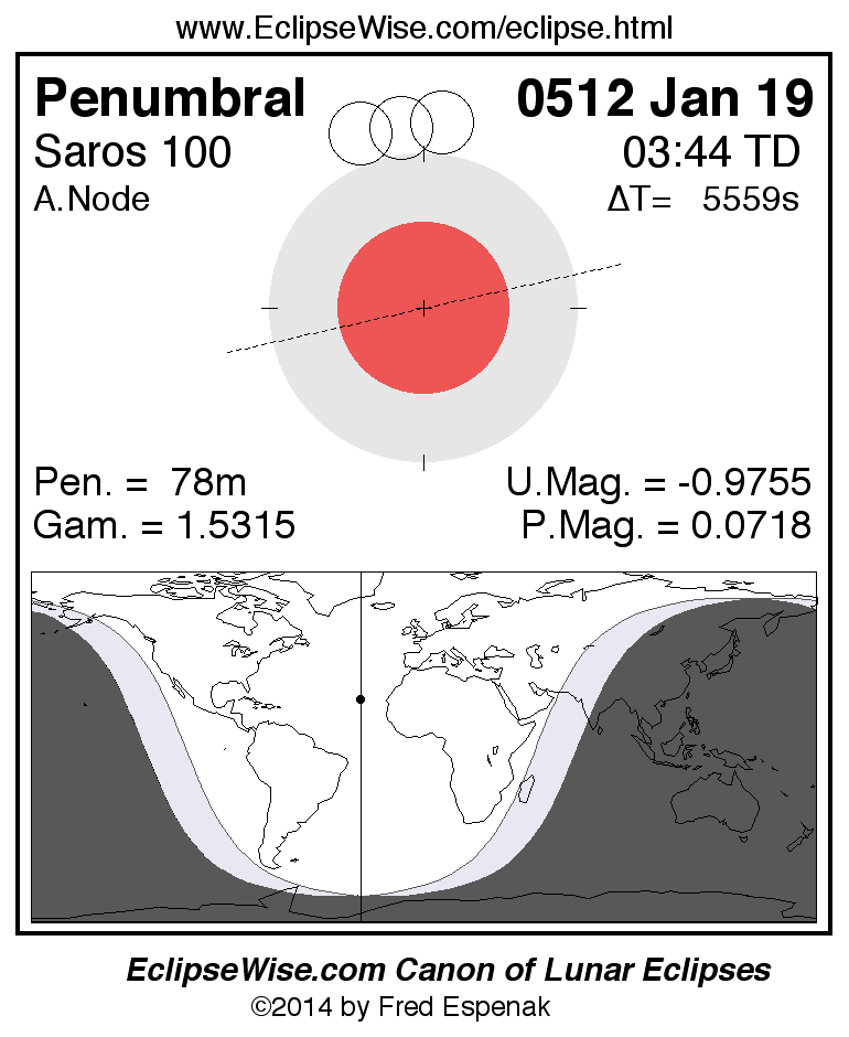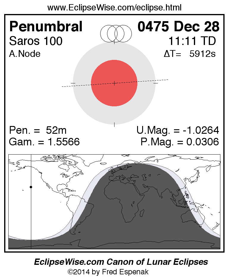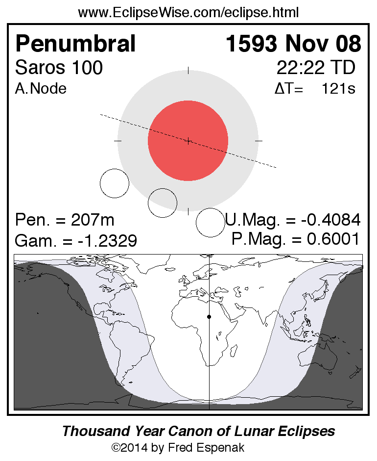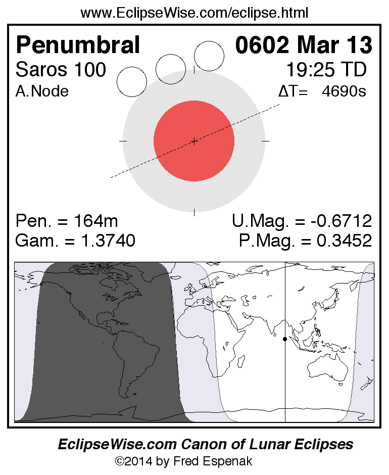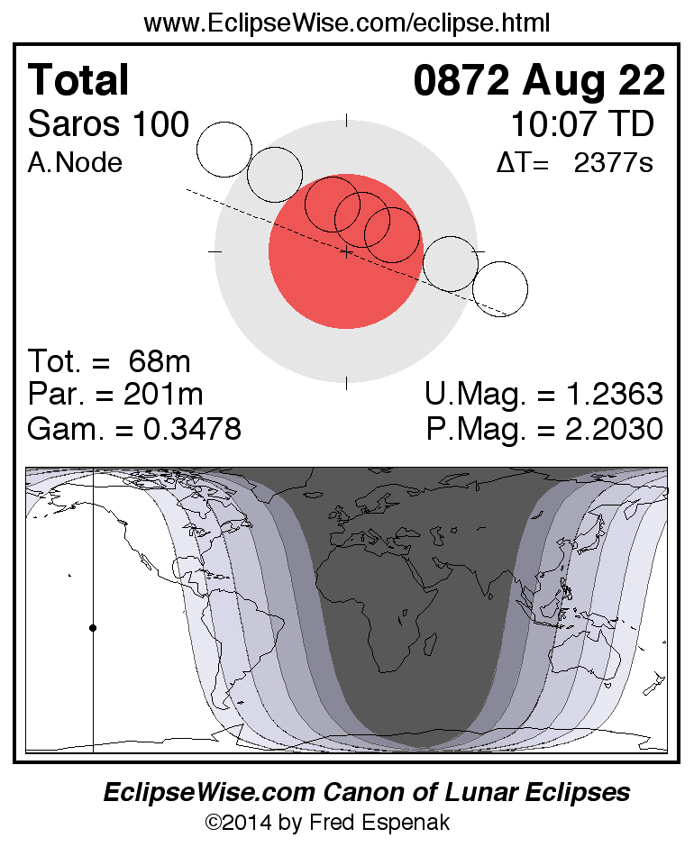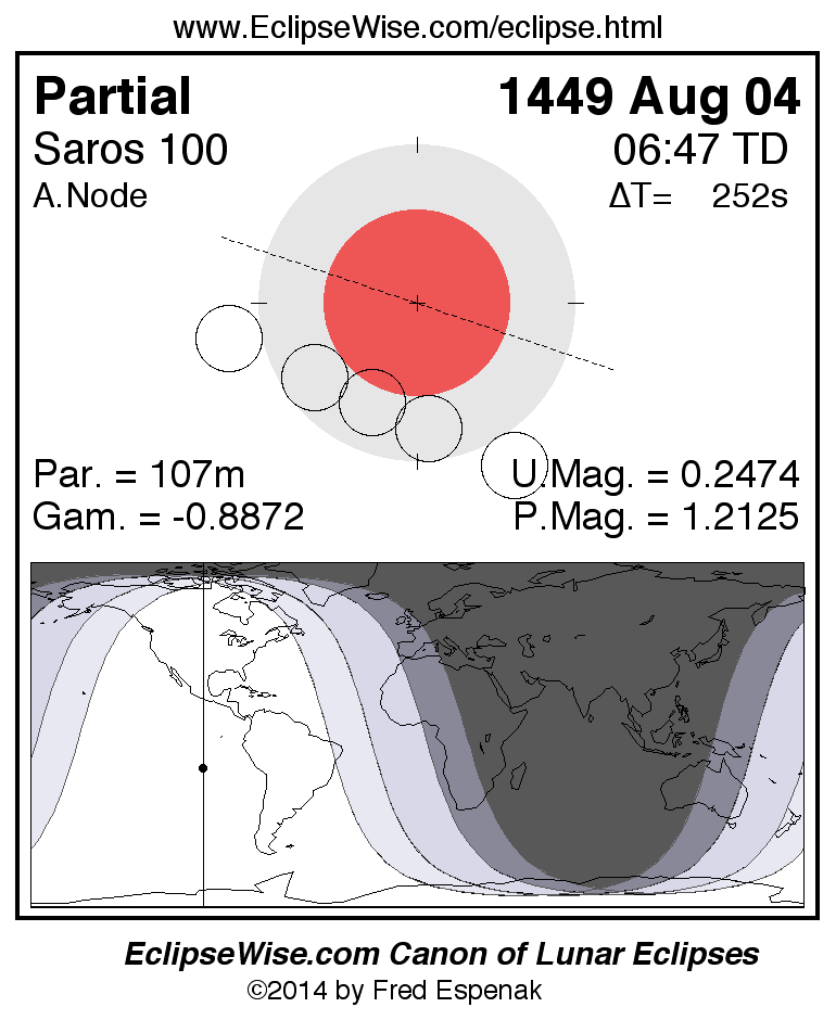 A panorama of all lunar eclipses belonging to Saros 100 is presented here. Each figure shows the Moon's path with respect to Earth's penumbral and umbral shadows. Below the path is a map depicting the geographic region of visibility for the eclipse. The date and time are given for the instant of Greatest Eclipse. Every figure serves as a hyperlink to the EclipseWise Prime page for that eclipse with a larger figure and complete details for the eclipse. Visit the Key to Lunar Eclipse Figures for a detailed explanation of these diagrams. Near the bottom of this page are a series of hyperlinks for more on lunar eclipses.