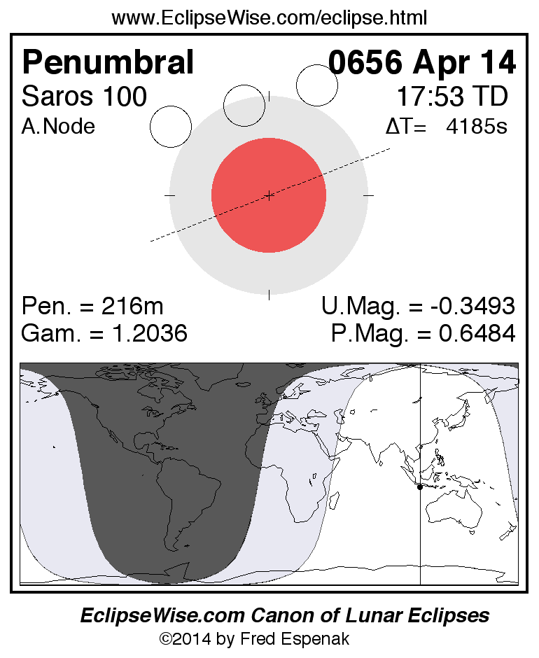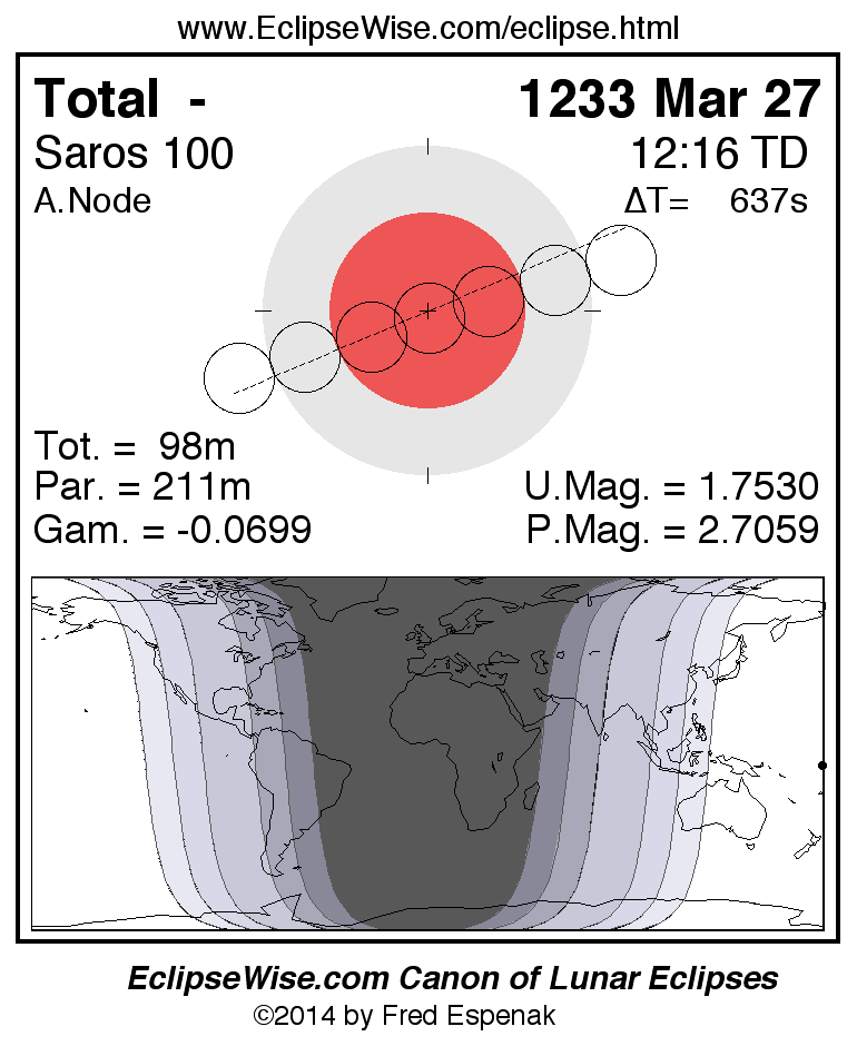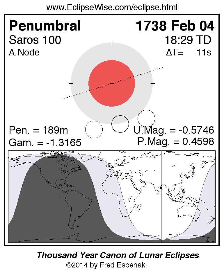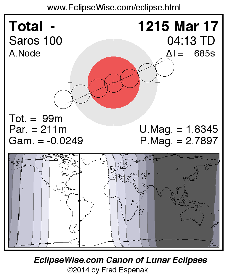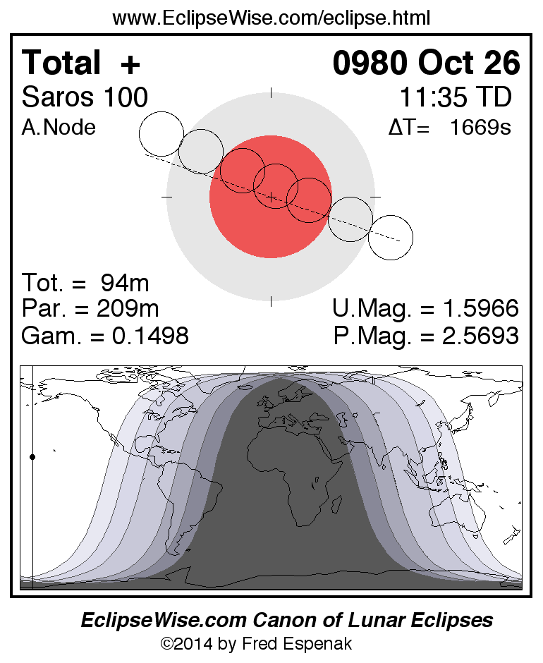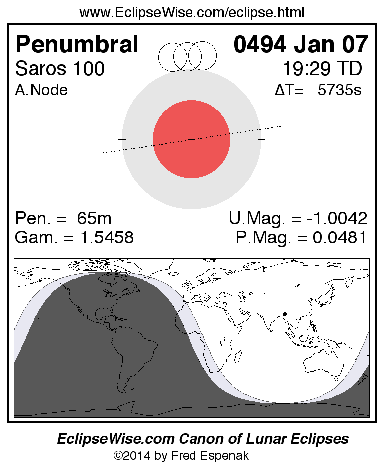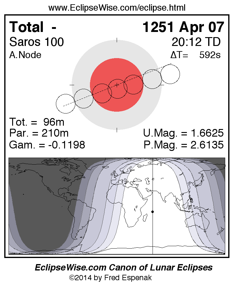 A panorama of all lunar eclipses belonging to Saros 100 is presented here. Each figure shows the Moon's path with respect to Earth's penumbral and umbral shadows. Below the path is a map depicting the geographic region of visibility for the eclipse. The date and time are given for the instant of Greatest Eclipse. Every figure serves as a hyperlink to the EclipseWise Prime page for that eclipse with a larger figure and complete details for the eclipse. Visit the Key to Lunar Eclipse Figures for a detailed explanation of these diagrams. Near the bottom of this page are a series of hyperlinks for more on lunar eclipses.