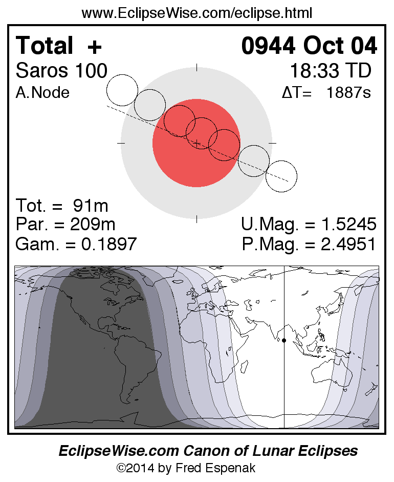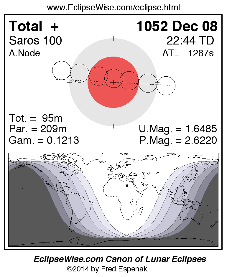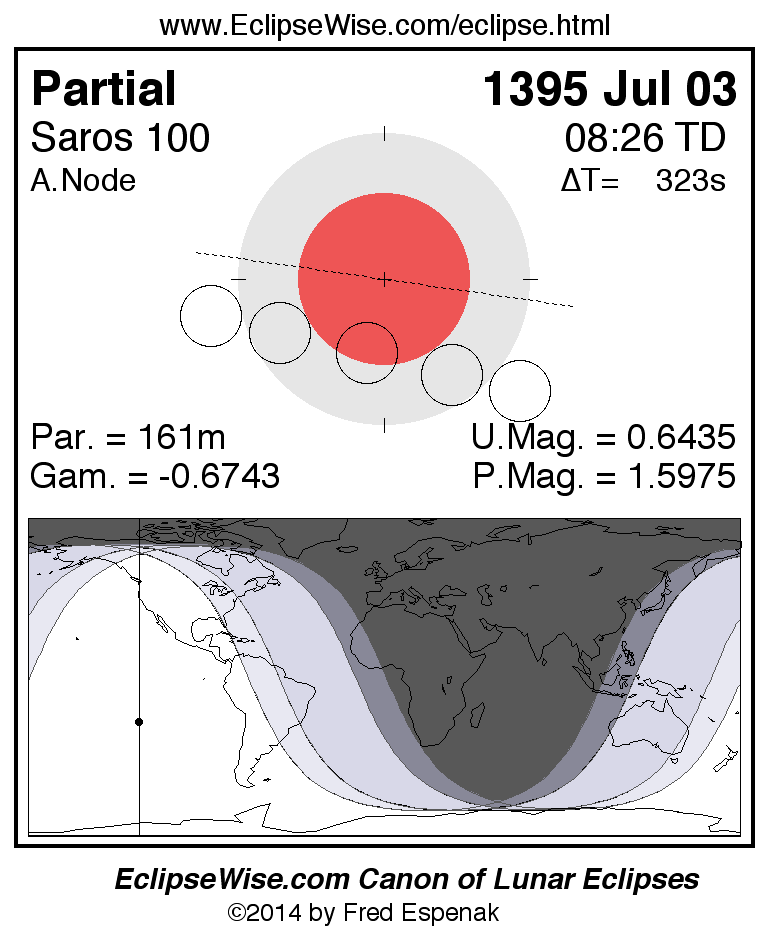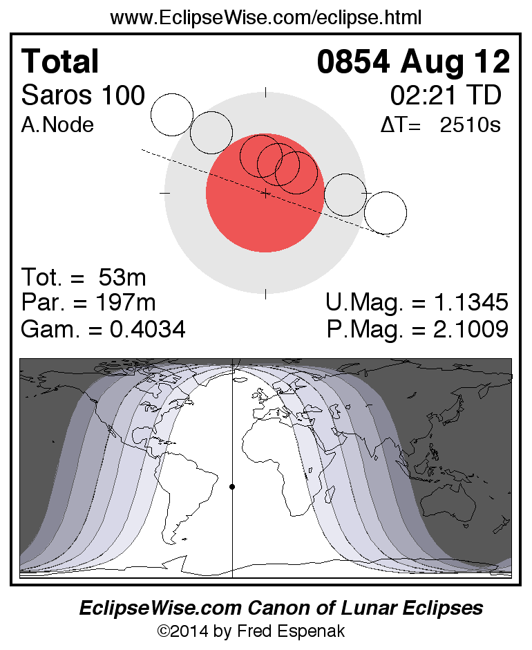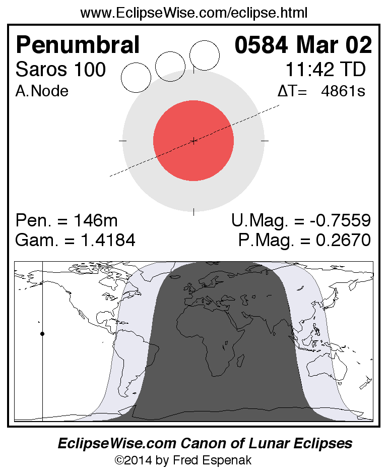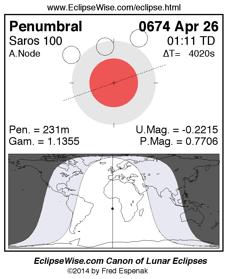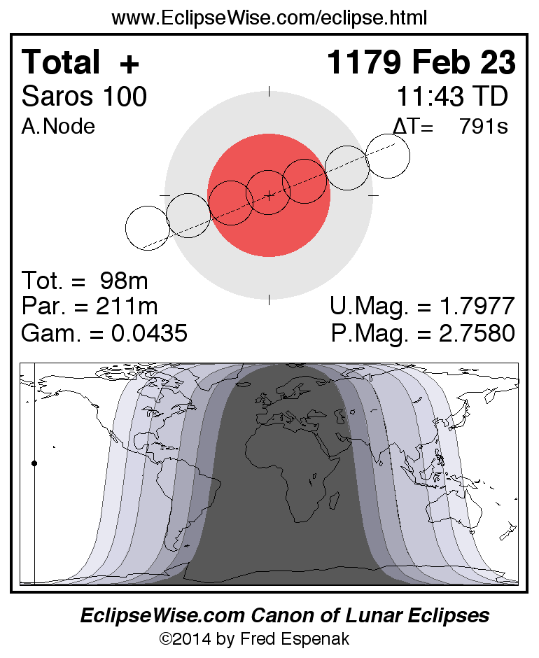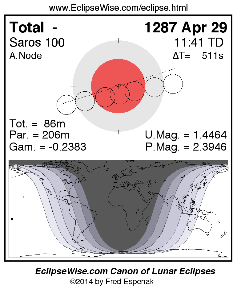 A panorama of all lunar eclipses belonging to Saros 100 is presented here. Each figure shows the Moon's path with respect to Earth's penumbral and umbral shadows. Below the path is a map depicting the geographic region of visibility for the eclipse. The date and time are given for the instant of Greatest Eclipse. Every figure serves as a hyperlink to the EclipseWise Prime page for that eclipse with a larger figure and complete details for the eclipse. Visit the Key to Lunar Eclipse Figures for a detailed explanation of these diagrams. Near the bottom of this page are a series of hyperlinks for more on lunar eclipses.