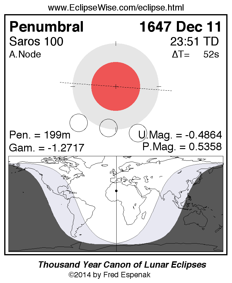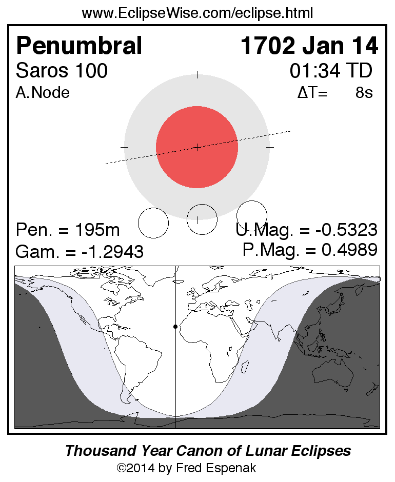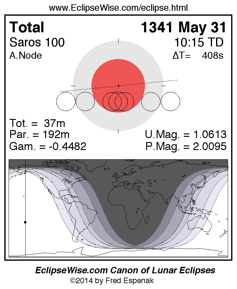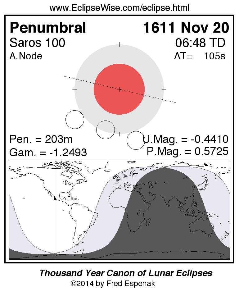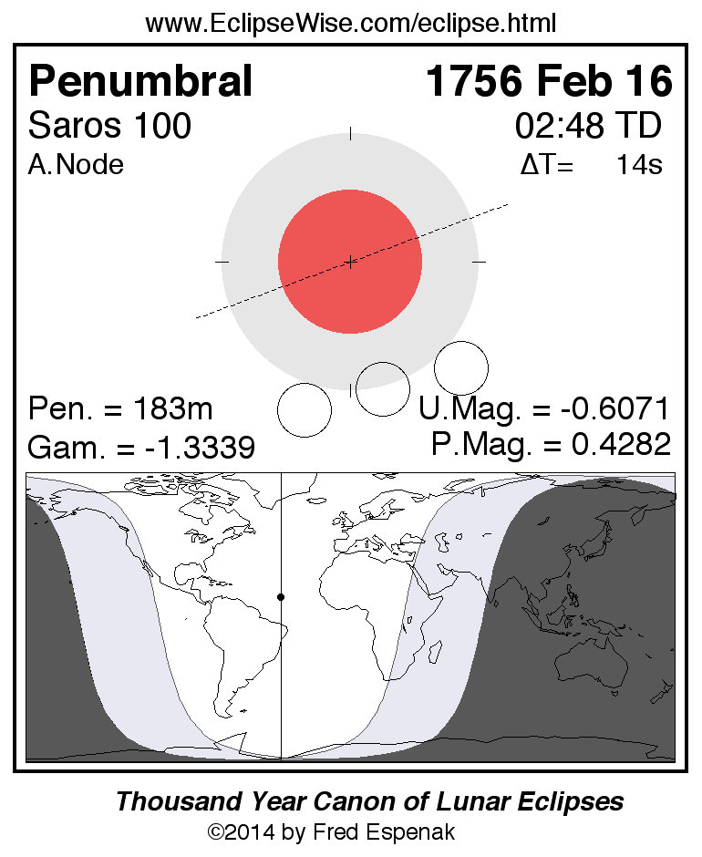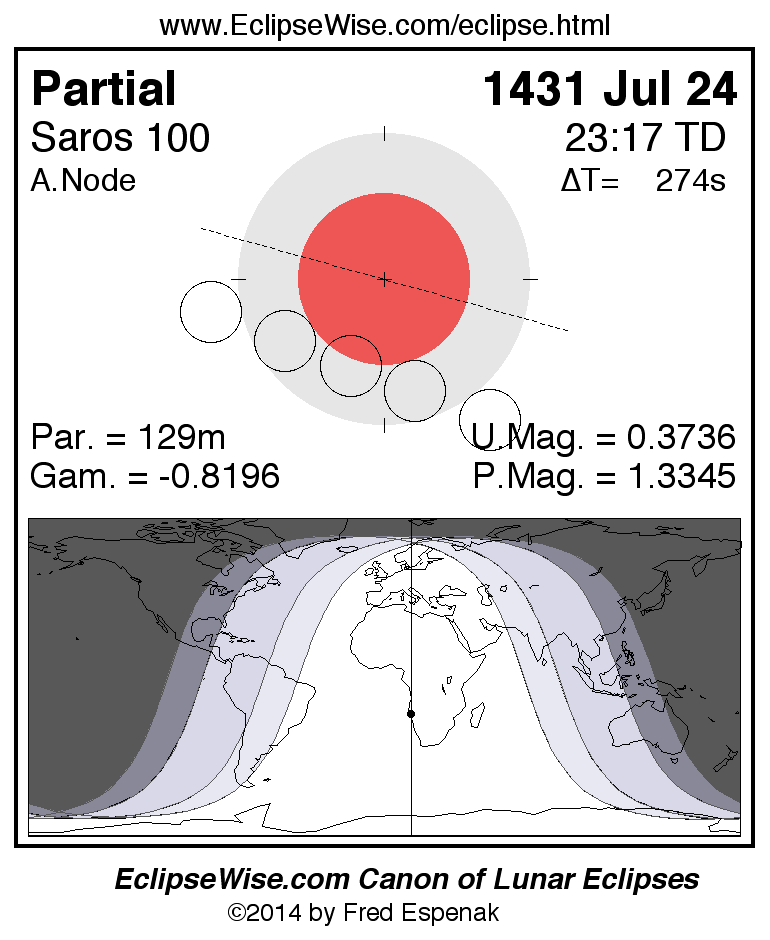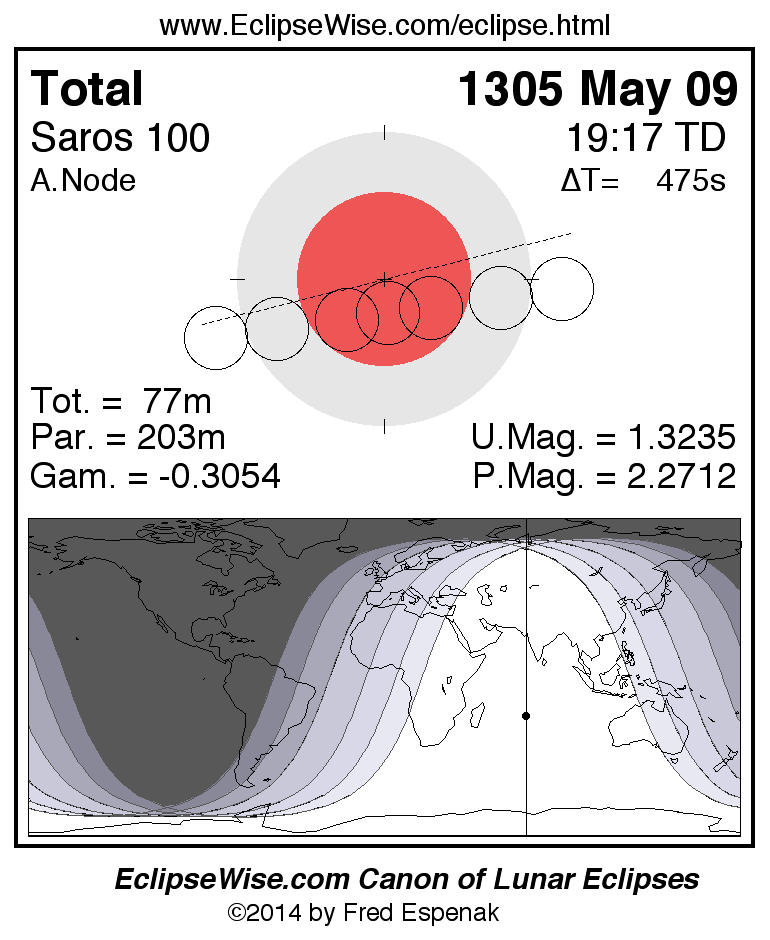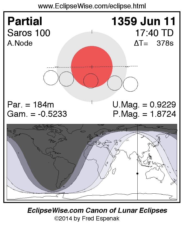 A panorama of all lunar eclipses belonging to Saros 100 is presented here. Each figure shows the Moon's path with respect to Earth's penumbral and umbral shadows. Below the path is a map depicting the geographic region of visibility for the eclipse. The date and time are given for the instant of Greatest Eclipse. Every figure serves as a hyperlink to the EclipseWise Prime page for that eclipse with a larger figure and complete details for the eclipse. Visit the Key to Lunar Eclipse Figures for a detailed explanation of these diagrams. Near the bottom of this page are a series of hyperlinks for more on lunar eclipses.