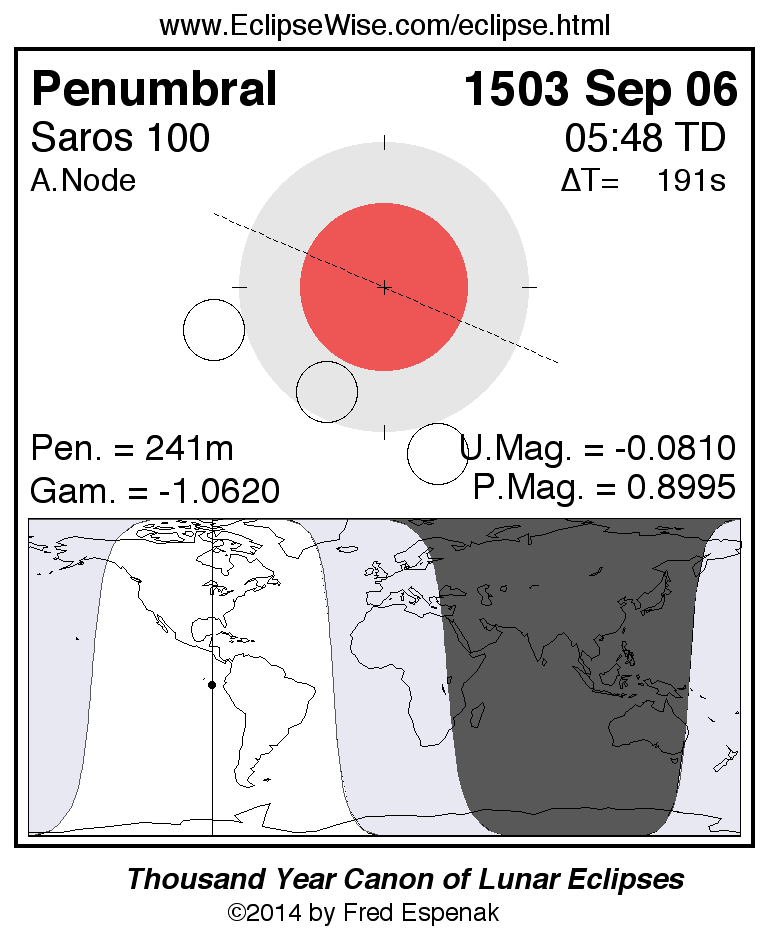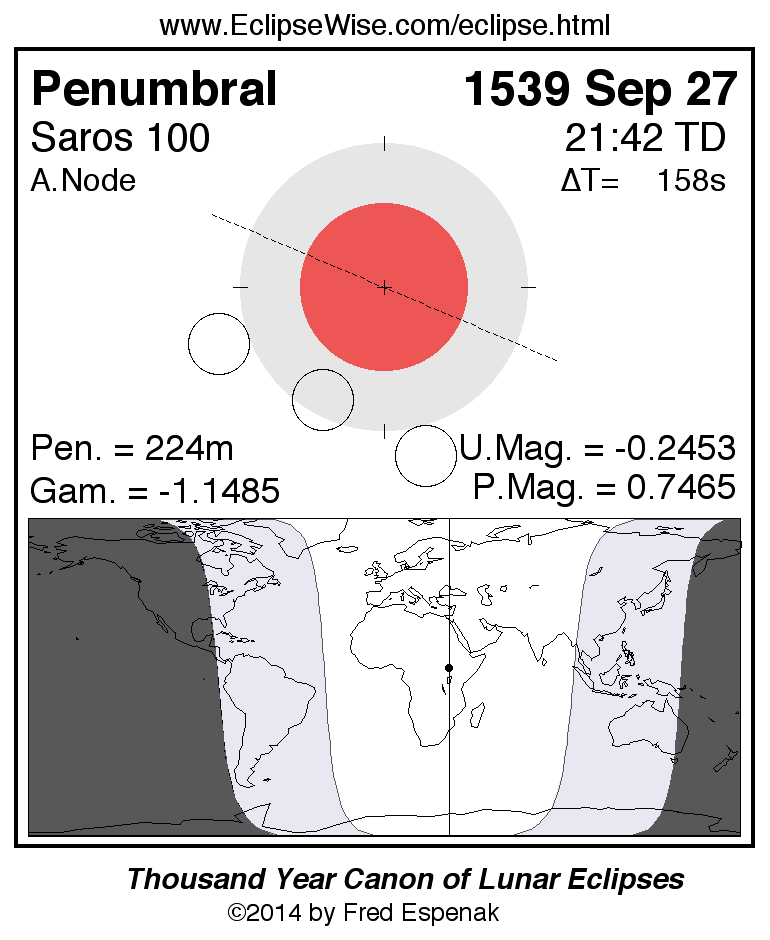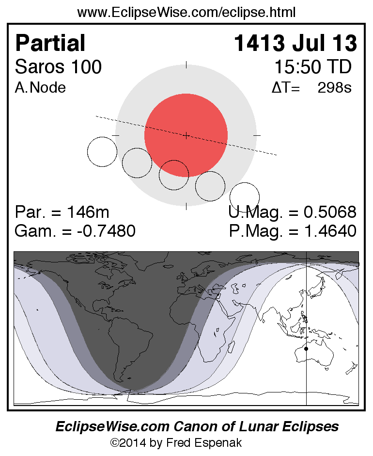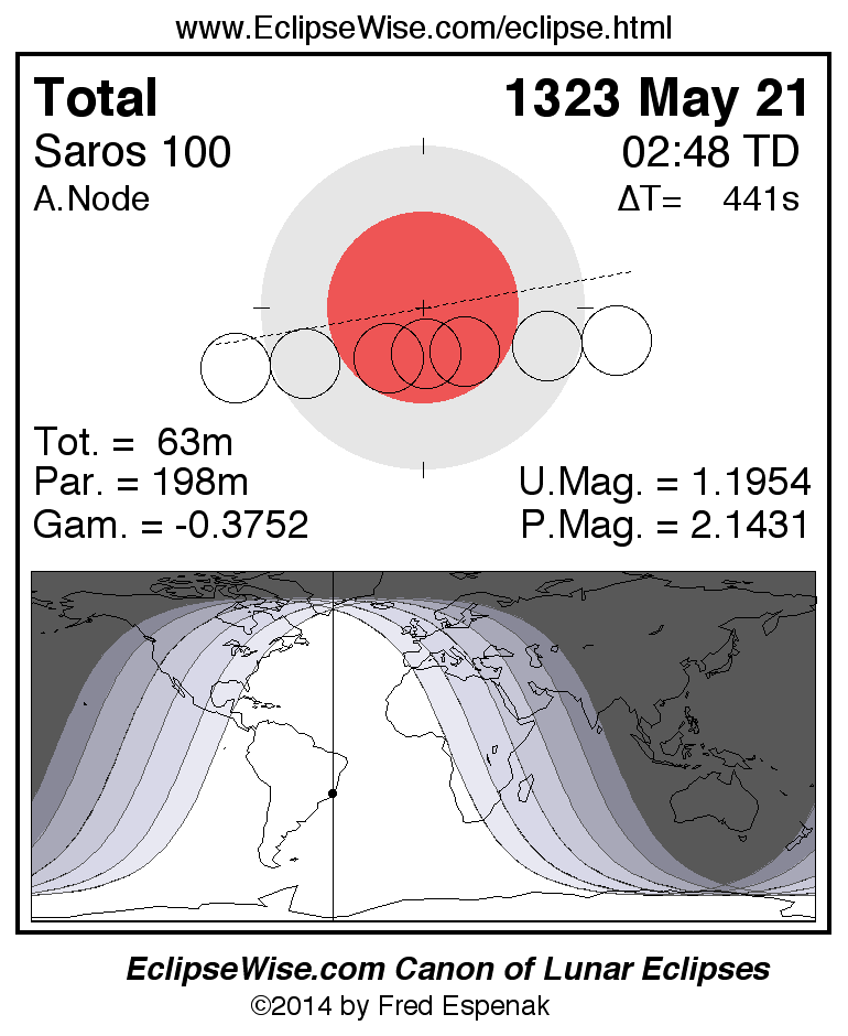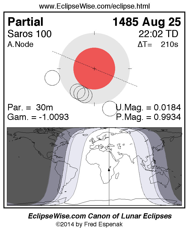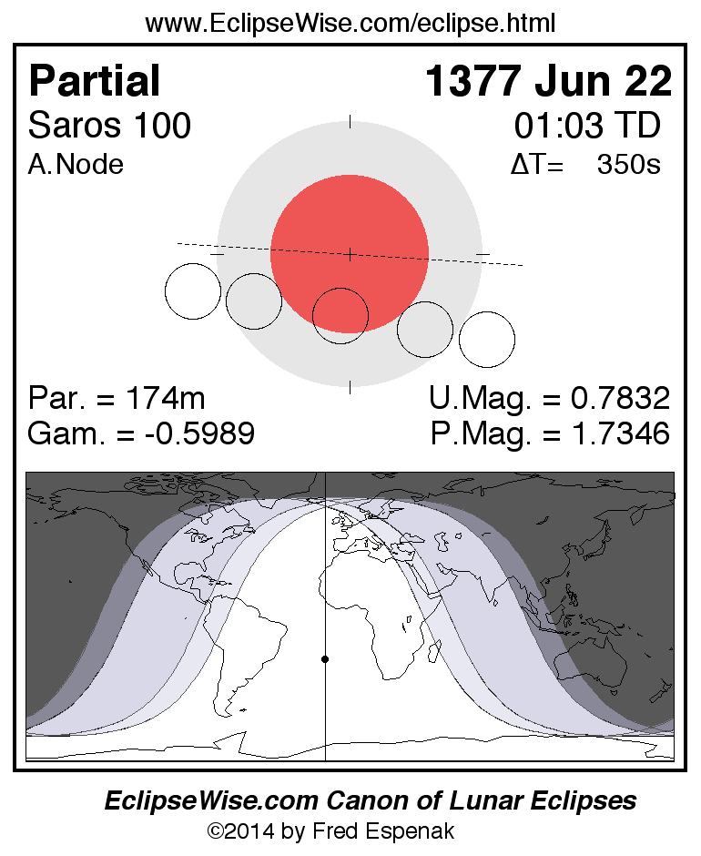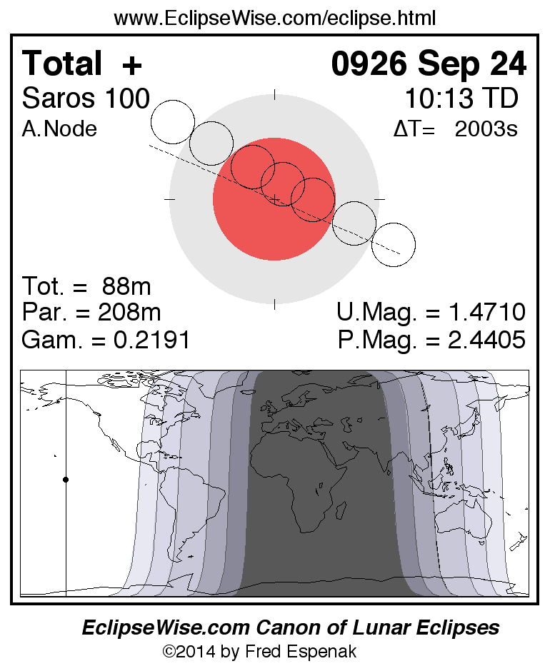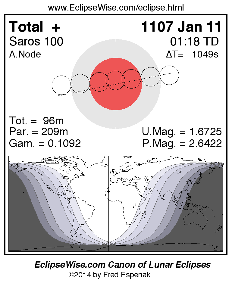 A panorama of all lunar eclipses belonging to Saros 100 is presented here. Each figure shows the Moon's path with respect to Earth's penumbral and umbral shadows. Below the path is a map depicting the geographic region of visibility for the eclipse. The date and time are given for the instant of Greatest Eclipse. Every figure serves as a hyperlink to the EclipseWise Prime page for that eclipse with a larger figure and complete details for the eclipse. Visit the Key to Lunar Eclipse Figures for a detailed explanation of these diagrams. Near the bottom of this page are a series of hyperlinks for more on lunar eclipses.