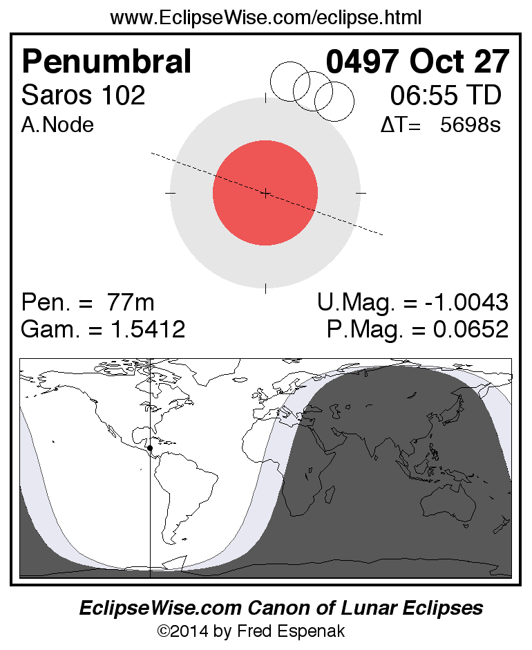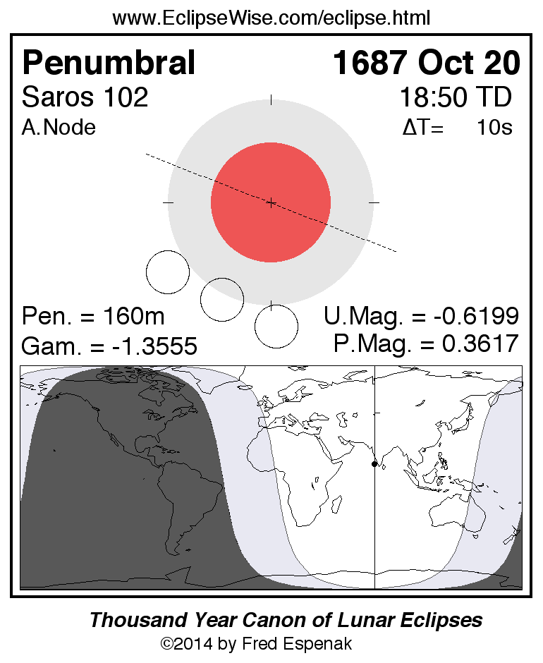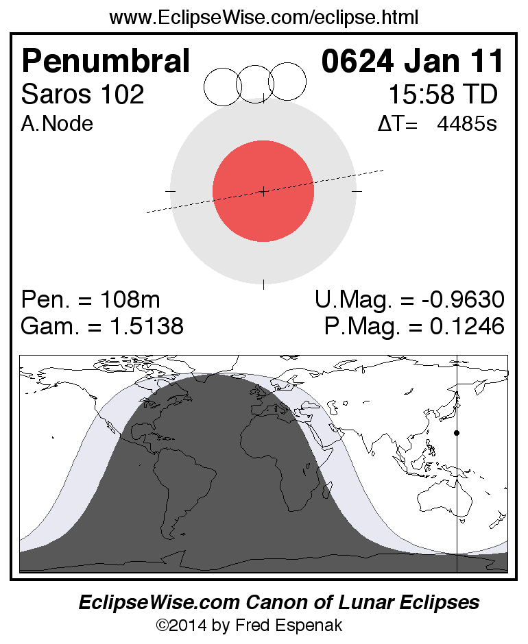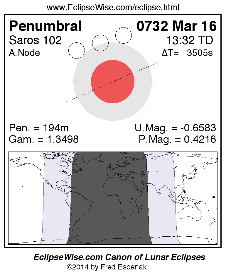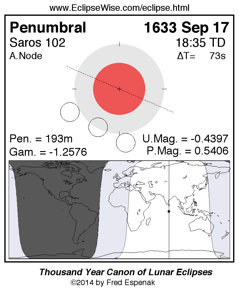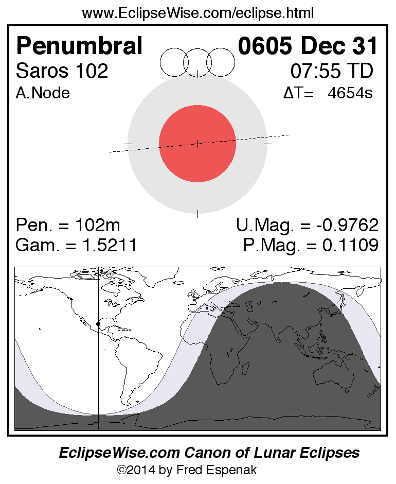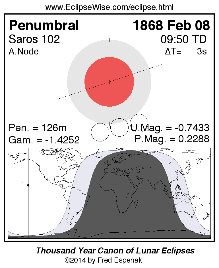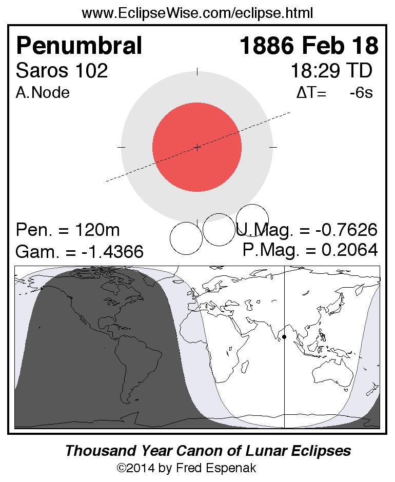 A panorama of all lunar eclipses belonging to Saros 102 is presented here. Each figure shows the Moon's path with respect to Earth's penumbral and umbral shadows. Below the path is a map depicting the geographic region of visibility for the eclipse. The date and time are given for the instant of Greatest Eclipse. Every figure serves as a hyperlink to the EclipseWise Prime page for that eclipse with a larger figure and complete details for the eclipse. Visit the Key to Lunar Eclipse Figures for a detailed explanation of these diagrams. Near the bottom of this page are a series of hyperlinks for more on lunar eclipses.