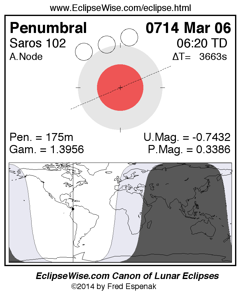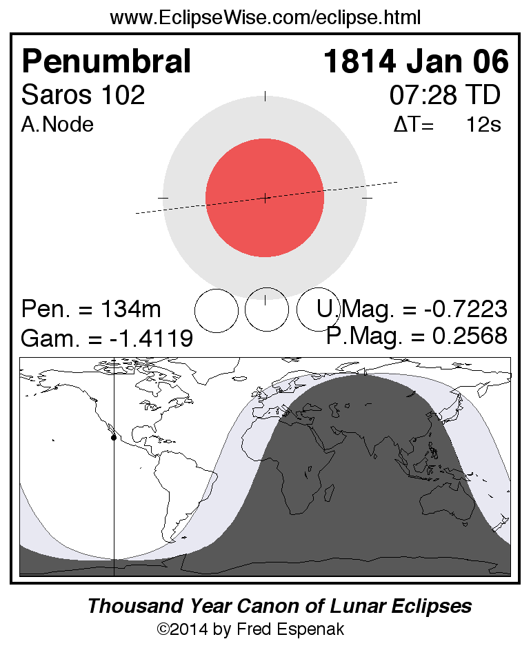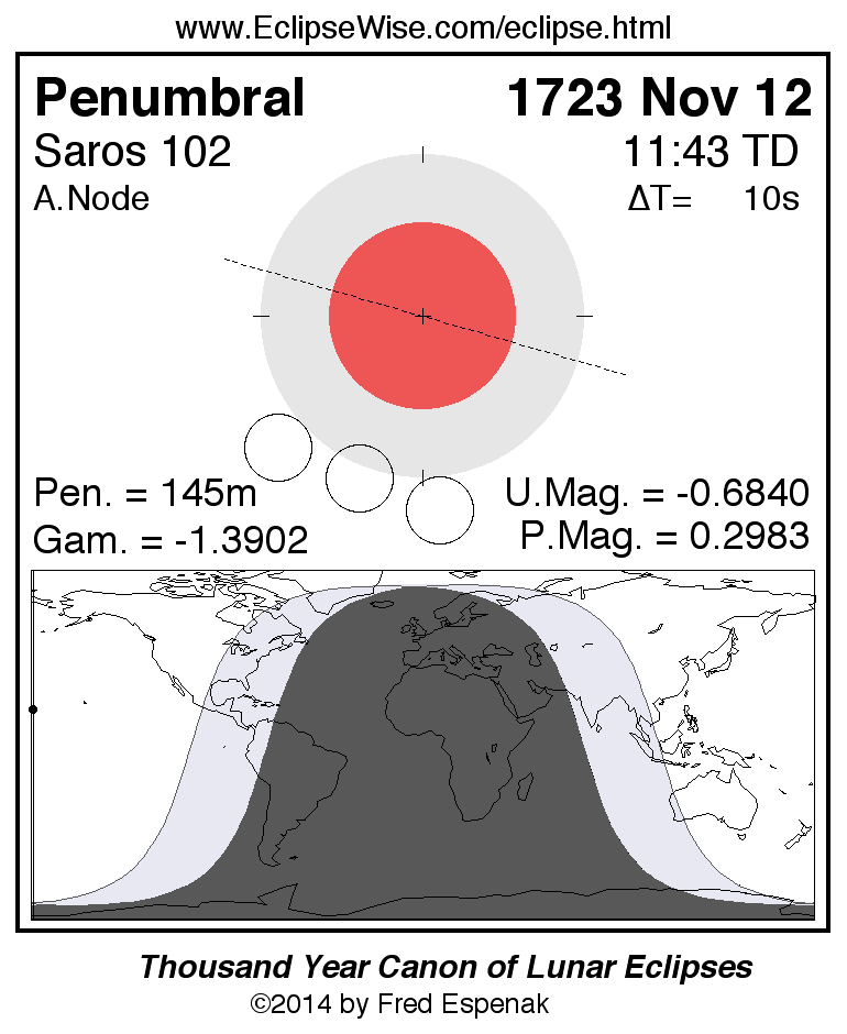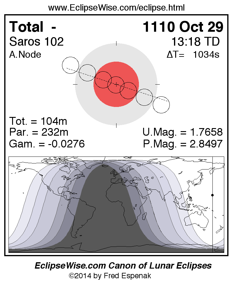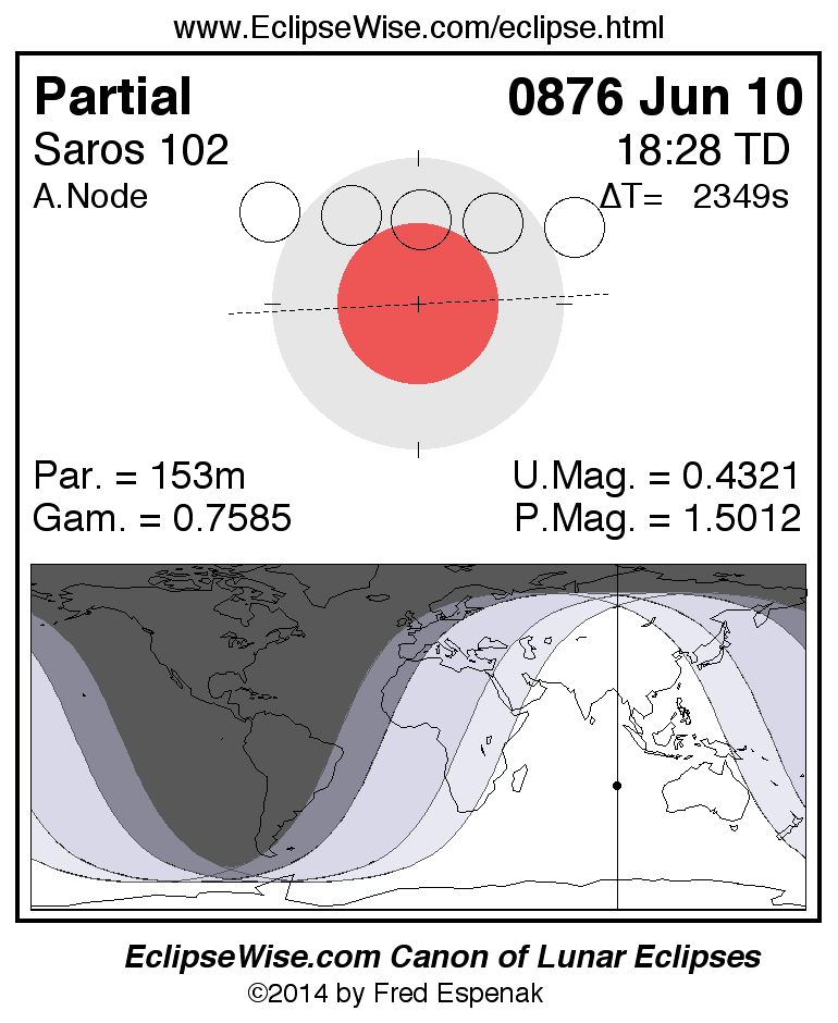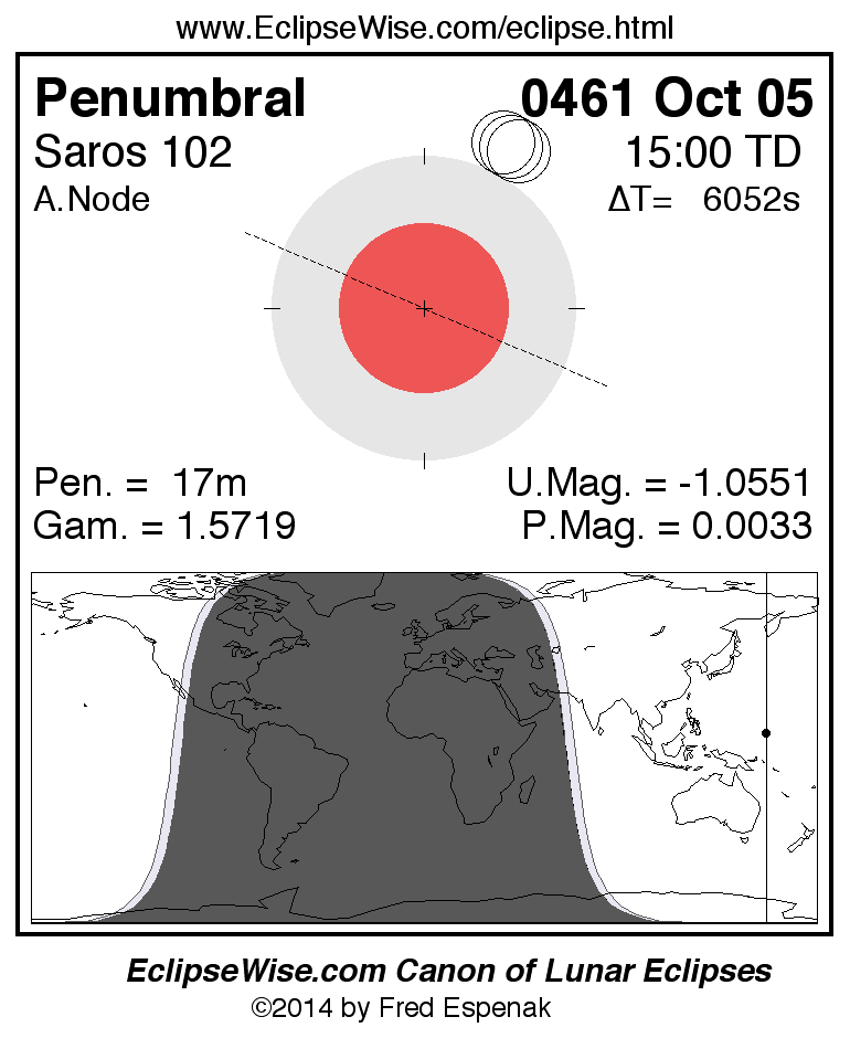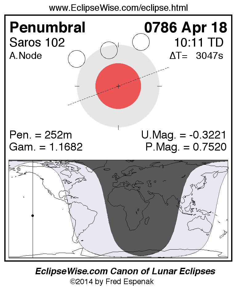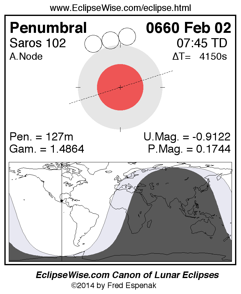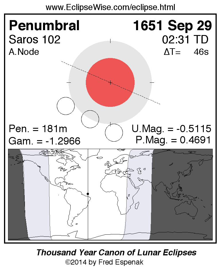 A panorama of all lunar eclipses belonging to Saros 102 is presented here. Each figure shows the Moon's path with respect to Earth's penumbral and umbral shadows. Below the path is a map depicting the geographic region of visibility for the eclipse. The date and time are given for the instant of Greatest Eclipse. Every figure serves as a hyperlink to the EclipseWise Prime page for that eclipse with a larger figure and complete details for the eclipse. Visit the Key to Lunar Eclipse Figures for a detailed explanation of these diagrams. Near the bottom of this page are a series of hyperlinks for more on lunar eclipses.