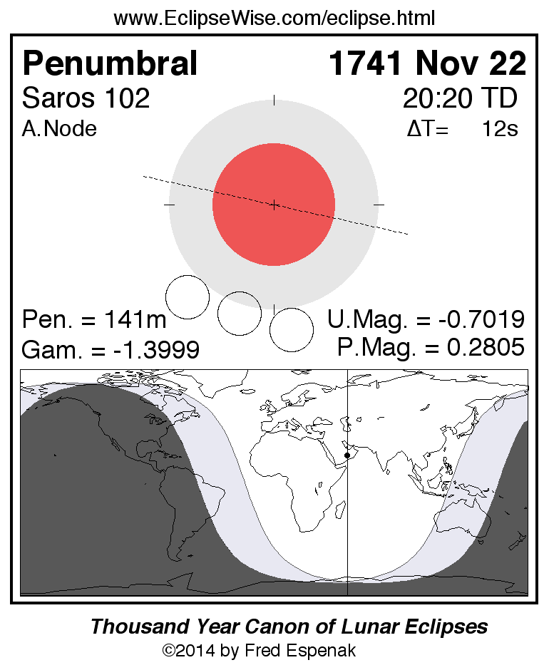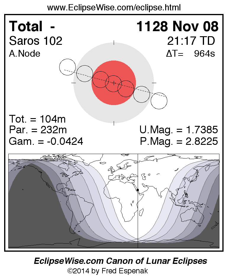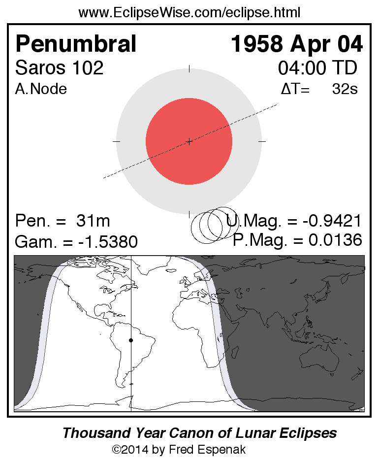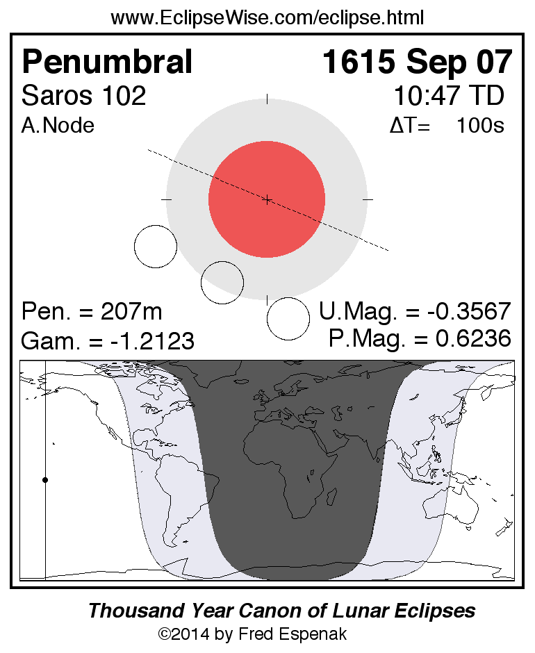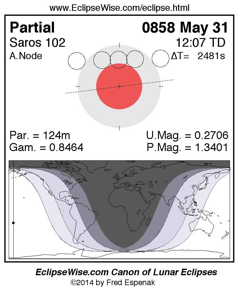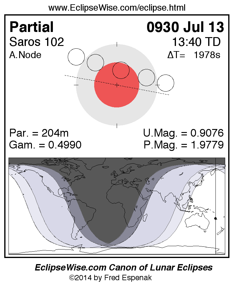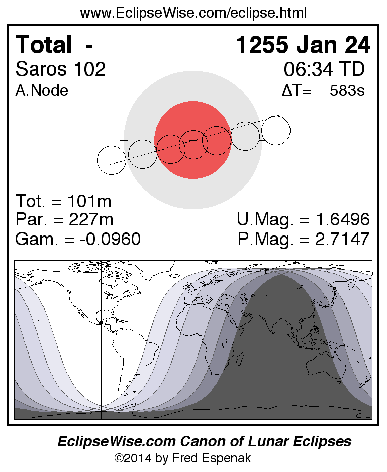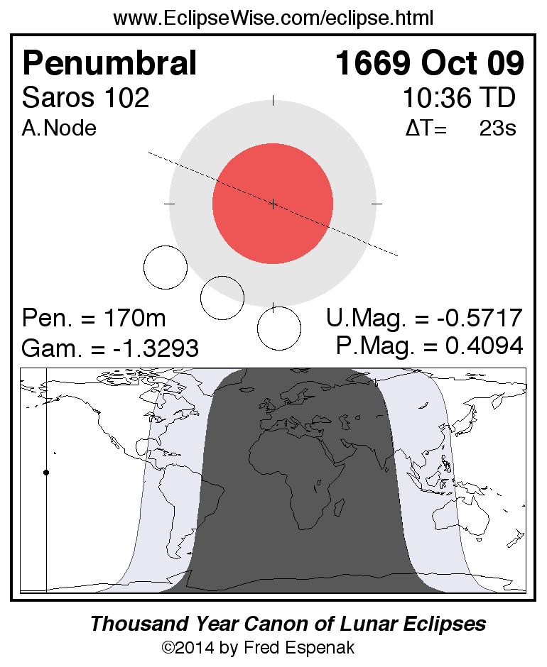 A panorama of all lunar eclipses belonging to Saros 102 is presented here. Each figure shows the Moon's path with respect to Earth's penumbral and umbral shadows. Below the path is a map depicting the geographic region of visibility for the eclipse. The date and time are given for the instant of Greatest Eclipse. Every figure serves as a hyperlink to the EclipseWise Prime page for that eclipse with a larger figure and complete details for the eclipse. Visit the Key to Lunar Eclipse Figures for a detailed explanation of these diagrams. Near the bottom of this page are a series of hyperlinks for more on lunar eclipses.