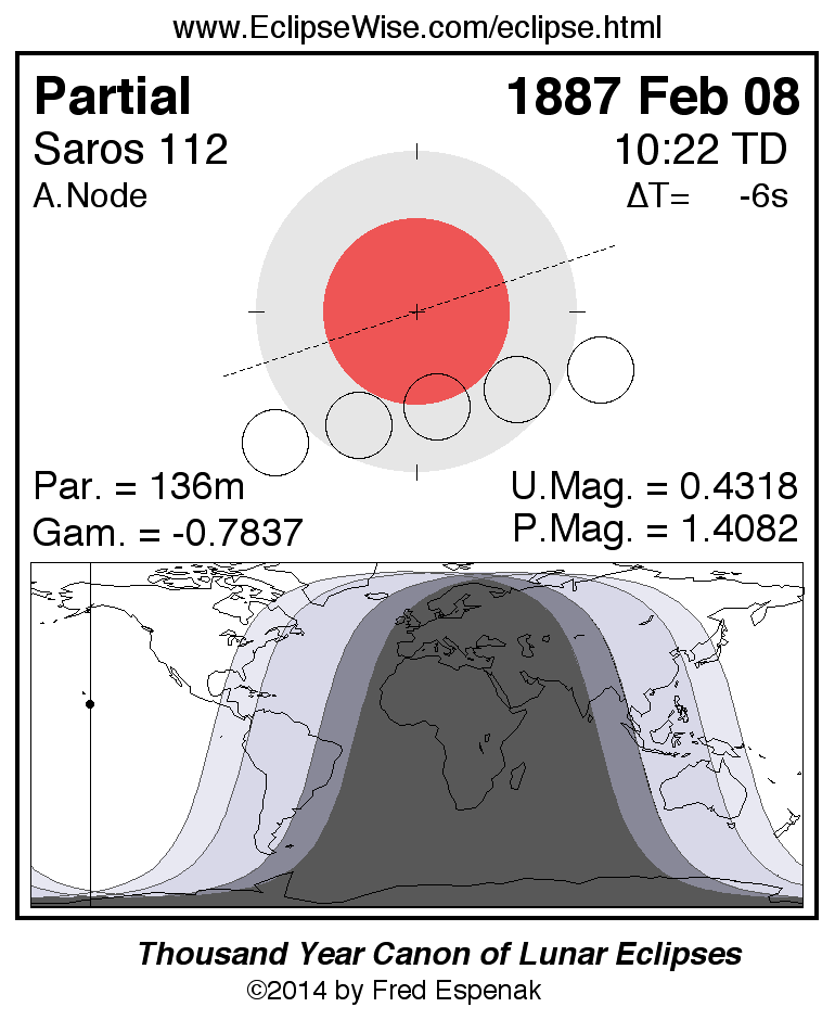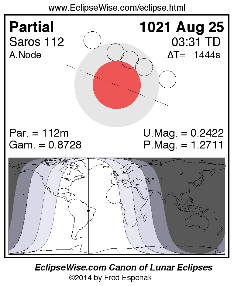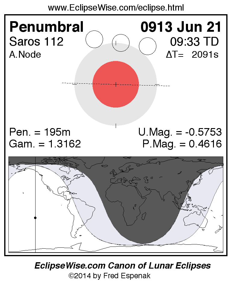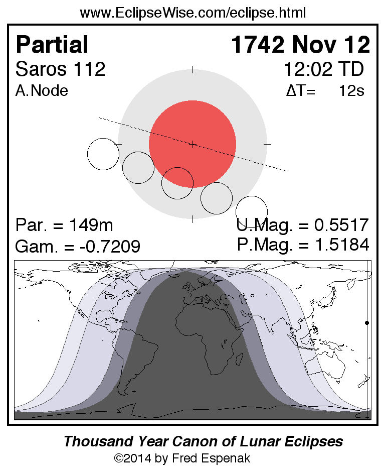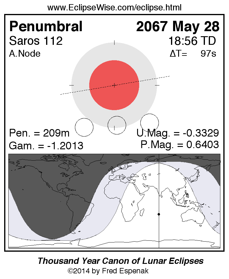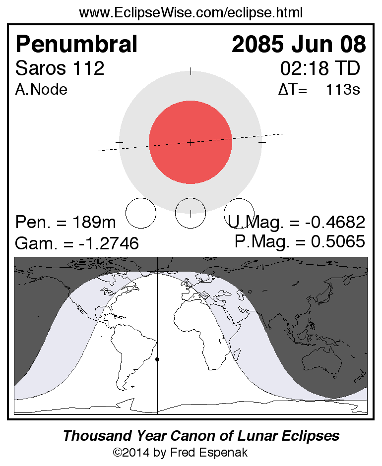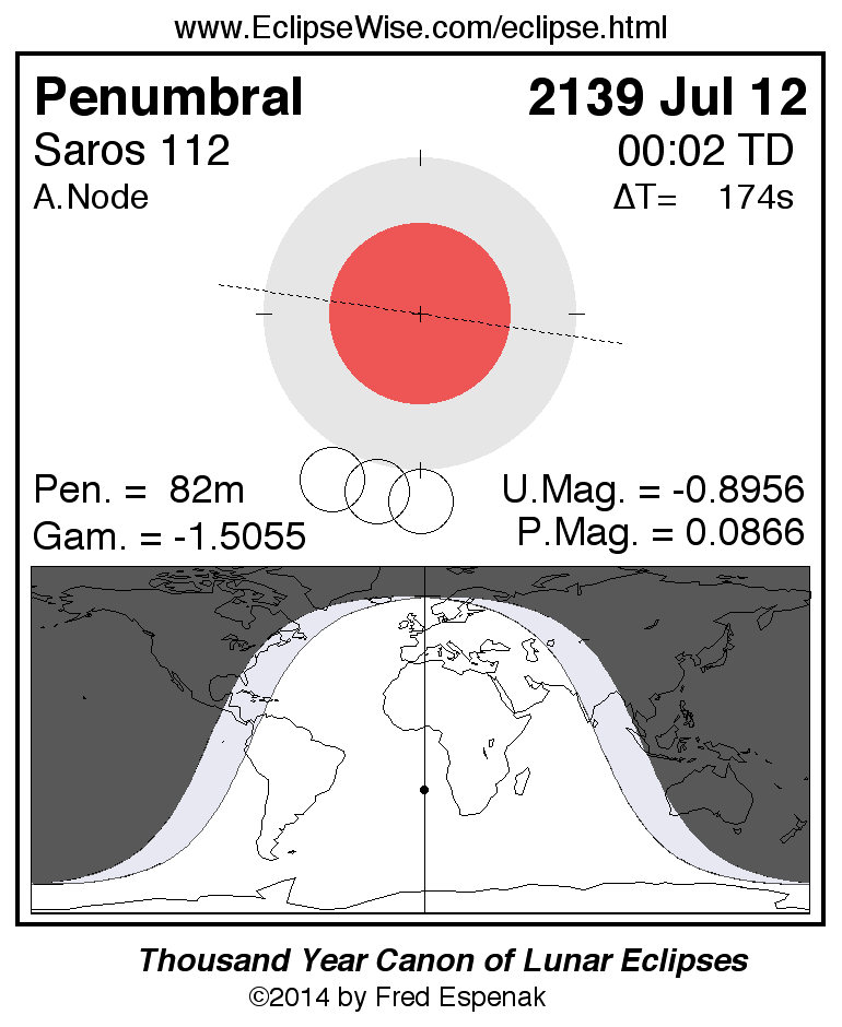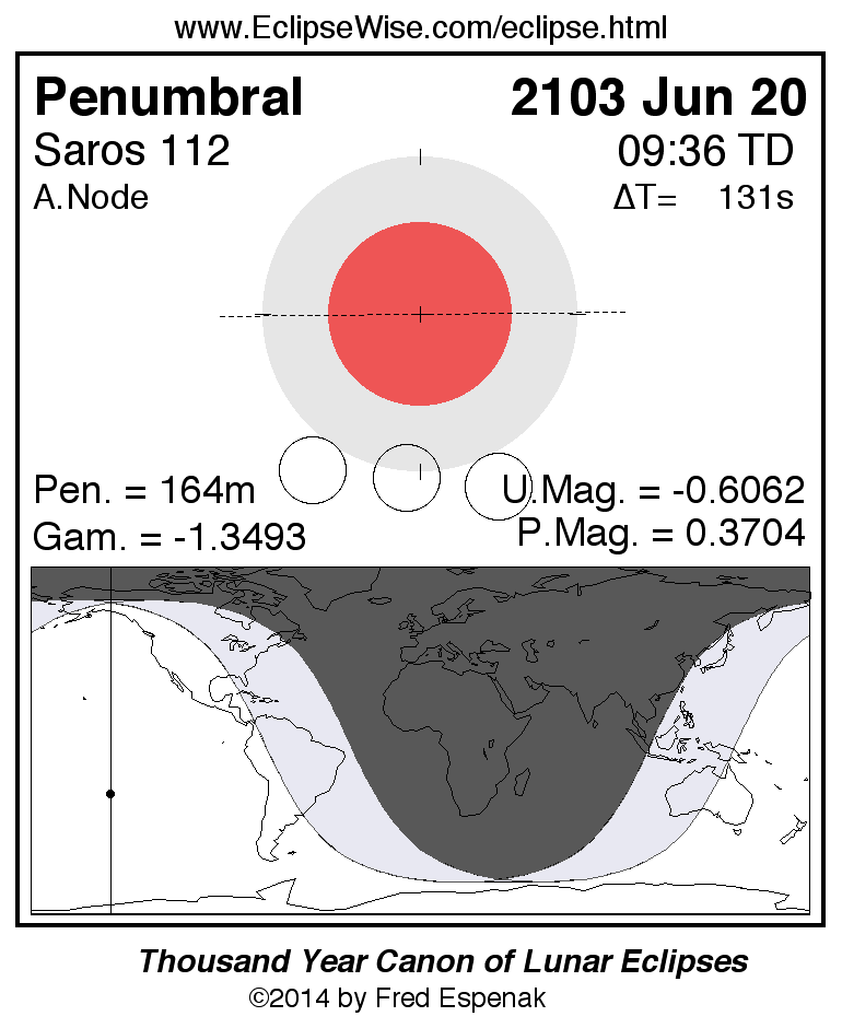 A panorama of all lunar eclipses belonging to Saros 112 is presented here. Each figure shows the Moon's path with respect to Earth's penumbral and umbral shadows. Below the path is a map depicting the geographic region of visibility for the eclipse. The date and time are given for the instant of Greatest Eclipse. Every figure serves as a hyperlink to the EclipseWise Prime page for that eclipse with a larger figure and complete details for the eclipse. Visit the Key to Lunar Eclipse Figures for a detailed explanation of these diagrams. Near the bottom of this page are a series of hyperlinks for more on lunar eclipses.