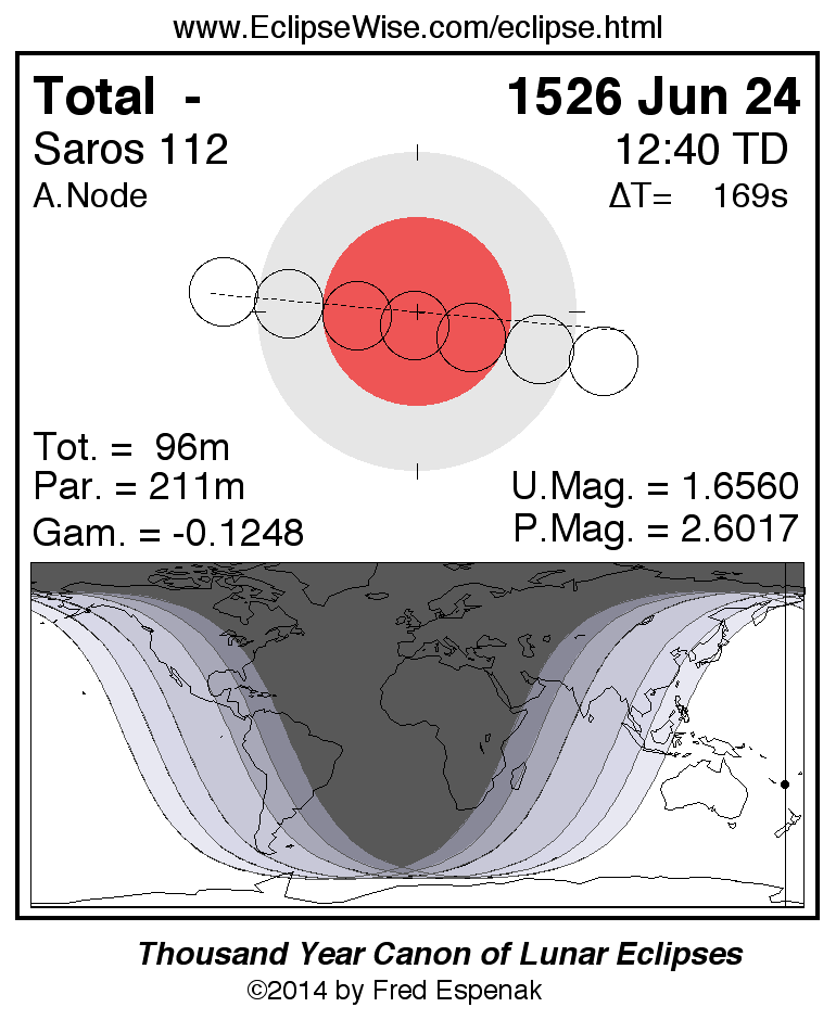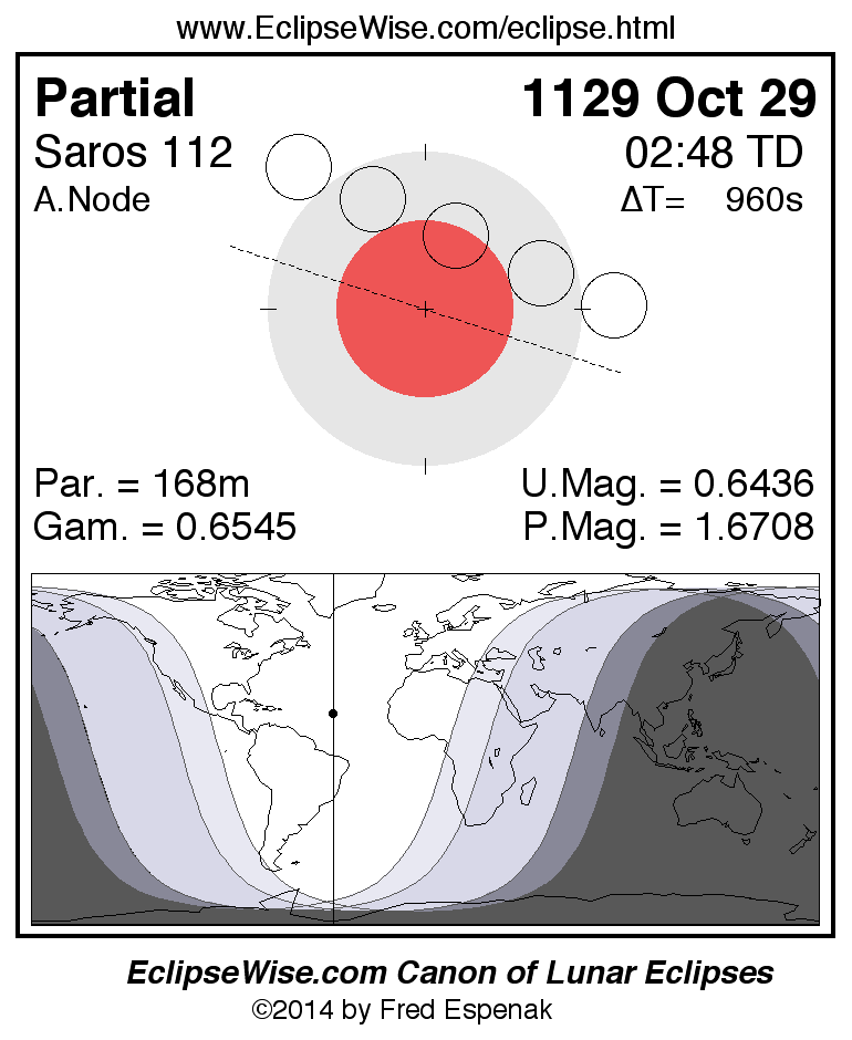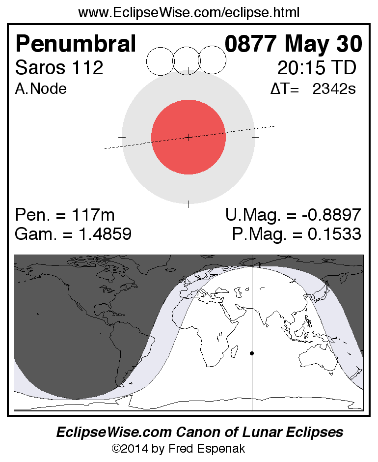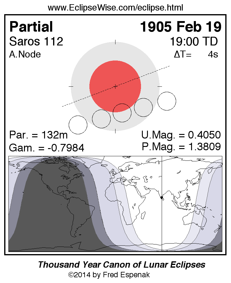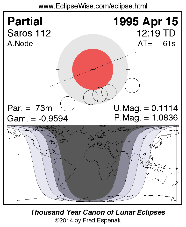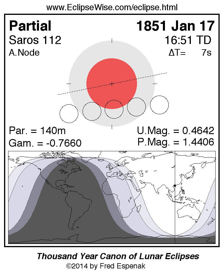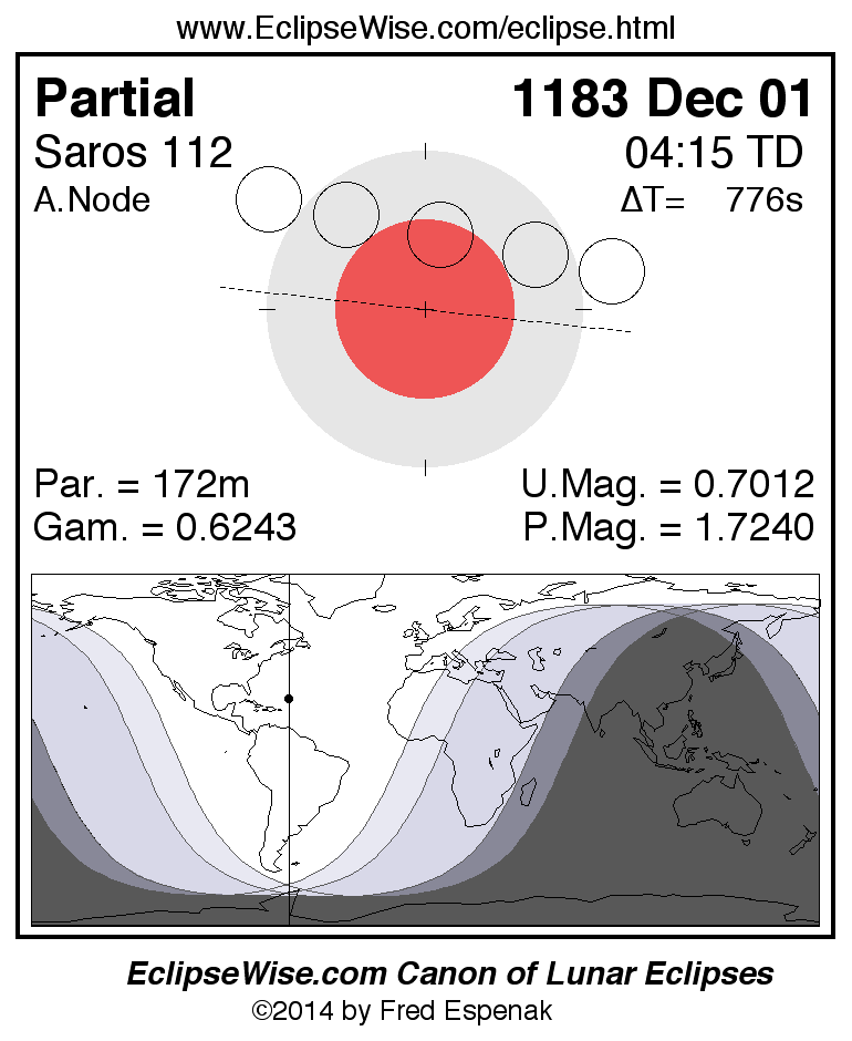 A panorama of all lunar eclipses belonging to Saros 112 is presented here. Each figure shows the Moon's path with respect to Earth's penumbral and umbral shadows. Below the path is a map depicting the geographic region of visibility for the eclipse. The date and time are given for the instant of Greatest Eclipse. Every figure serves as a hyperlink to the EclipseWise Prime page for that eclipse with a larger figure and complete details for the eclipse. Visit the Key to Lunar Eclipse Figures for a detailed explanation of these diagrams. Near the bottom of this page are a series of hyperlinks for more on lunar eclipses.