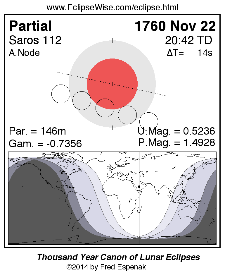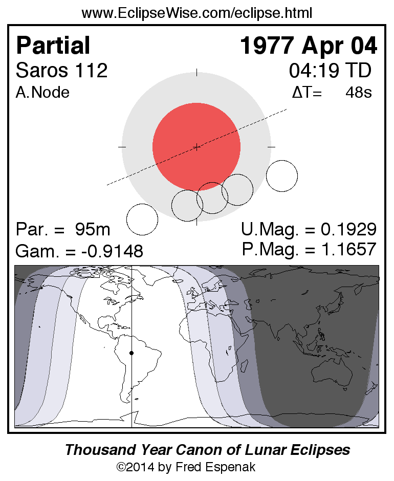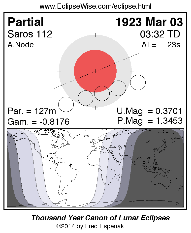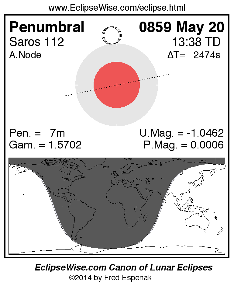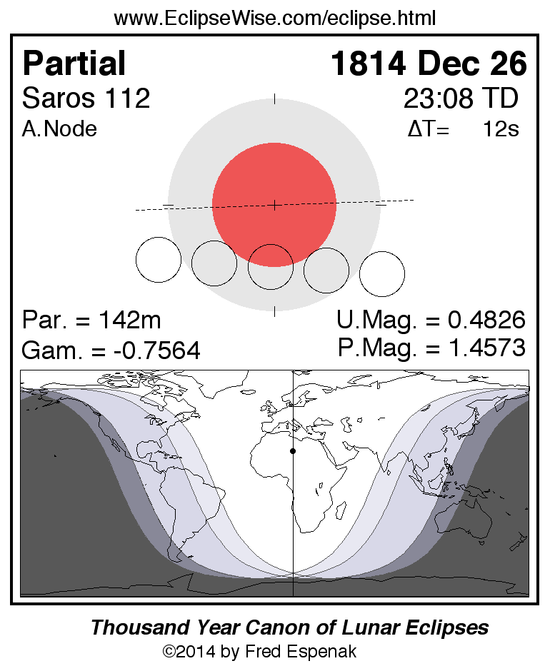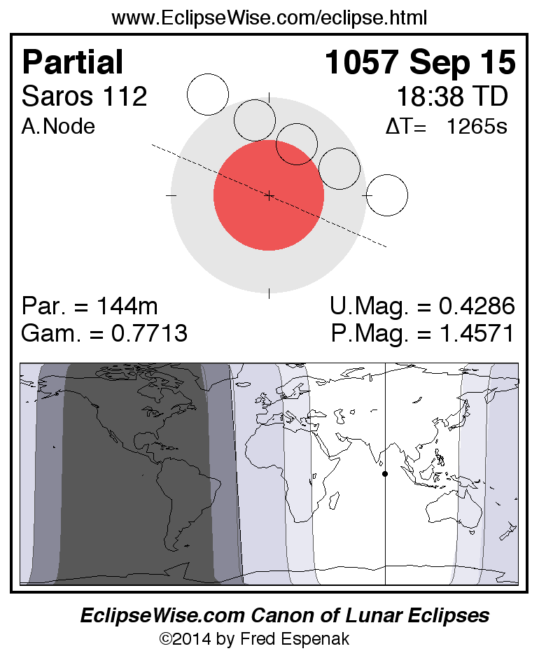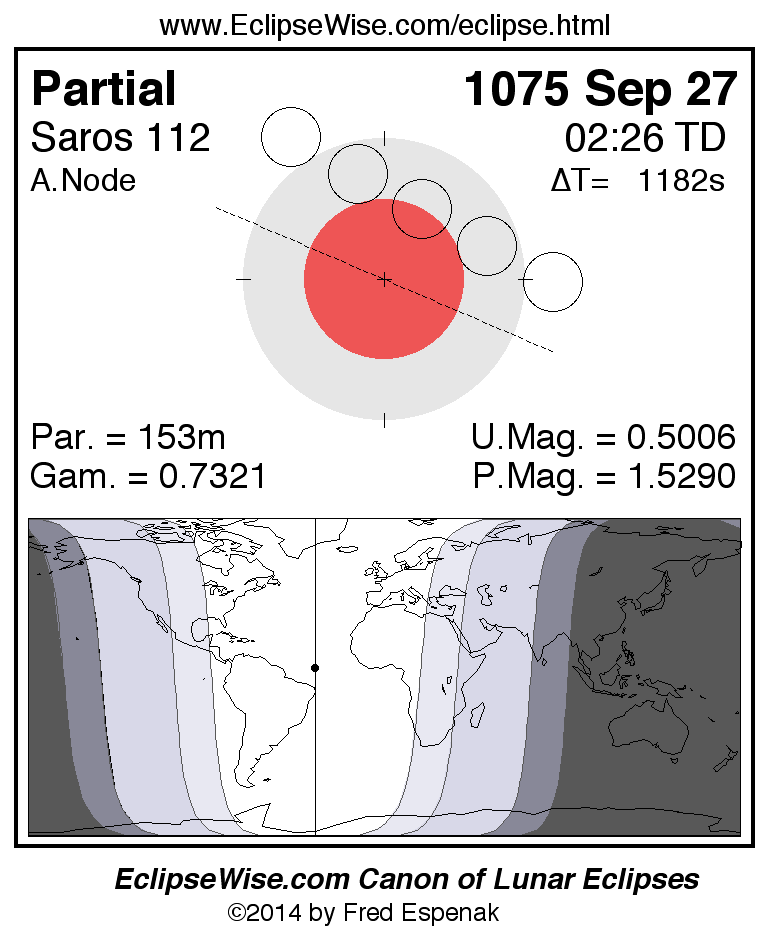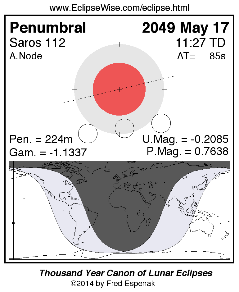 A panorama of all lunar eclipses belonging to Saros 112 is presented here. Each figure shows the Moon's path with respect to Earth's penumbral and umbral shadows. Below the path is a map depicting the geographic region of visibility for the eclipse. The date and time are given for the instant of Greatest Eclipse. Every figure serves as a hyperlink to the EclipseWise Prime page for that eclipse with a larger figure and complete details for the eclipse. Visit the Key to Lunar Eclipse Figures for a detailed explanation of these diagrams. Near the bottom of this page are a series of hyperlinks for more on lunar eclipses.