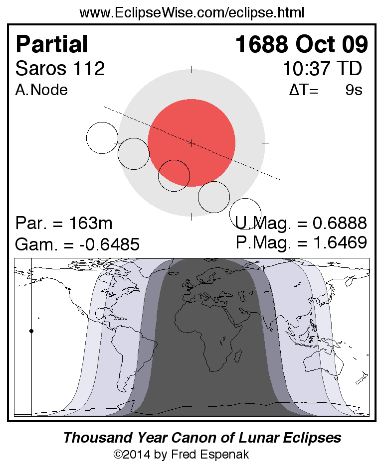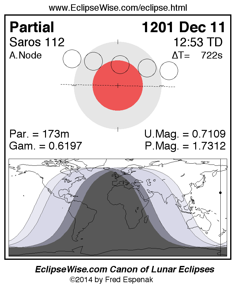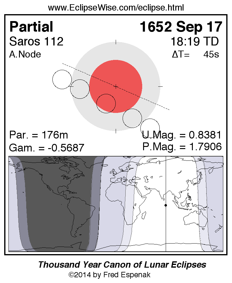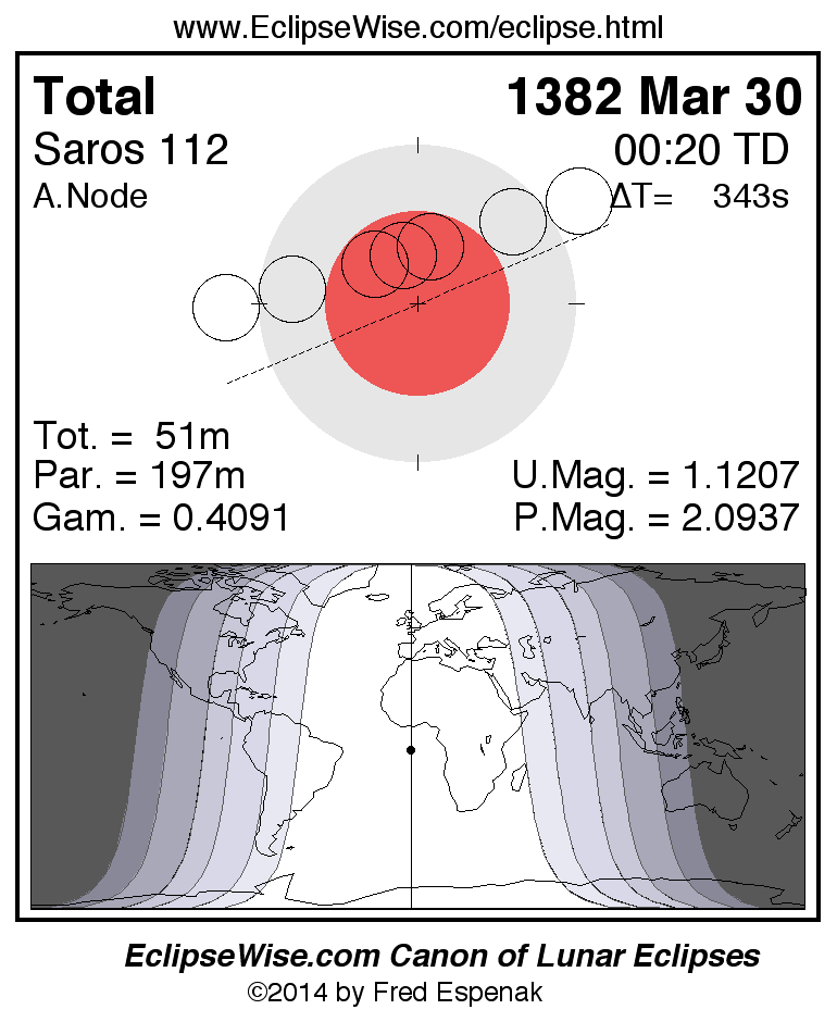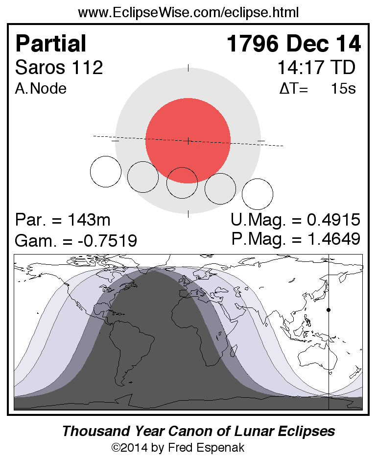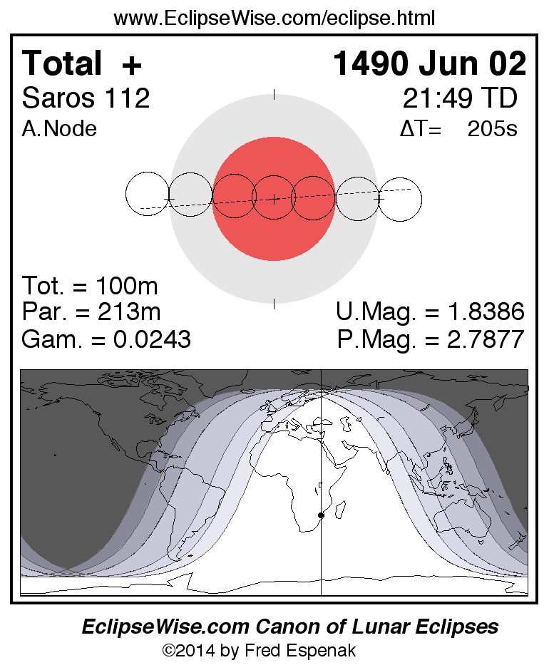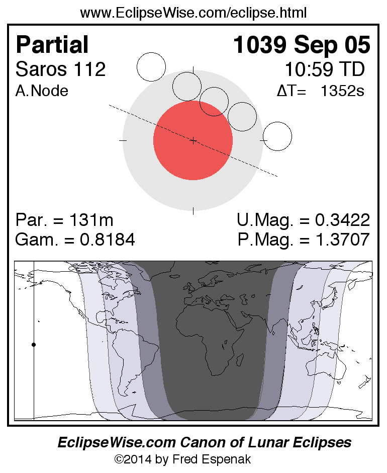 A panorama of all lunar eclipses belonging to Saros 112 is presented here. Each figure shows the Moon's path with respect to Earth's penumbral and umbral shadows. Below the path is a map depicting the geographic region of visibility for the eclipse. The date and time are given for the instant of Greatest Eclipse. Every figure serves as a hyperlink to the EclipseWise Prime page for that eclipse with a larger figure and complete details for the eclipse. Visit the Key to Lunar Eclipse Figures for a detailed explanation of these diagrams. Near the bottom of this page are a series of hyperlinks for more on lunar eclipses.