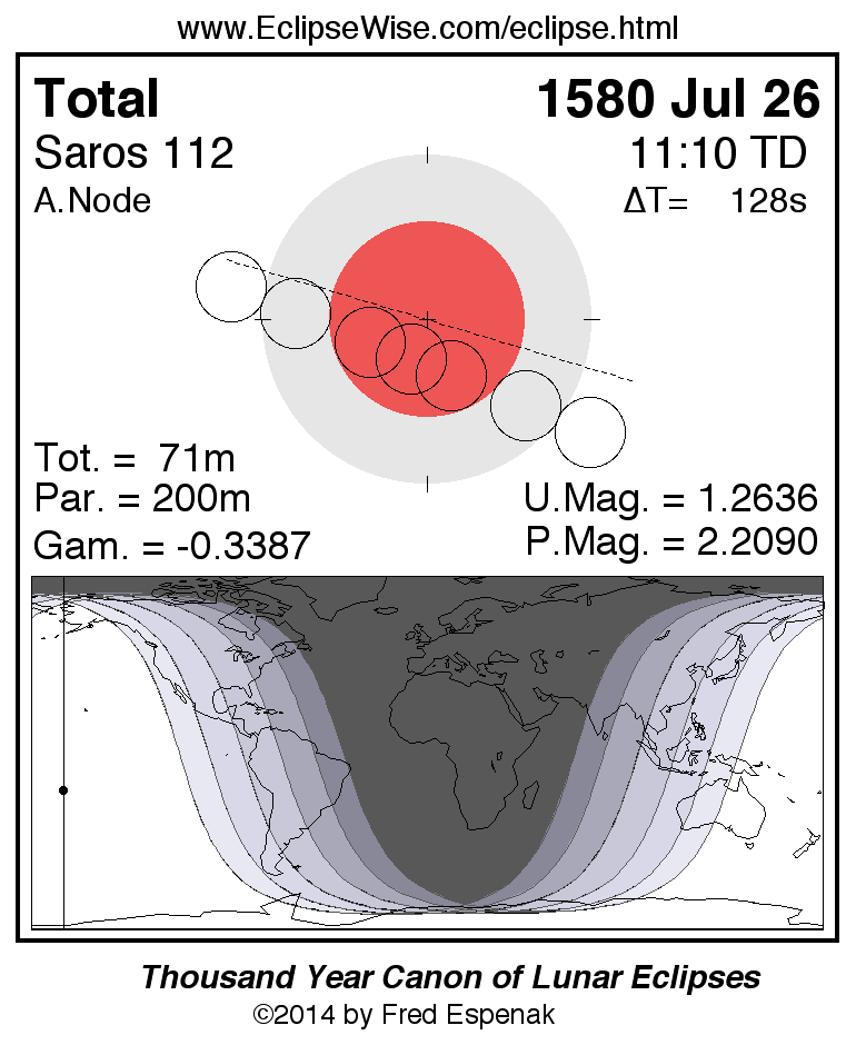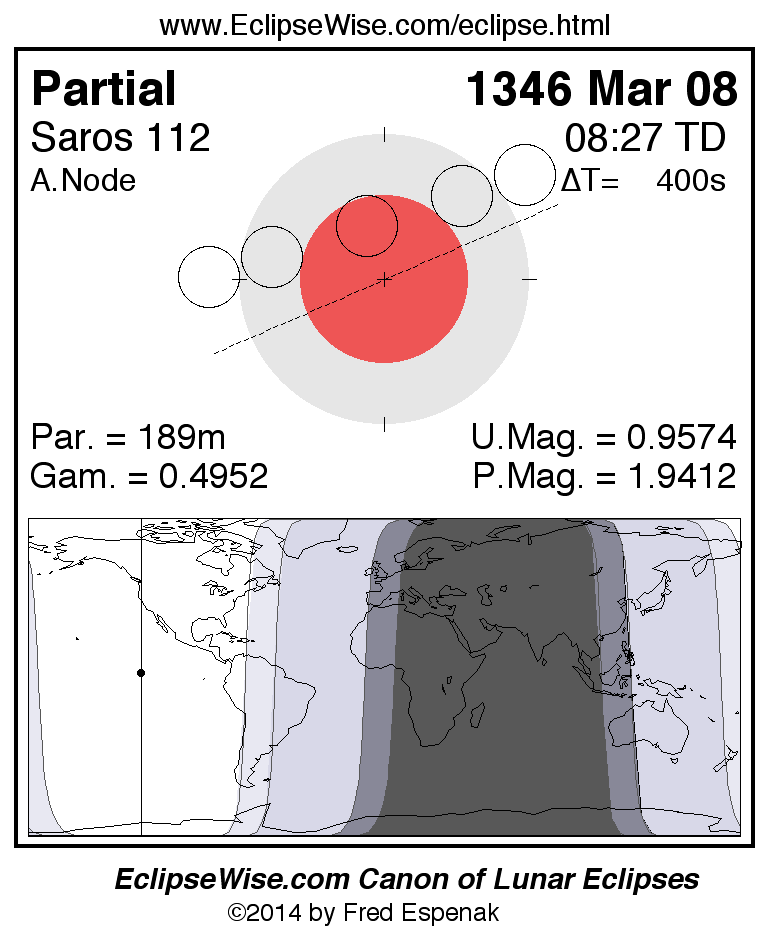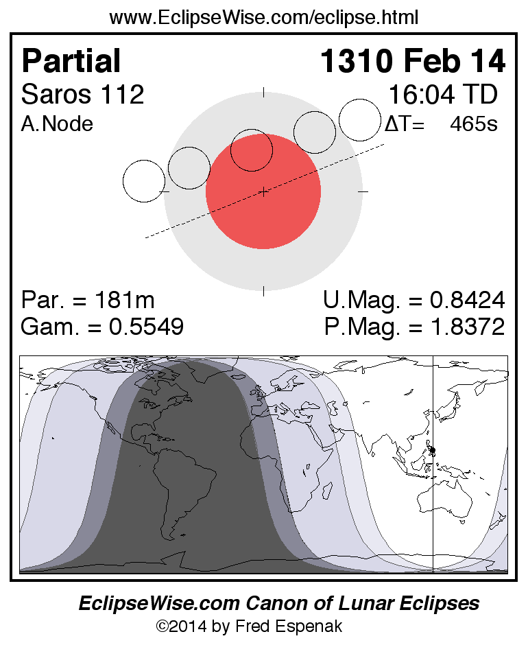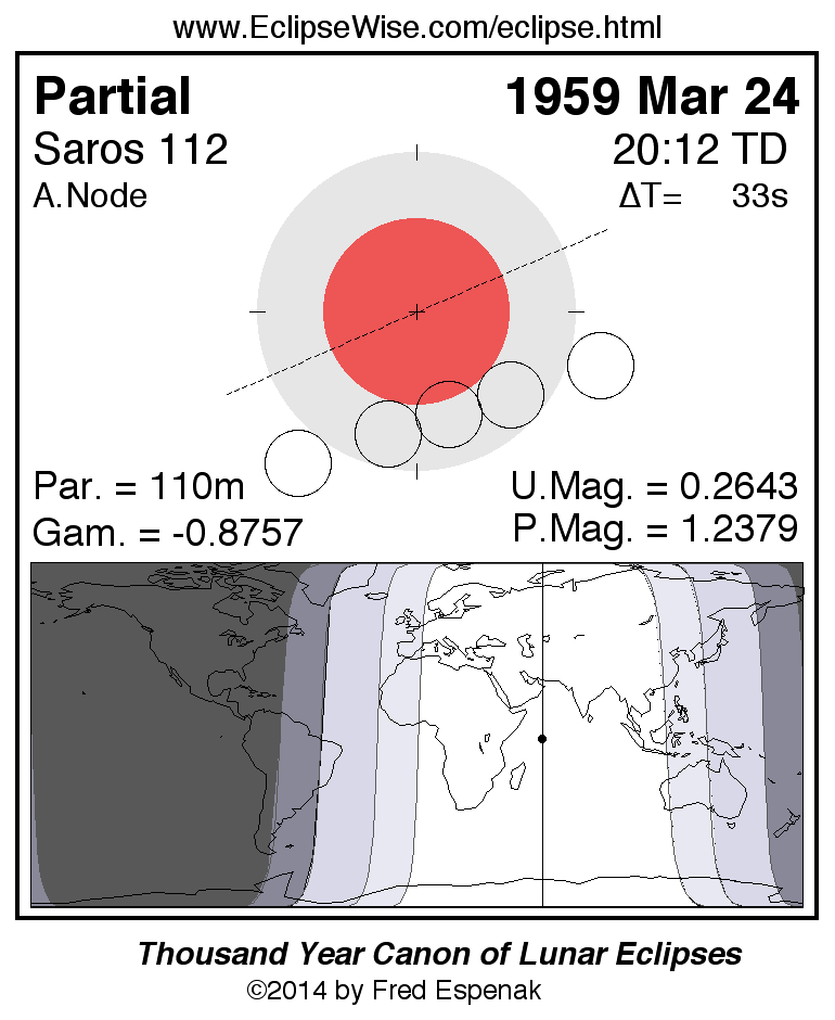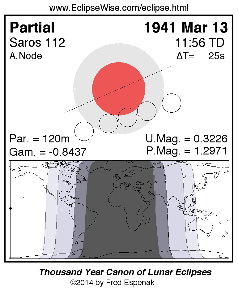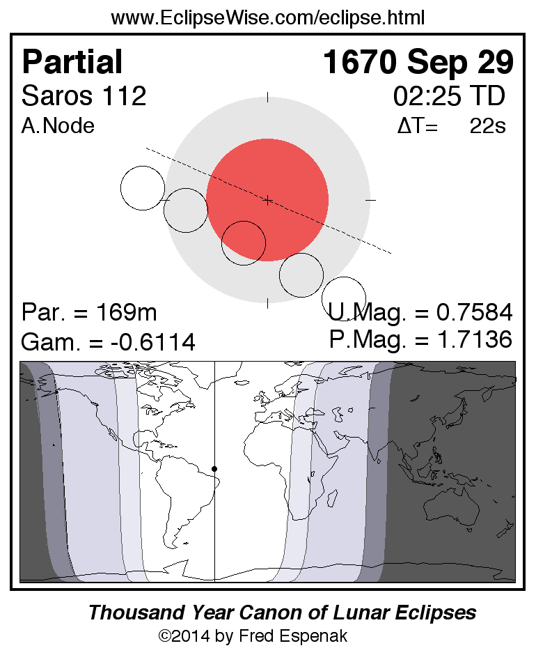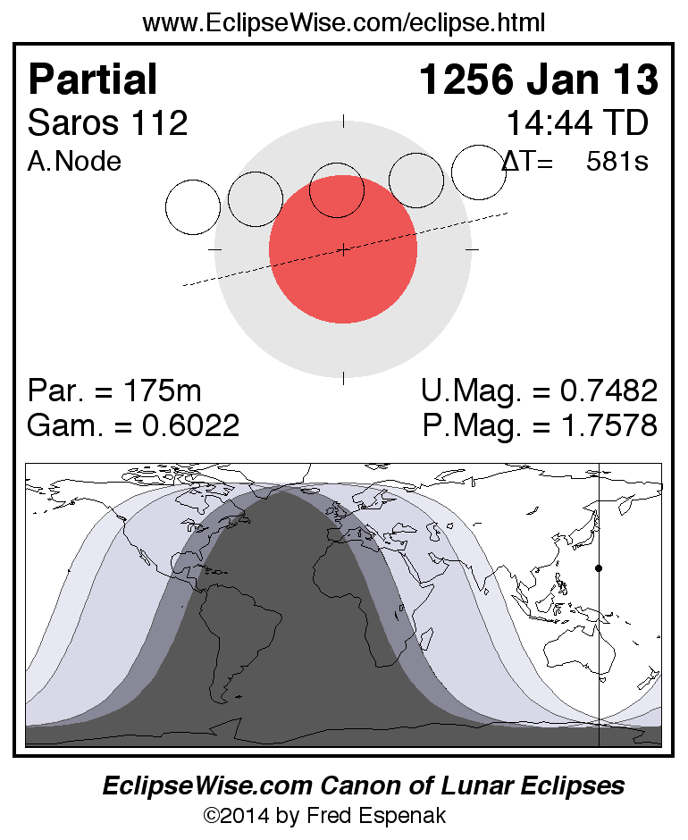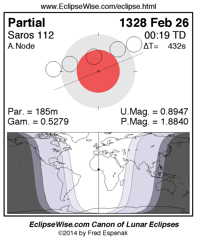 A panorama of all lunar eclipses belonging to Saros 112 is presented here. Each figure shows the Moon's path with respect to Earth's penumbral and umbral shadows. Below the path is a map depicting the geographic region of visibility for the eclipse. The date and time are given for the instant of Greatest Eclipse. Every figure serves as a hyperlink to the EclipseWise Prime page for that eclipse with a larger figure and complete details for the eclipse. Visit the Key to Lunar Eclipse Figures for a detailed explanation of these diagrams. Near the bottom of this page are a series of hyperlinks for more on lunar eclipses.