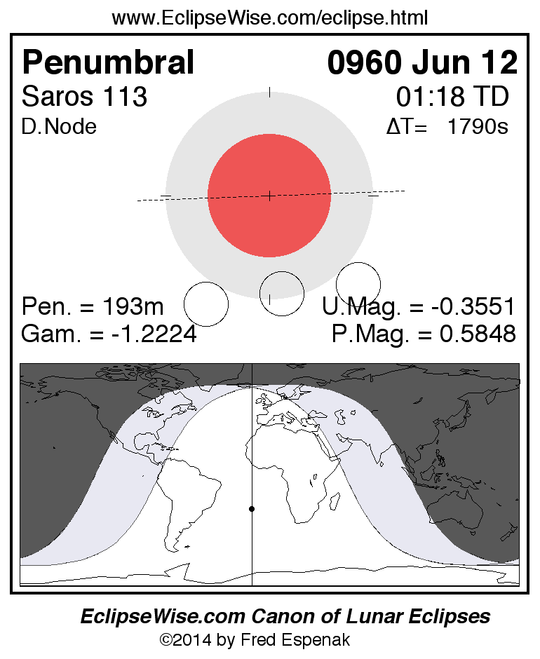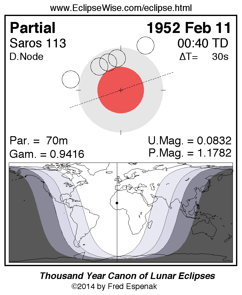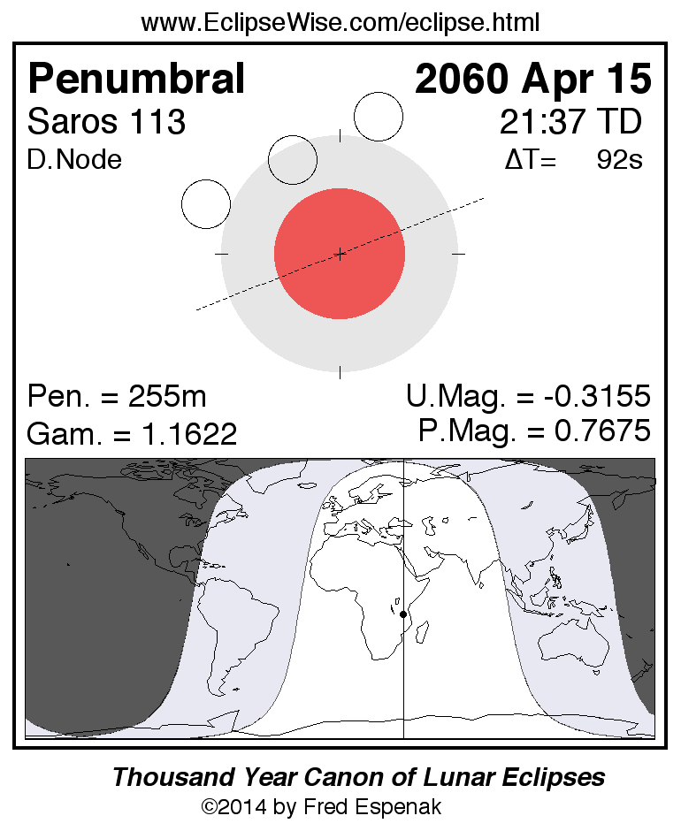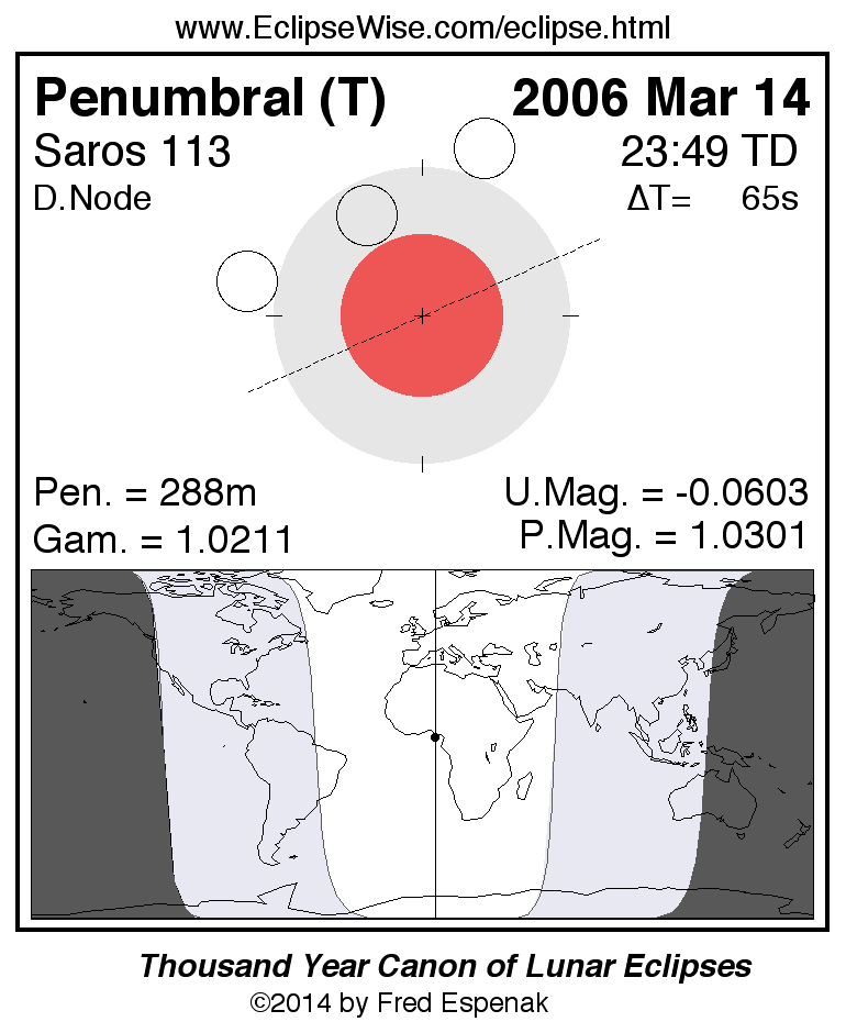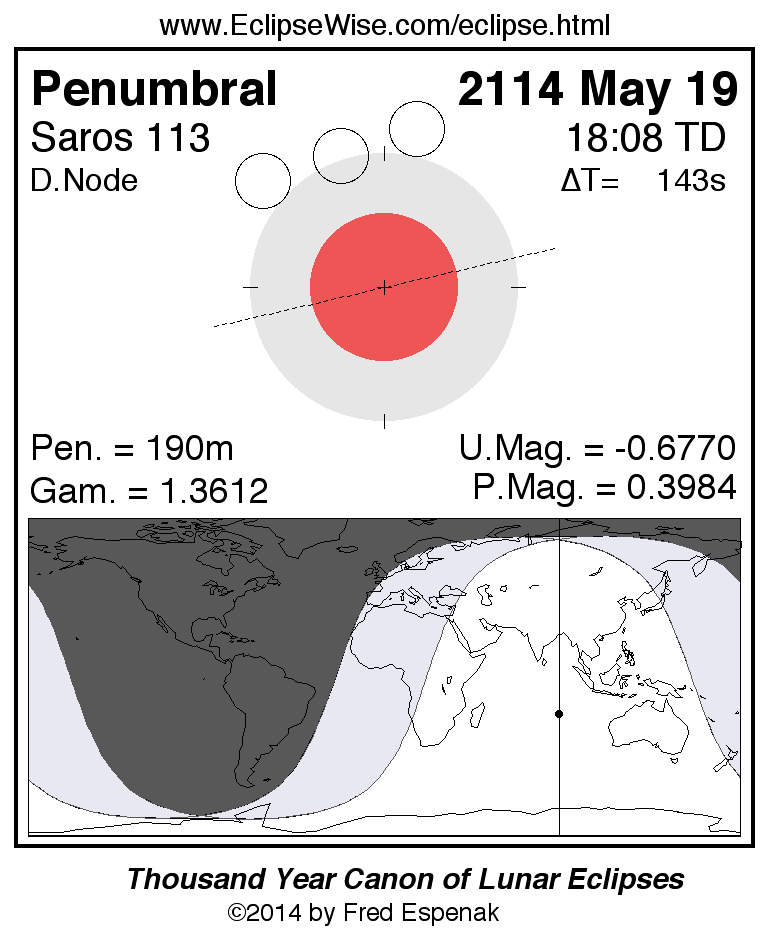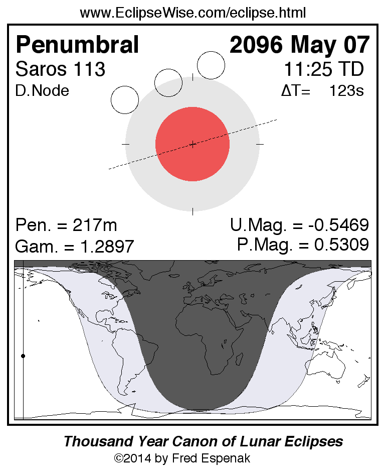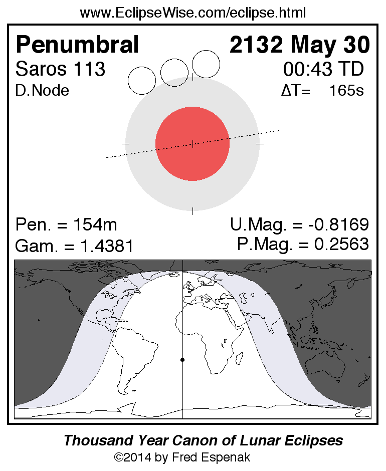 A panorama of all lunar eclipses belonging to Saros 113 is presented here. Each figure shows the Moon's path with respect to Earth's penumbral and umbral shadows. Below the path is a map depicting the geographic region of visibility for the eclipse. The date and time are given for the instant of Greatest Eclipse. Every figure serves as a hyperlink to the EclipseWise Prime page for that eclipse with a larger figure and complete details for the eclipse. Visit the Key to Lunar Eclipse Figures for a detailed explanation of these diagrams. Near the bottom of this page are a series of hyperlinks for more on lunar eclipses.