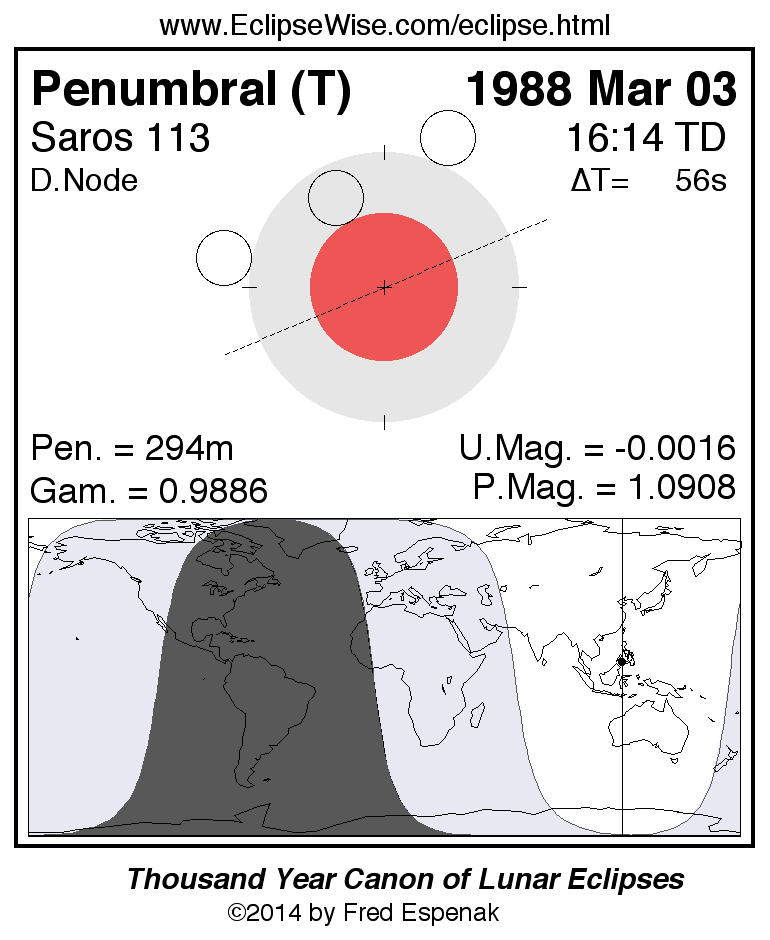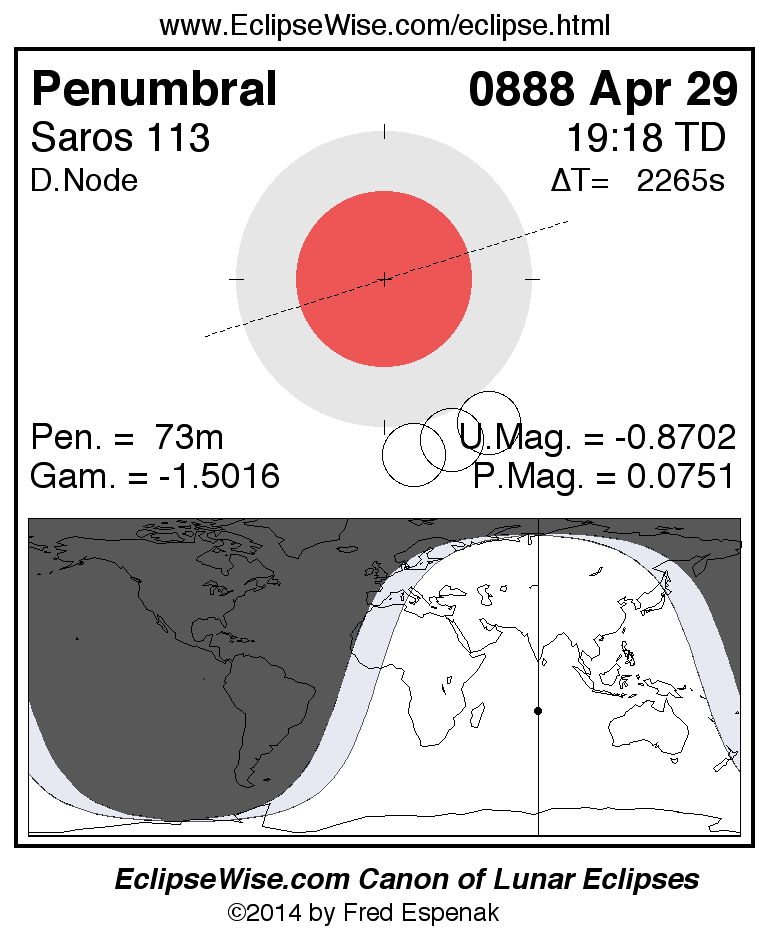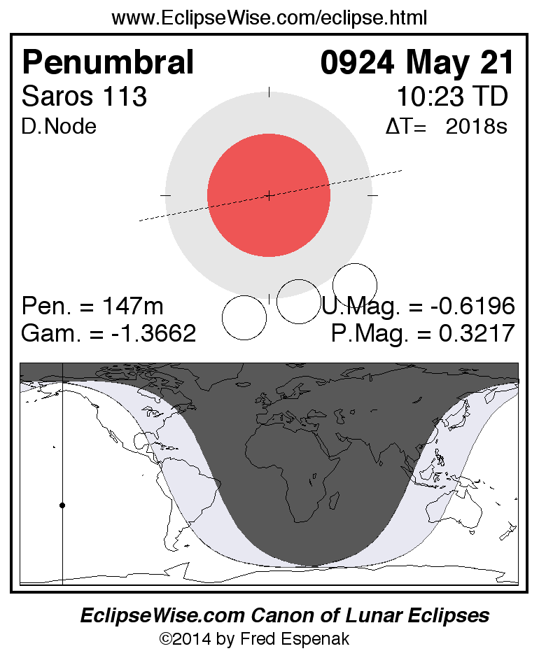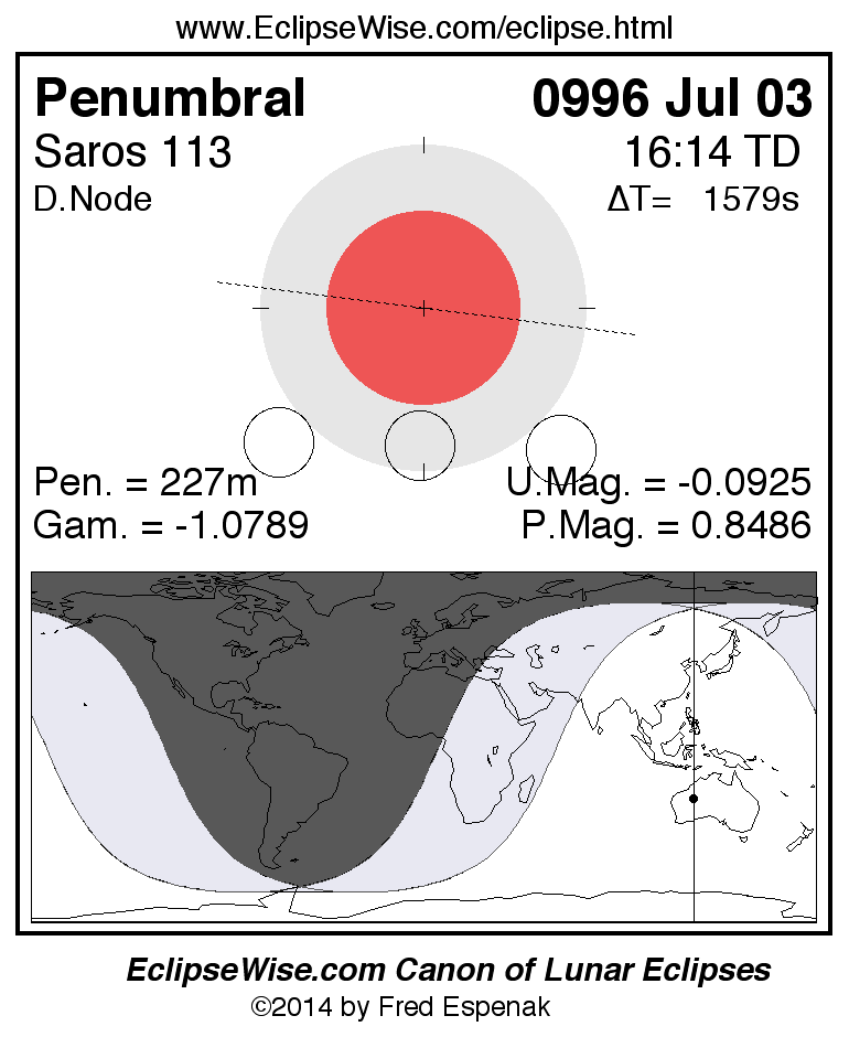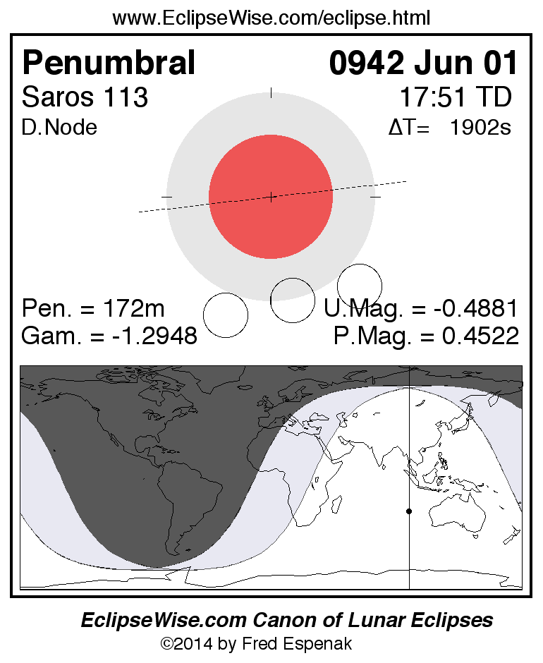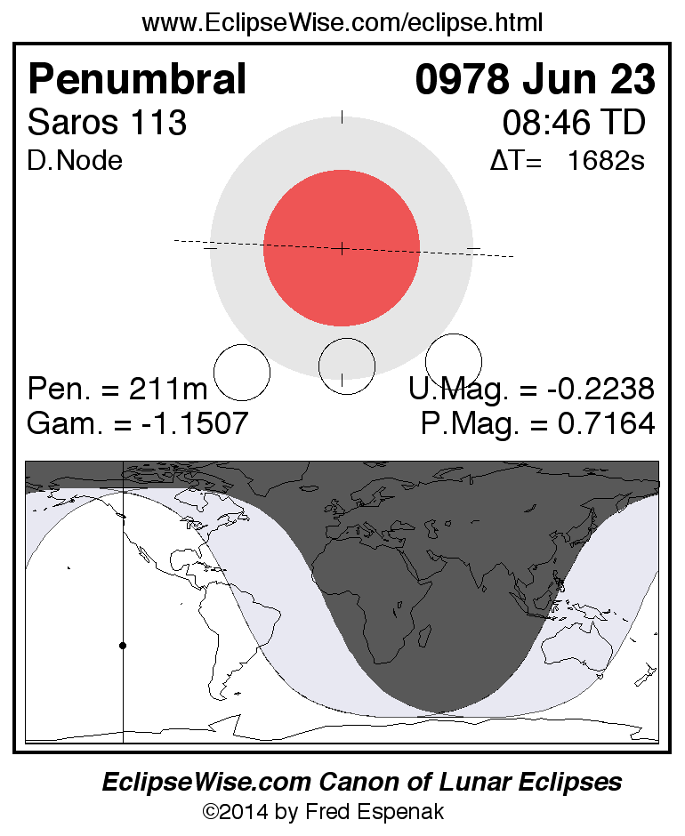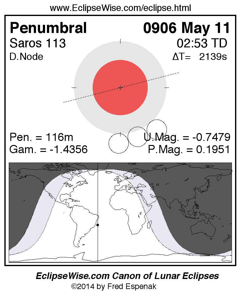 A panorama of all lunar eclipses belonging to Saros 113 is presented here. Each figure shows the Moon's path with respect to Earth's penumbral and umbral shadows. Below the path is a map depicting the geographic region of visibility for the eclipse. The date and time are given for the instant of Greatest Eclipse. Every figure serves as a hyperlink to the EclipseWise Prime page for that eclipse with a larger figure and complete details for the eclipse. Visit the Key to Lunar Eclipse Figures for a detailed explanation of these diagrams. Near the bottom of this page are a series of hyperlinks for more on lunar eclipses.
