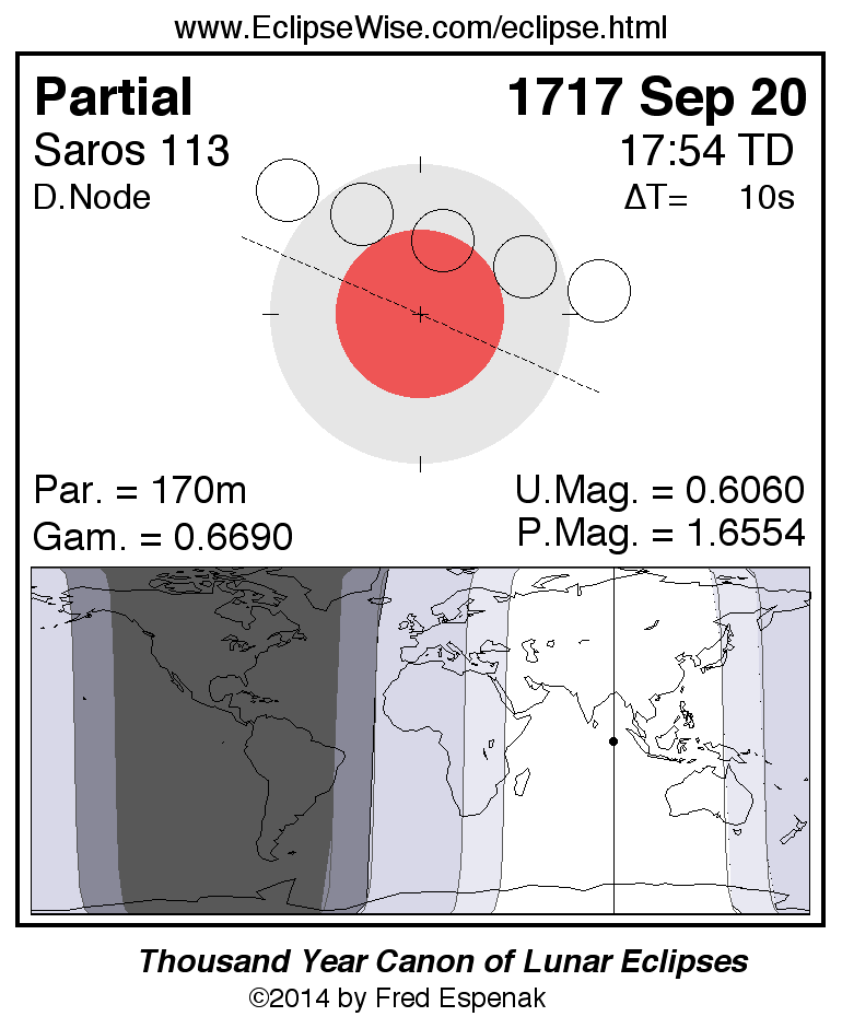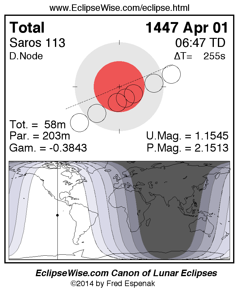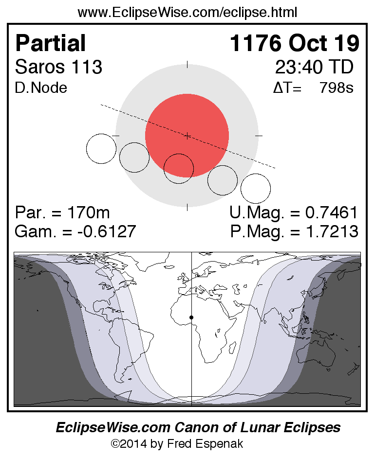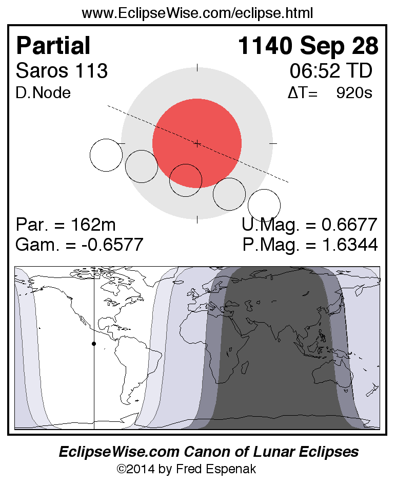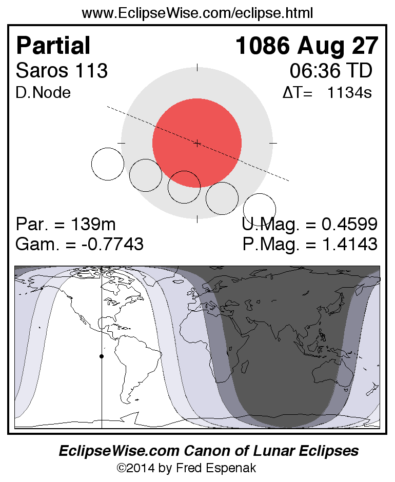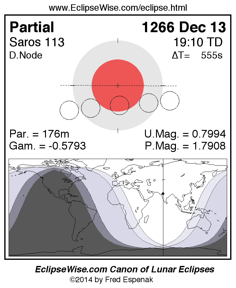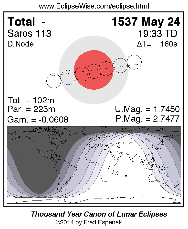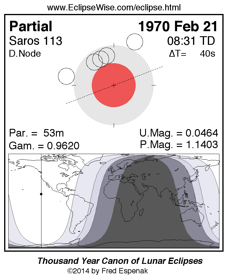 A panorama of all lunar eclipses belonging to Saros 113 is presented here. Each figure shows the Moon's path with respect to Earth's penumbral and umbral shadows. Below the path is a map depicting the geographic region of visibility for the eclipse. The date and time are given for the instant of Greatest Eclipse. Every figure serves as a hyperlink to the EclipseWise Prime page for that eclipse with a larger figure and complete details for the eclipse. Visit the Key to Lunar Eclipse Figures for a detailed explanation of these diagrams. Near the bottom of this page are a series of hyperlinks for more on lunar eclipses.
