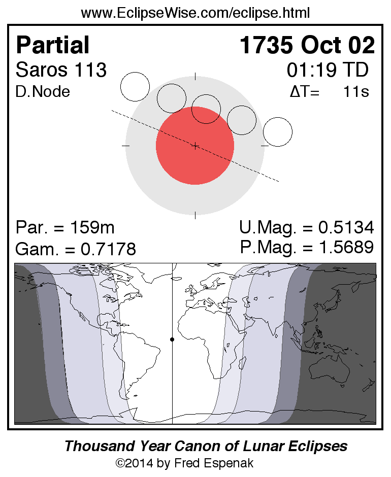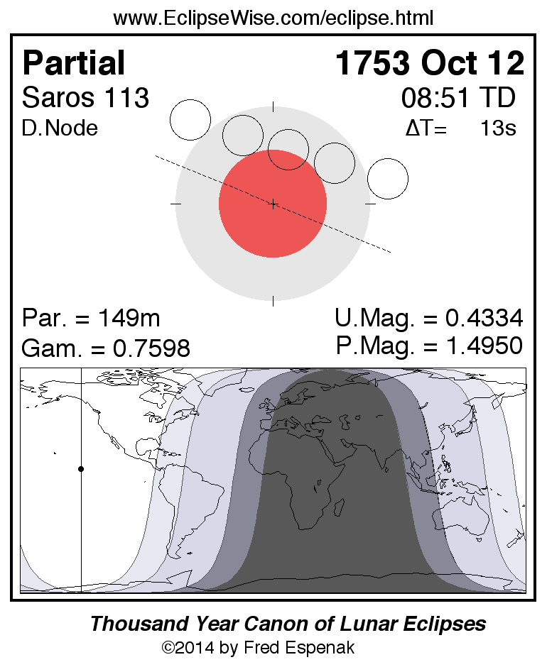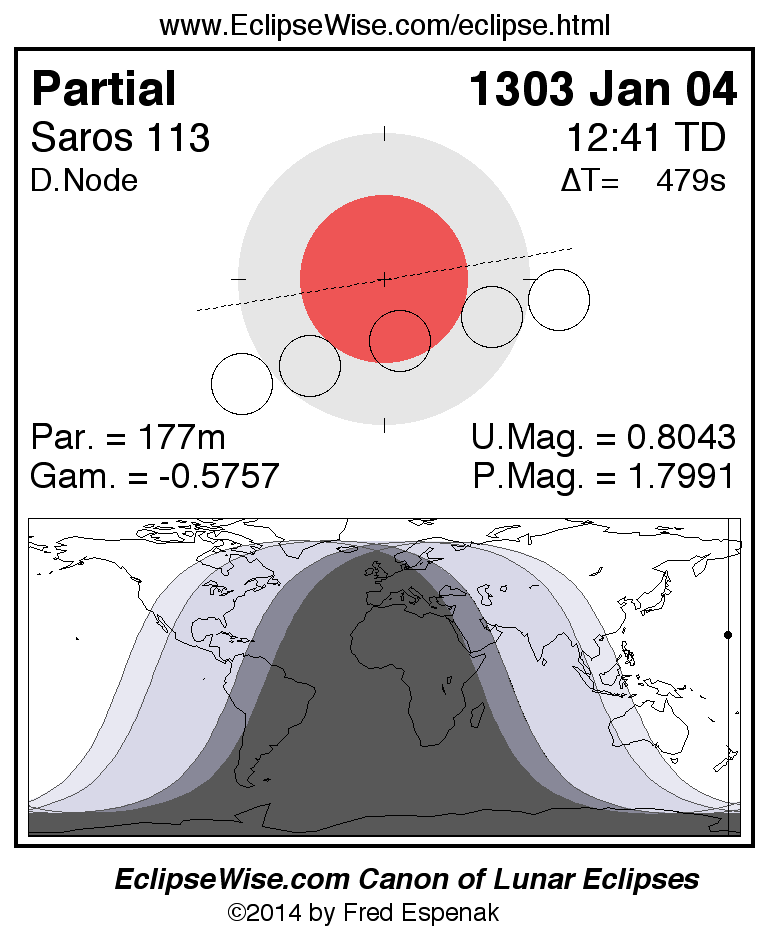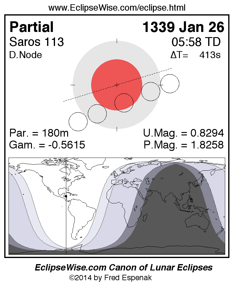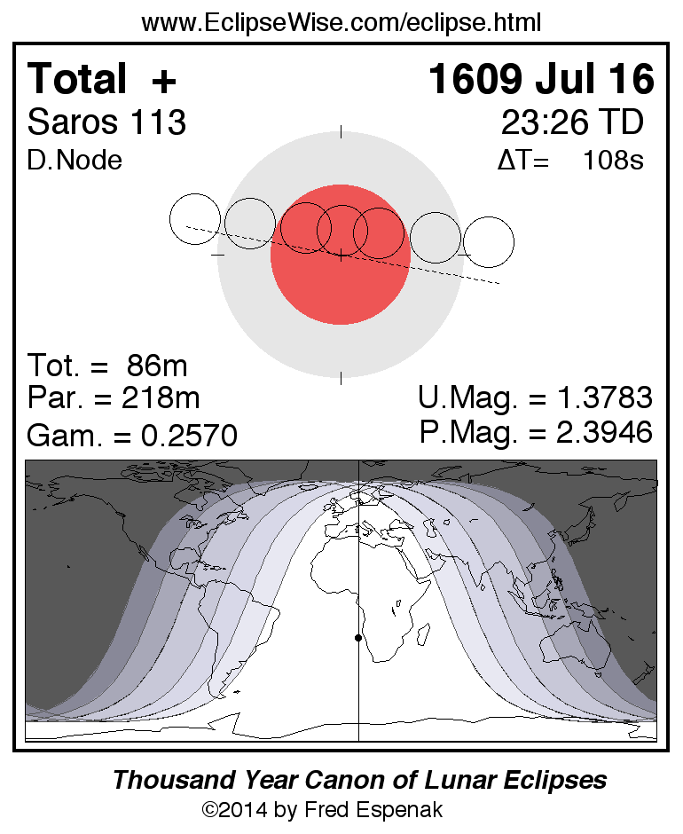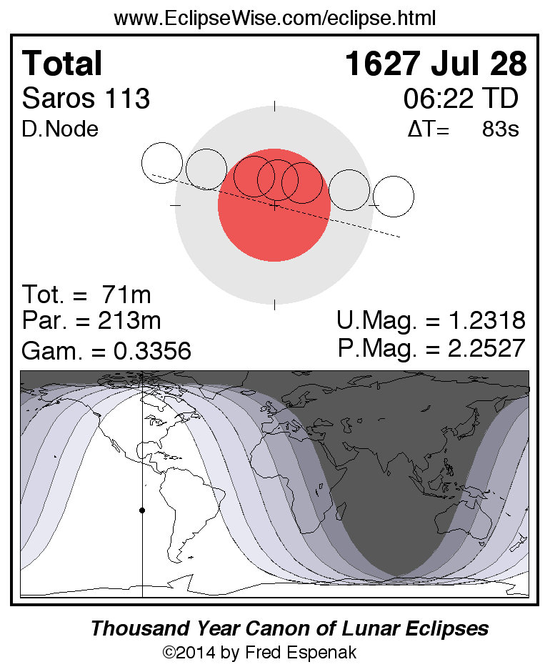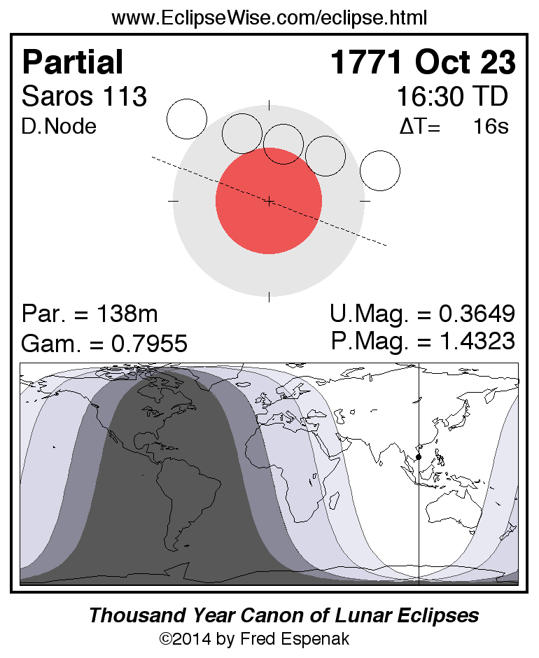A panorama of all lunar eclipses belonging to Saros 113 is presented here. Each figure shows the Moon's path with respect to Earth's penumbral and umbral shadows. Below the path is a map depicting the geographic region of visibility for the eclipse. The date and time are given for the instant of Greatest Eclipse. Every figure serves as a hyperlink to the EclipseWise Prime page for that eclipse with a larger figure and complete details for the eclipse. Visit the Key to Lunar Eclipse Figures for a detailed explanation of these diagrams. Near the bottom of this page are a series of hyperlinks for more on lunar eclipses.