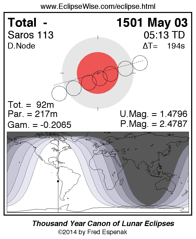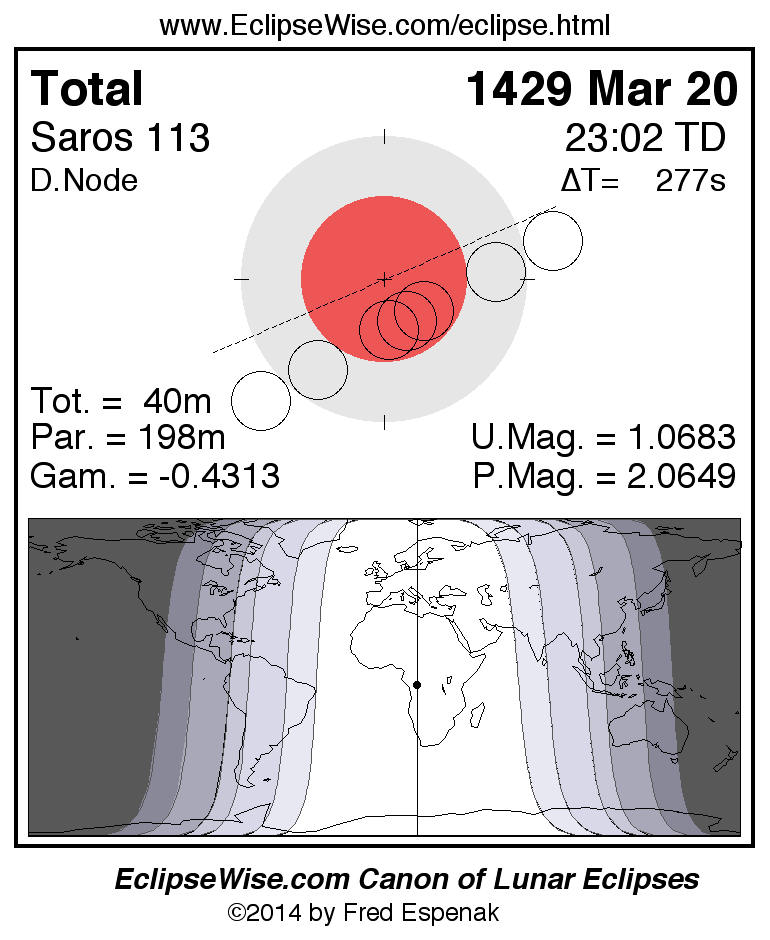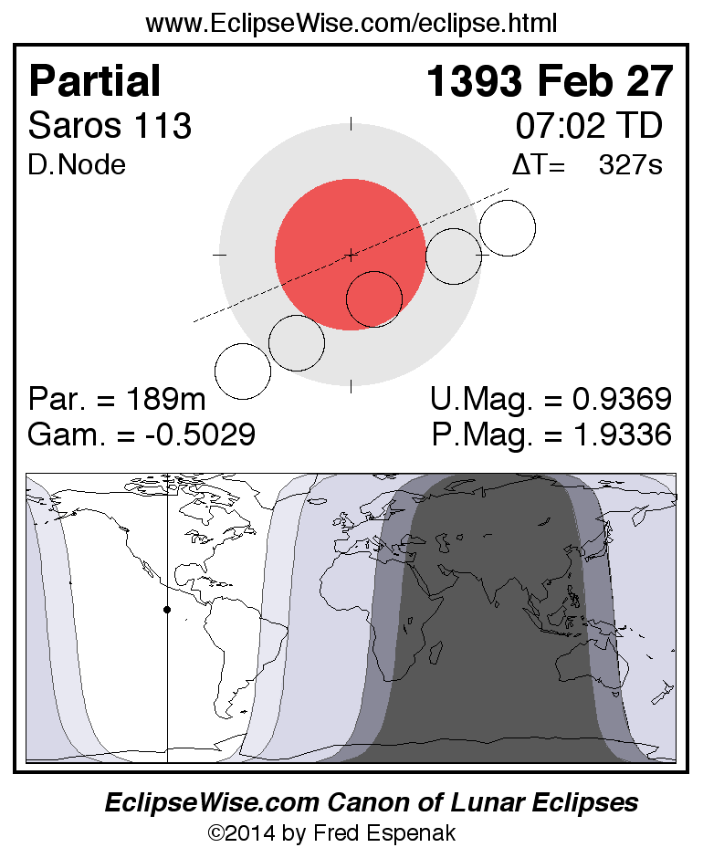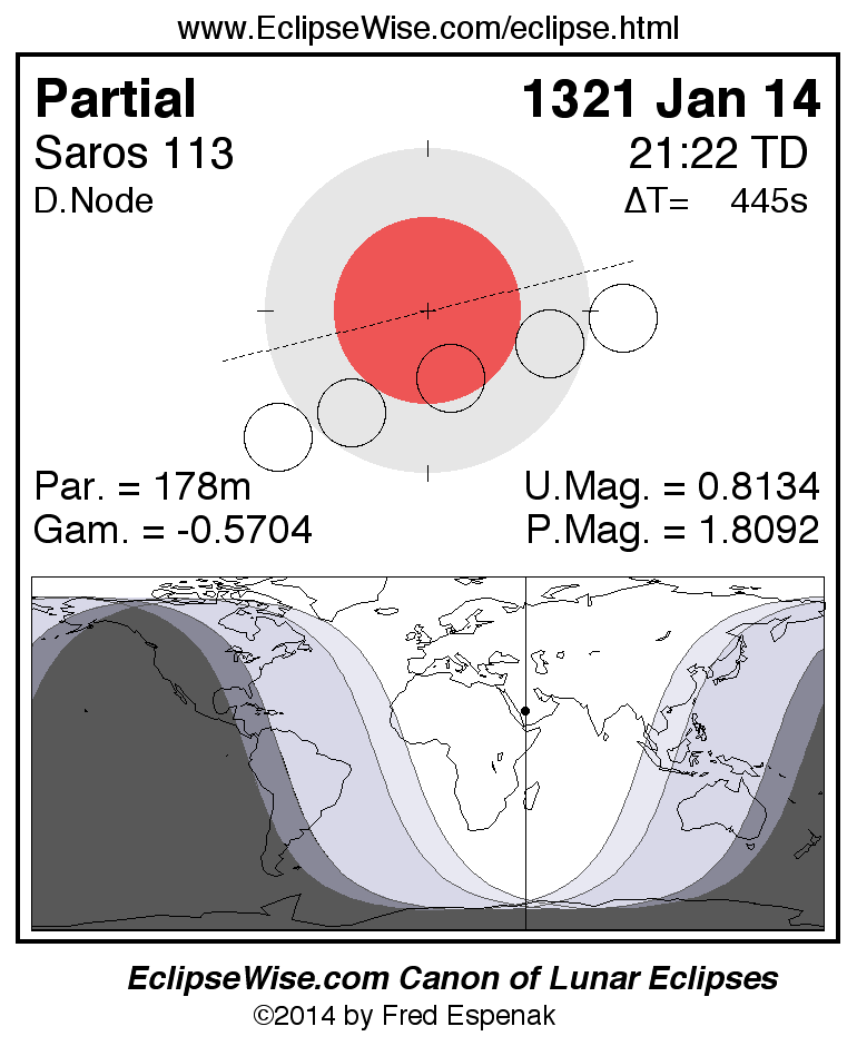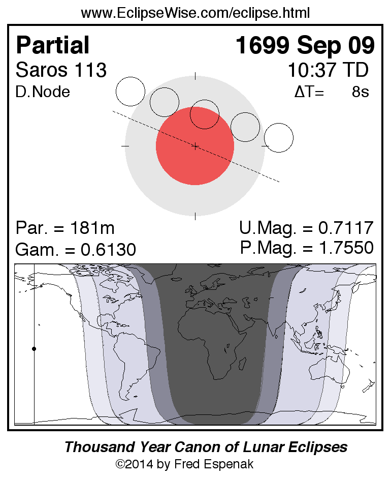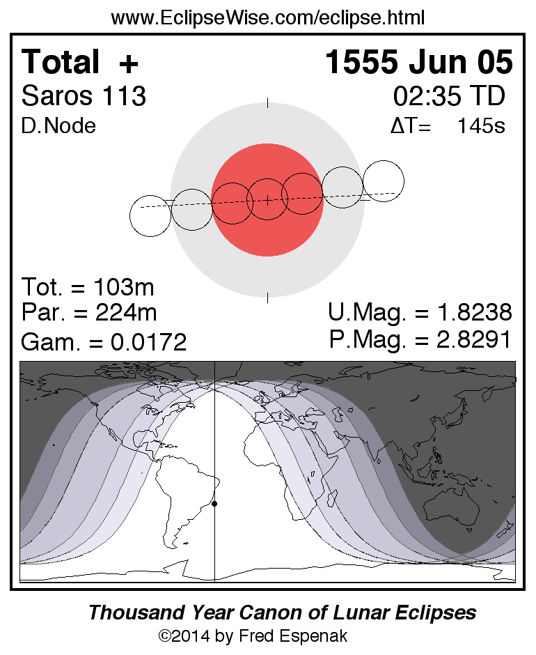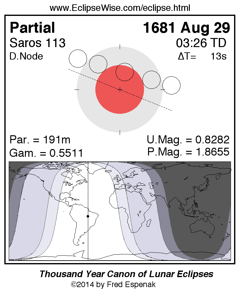 A panorama of all lunar eclipses belonging to Saros 113 is presented here. Each figure shows the Moon's path with respect to Earth's penumbral and umbral shadows. Below the path is a map depicting the geographic region of visibility for the eclipse. The date and time are given for the instant of Greatest Eclipse. Every figure serves as a hyperlink to the EclipseWise Prime page for that eclipse with a larger figure and complete details for the eclipse. Visit the Key to Lunar Eclipse Figures for a detailed explanation of these diagrams. Near the bottom of this page are a series of hyperlinks for more on lunar eclipses.