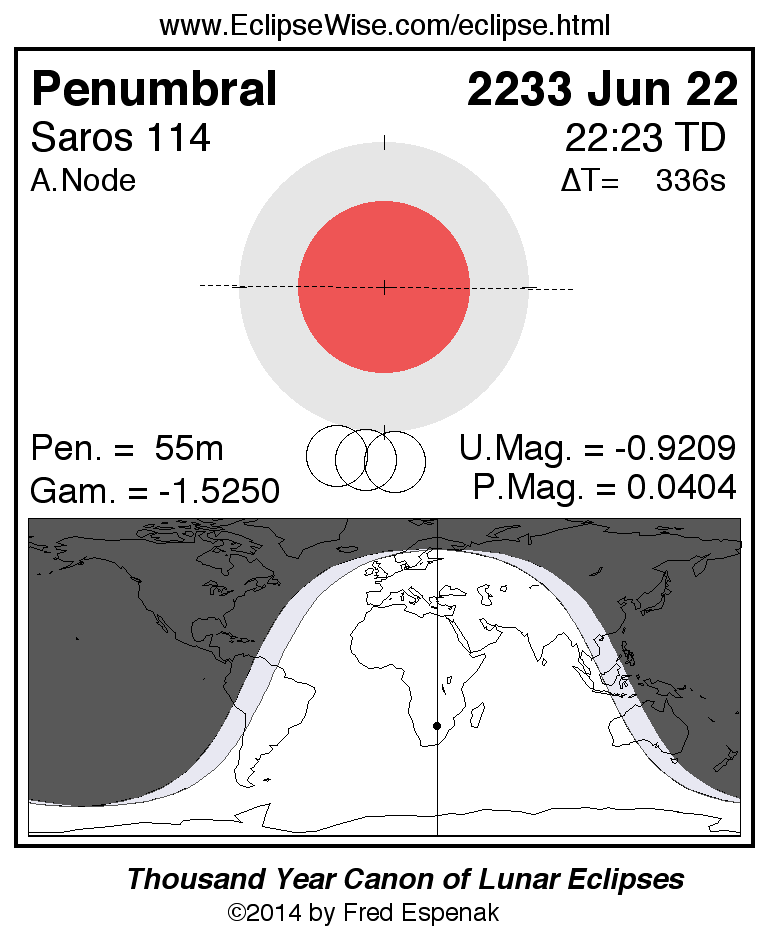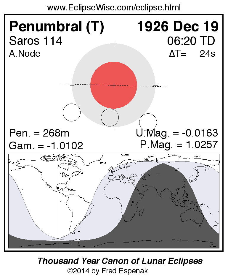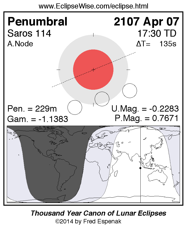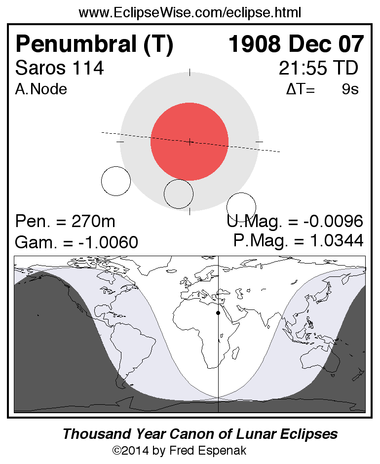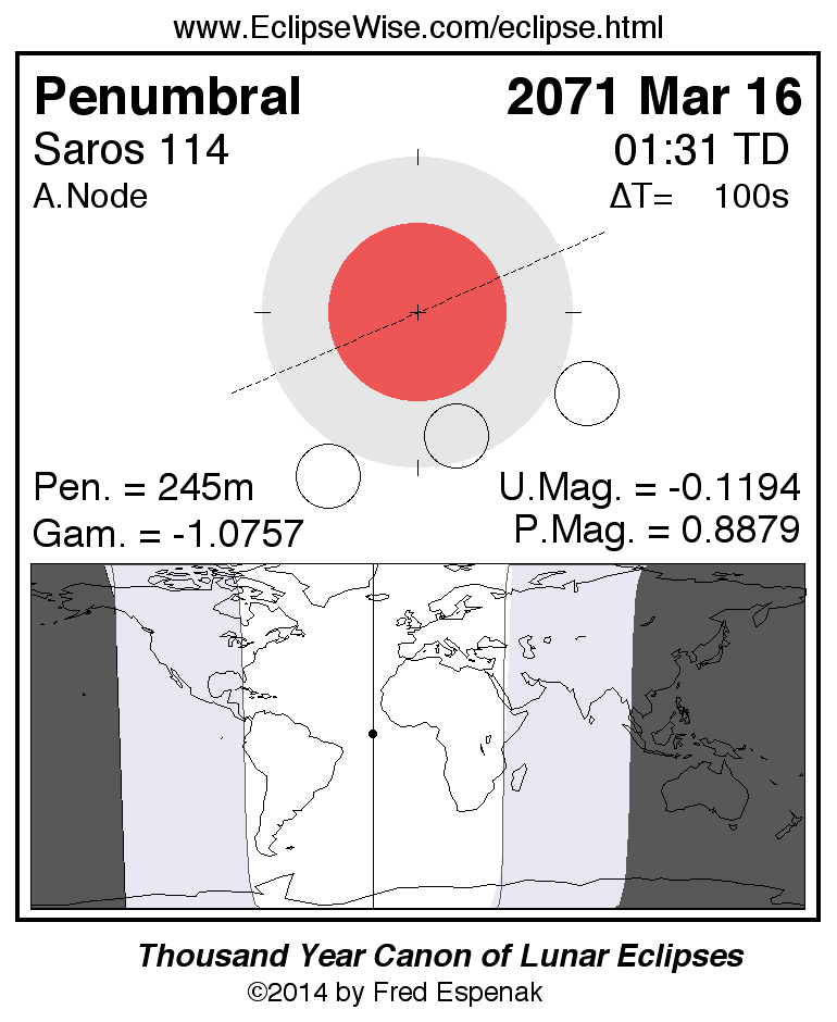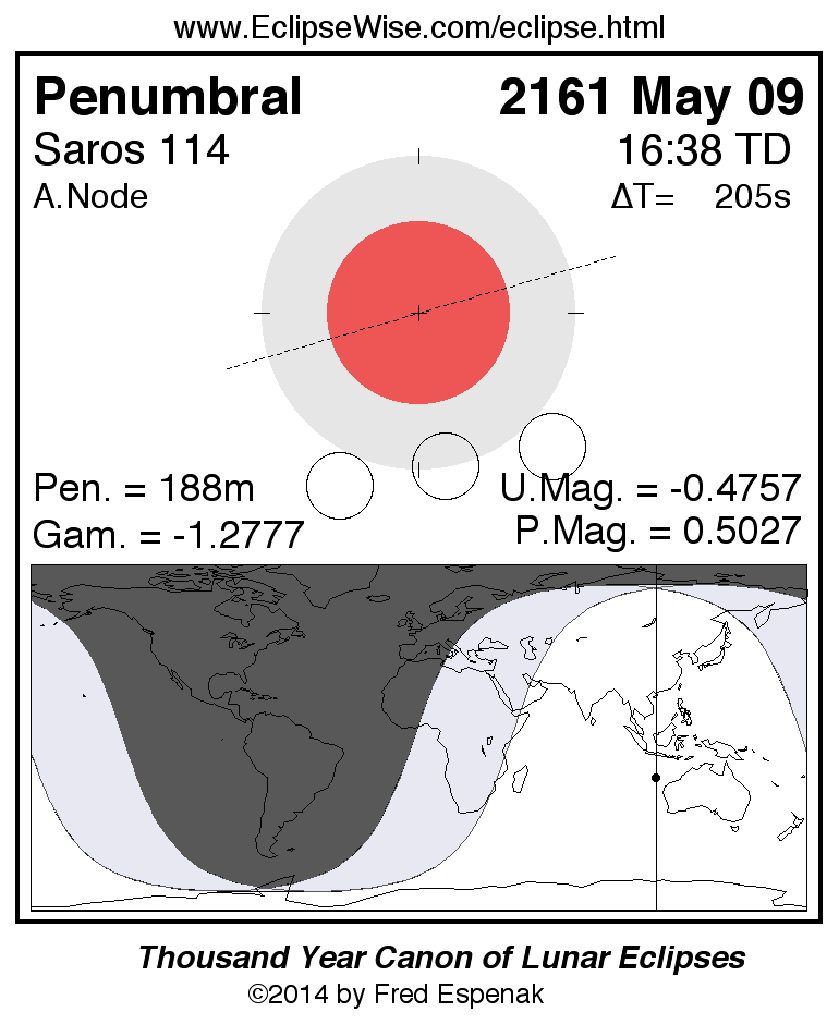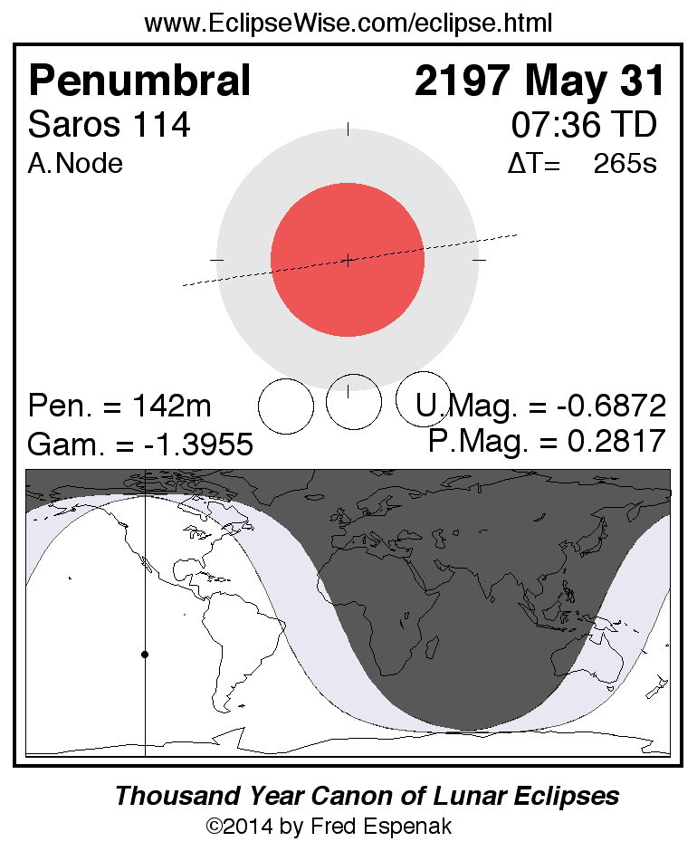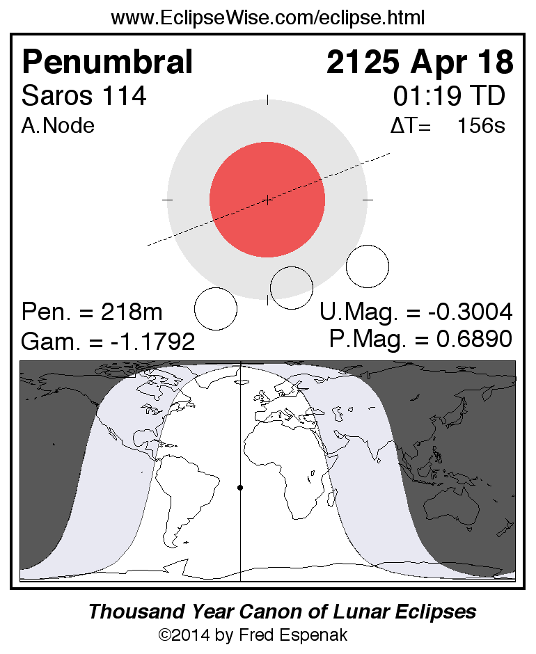 A panorama of all lunar eclipses belonging to Saros 114 is presented here. Each figure shows the Moon's path with respect to Earth's penumbral and umbral shadows. Below the path is a map depicting the geographic region of visibility for the eclipse. The date and time are given for the instant of Greatest Eclipse. Every figure serves as a hyperlink to the EclipseWise Prime page for that eclipse with a larger figure and complete details for the eclipse. Visit the Key to Lunar Eclipse Figures for a detailed explanation of these diagrams. Near the bottom of this page are a series of hyperlinks for more on lunar eclipses.