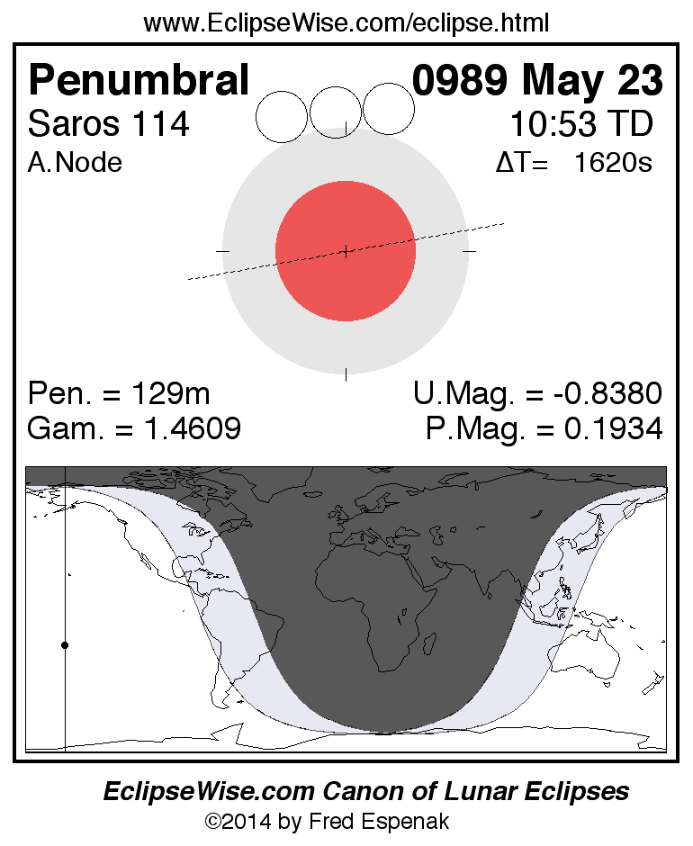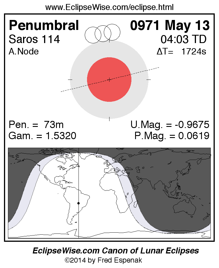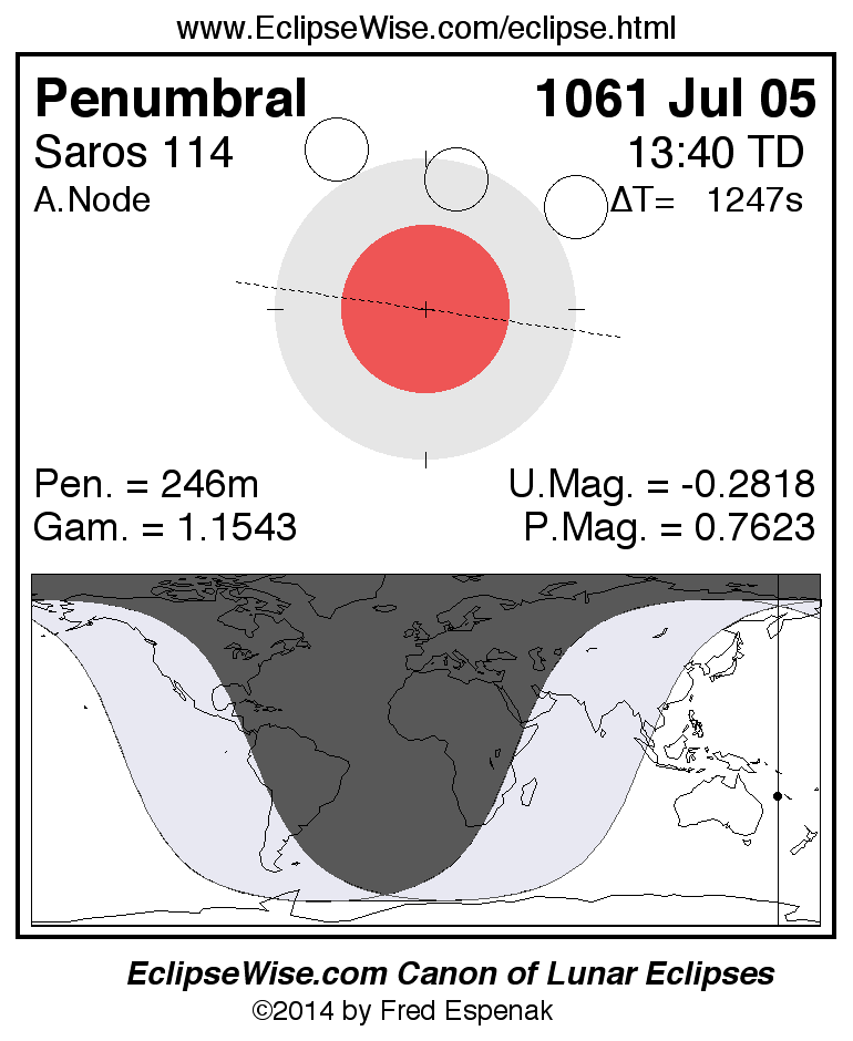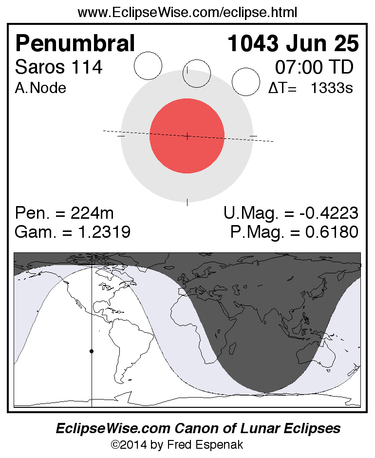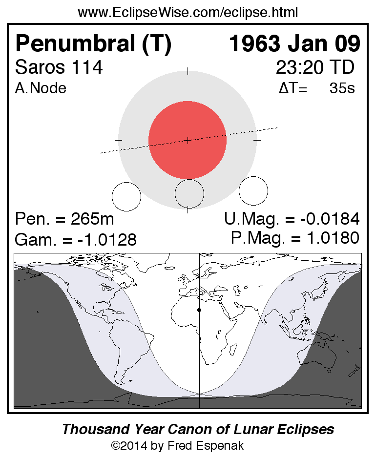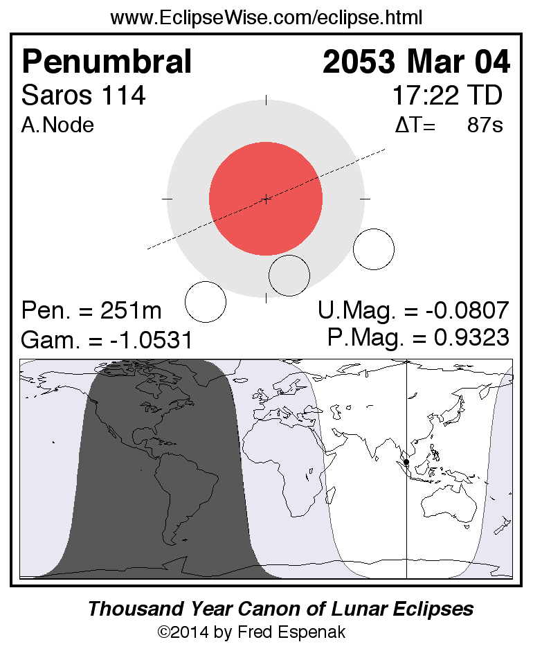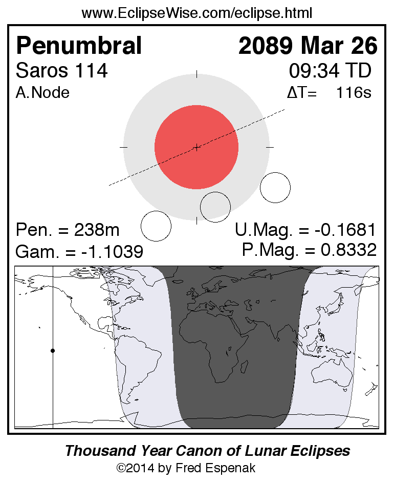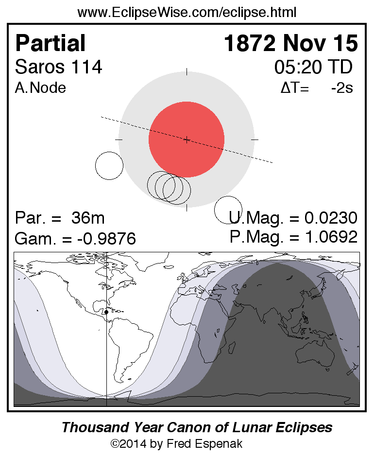 A panorama of all lunar eclipses belonging to Saros 114 is presented here. Each figure shows the Moon's path with respect to Earth's penumbral and umbral shadows. Below the path is a map depicting the geographic region of visibility for the eclipse. The date and time are given for the instant of Greatest Eclipse. Every figure serves as a hyperlink to the EclipseWise Prime page for that eclipse with a larger figure and complete details for the eclipse. Visit the Key to Lunar Eclipse Figures for a detailed explanation of these diagrams. Near the bottom of this page are a series of hyperlinks for more on lunar eclipses.