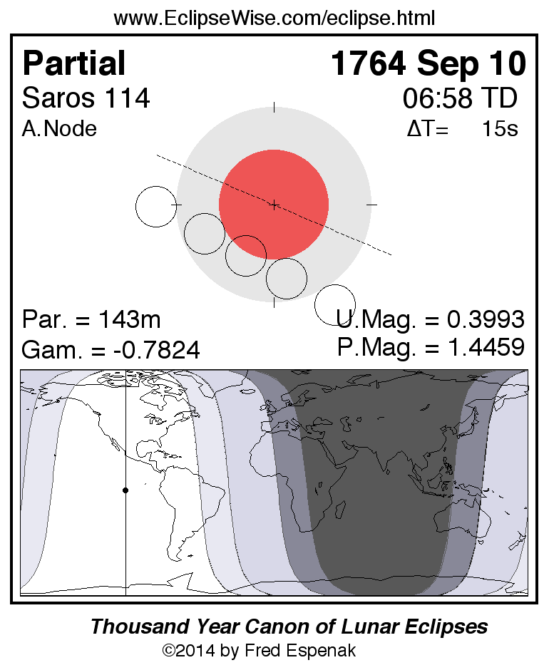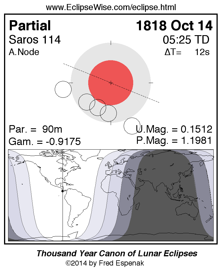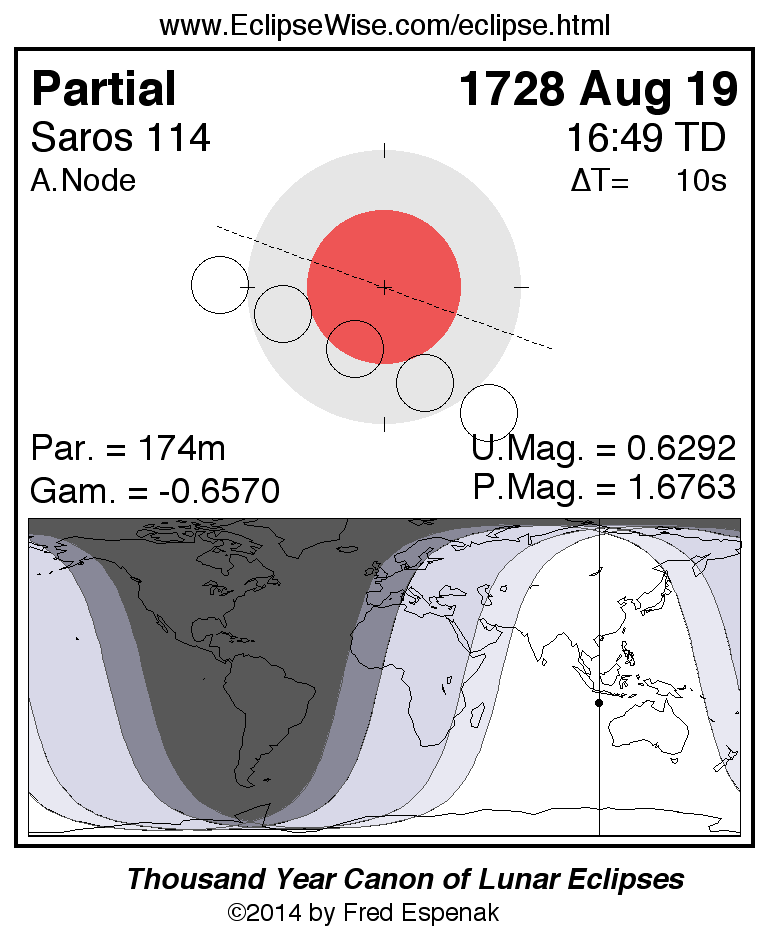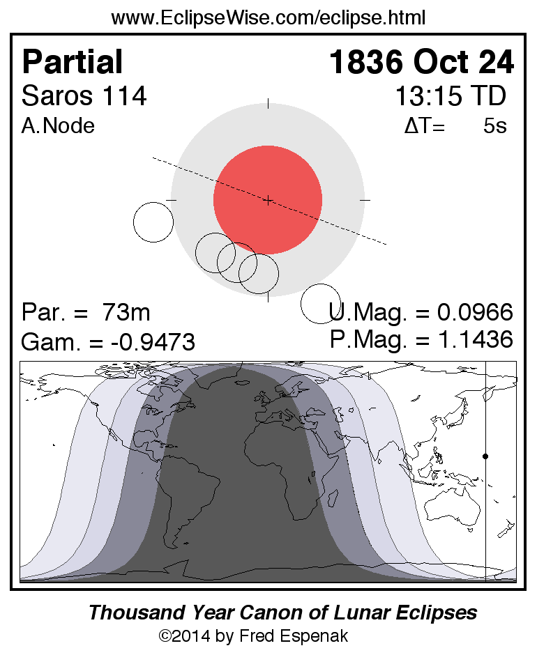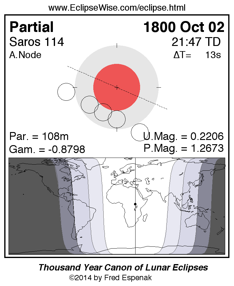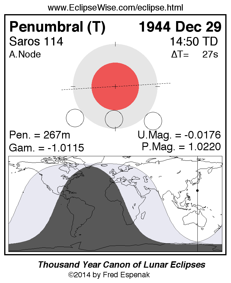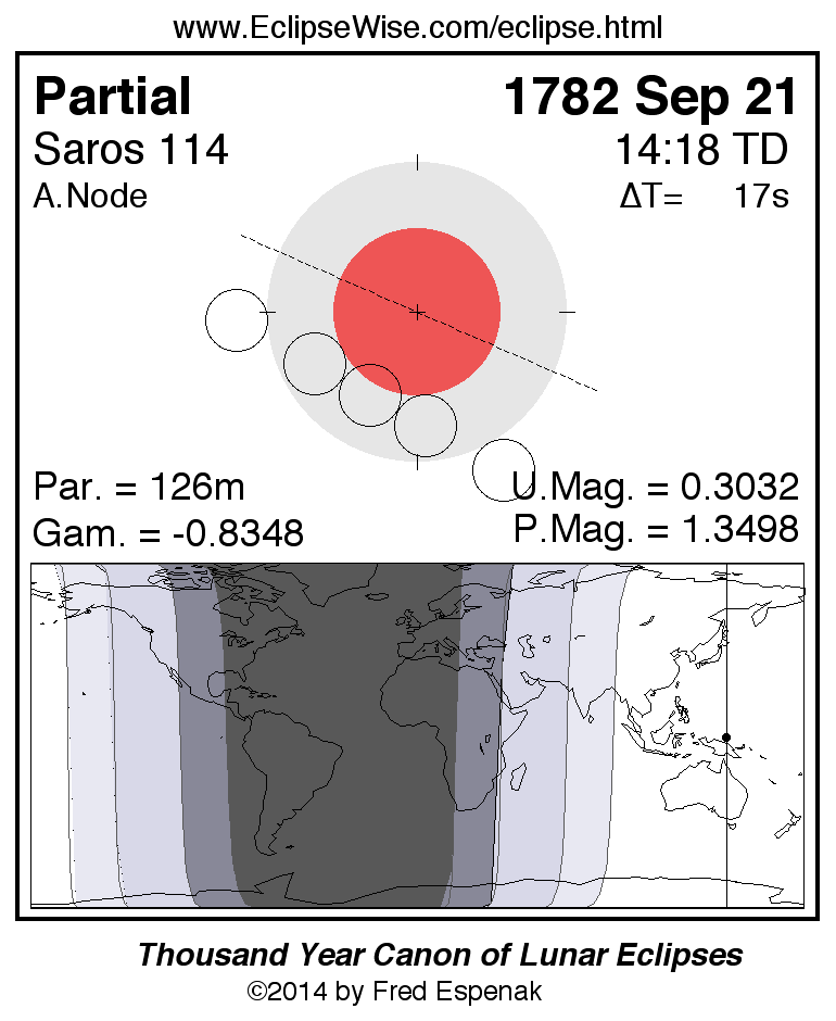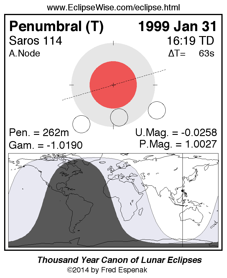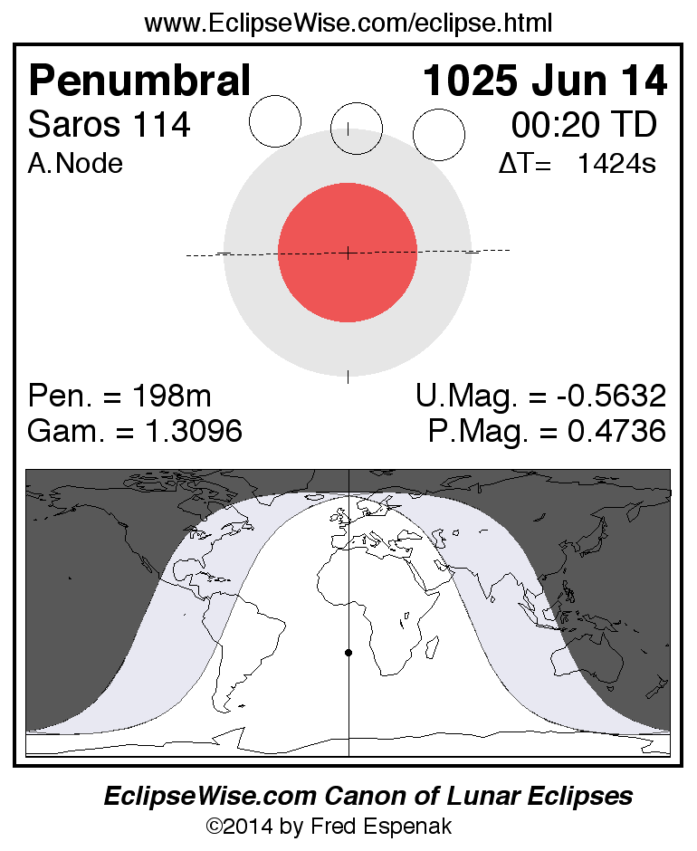 A panorama of all lunar eclipses belonging to Saros 114 is presented here. Each figure shows the Moon's path with respect to Earth's penumbral and umbral shadows. Below the path is a map depicting the geographic region of visibility for the eclipse. The date and time are given for the instant of Greatest Eclipse. Every figure serves as a hyperlink to the EclipseWise Prime page for that eclipse with a larger figure and complete details for the eclipse. Visit the Key to Lunar Eclipse Figures for a detailed explanation of these diagrams. Near the bottom of this page are a series of hyperlinks for more on lunar eclipses.