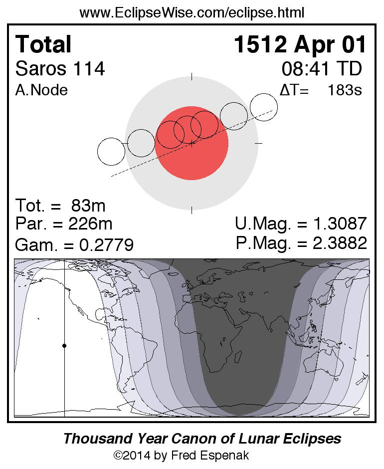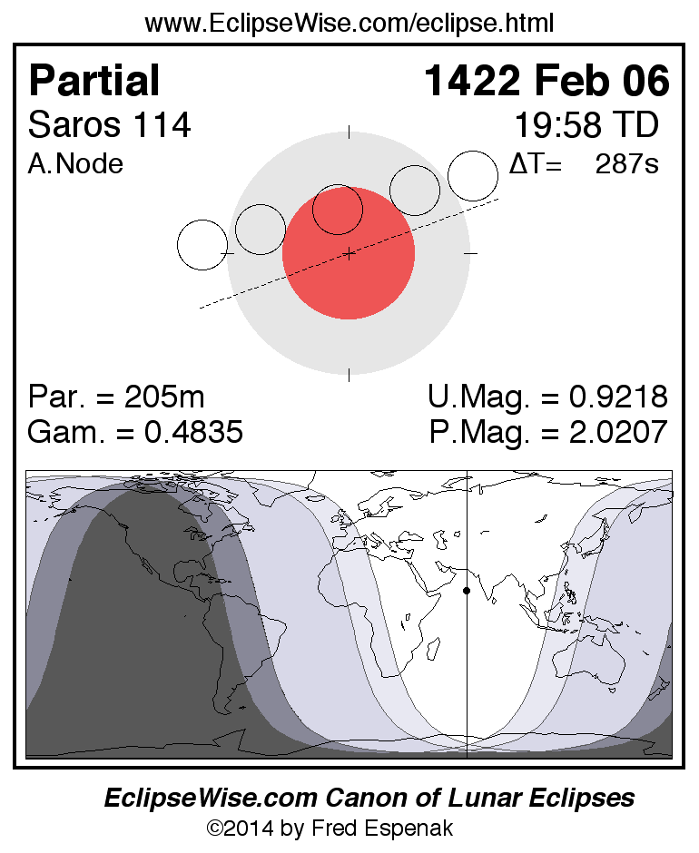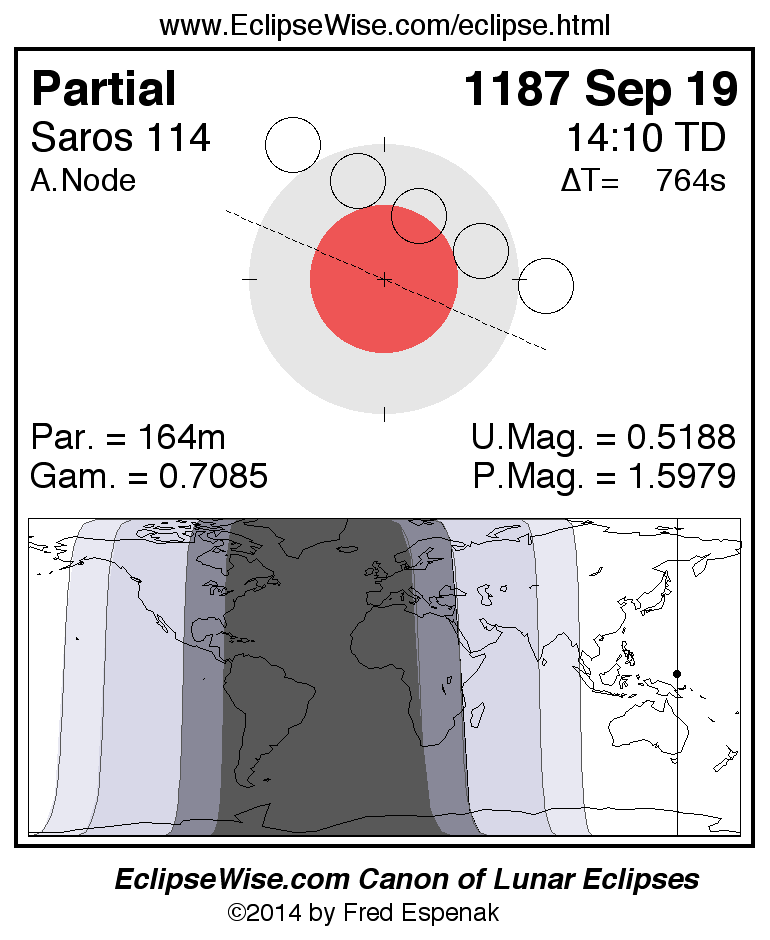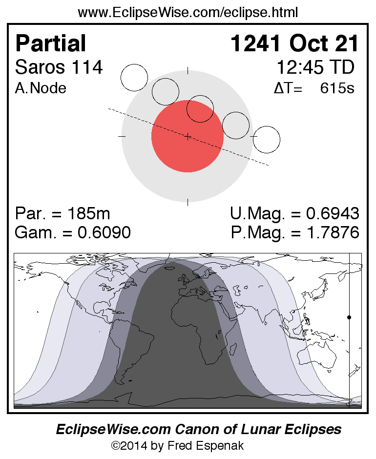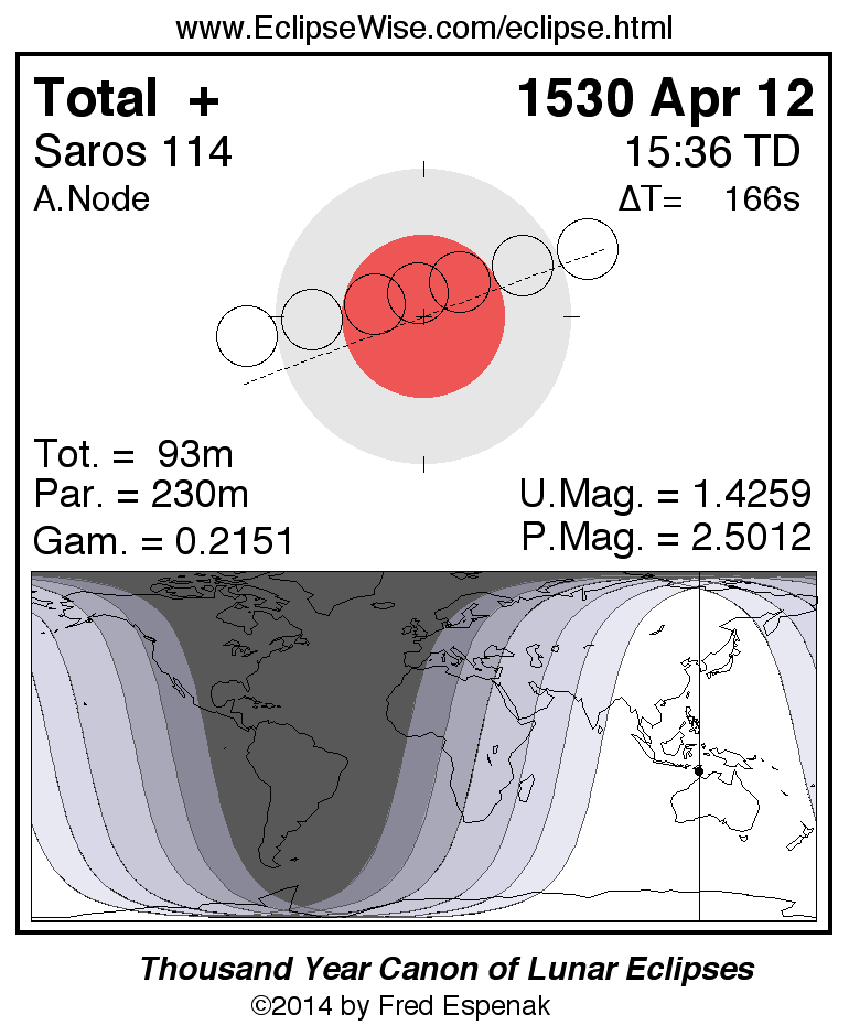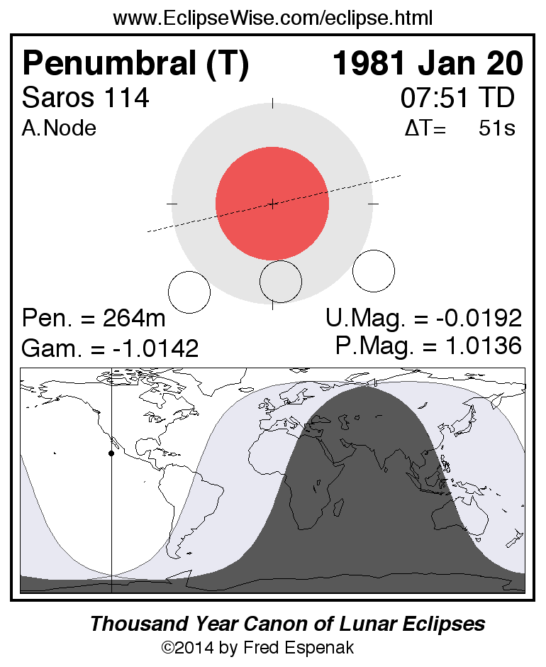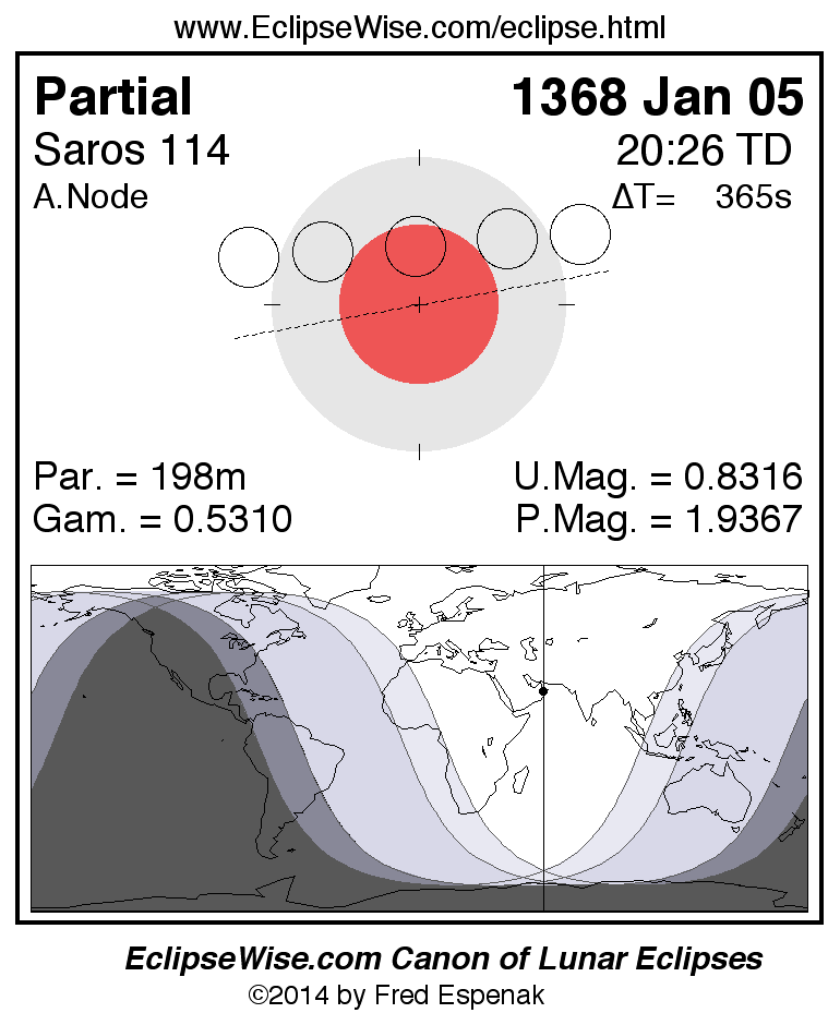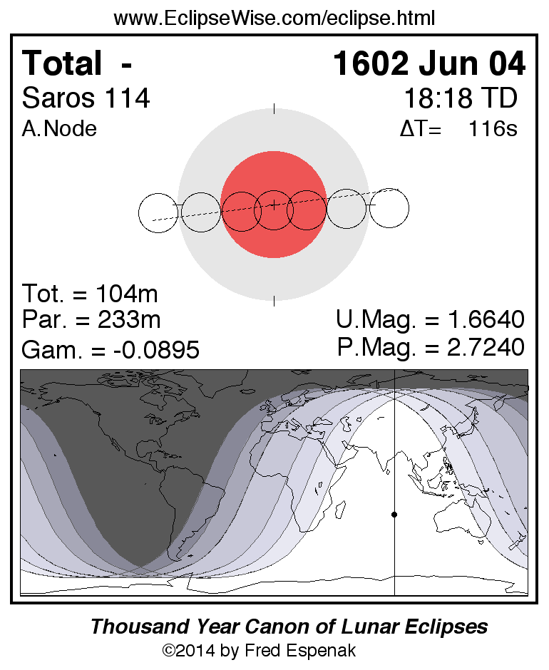 A panorama of all lunar eclipses belonging to Saros 114 is presented here. Each figure shows the Moon's path with respect to Earth's penumbral and umbral shadows. Below the path is a map depicting the geographic region of visibility for the eclipse. The date and time are given for the instant of Greatest Eclipse. Every figure serves as a hyperlink to the EclipseWise Prime page for that eclipse with a larger figure and complete details for the eclipse. Visit the Key to Lunar Eclipse Figures for a detailed explanation of these diagrams. Near the bottom of this page are a series of hyperlinks for more on lunar eclipses.