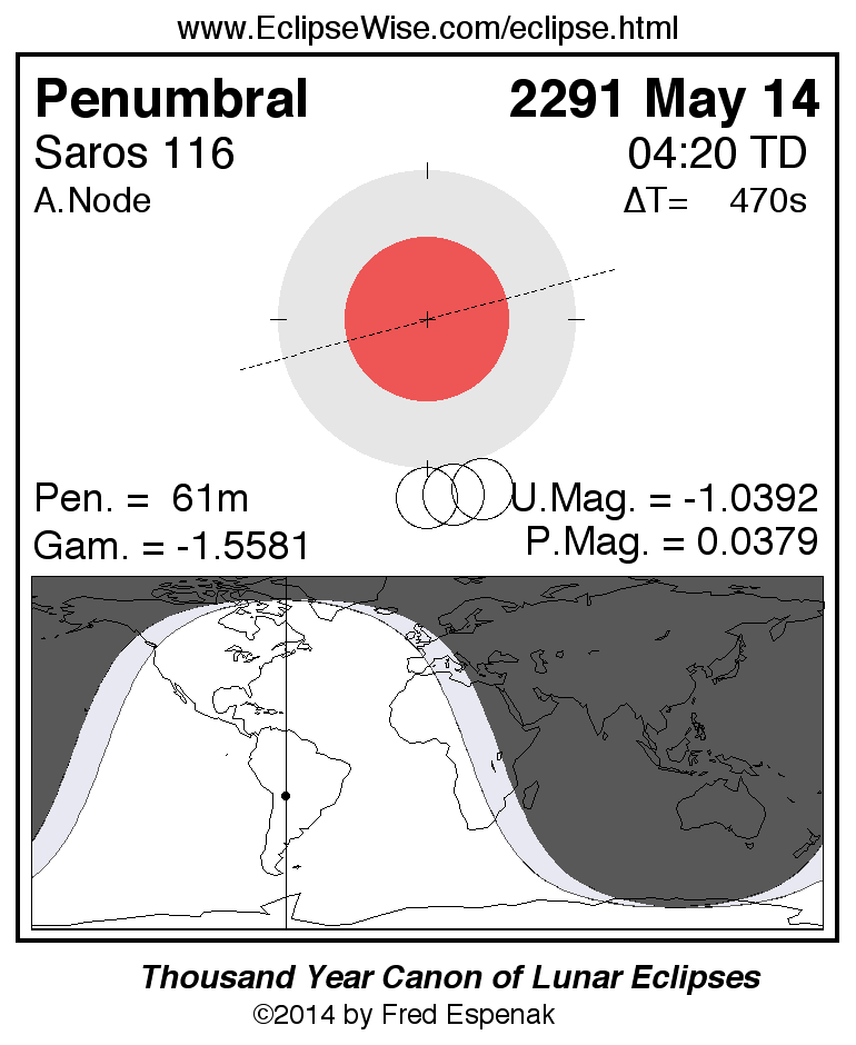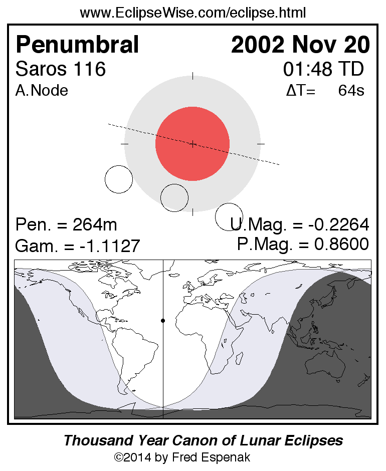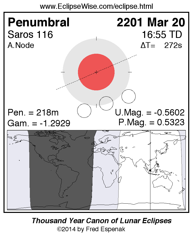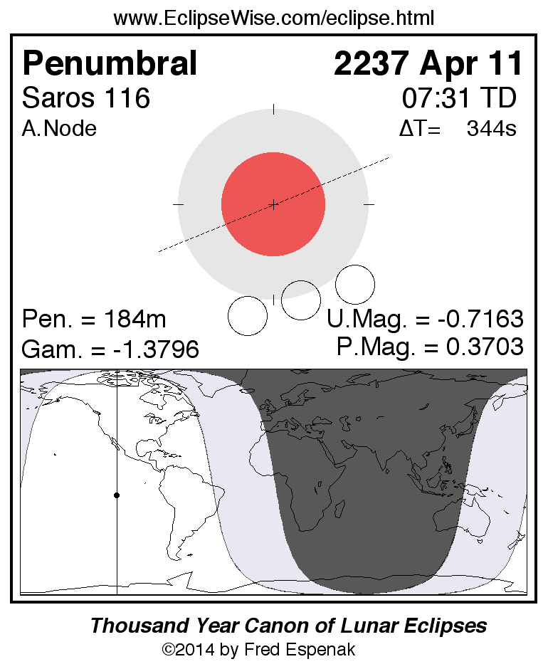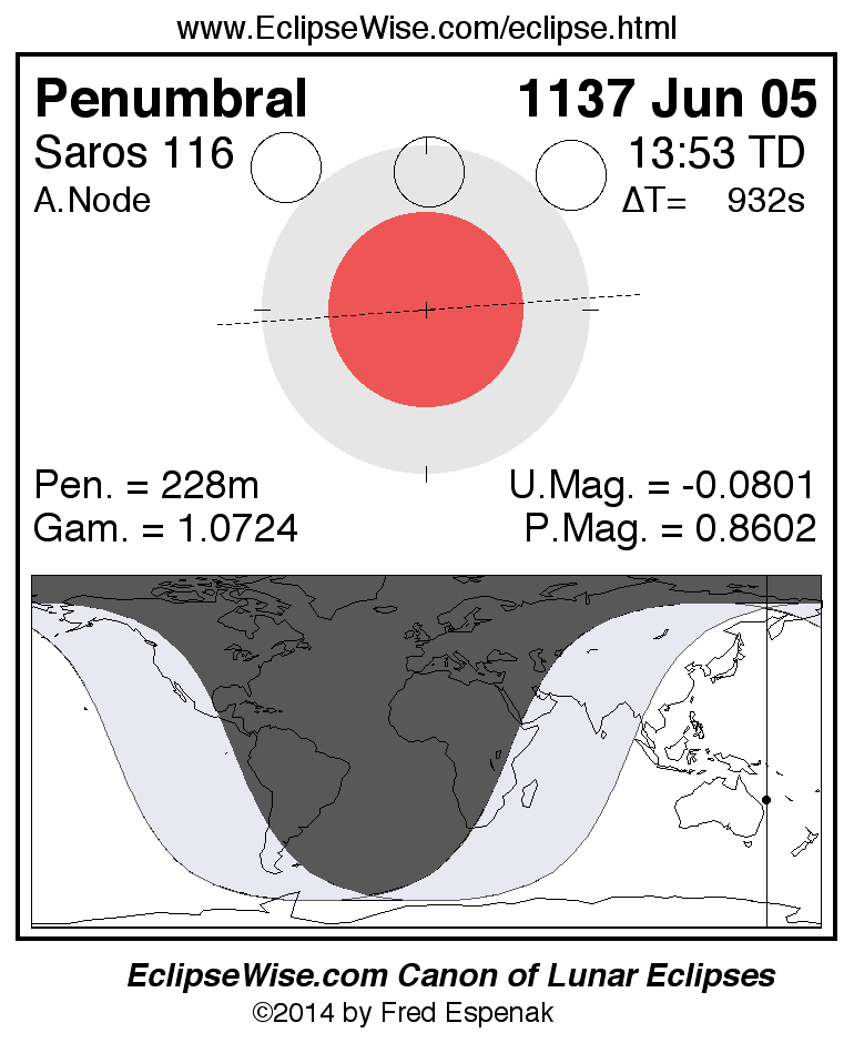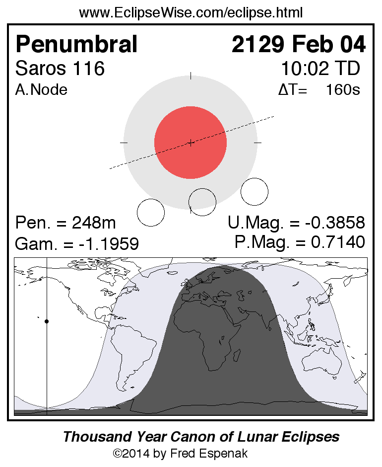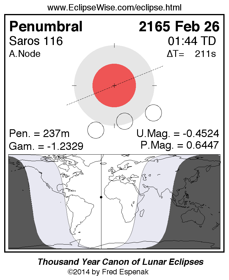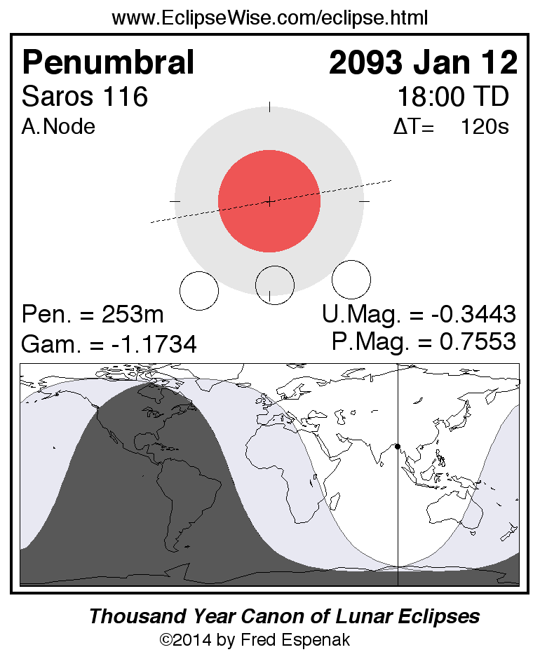 A panorama of all lunar eclipses belonging to Saros 116 is presented here. Each figure shows the Moon's path with respect to Earth's penumbral and umbral shadows. Below the path is a map depicting the geographic region of visibility for the eclipse. The date and time are given for the instant of Greatest Eclipse. Every figure serves as a hyperlink to the EclipseWise Prime page for that eclipse with a larger figure and complete details for the eclipse. Visit the Key to Lunar Eclipse Figures for a detailed explanation of these diagrams. Near the bottom of this page are a series of hyperlinks for more on lunar eclipses.
