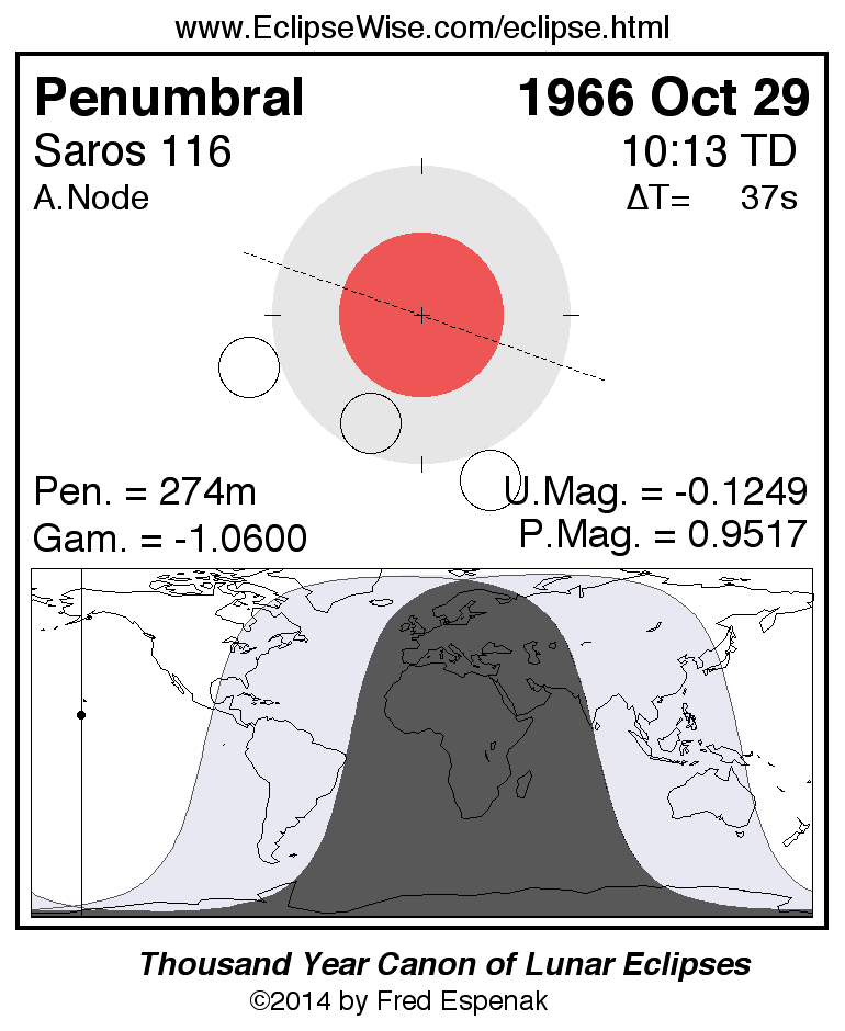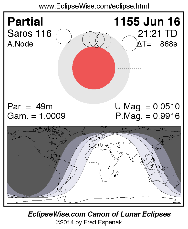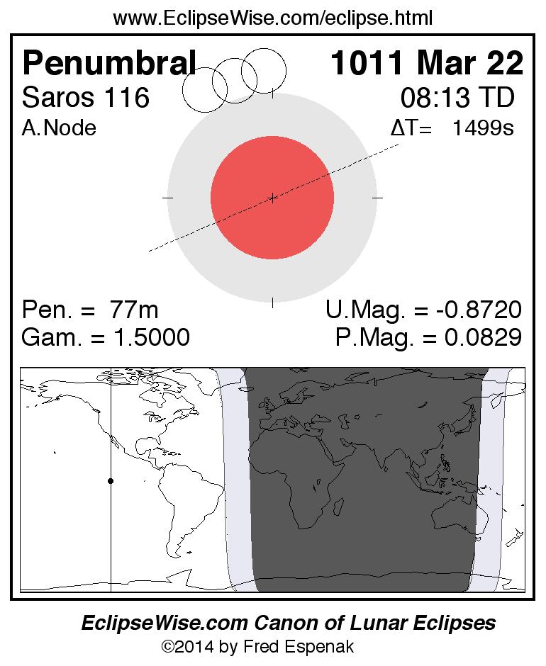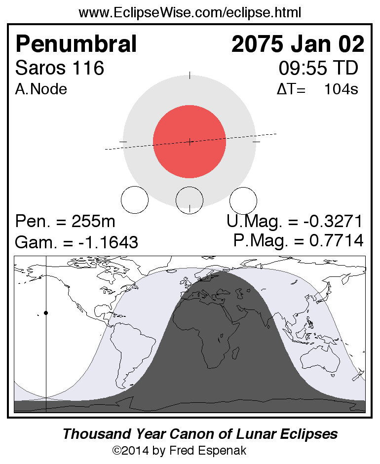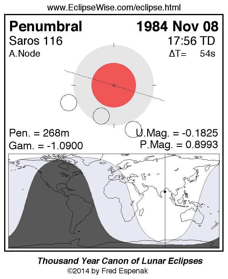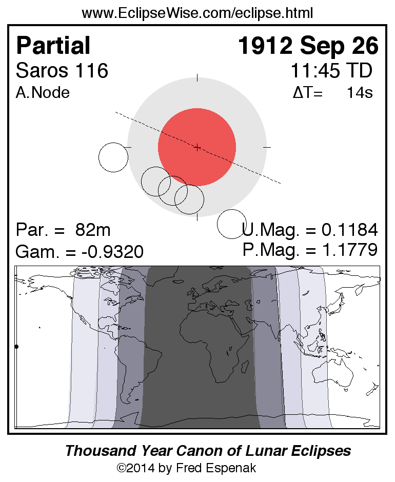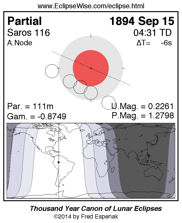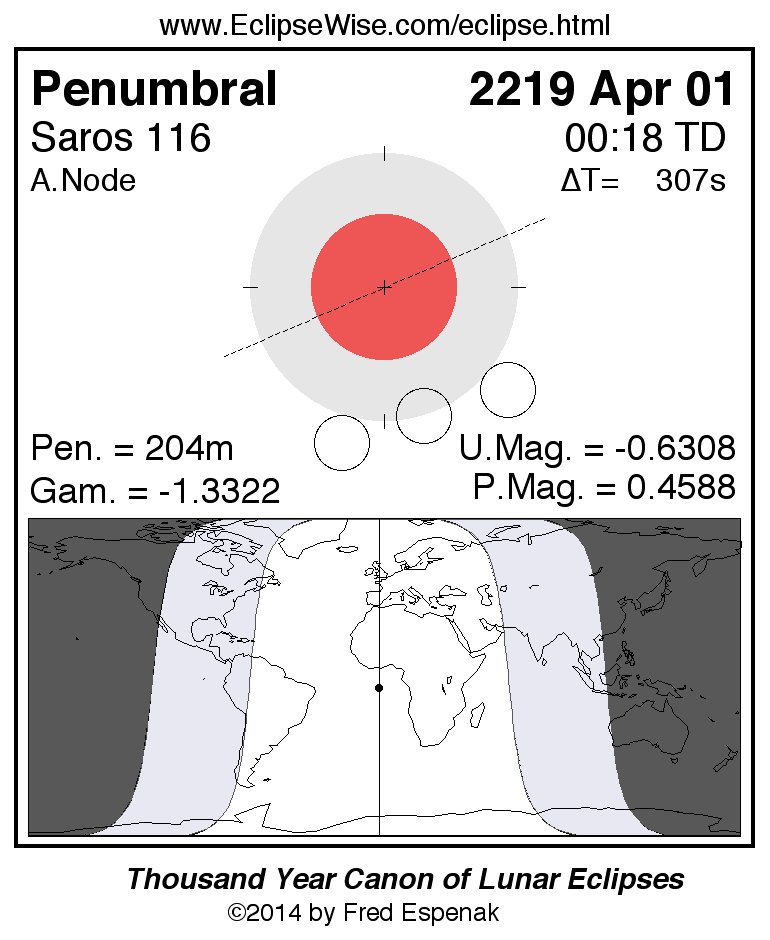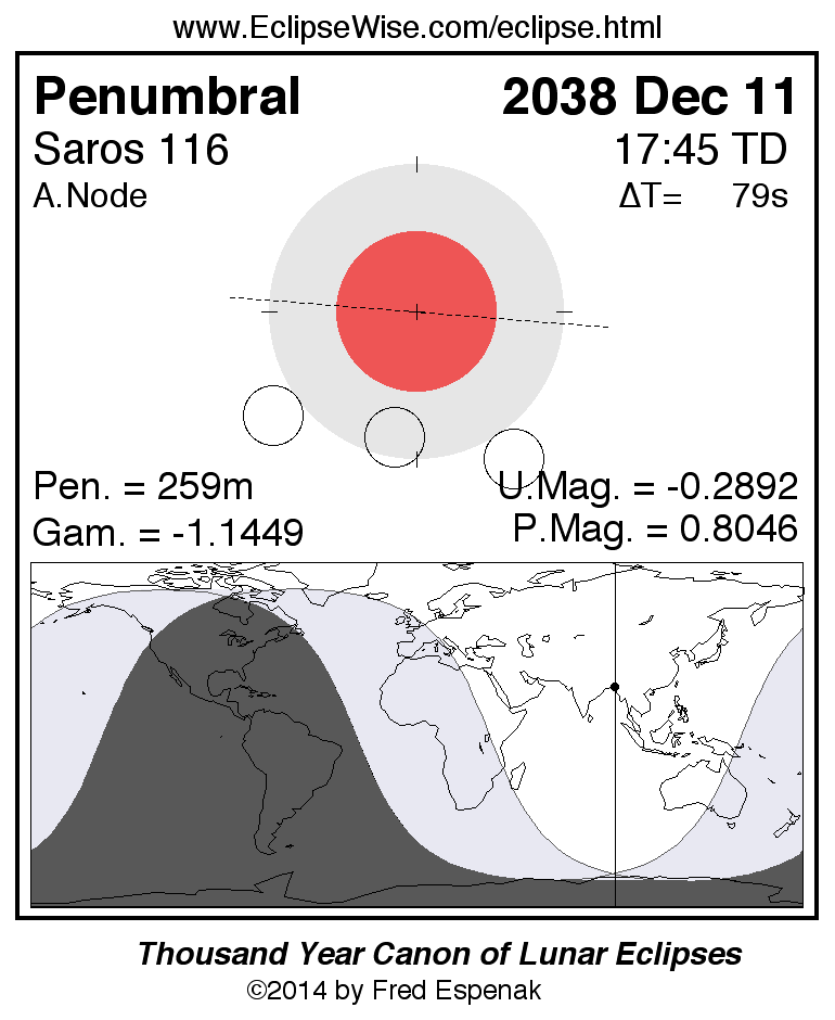 A panorama of all lunar eclipses belonging to Saros 116 is presented here. Each figure shows the Moon's path with respect to Earth's penumbral and umbral shadows. Below the path is a map depicting the geographic region of visibility for the eclipse. The date and time are given for the instant of Greatest Eclipse. Every figure serves as a hyperlink to the EclipseWise Prime page for that eclipse with a larger figure and complete details for the eclipse. Visit the Key to Lunar Eclipse Figures for a detailed explanation of these diagrams. Near the bottom of this page are a series of hyperlinks for more on lunar eclipses.