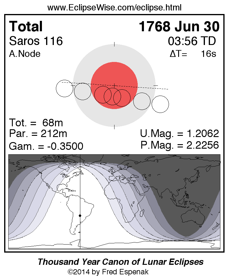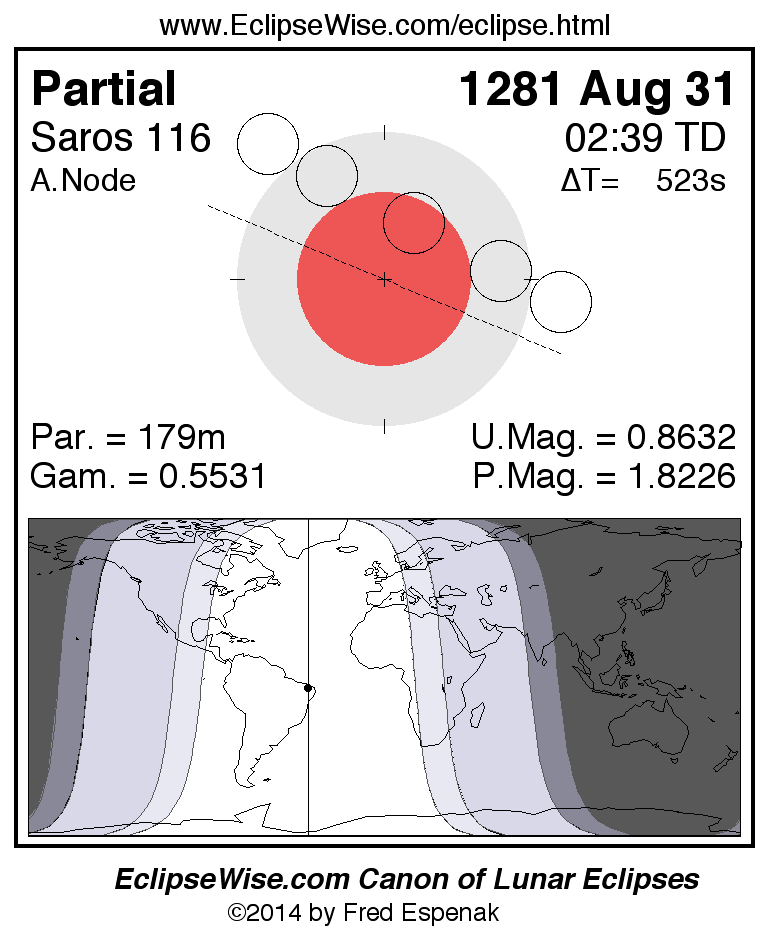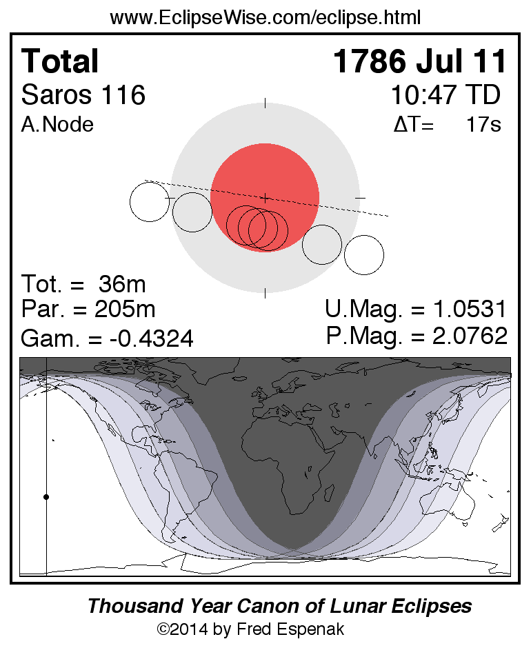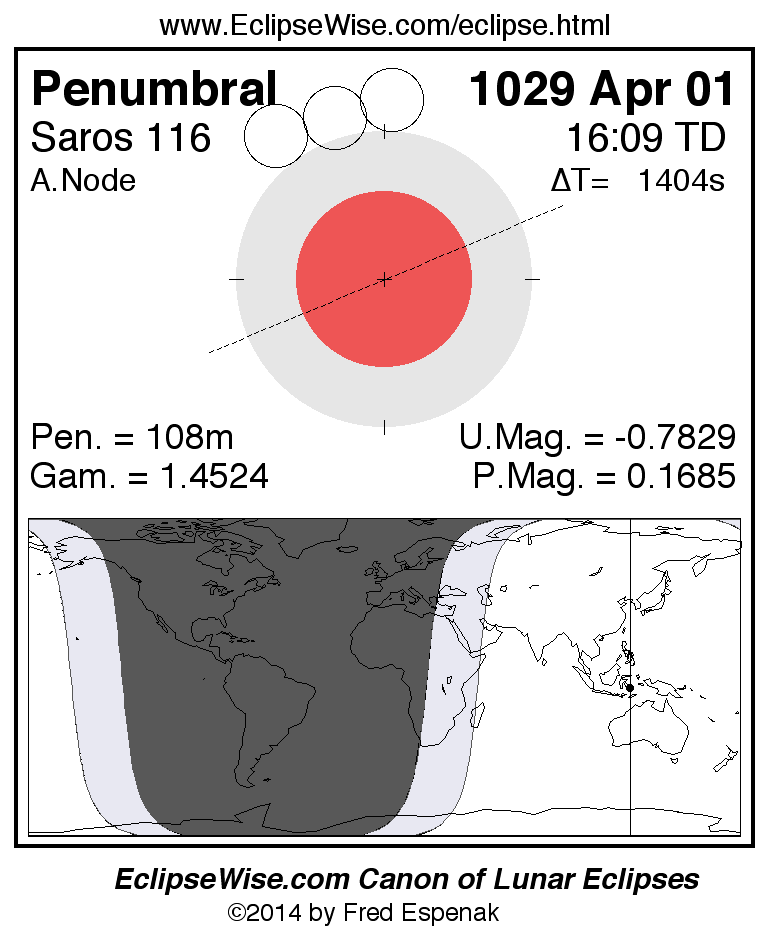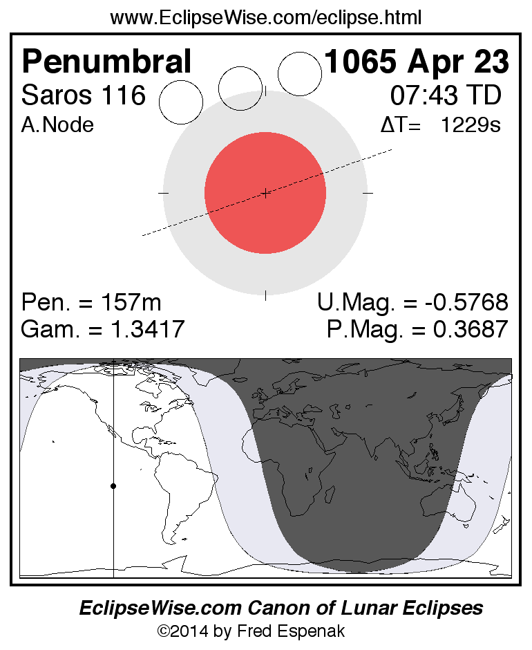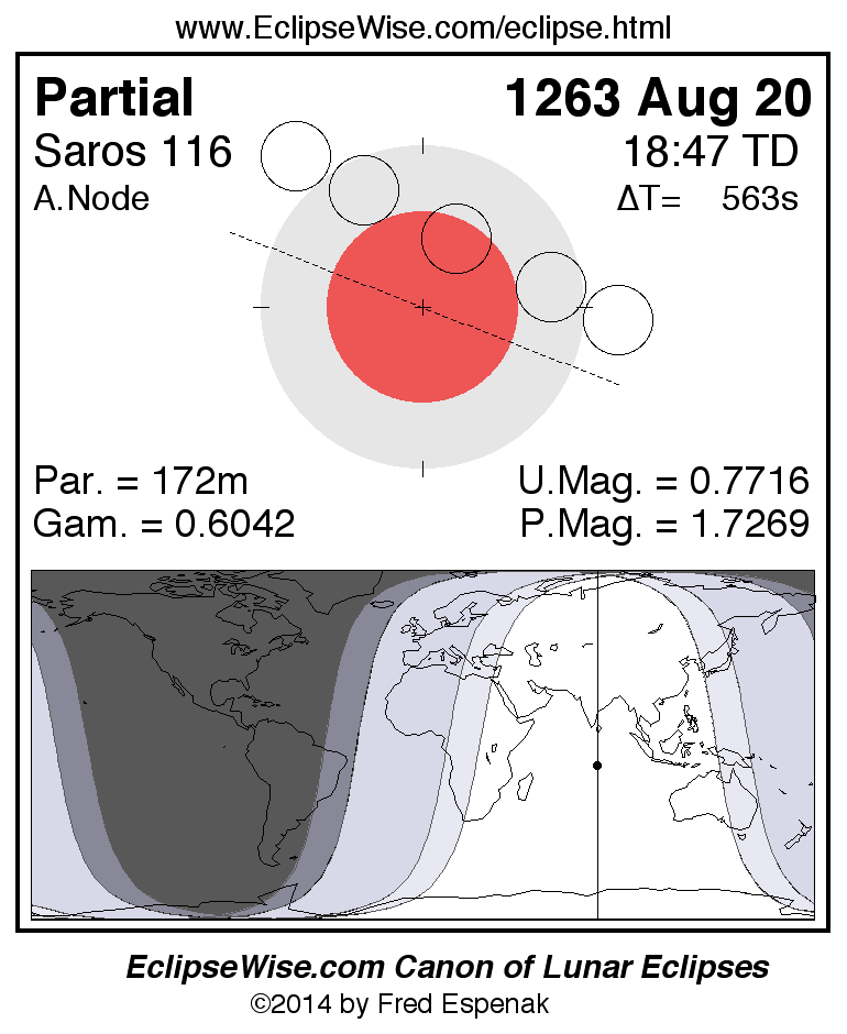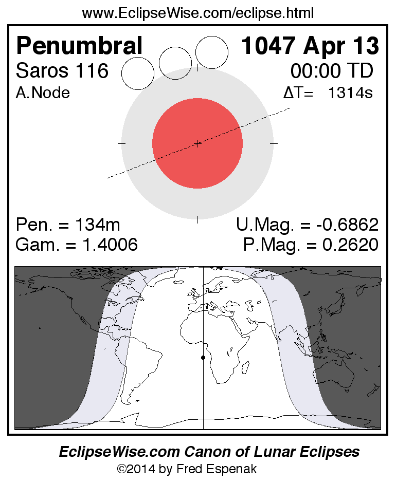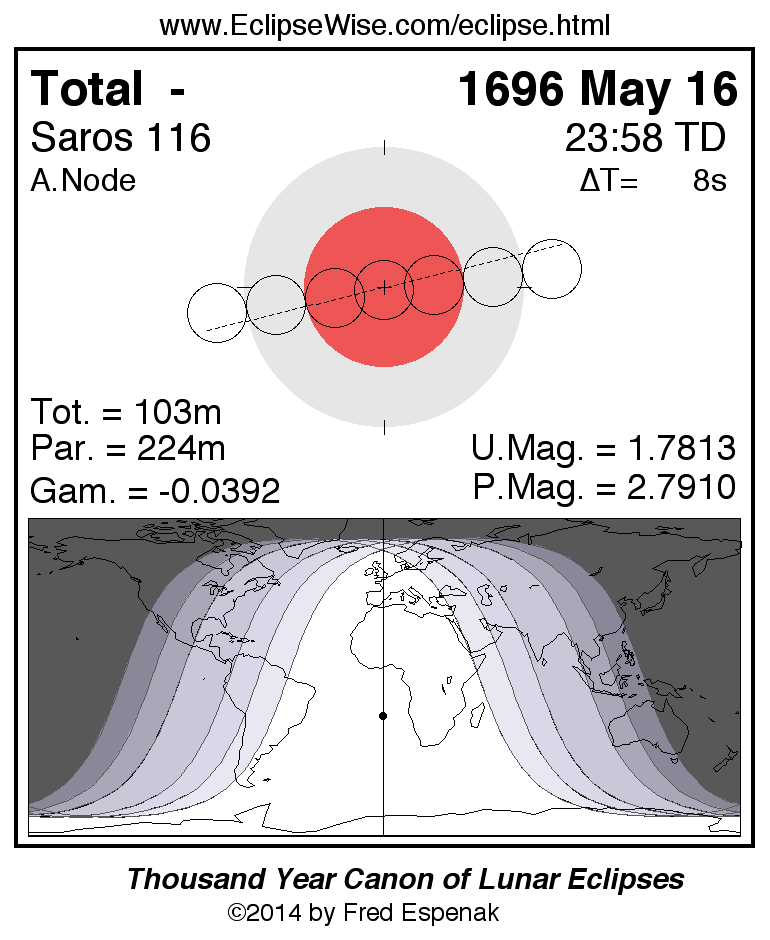 A panorama of all lunar eclipses belonging to Saros 116 is presented here. Each figure shows the Moon's path with respect to Earth's penumbral and umbral shadows. Below the path is a map depicting the geographic region of visibility for the eclipse. The date and time are given for the instant of Greatest Eclipse. Every figure serves as a hyperlink to the EclipseWise Prime page for that eclipse with a larger figure and complete details for the eclipse. Visit the Key to Lunar Eclipse Figures for a detailed explanation of these diagrams. Near the bottom of this page are a series of hyperlinks for more on lunar eclipses.