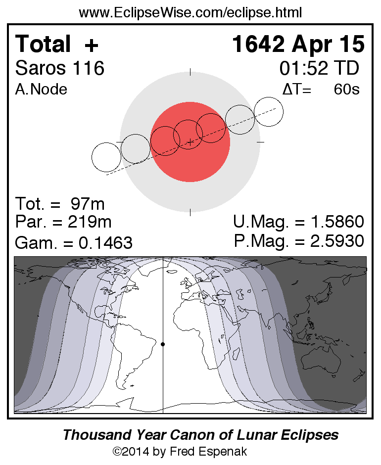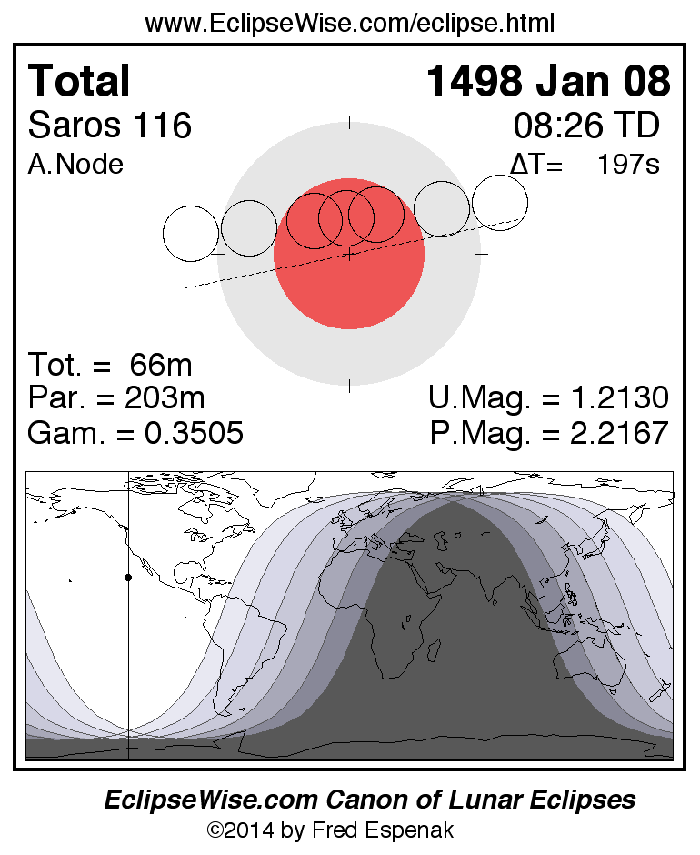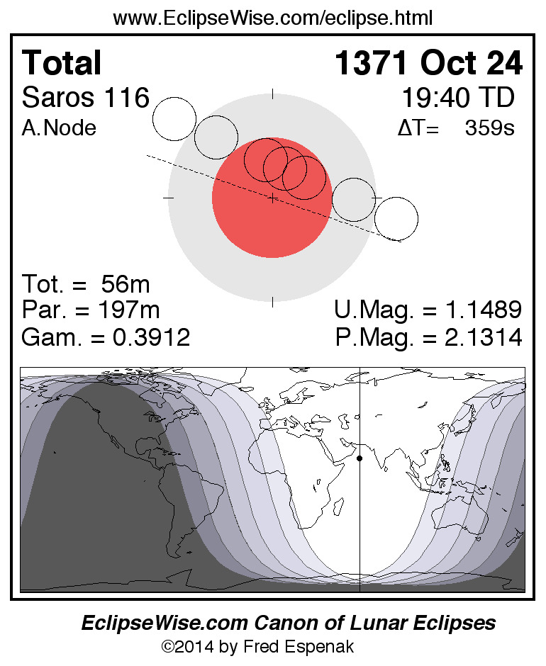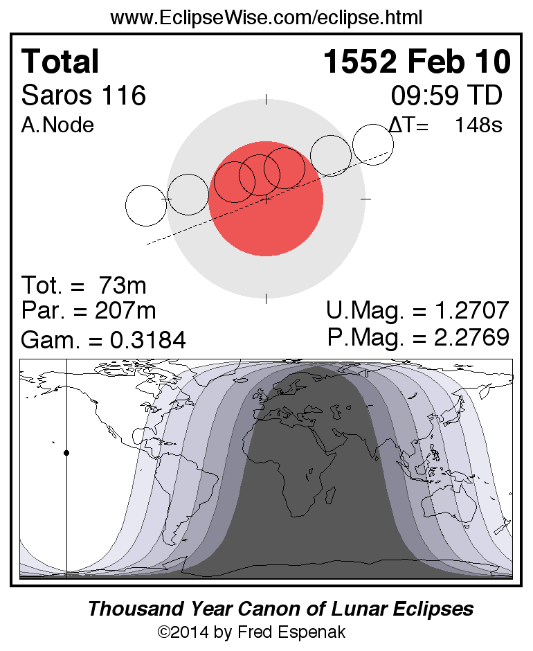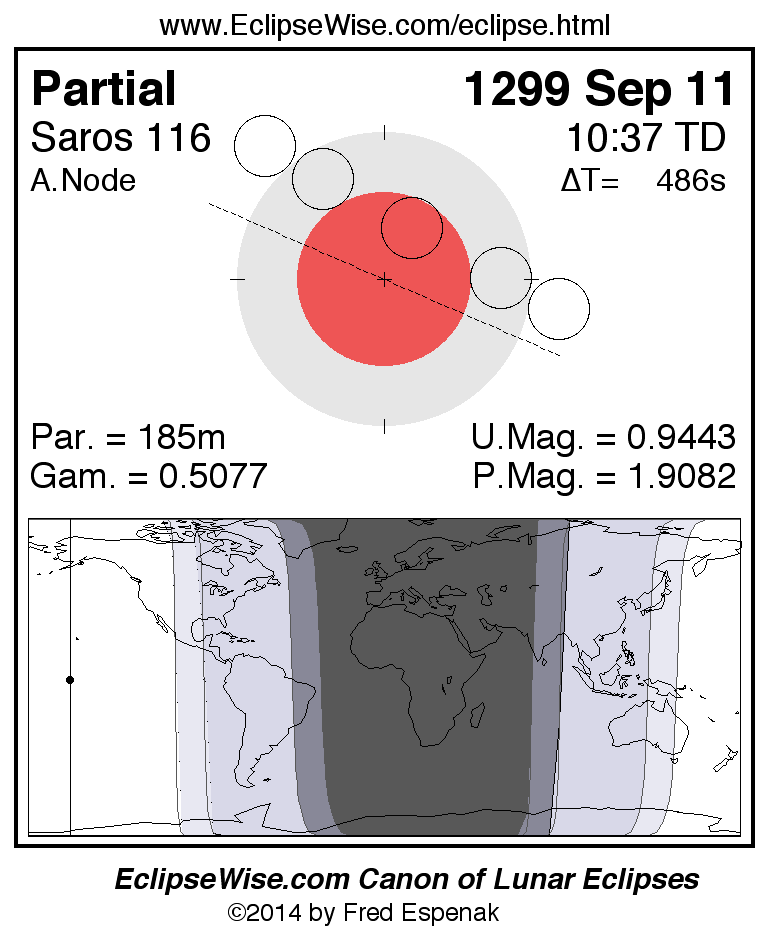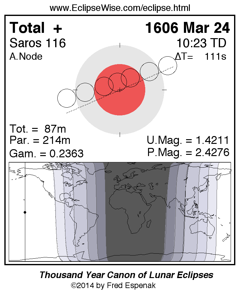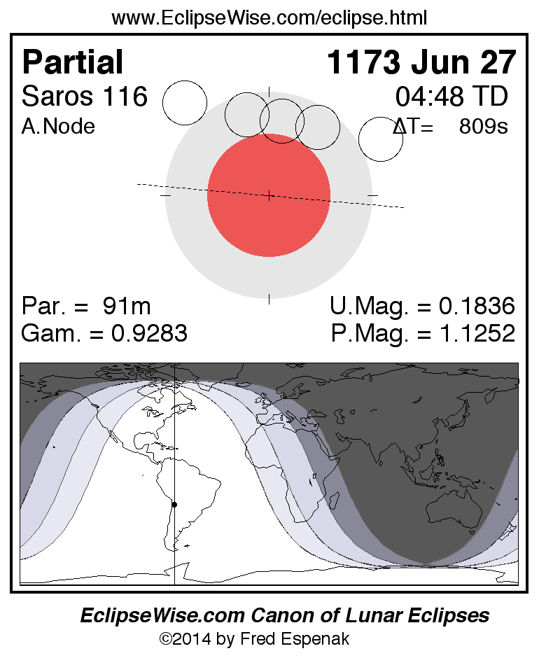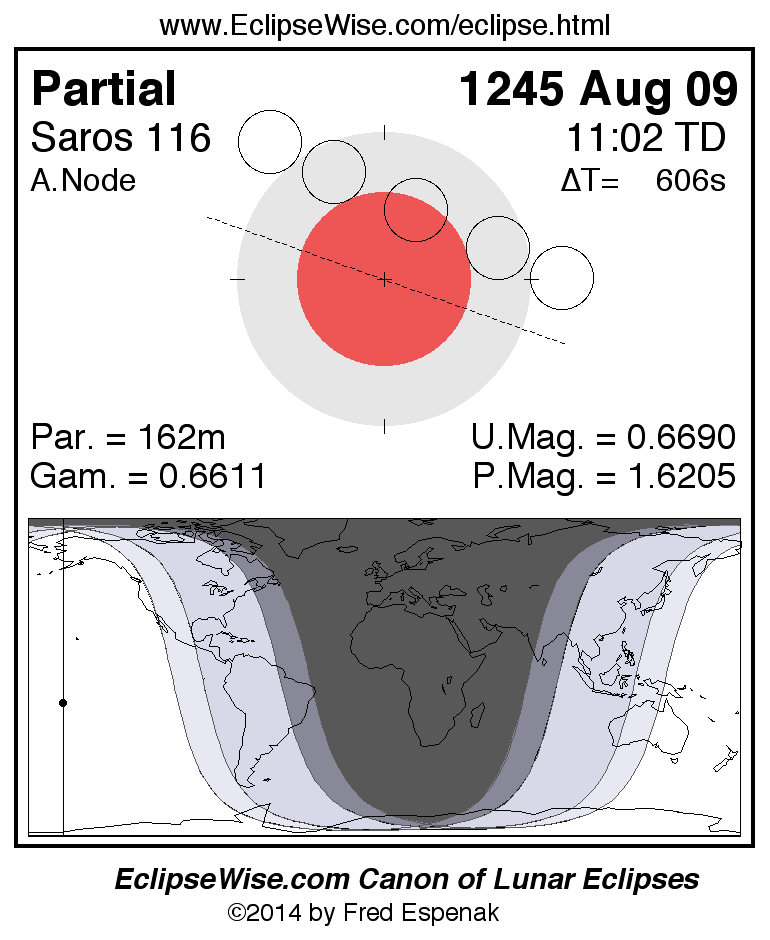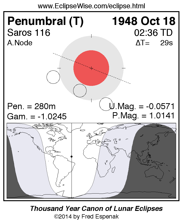 A panorama of all lunar eclipses belonging to Saros 116 is presented here. Each figure shows the Moon's path with respect to Earth's penumbral and umbral shadows. Below the path is a map depicting the geographic region of visibility for the eclipse. The date and time are given for the instant of Greatest Eclipse. Every figure serves as a hyperlink to the EclipseWise Prime page for that eclipse with a larger figure and complete details for the eclipse. Visit the Key to Lunar Eclipse Figures for a detailed explanation of these diagrams. Near the bottom of this page are a series of hyperlinks for more on lunar eclipses.