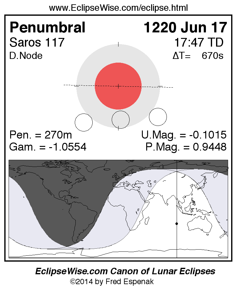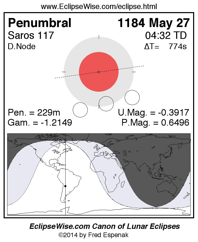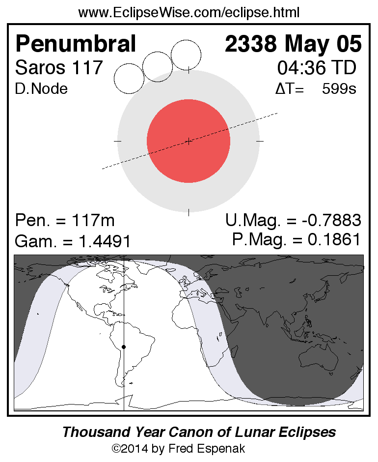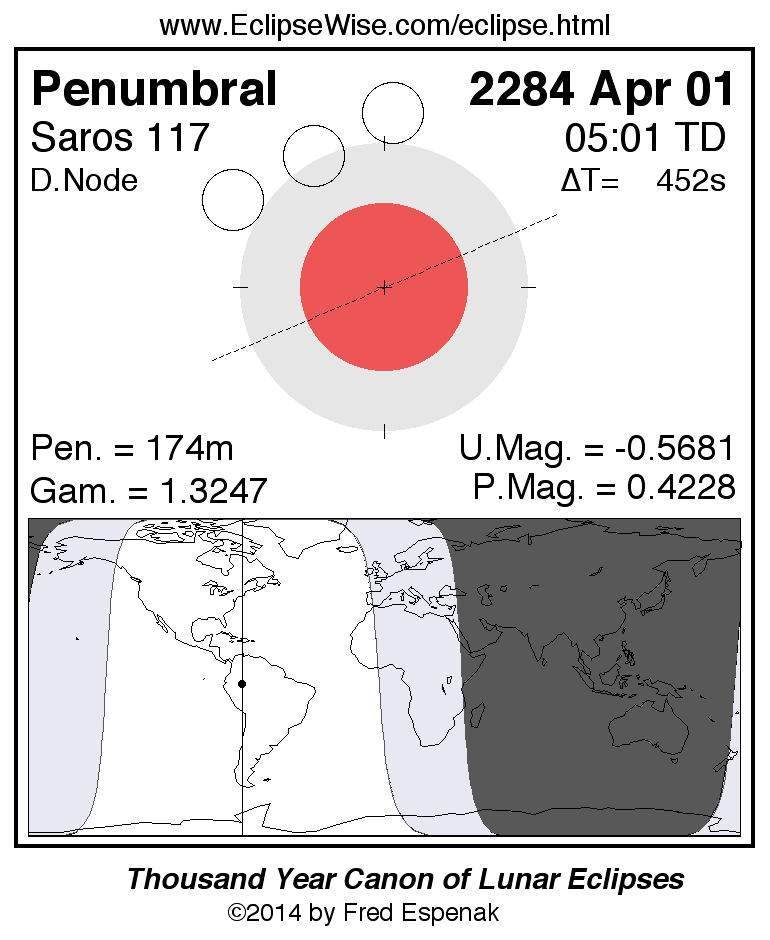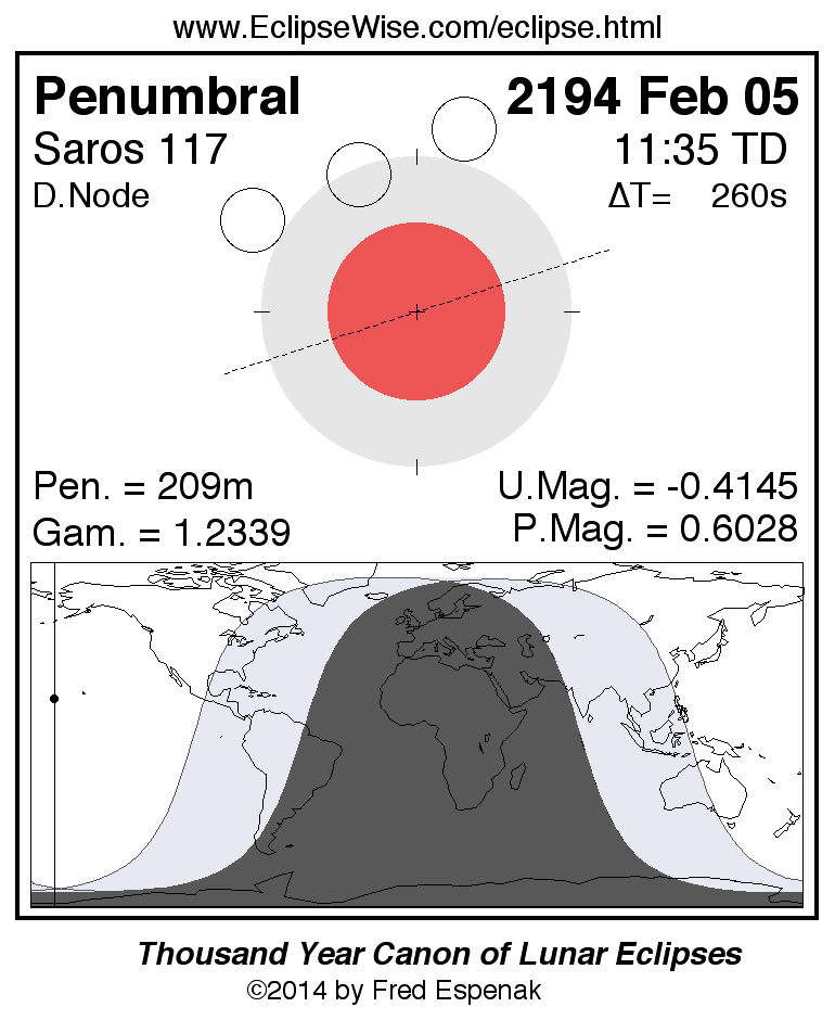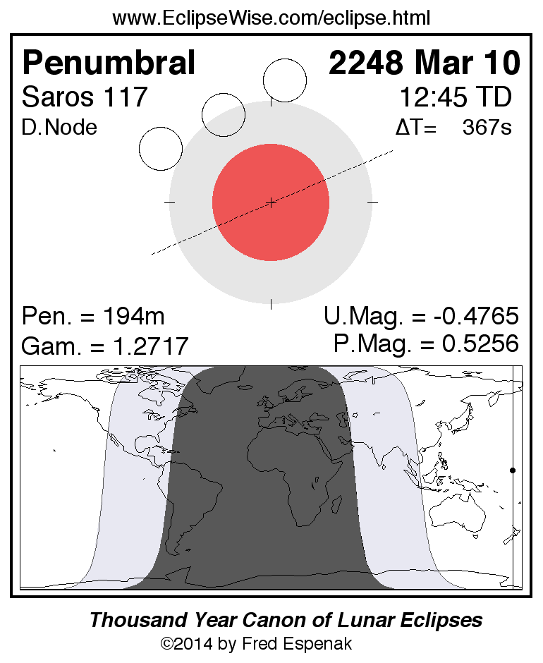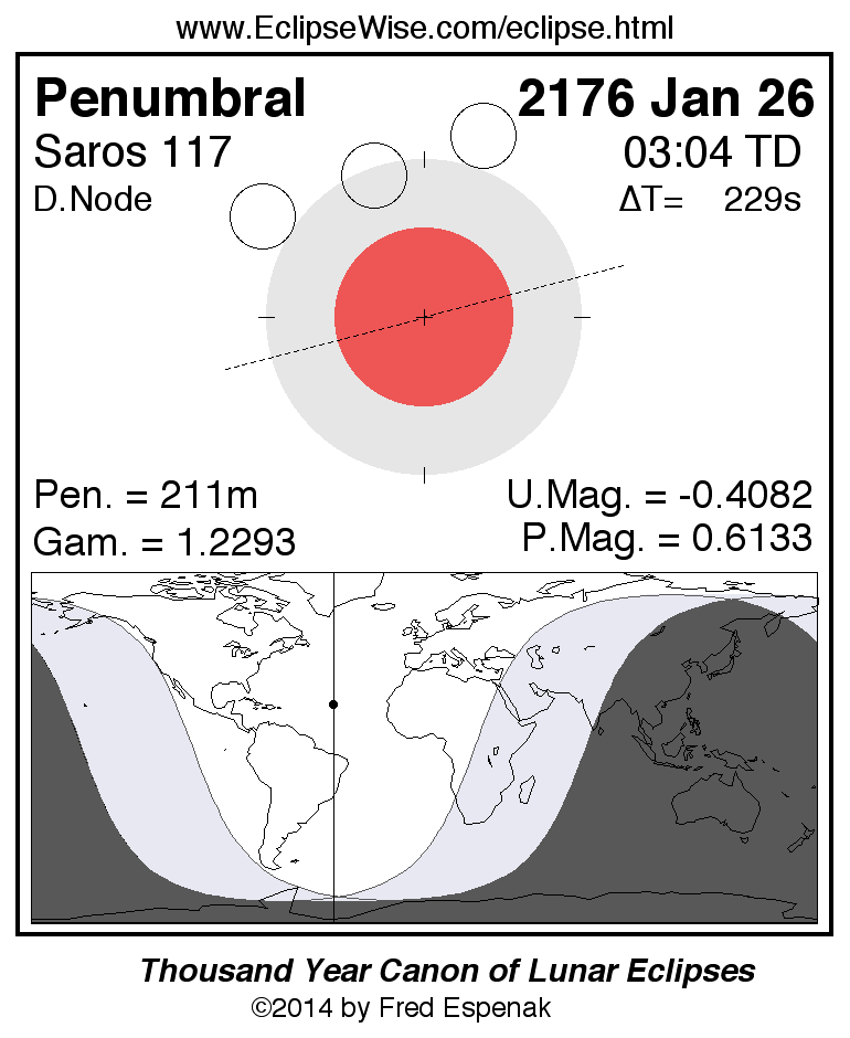 A panorama of all lunar eclipses belonging to Saros 117 is presented here. Each figure shows the Moon's path with respect to Earth's penumbral and umbral shadows. Below the path is a map depicting the geographic region of visibility for the eclipse. The date and time are given for the instant of Greatest Eclipse. Every figure serves as a hyperlink to the EclipseWise Prime page for that eclipse with a larger figure and complete details for the eclipse. Visit the Key to Lunar Eclipse Figures for a detailed explanation of these diagrams. Near the bottom of this page are a series of hyperlinks for more on lunar eclipses.