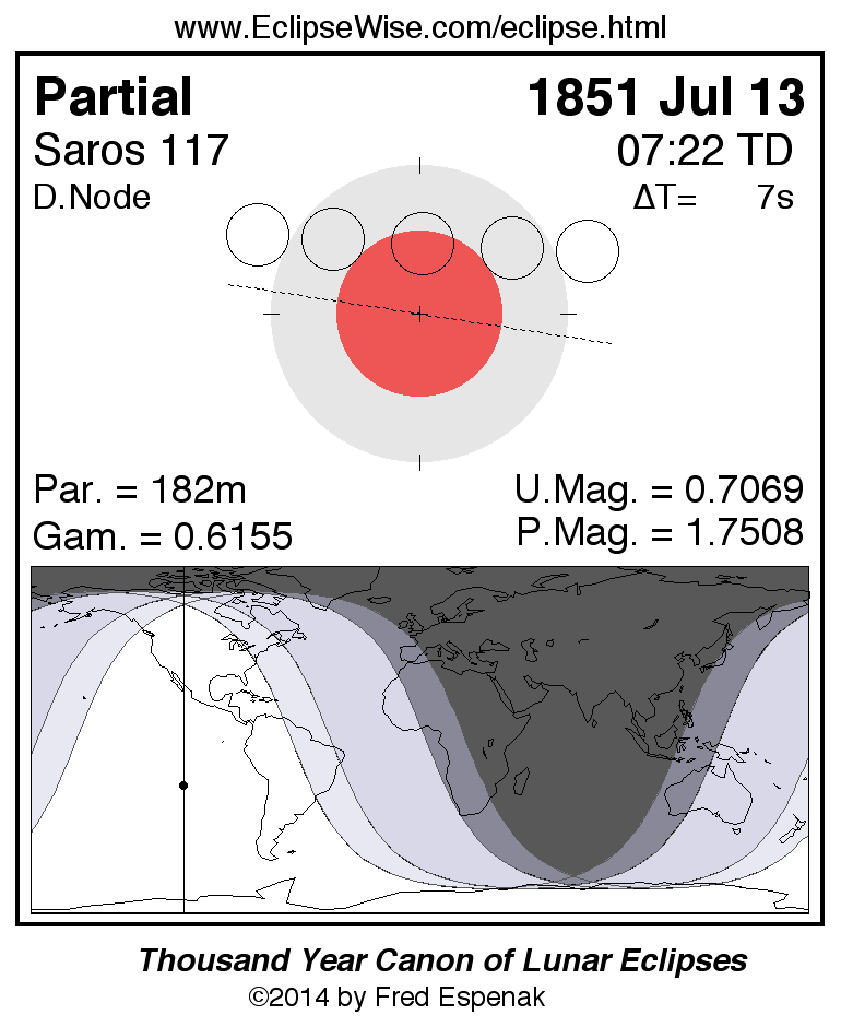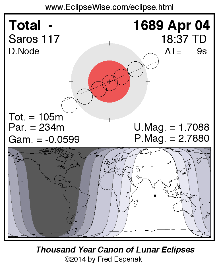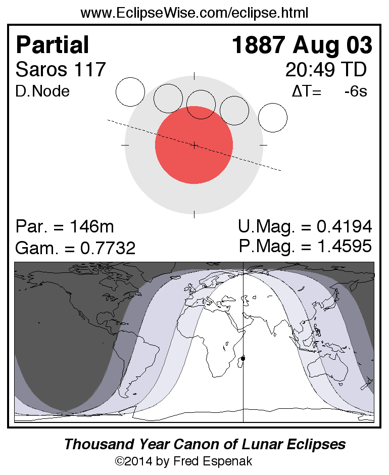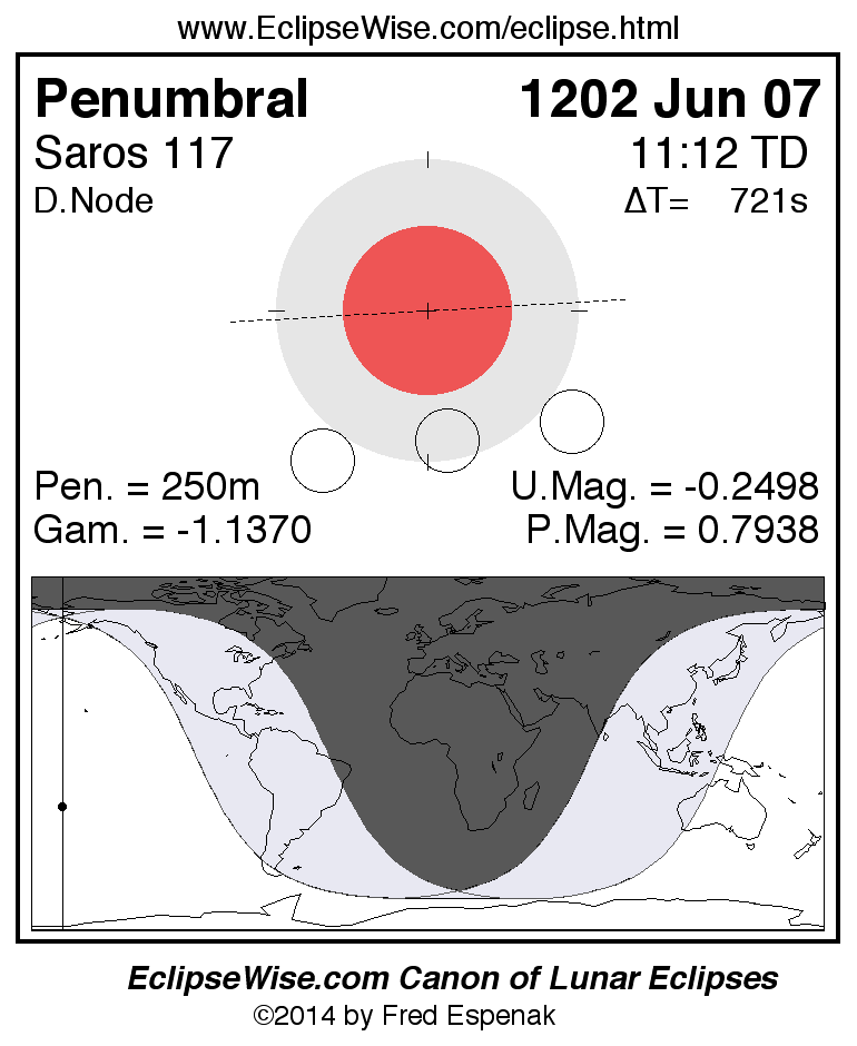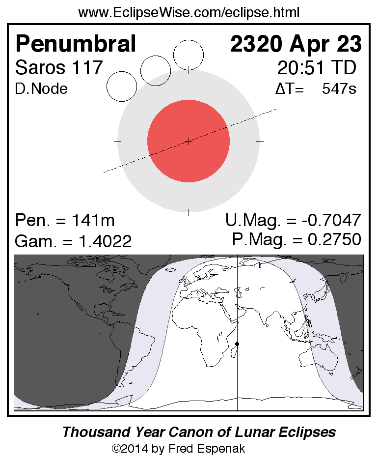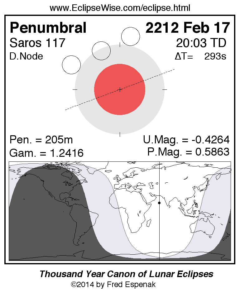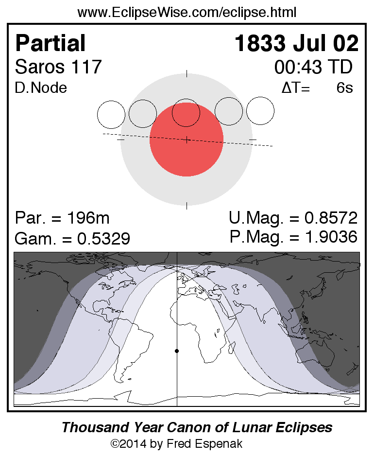 A panorama of all lunar eclipses belonging to Saros 117 is presented here. Each figure shows the Moon's path with respect to Earth's penumbral and umbral shadows. Below the path is a map depicting the geographic region of visibility for the eclipse. The date and time are given for the instant of Greatest Eclipse. Every figure serves as a hyperlink to the EclipseWise Prime page for that eclipse with a larger figure and complete details for the eclipse. Visit the Key to Lunar Eclipse Figures for a detailed explanation of these diagrams. Near the bottom of this page are a series of hyperlinks for more on lunar eclipses.