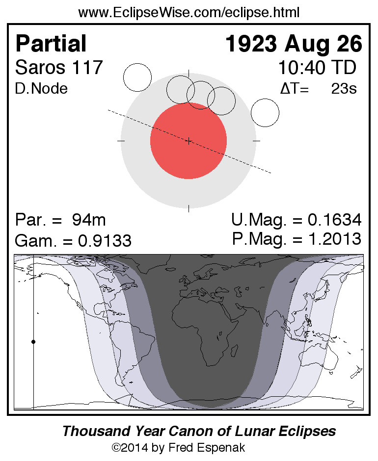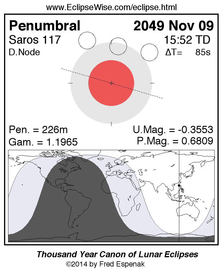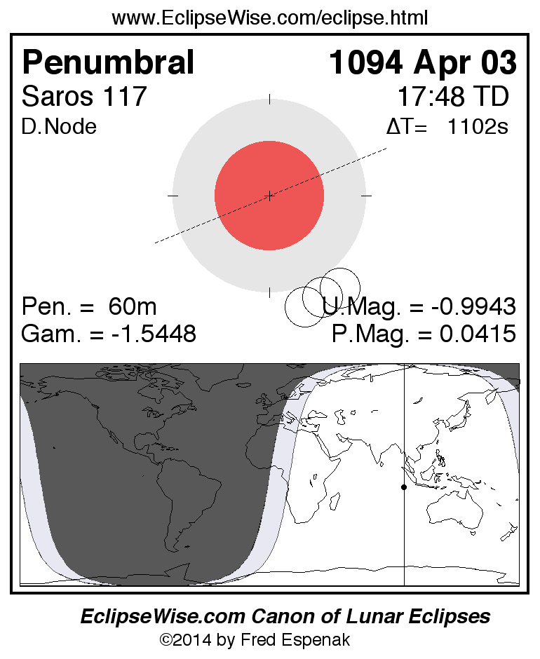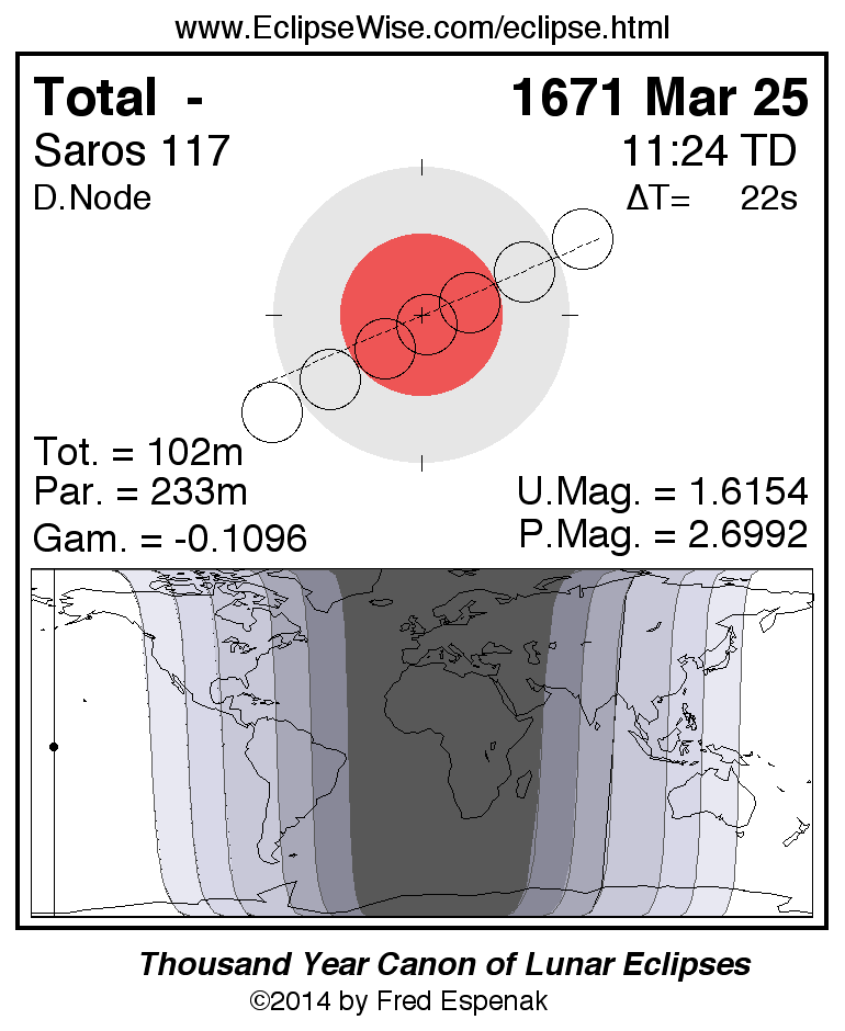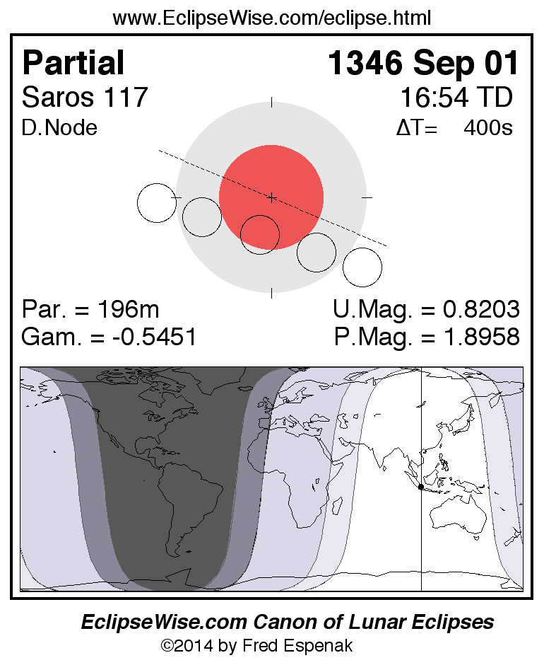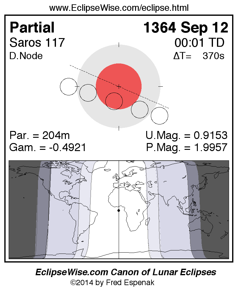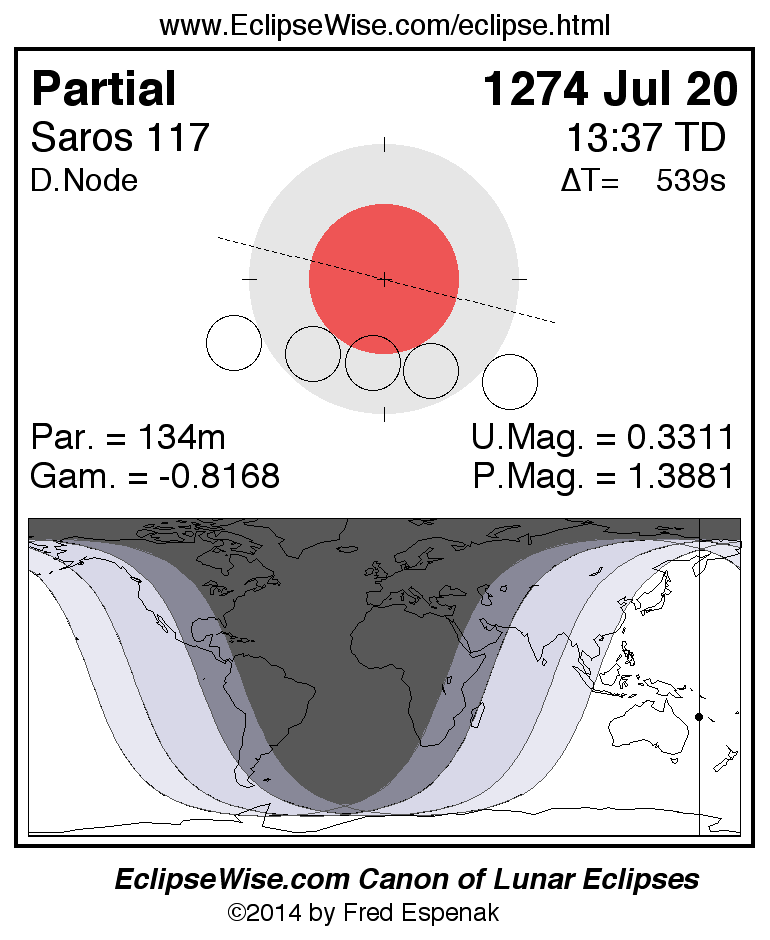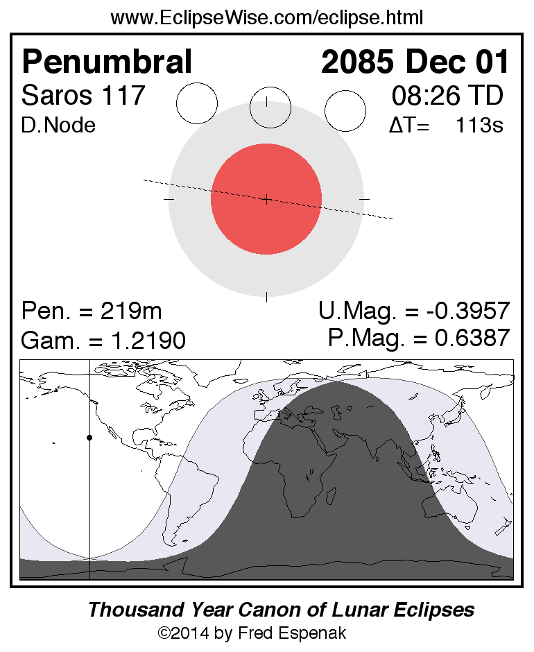 A panorama of all lunar eclipses belonging to Saros 117 is presented here. Each figure shows the Moon's path with respect to Earth's penumbral and umbral shadows. Below the path is a map depicting the geographic region of visibility for the eclipse. The date and time are given for the instant of Greatest Eclipse. Every figure serves as a hyperlink to the EclipseWise Prime page for that eclipse with a larger figure and complete details for the eclipse. Visit the Key to Lunar Eclipse Figures for a detailed explanation of these diagrams. Near the bottom of this page are a series of hyperlinks for more on lunar eclipses.