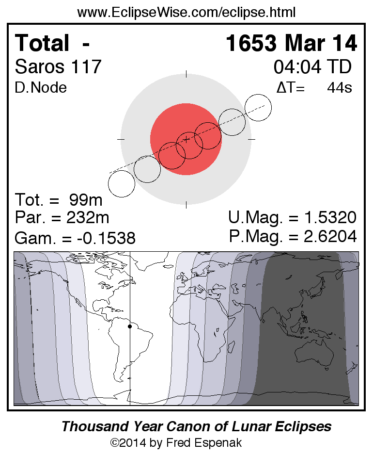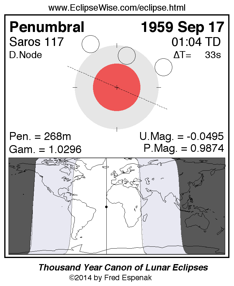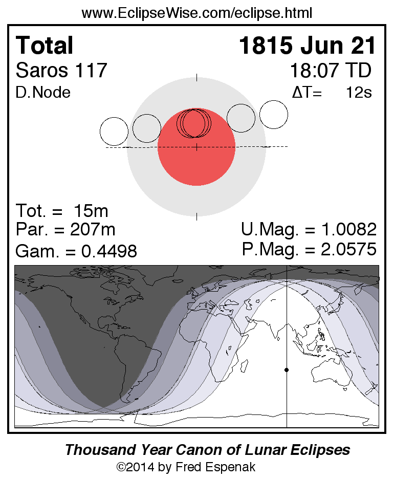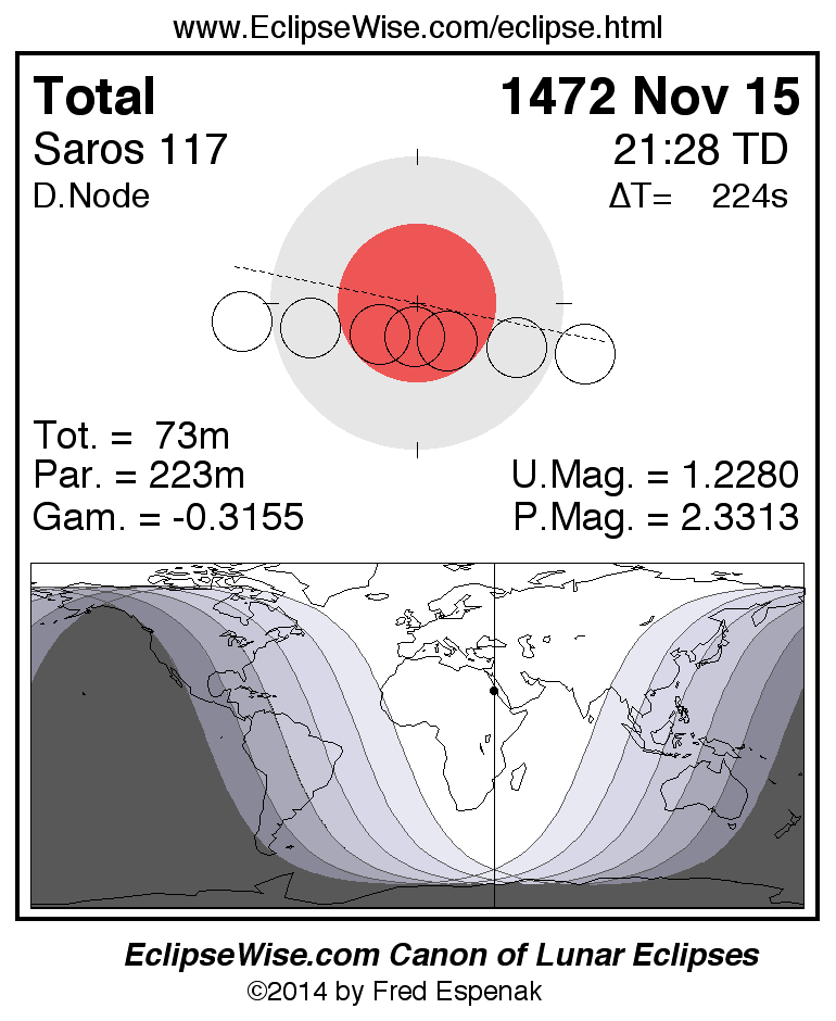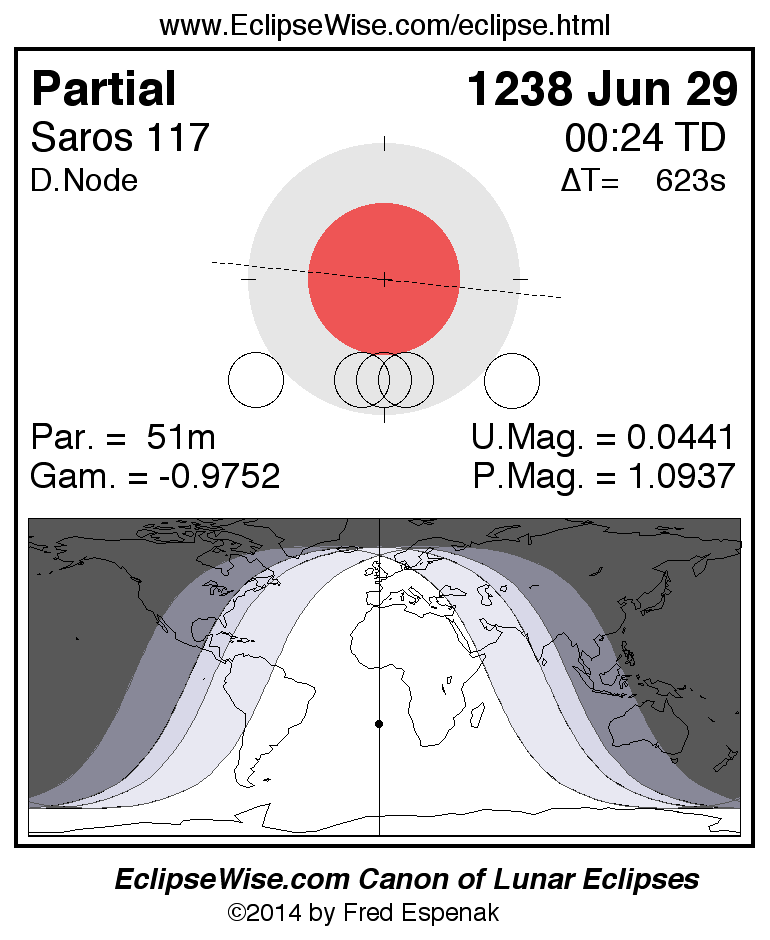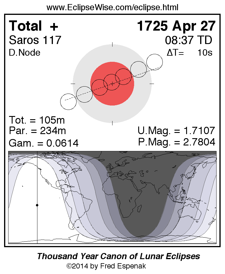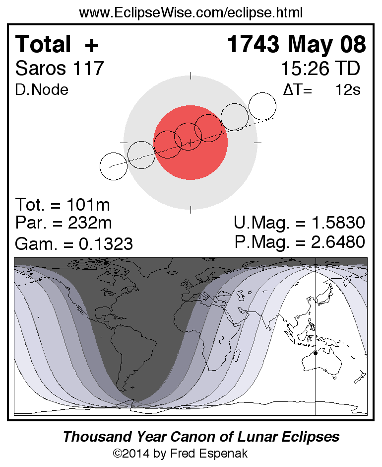 A panorama of all lunar eclipses belonging to Saros 117 is presented here. Each figure shows the Moon's path with respect to Earth's penumbral and umbral shadows. Below the path is a map depicting the geographic region of visibility for the eclipse. The date and time are given for the instant of Greatest Eclipse. Every figure serves as a hyperlink to the EclipseWise Prime page for that eclipse with a larger figure and complete details for the eclipse. Visit the Key to Lunar Eclipse Figures for a detailed explanation of these diagrams. Near the bottom of this page are a series of hyperlinks for more on lunar eclipses.