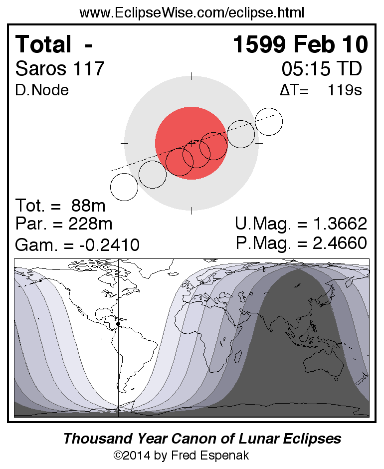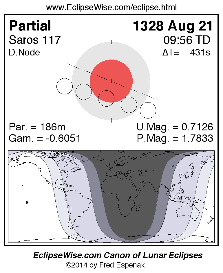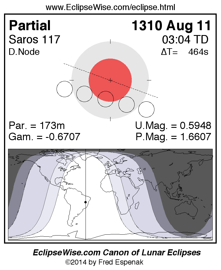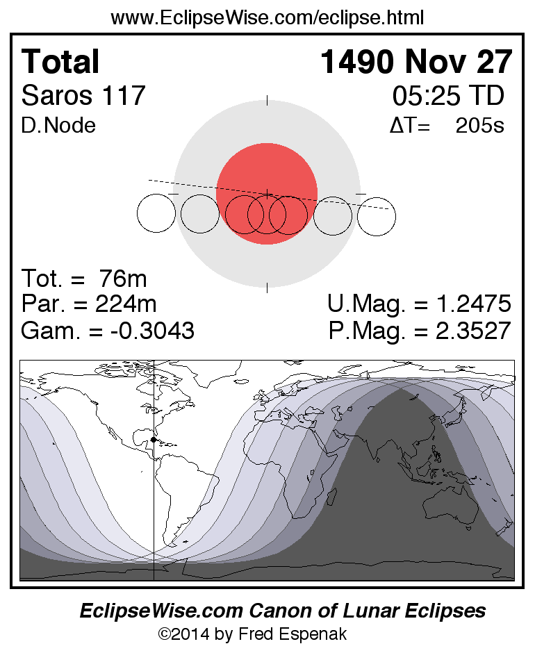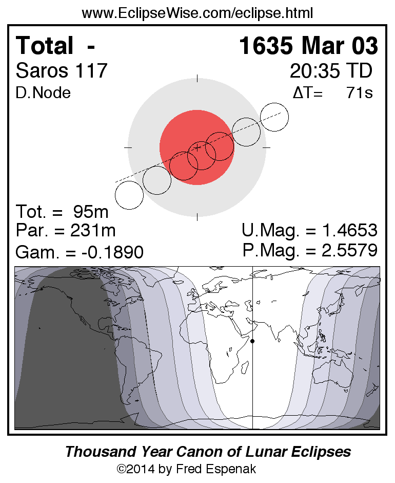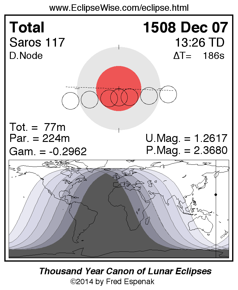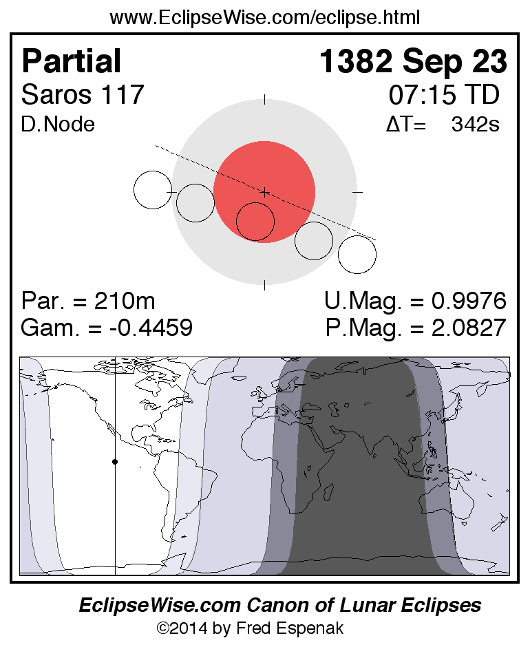 A panorama of all lunar eclipses belonging to Saros 117 is presented here. Each figure shows the Moon's path with respect to Earth's penumbral and umbral shadows. Below the path is a map depicting the geographic region of visibility for the eclipse. The date and time are given for the instant of Greatest Eclipse. Every figure serves as a hyperlink to the EclipseWise Prime page for that eclipse with a larger figure and complete details for the eclipse. Visit the Key to Lunar Eclipse Figures for a detailed explanation of these diagrams. Near the bottom of this page are a series of hyperlinks for more on lunar eclipses.