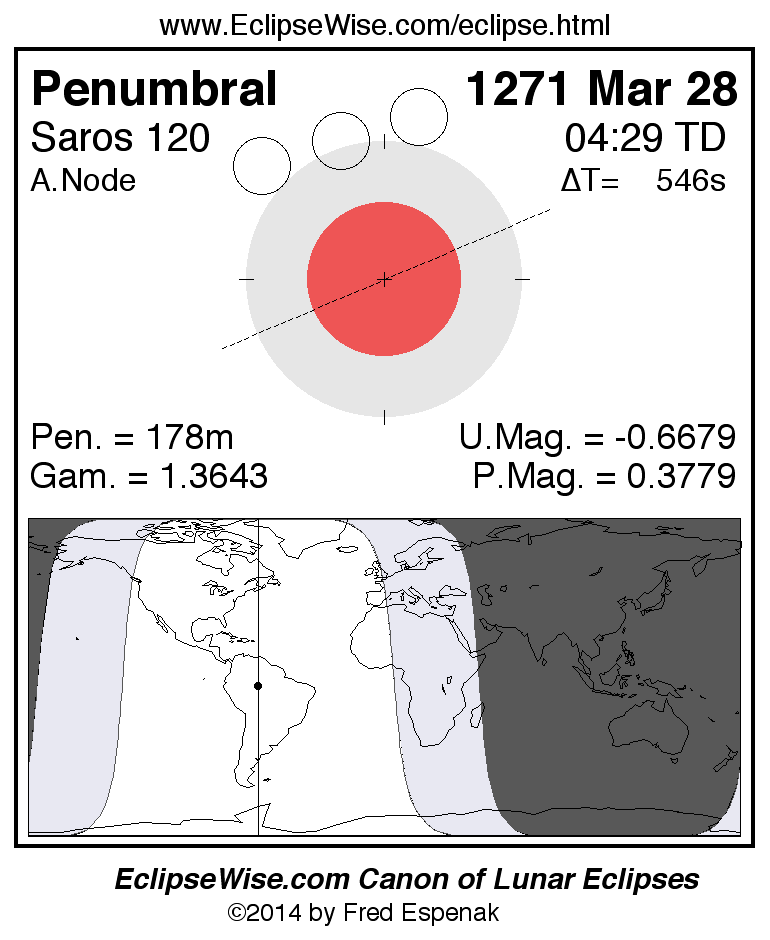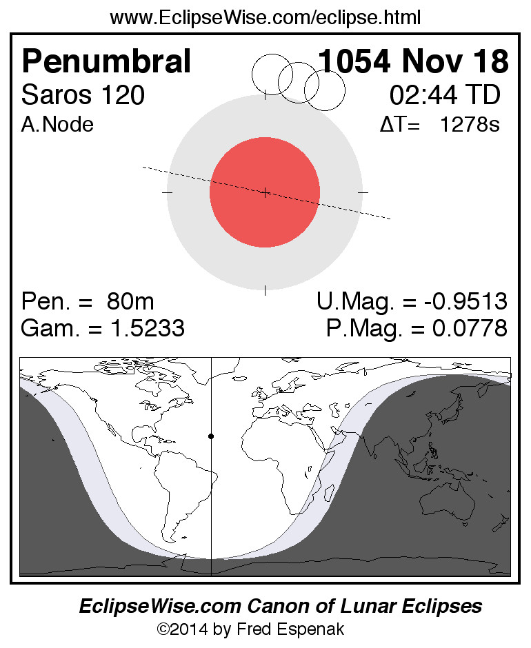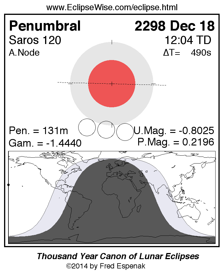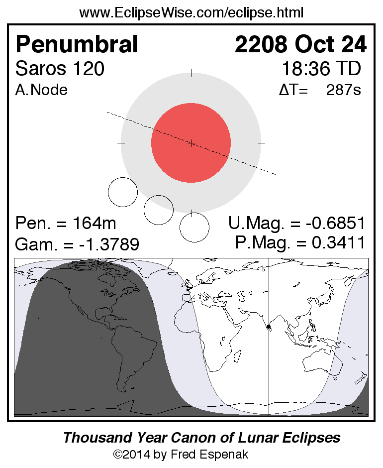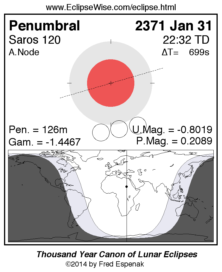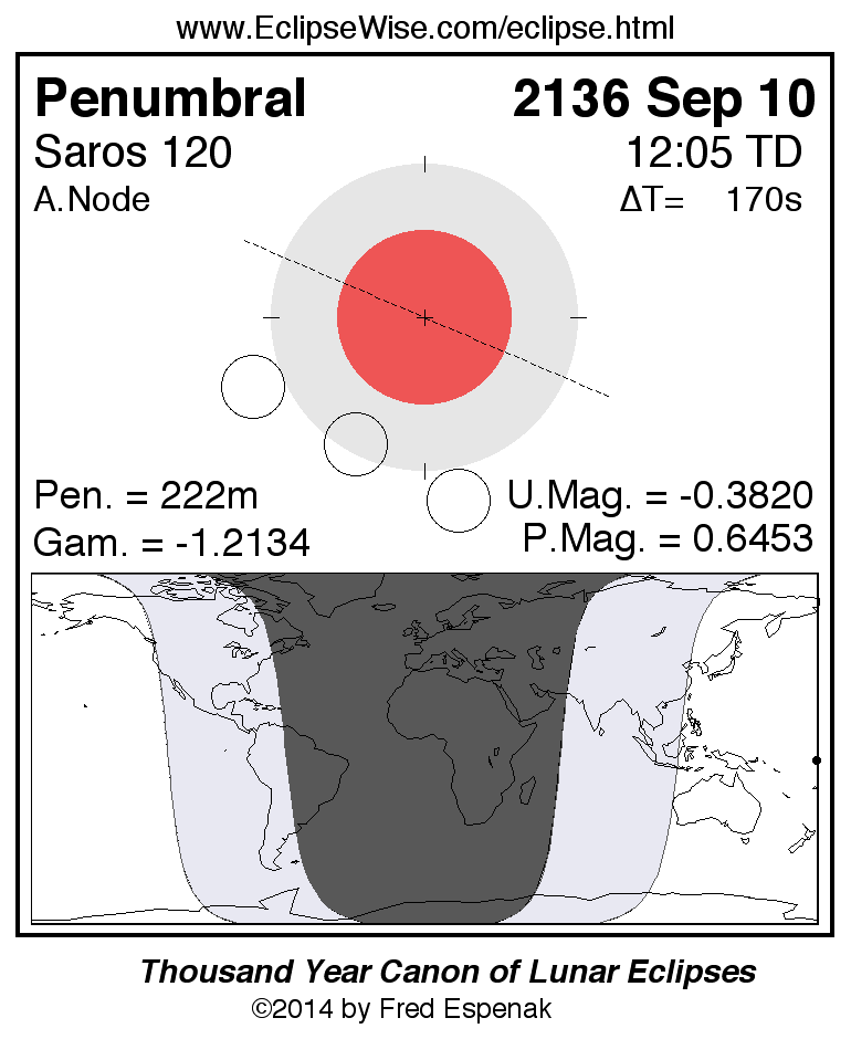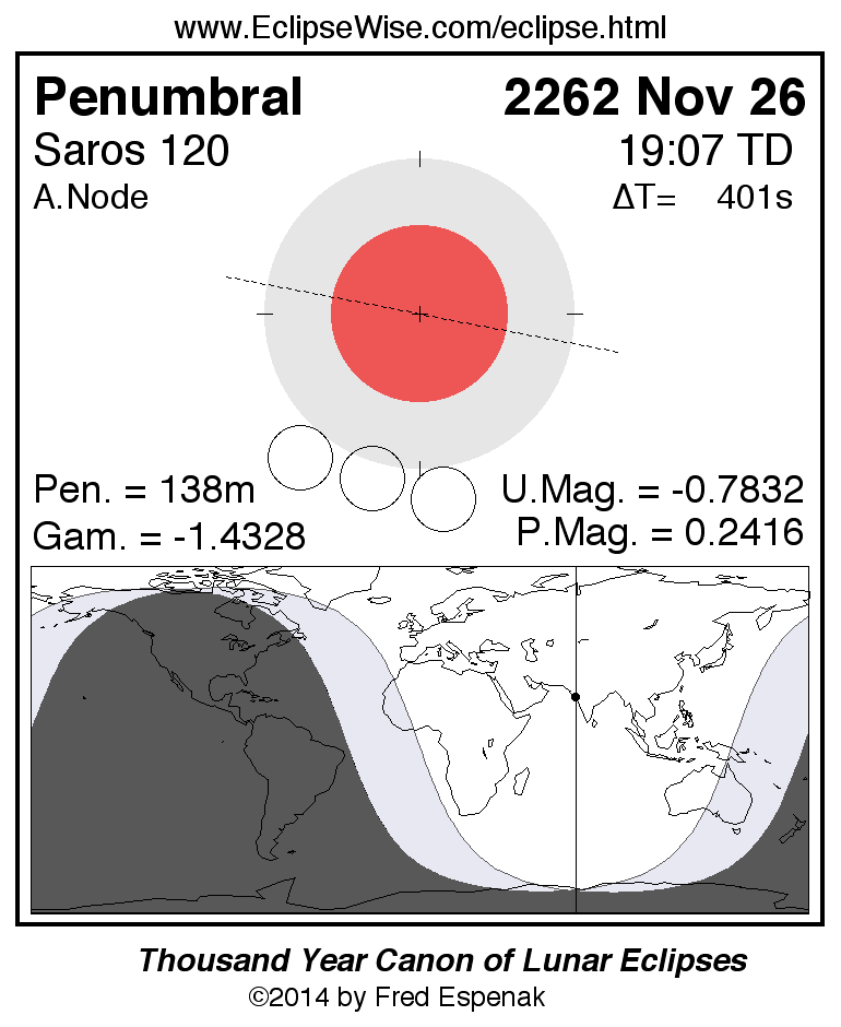 A panorama of all lunar eclipses belonging to Saros 120 is presented here. Each figure shows the Moon's path with respect to Earth's penumbral and umbral shadows. Below the path is a map depicting the geographic region of visibility for the eclipse. The date and time are given for the instant of Greatest Eclipse. Every figure serves as a hyperlink to the EclipseWise Prime page for that eclipse with a larger figure and complete details for the eclipse. Visit the Key to Lunar Eclipse Figures for a detailed explanation of these diagrams. Near the bottom of this page are a series of hyperlinks for more on lunar eclipses.