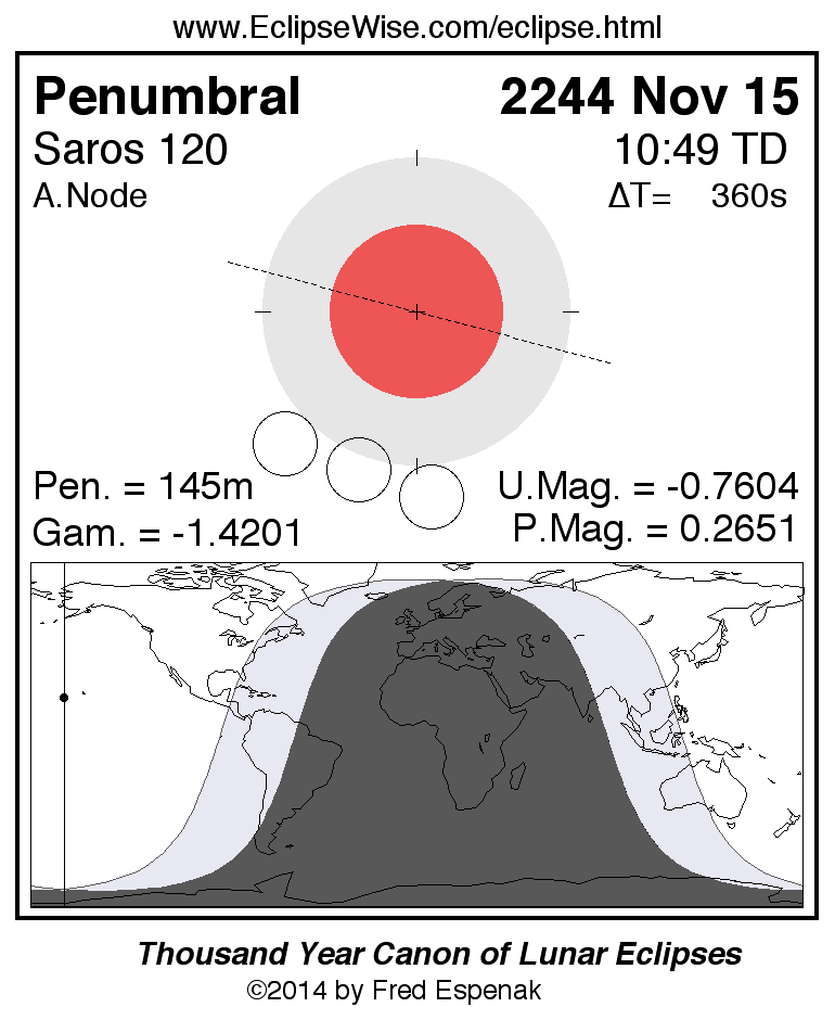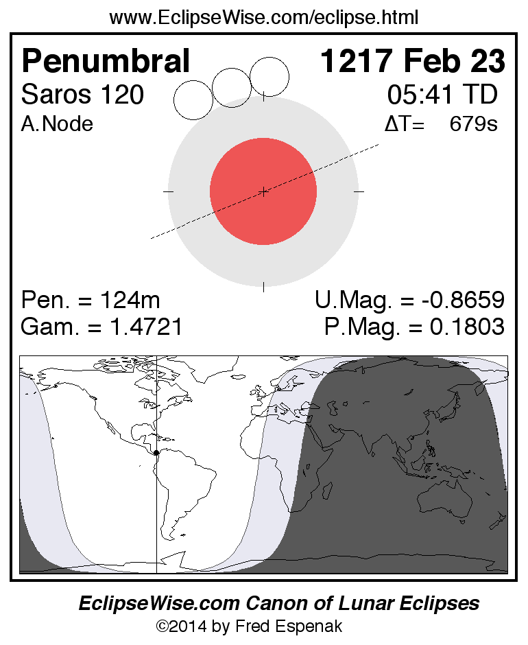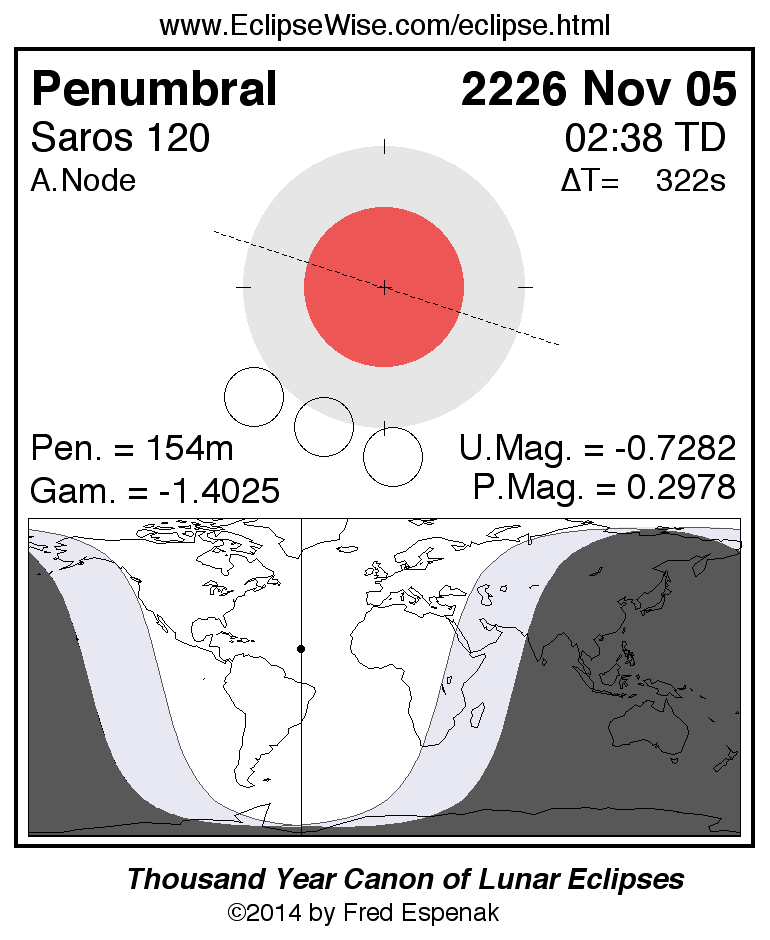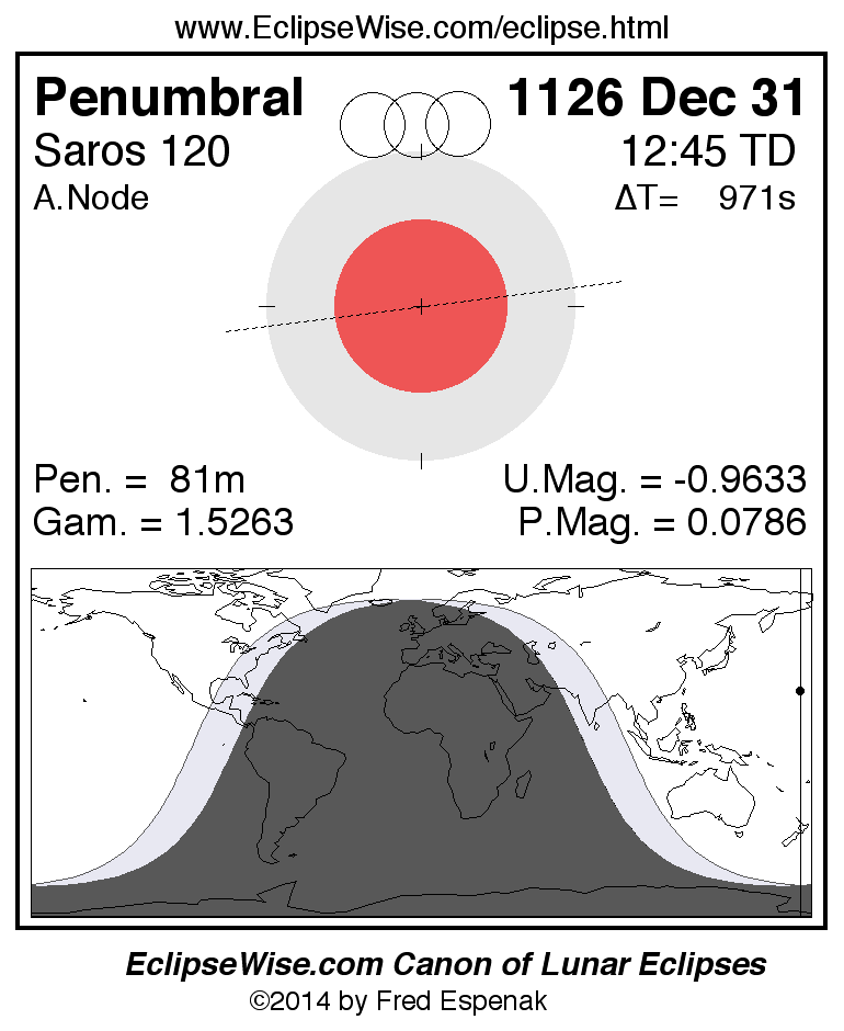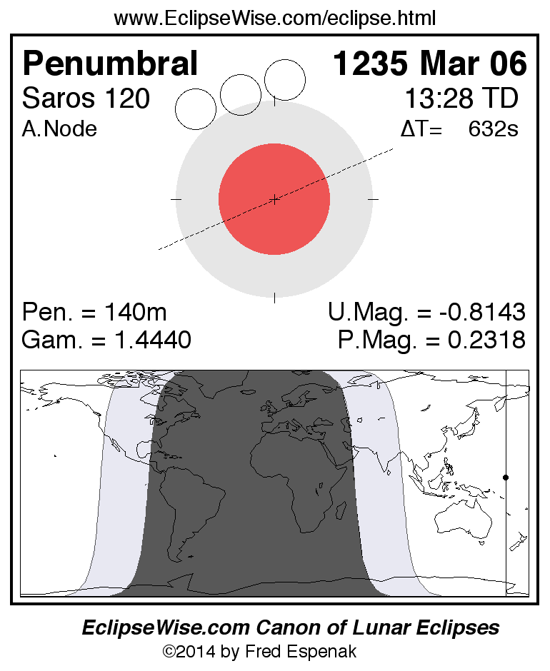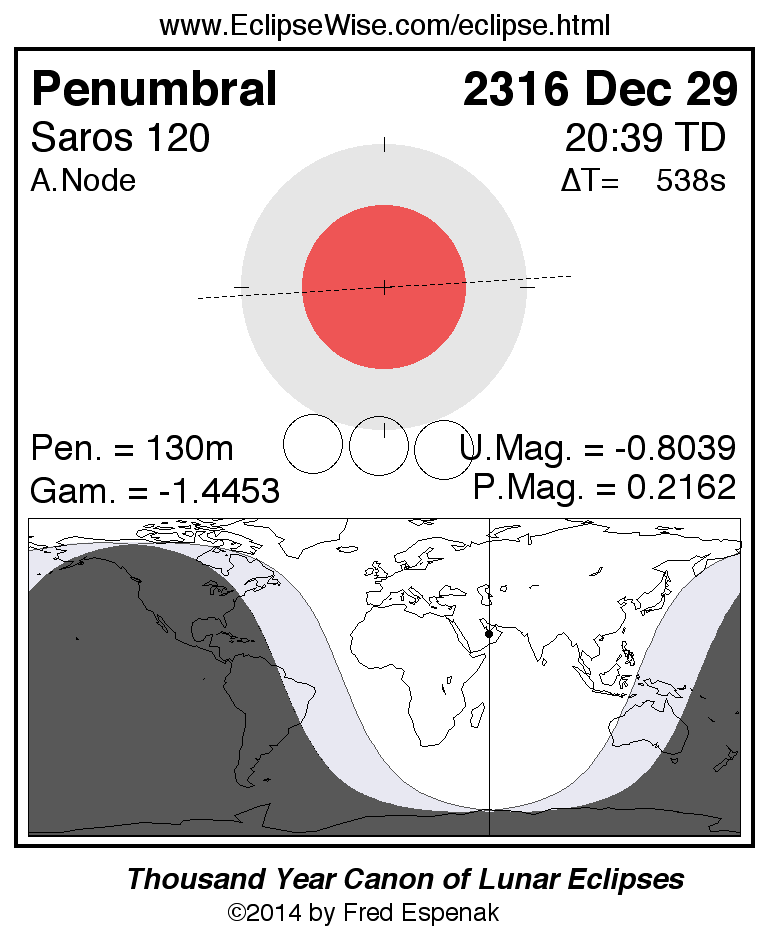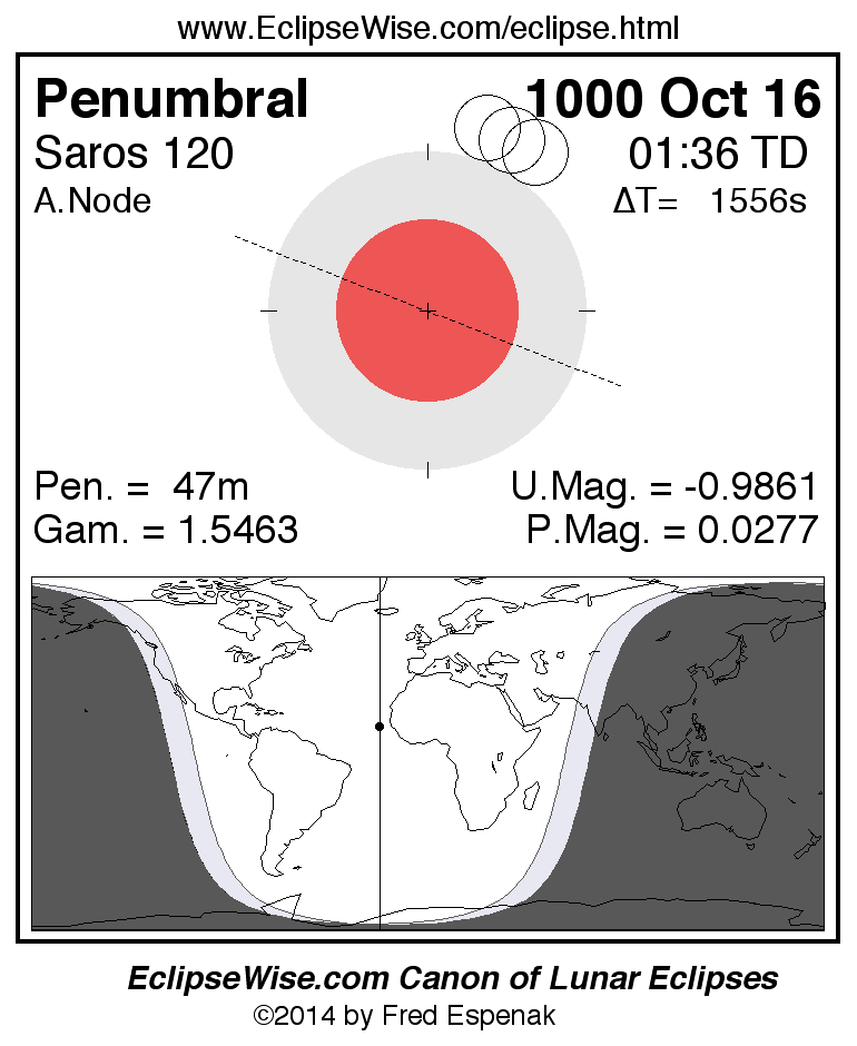 A panorama of all lunar eclipses belonging to Saros 120 is presented here. Each figure shows the Moon's path with respect to Earth's penumbral and umbral shadows. Below the path is a map depicting the geographic region of visibility for the eclipse. The date and time are given for the instant of Greatest Eclipse. Every figure serves as a hyperlink to the EclipseWise Prime page for that eclipse with a larger figure and complete details for the eclipse. Visit the Key to Lunar Eclipse Figures for a detailed explanation of these diagrams. Near the bottom of this page are a series of hyperlinks for more on lunar eclipses.