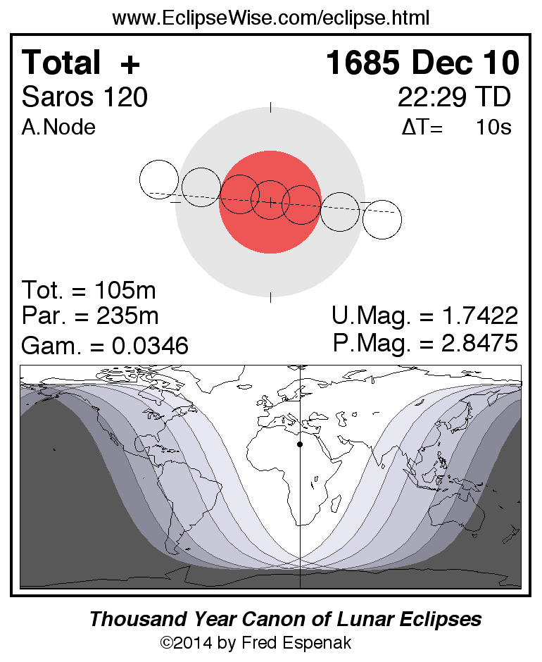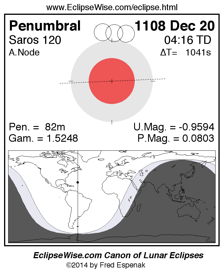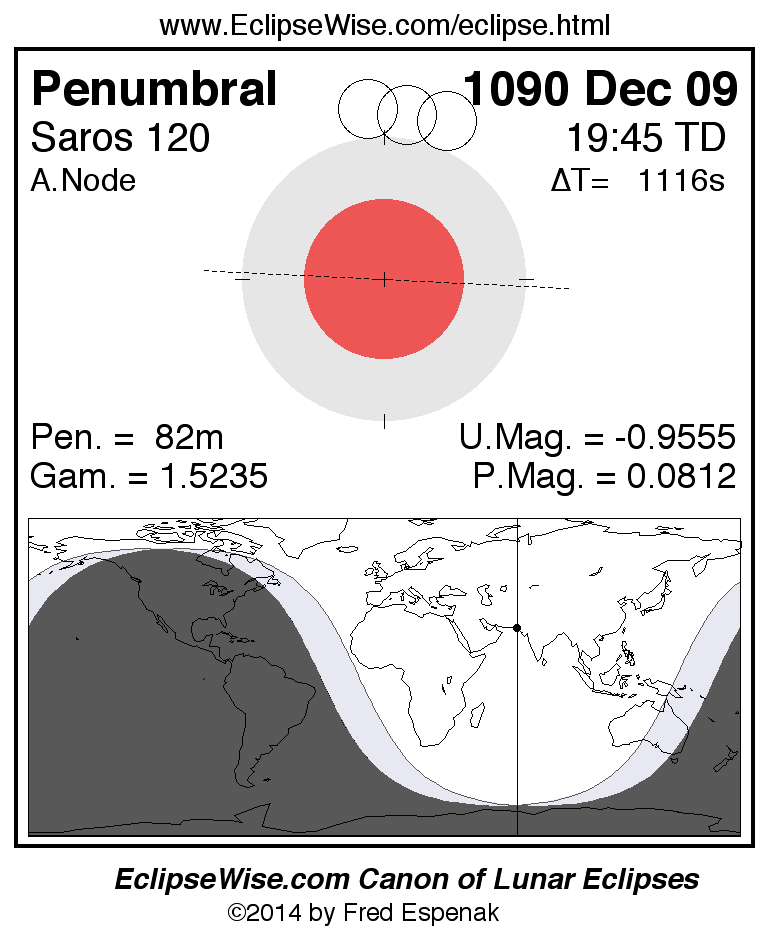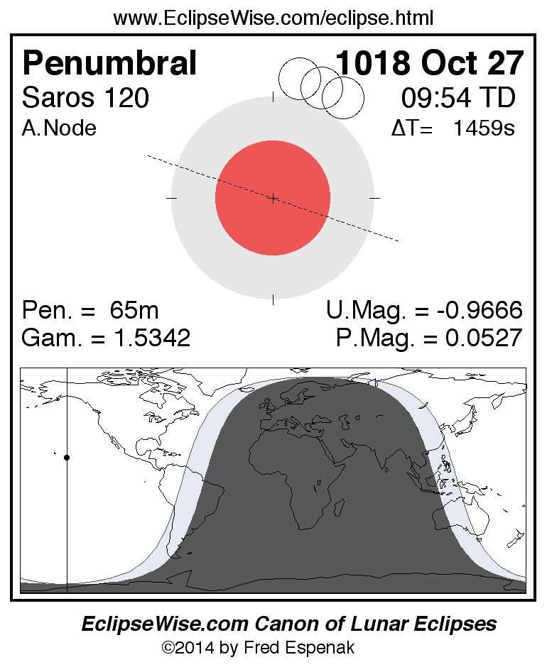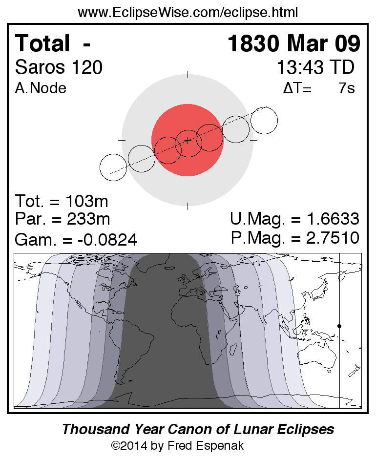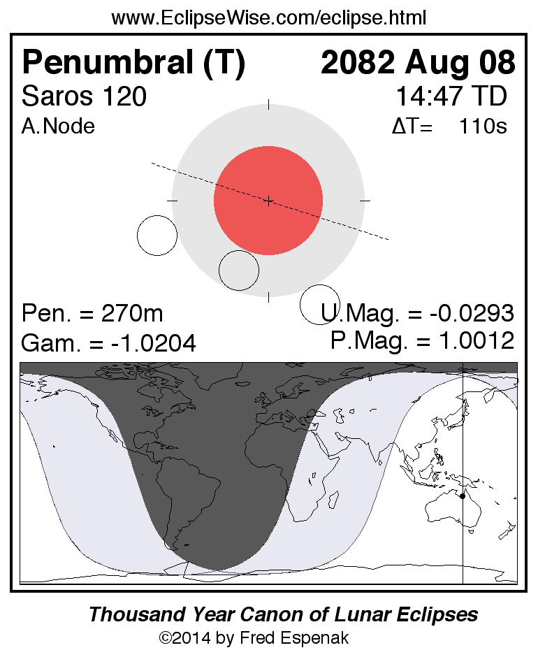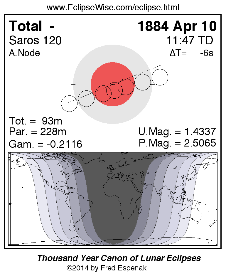 A panorama of all lunar eclipses belonging to Saros 120 is presented here. Each figure shows the Moon's path with respect to Earth's penumbral and umbral shadows. Below the path is a map depicting the geographic region of visibility for the eclipse. The date and time are given for the instant of Greatest Eclipse. Every figure serves as a hyperlink to the EclipseWise Prime page for that eclipse with a larger figure and complete details for the eclipse. Visit the Key to Lunar Eclipse Figures for a detailed explanation of these diagrams. Near the bottom of this page are a series of hyperlinks for more on lunar eclipses.