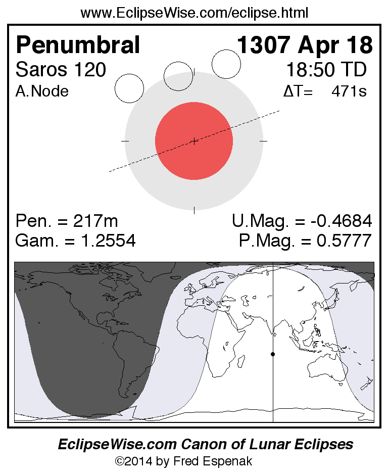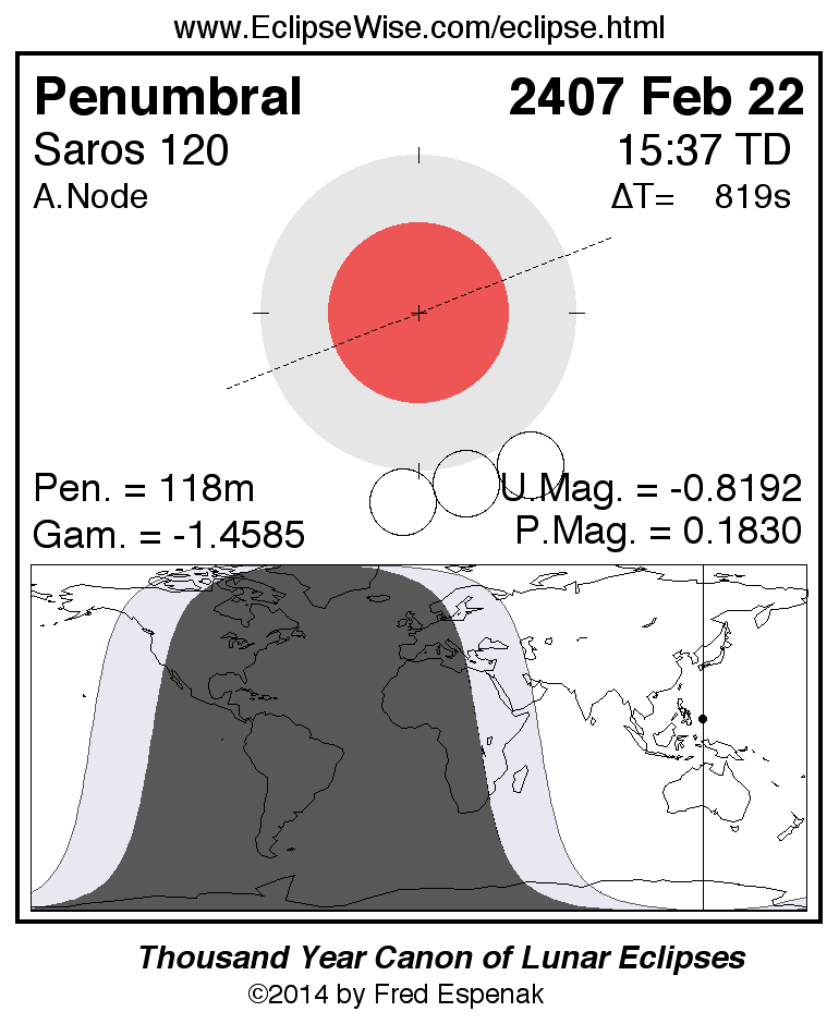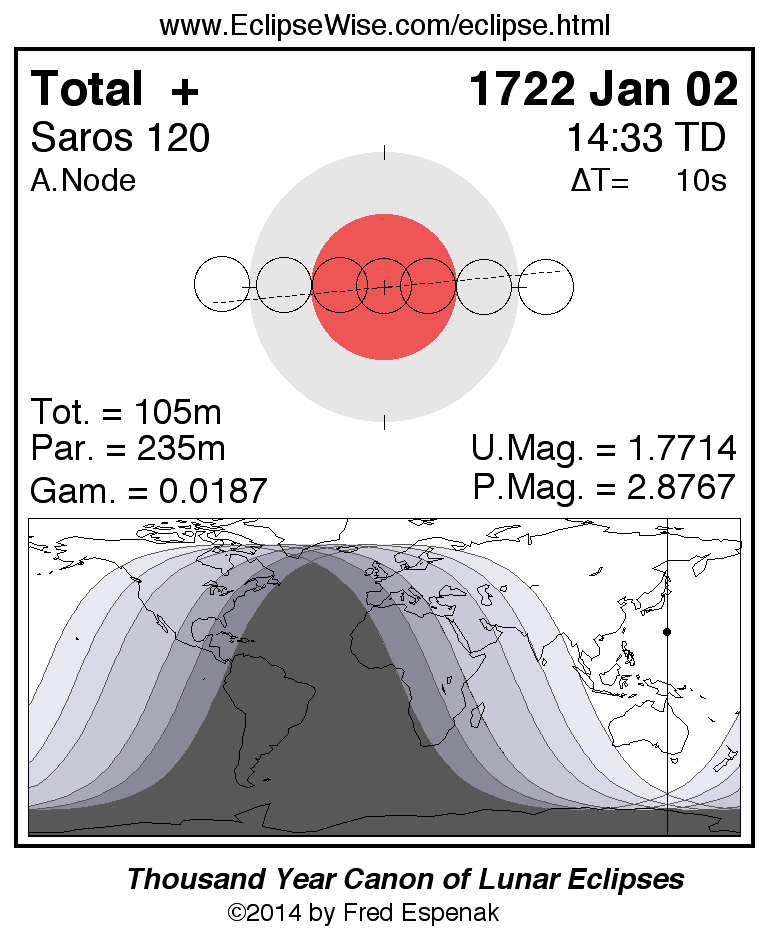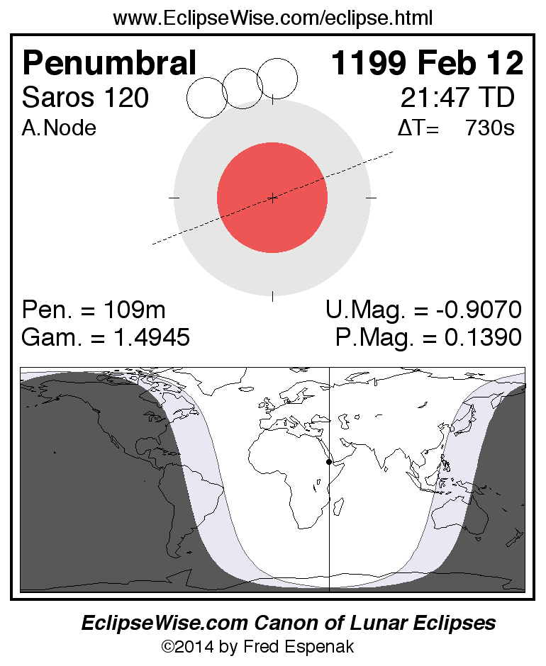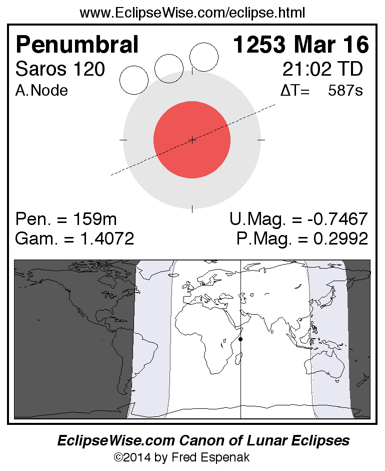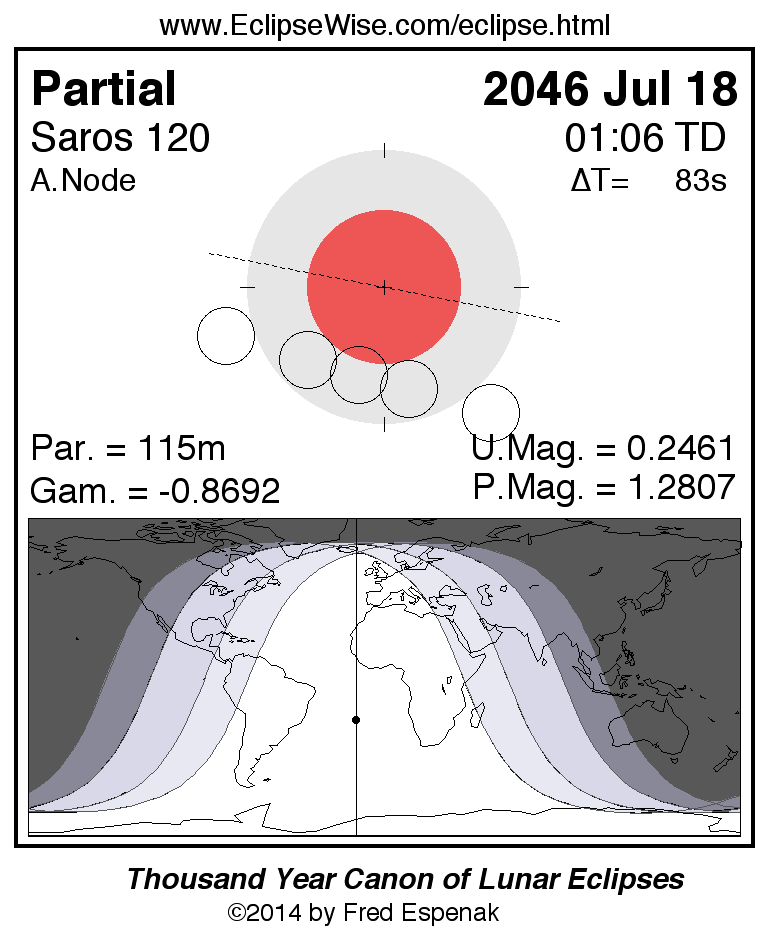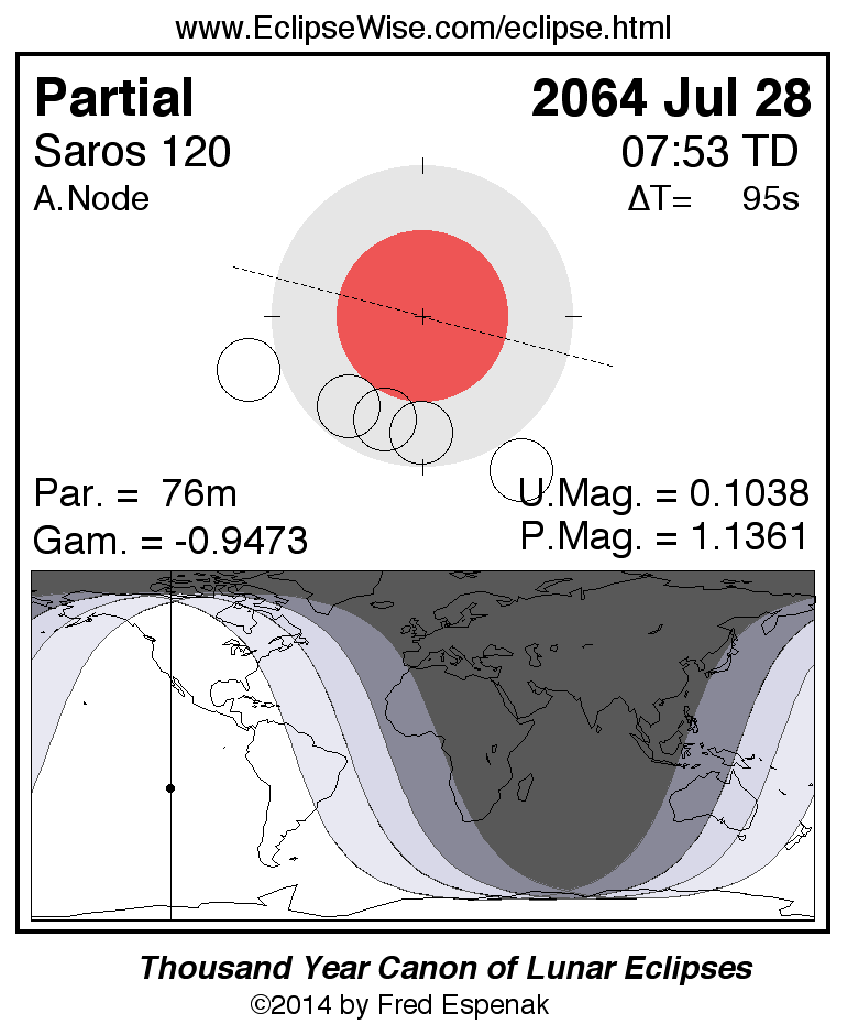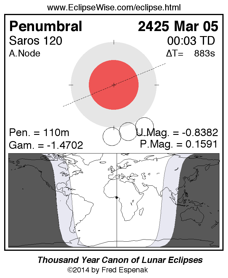 A panorama of all lunar eclipses belonging to Saros 120 is presented here. Each figure shows the Moon's path with respect to Earth's penumbral and umbral shadows. Below the path is a map depicting the geographic region of visibility for the eclipse. The date and time are given for the instant of Greatest Eclipse. Every figure serves as a hyperlink to the EclipseWise Prime page for that eclipse with a larger figure and complete details for the eclipse. Visit the Key to Lunar Eclipse Figures for a detailed explanation of these diagrams. Near the bottom of this page are a series of hyperlinks for more on lunar eclipses.