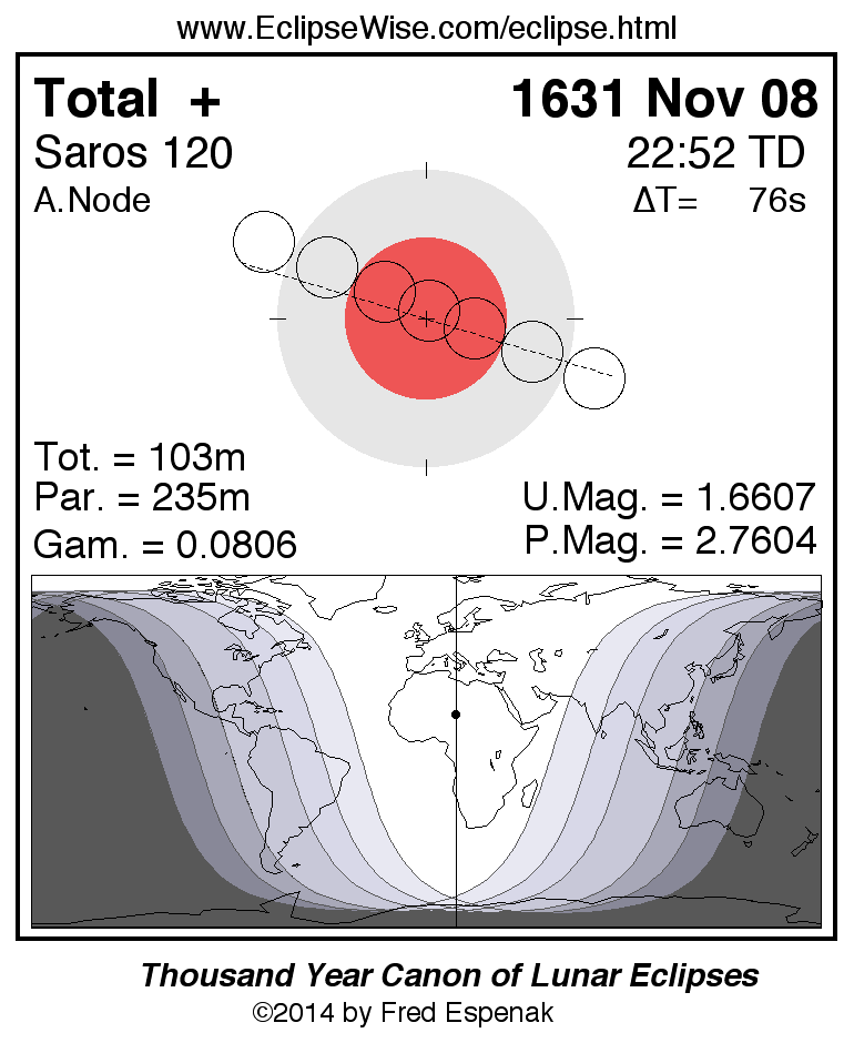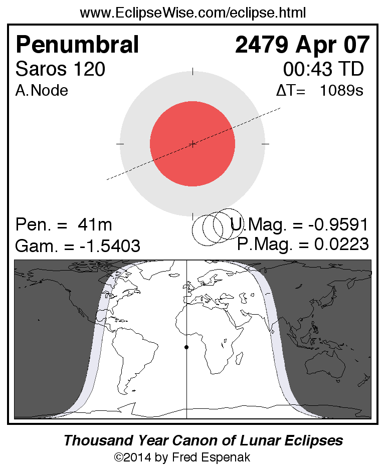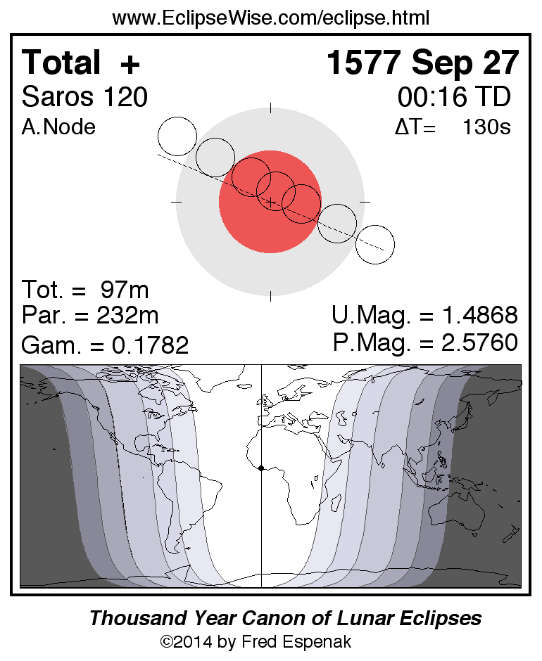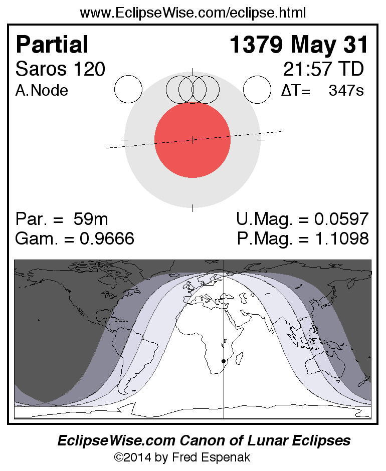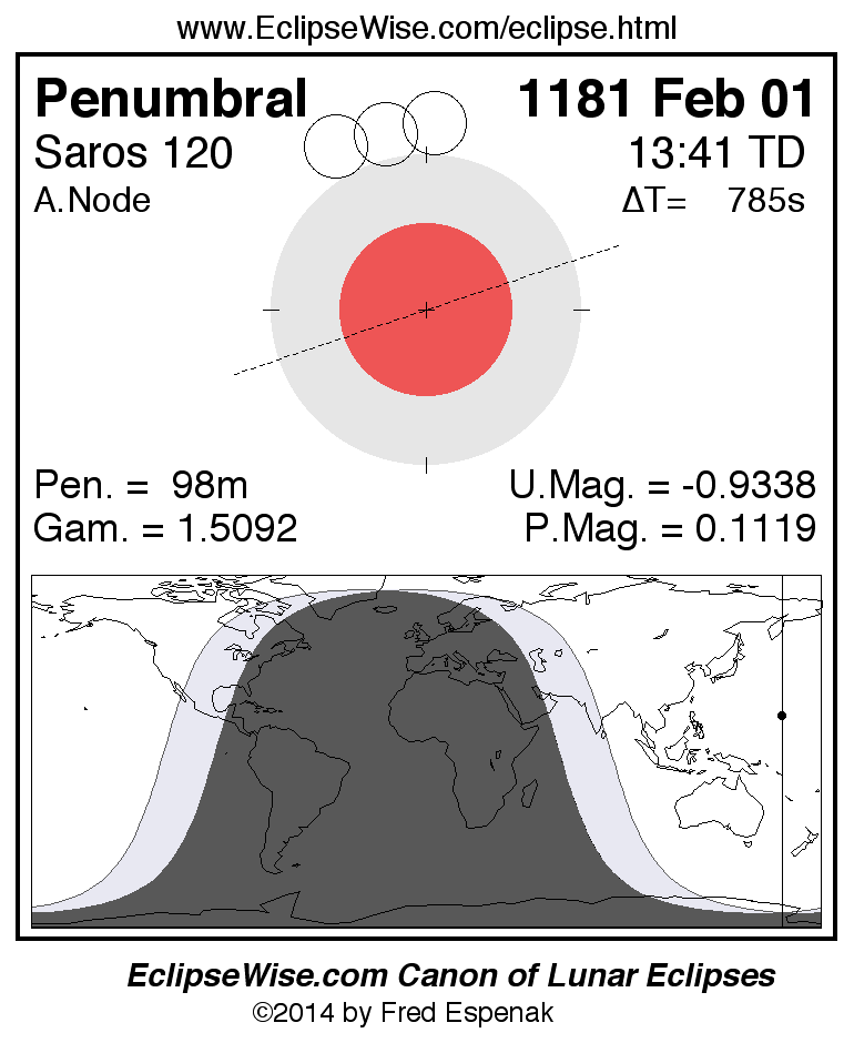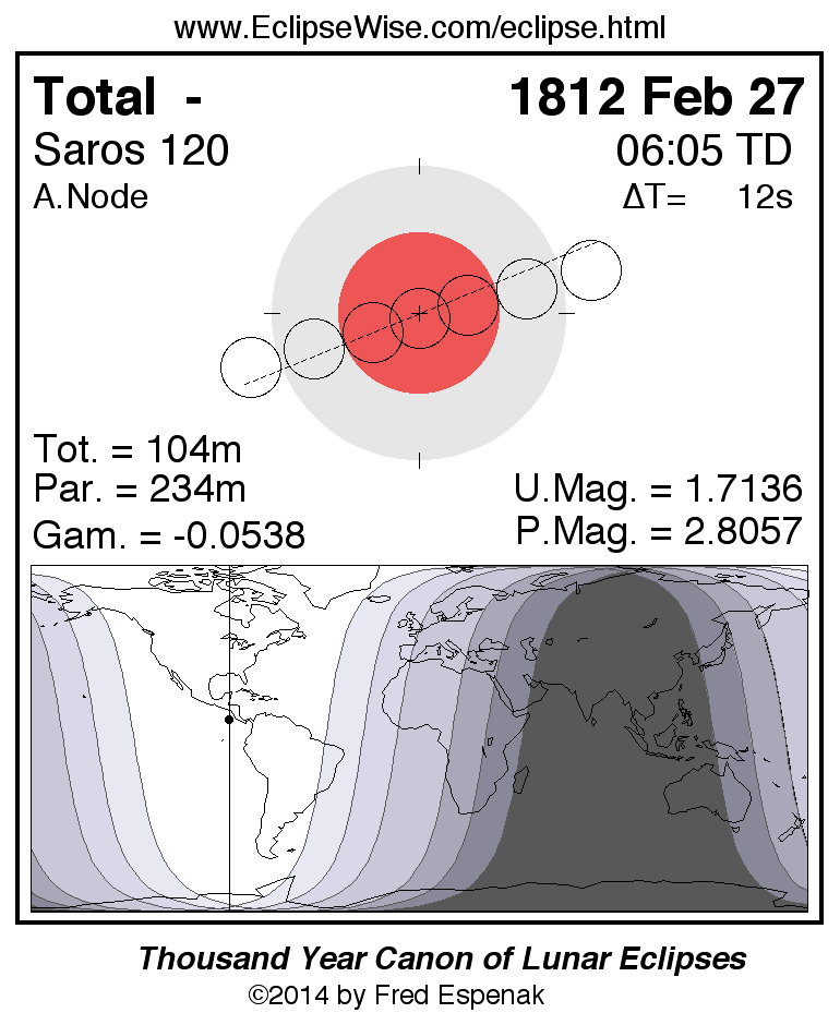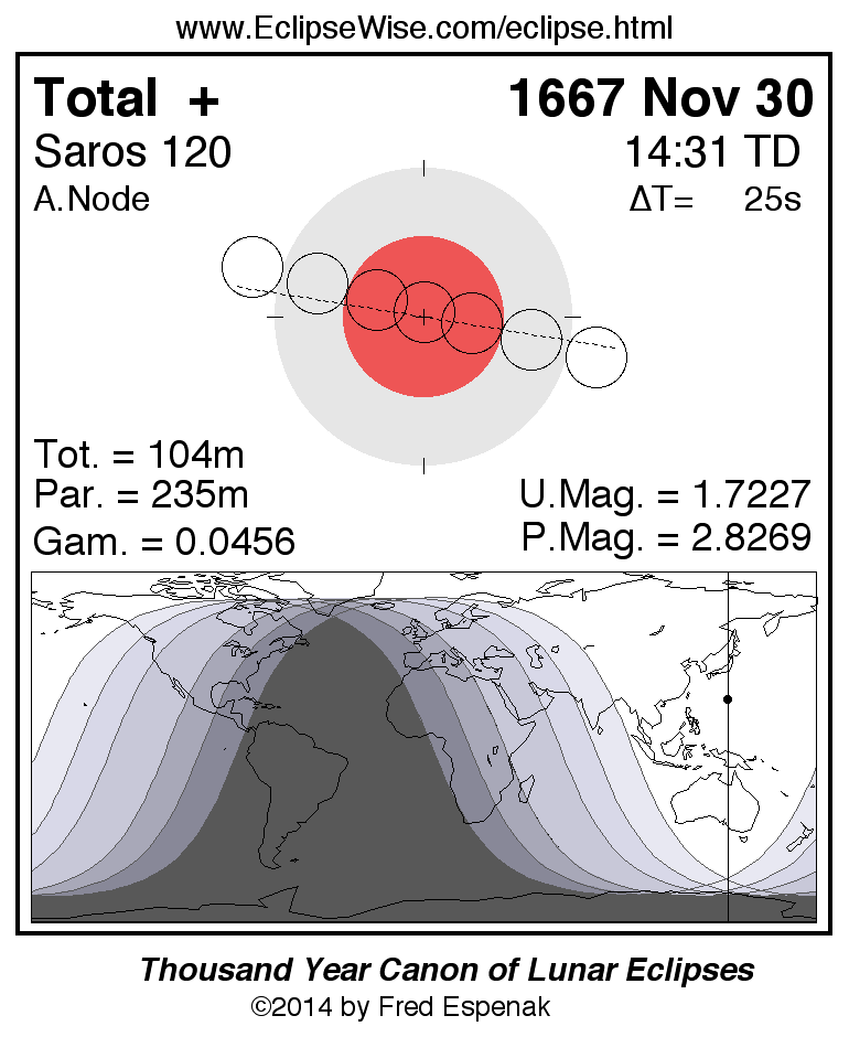 A panorama of all lunar eclipses belonging to Saros 120 is presented here. Each figure shows the Moon's path with respect to Earth's penumbral and umbral shadows. Below the path is a map depicting the geographic region of visibility for the eclipse. The date and time are given for the instant of Greatest Eclipse. Every figure serves as a hyperlink to the EclipseWise Prime page for that eclipse with a larger figure and complete details for the eclipse. Visit the Key to Lunar Eclipse Figures for a detailed explanation of these diagrams. Near the bottom of this page are a series of hyperlinks for more on lunar eclipses.