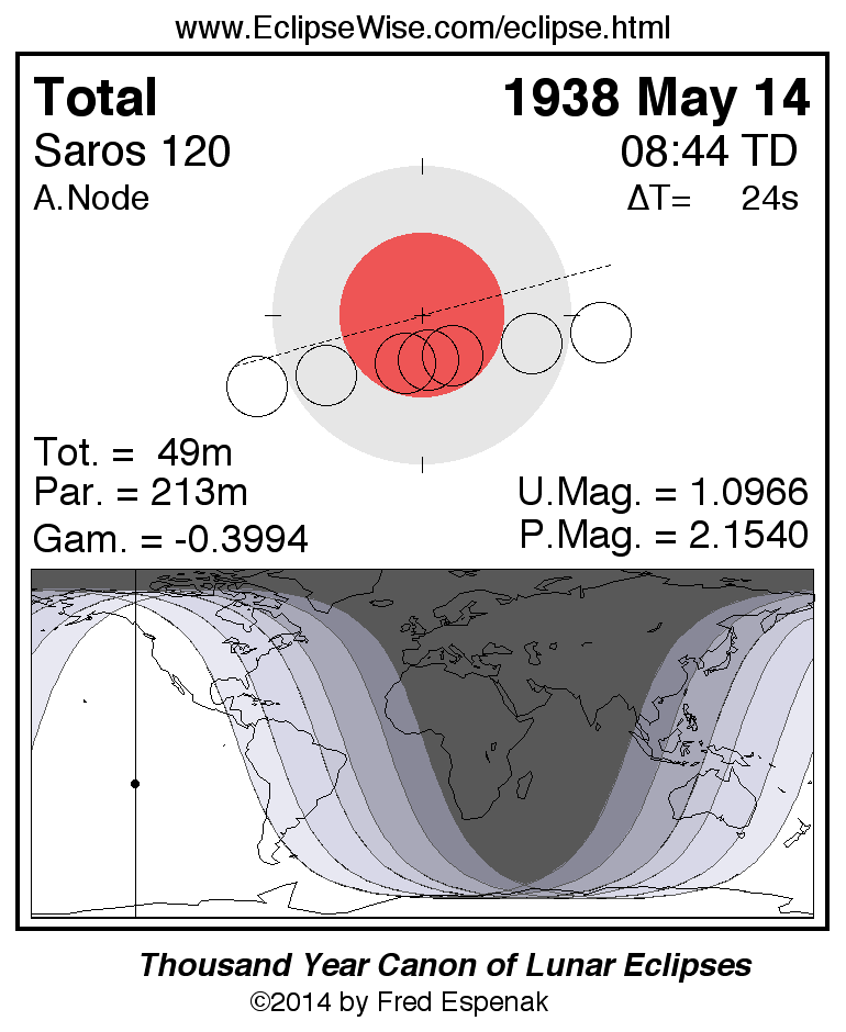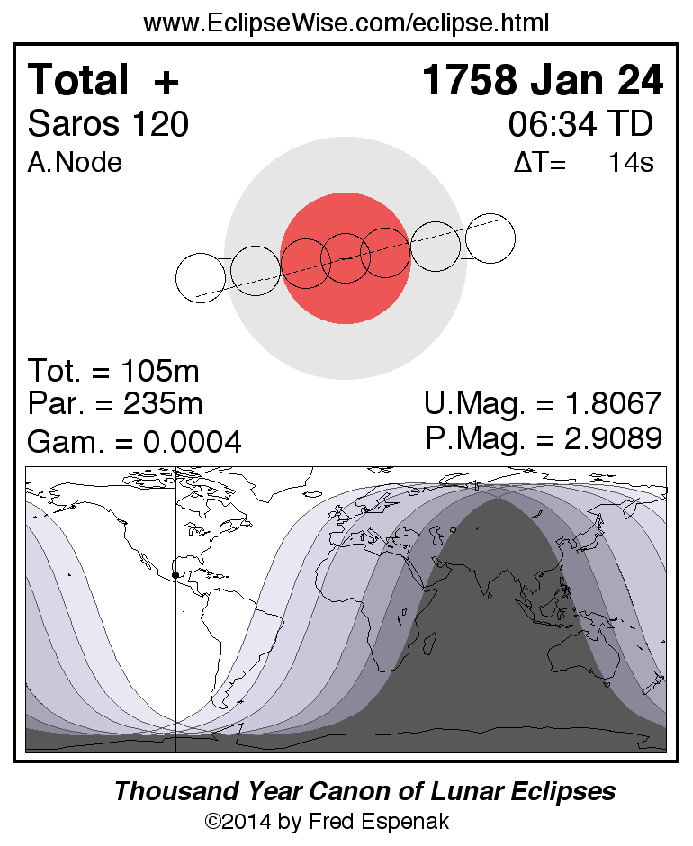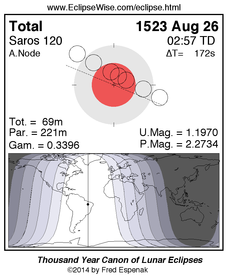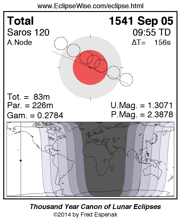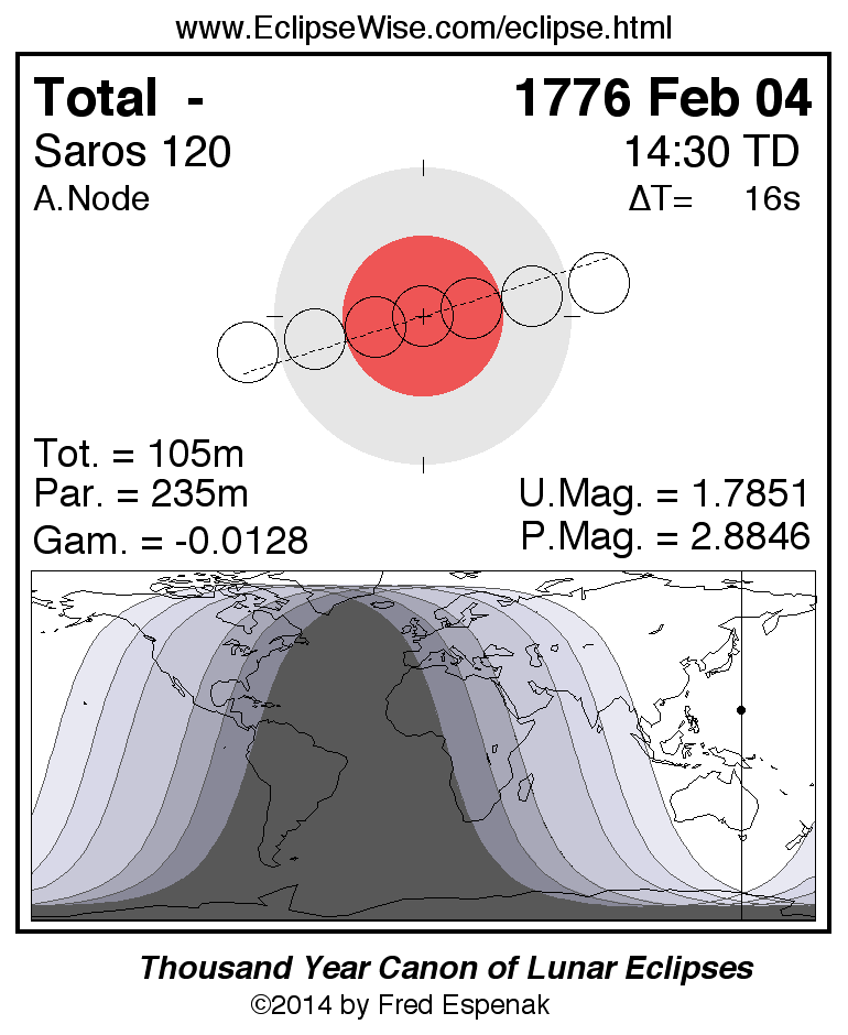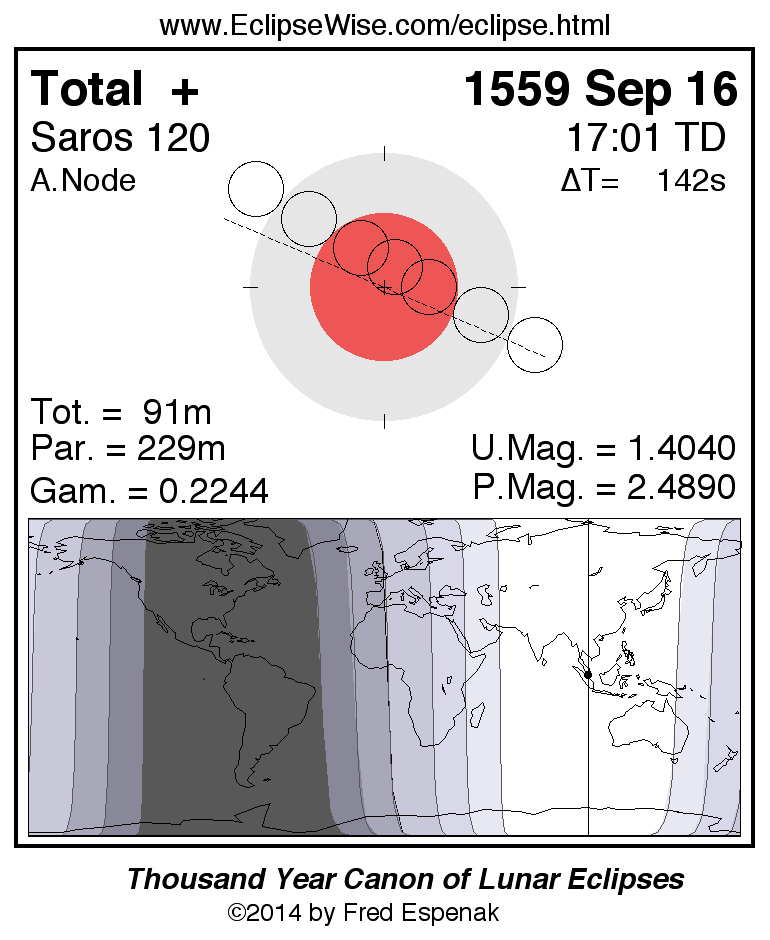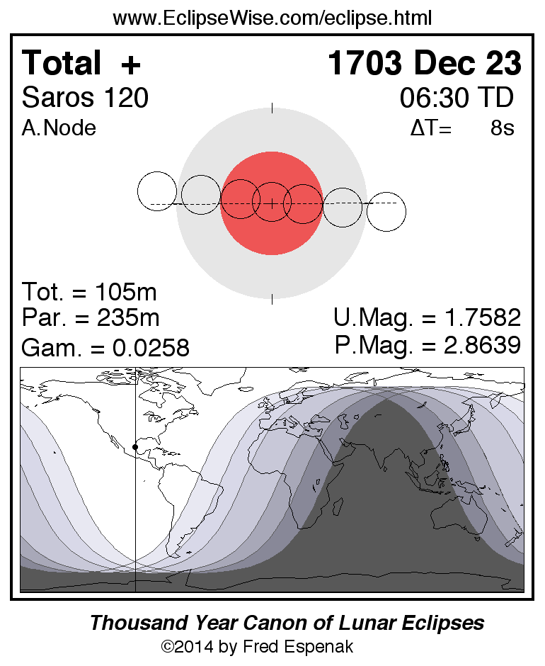 A panorama of all lunar eclipses belonging to Saros 120 is presented here. Each figure shows the Moon's path with respect to Earth's penumbral and umbral shadows. Below the path is a map depicting the geographic region of visibility for the eclipse. The date and time are given for the instant of Greatest Eclipse. Every figure serves as a hyperlink to the EclipseWise Prime page for that eclipse with a larger figure and complete details for the eclipse. Visit the Key to Lunar Eclipse Figures for a detailed explanation of these diagrams. Near the bottom of this page are a series of hyperlinks for more on lunar eclipses.